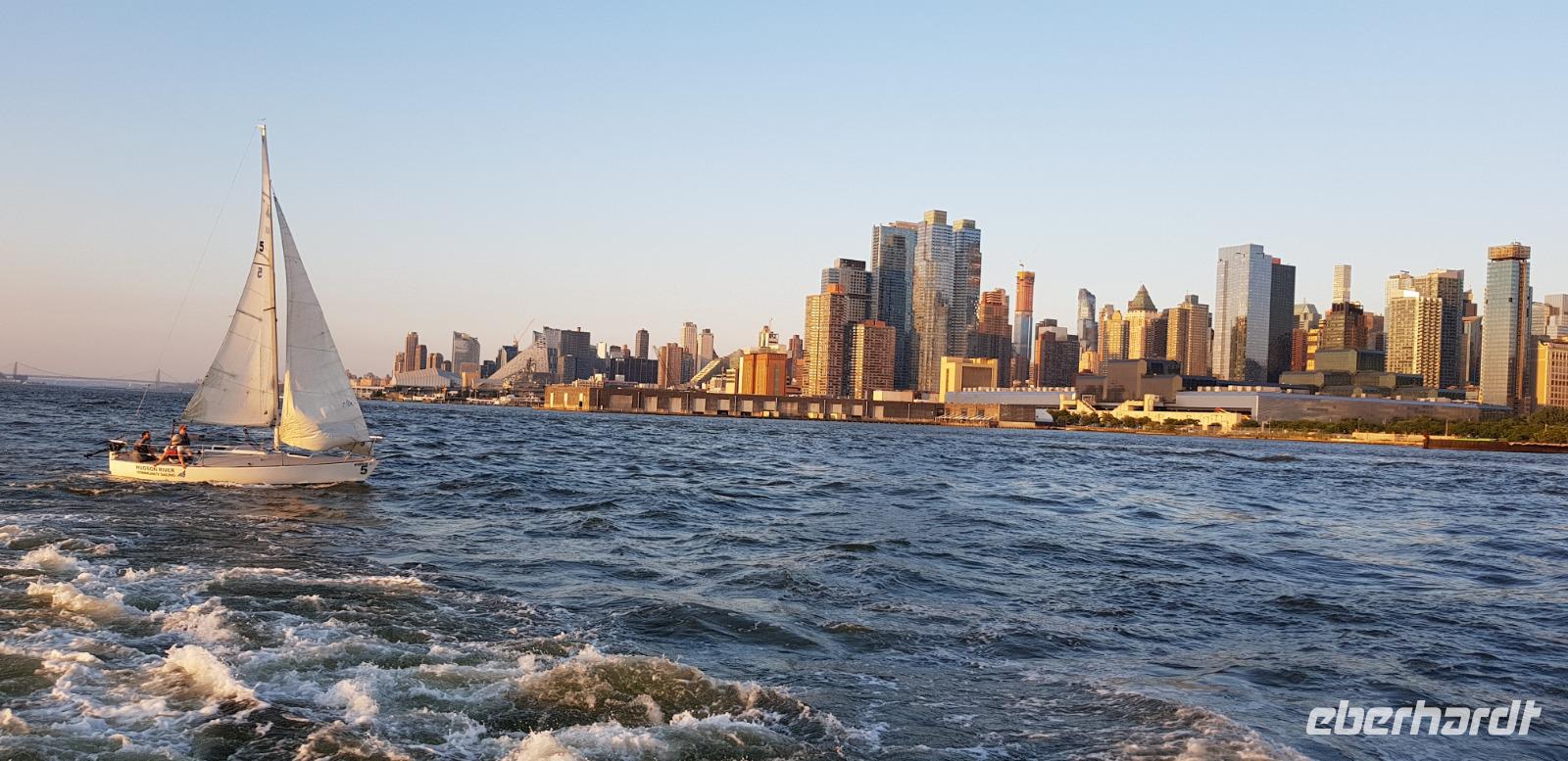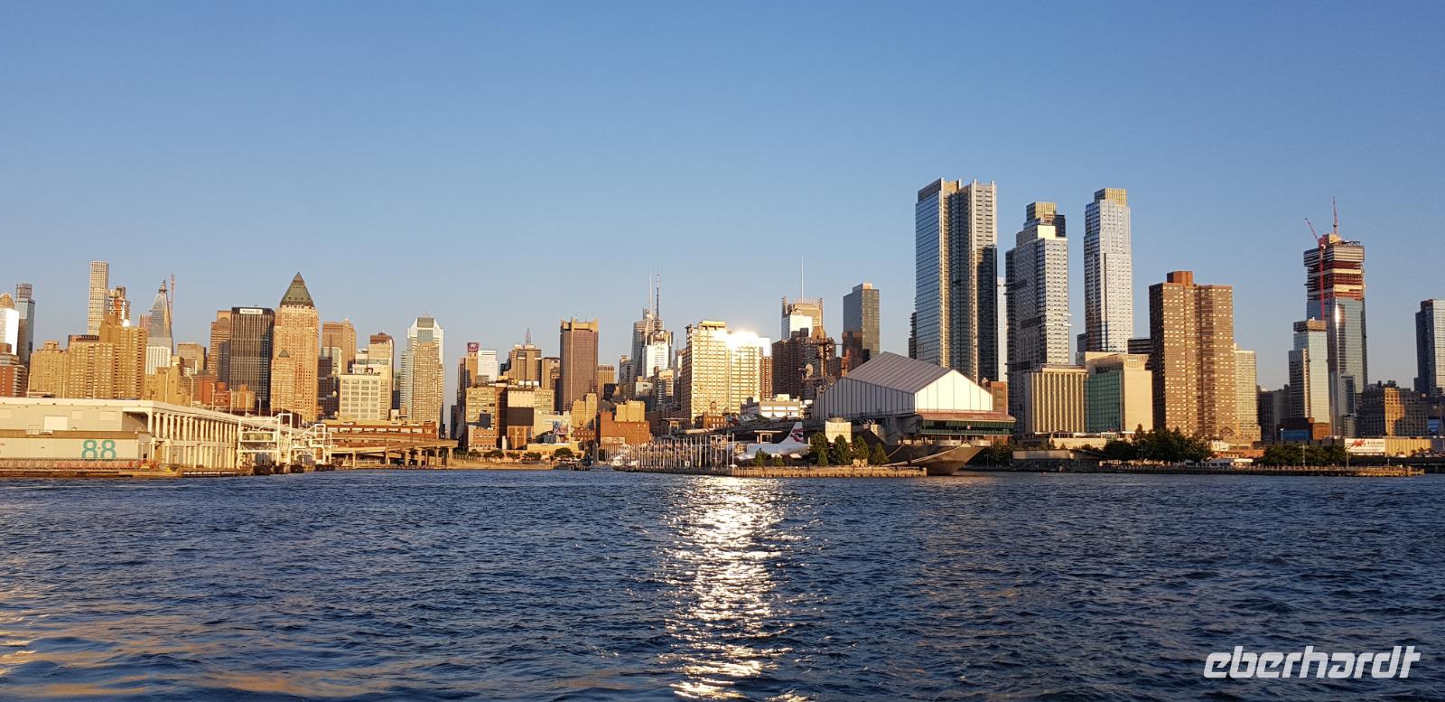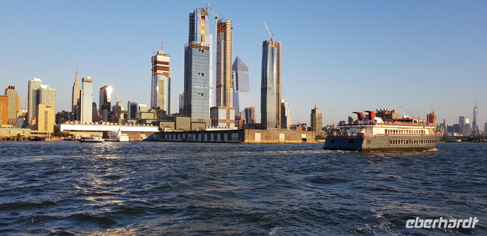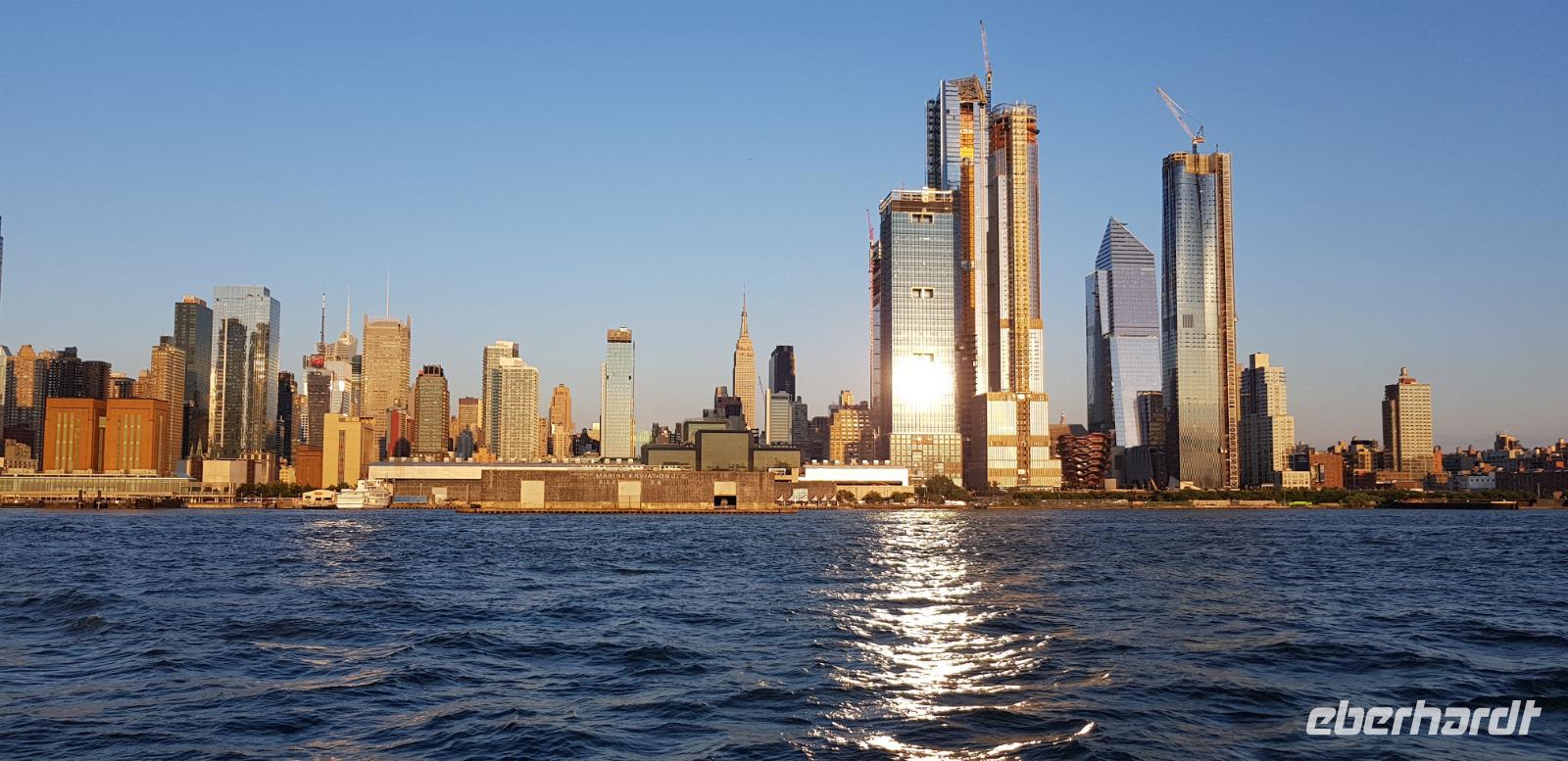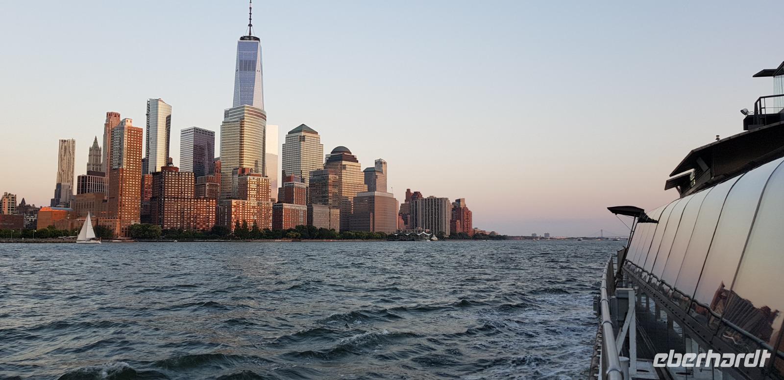 Den Vormittag verbrachte jeder individuell bis wir uns am Nachmittag wieder im Hotel trafen. Mit der U-Bahn fuhren wir gemeinsam zum High Line Park, einer alten Güterzugtrasse, die zu einer schönen grünen Parkanlage umgebaut wurde. Wir spazierten von einem Ende zum anderen, bewunderten die vielen Pflanzen und Blumen, die liebevoll gepflanzt wurden und machten einige Pausen auf den vielen Bänken des Parks. Wir waren sehr beeindruckt von den neu entstehenden Wolkenkratzern und Luxus-Apartments links und rechts der Trasse. Hier können sich die namenhaften Architekten aus aller Welt so richtig austoben. Zum Abschluss besuchten wir noch die Markthallen des Chelsea Markets, bevor wir mit der Subway zum Hotel zurück fuhren. Um 18Uhr stand schon unser Transfer zum Spirit Curise Pier bereit. Also fuhren wir ca. 35min. vom Hotel in Richtung Hudson River, um dort an Bord eines Dinner-Schiffs zu gehen. Wir legten ab und fuhren bei einem traumhaften Sonnenuntergang an der imposanten Skyline vorbei. An Bord fehlte es uns an nix. Es gab gut gekühlte Getränke und feinstes Essen. Ob Ente, Rindfleisch oder Fisch, es schmeckte wieder einmal hervorragend. Die Fahrt ging gute 3 Stunden und wir fuhren vorbei an Lower Manhattan, durchquerten die Brooklyn Bridge, Manhattan Bridge und passierten die Freiheitsstatue. Ein toller Abschluss einer grandiosen New York Reise. Gegen 22Uhr erreichten wir wieder den Pier und wer wollte besuchte mit mir noch die Skybar „Bar 54" im Hyatt Hotel, bevor wir todmüde ins Bett fielen. :-)
