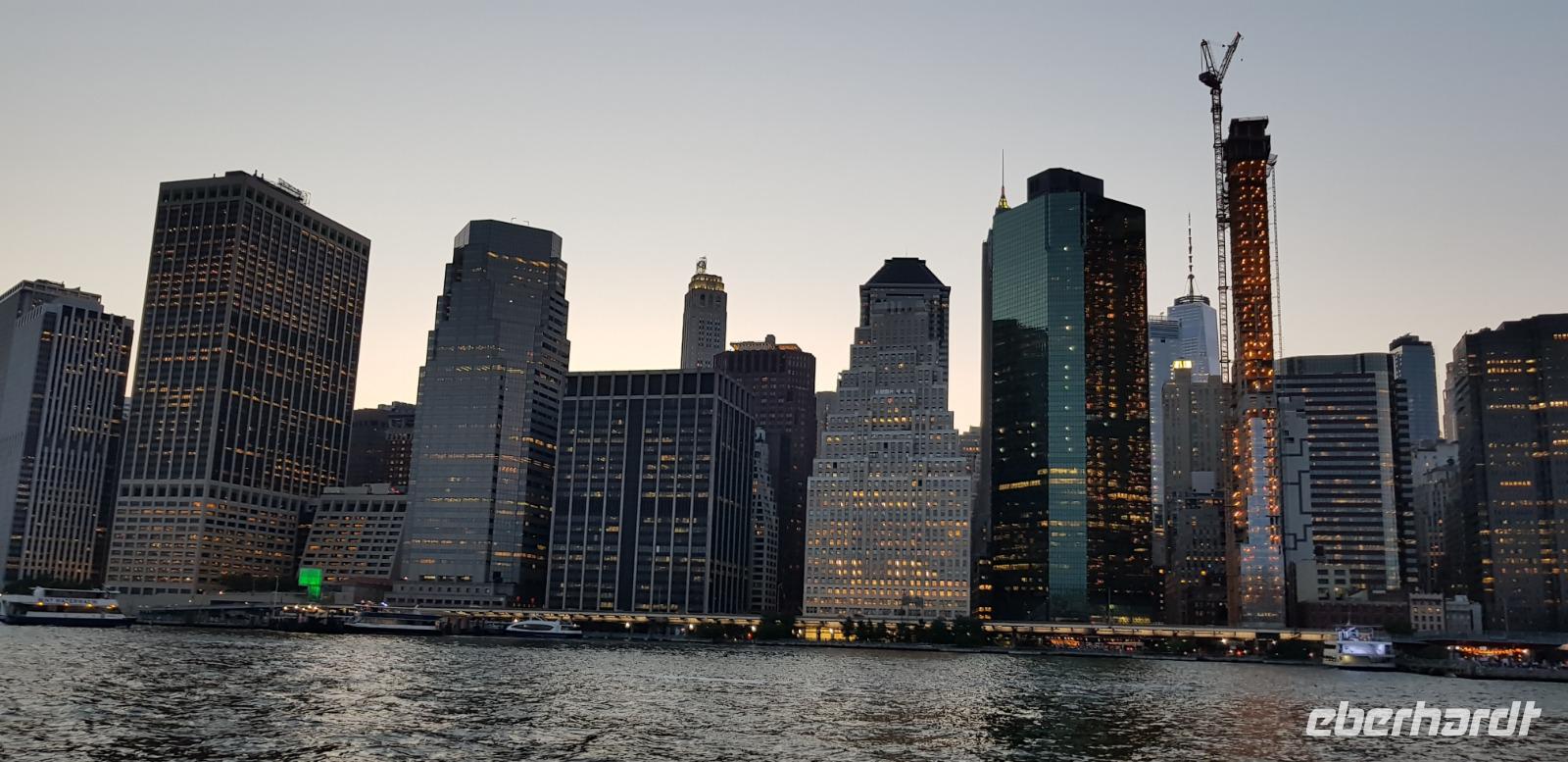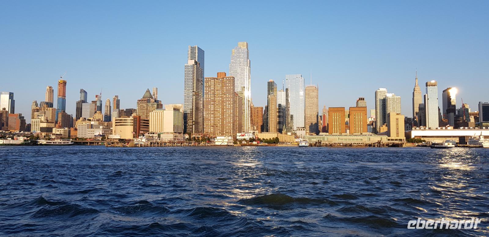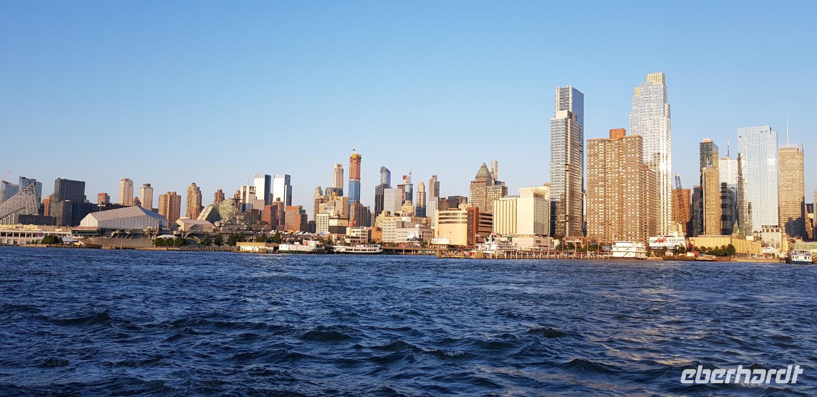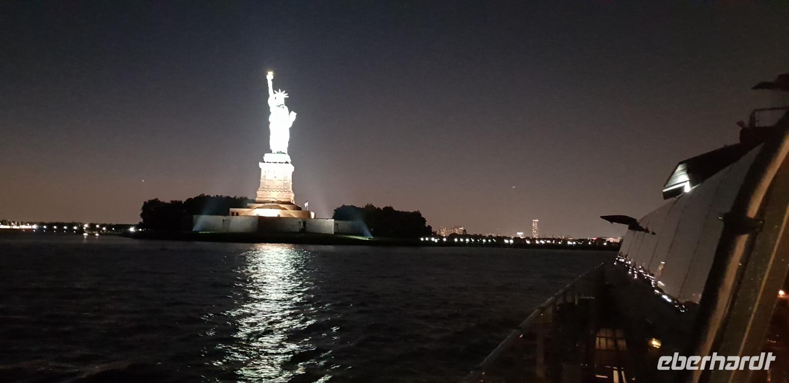Den Vormittag verbrachte jeder individuell bis wir uns am Nachmittag wieder im Hotel trafen. Mit der U-Bahn fuhren wir gemeinsam zum High Line Park, einer alten Güterzugtrasse, die zu einer schönen grünen Parkanlage umgebaut wurde. Wir spazierten von einem Ende zum anderen, bewunderten die vielen Pflanzen und Blumen, die liebevoll gepflanzt wurden und machten einige Pausen auf den vielen Bänken des Parks. Wir waren sehr beeindruckt von den neu entstehenden Wolkenkratzern und Luxus-Apartments links und rechts der Trasse. Hier können sich die namenhaften Architekten aus aller Welt so richtig austoben. Zum Abschluss besuchten wir noch die Markthallen des Chelsea Markets, bevor wir mit der Subway zum Hotel zurück fuhren. Um 18Uhr stand schon unser Transfer zum Spirit Curise Pier bereit. Also fuhren wir ca. 35min. vom Hotel in Richtung Hudson River, um dort an Bord eines Dinner-Schiffs zu gehen. Wir legten ab und fuhren bei einem traumhaften Sonnenuntergang an der imposanten Skyline vorbei. An Bord fehlte es uns an nix. Es gab gut gekühlte Getränke und feinstes Essen. Ob Ente, Rindfleisch oder Fisch, es schmeckte wieder einmal hervorragend. Die Fahrt ging gute 3 Stunden und wir fuhren vorbei an Lower Manhattan, durchquerten die Brooklyn Bridge, Manhattan Bridge und passierten die Freiheitsstatue. Ein toller Abschluss einer grandiosen New York Reise. Gegen 22Uhr erreichten wir wieder den Pier und wer wollte besuchte mit mir noch die Skybar „Bar 54" im Hyatt Hotel, bevor wir todmüde ins Bett fielen. :-)