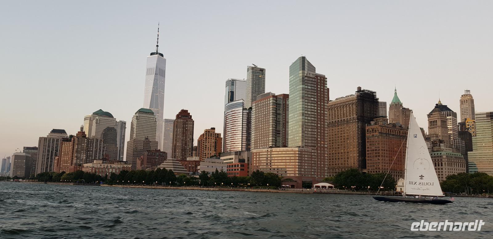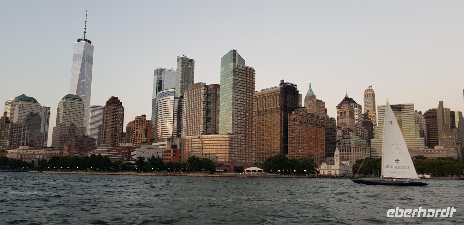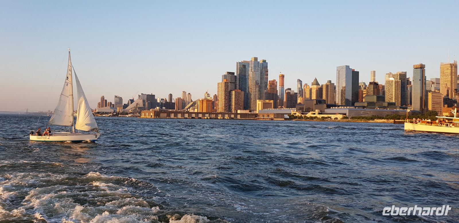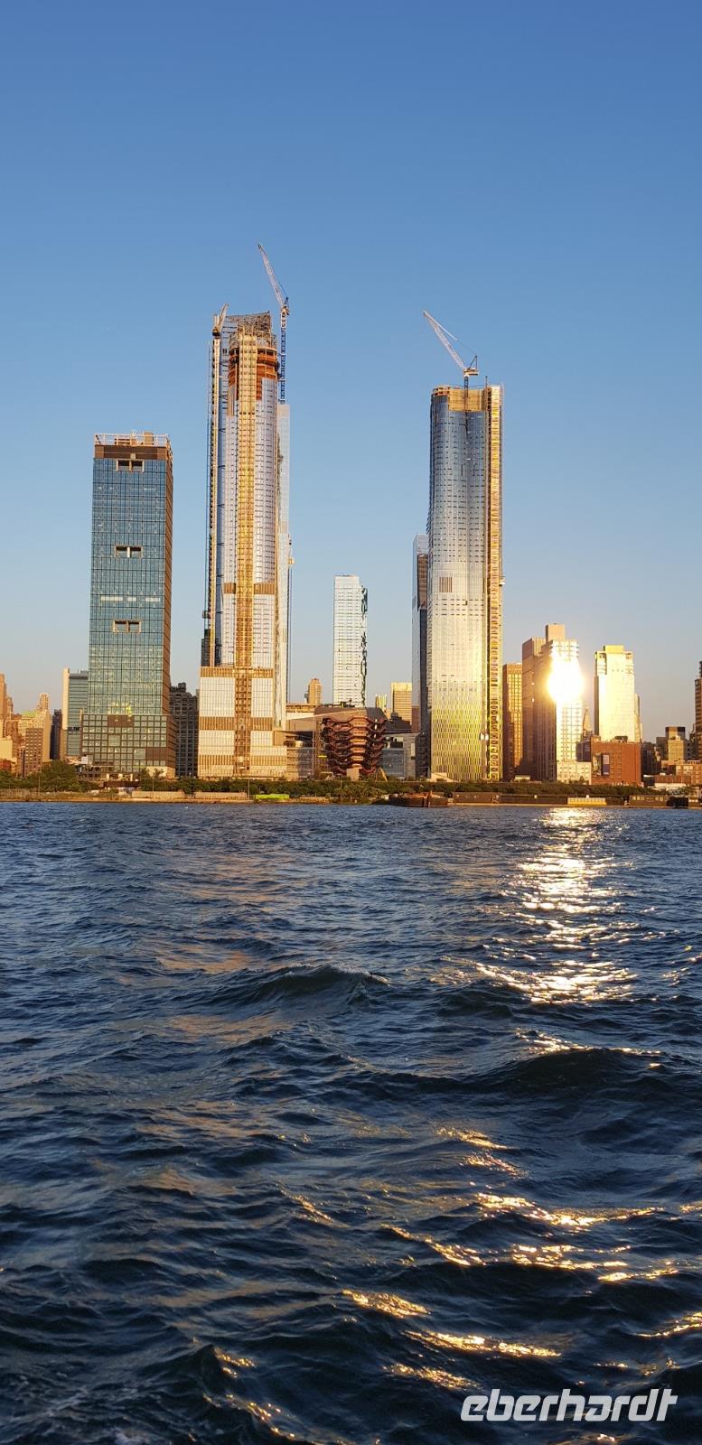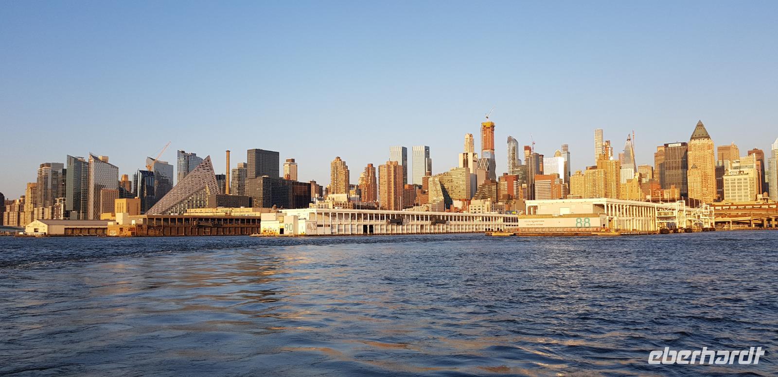 Den Vormittag verbrachte jeder individuell bis wir uns am Nachmittag wieder im Hotel trafen. Mit der U-Bahn fuhren wir gemeinsam zum High Line Park, einer alten Güterzugtrasse, die zu einer schönen grünen Parkanlage umgebaut wurde. Wir spazierten von einem Ende zum anderen, bewunderten die vielen Pflanzen und Blumen, die liebevoll gepflanzt wurden und machten einige Pausen auf den vielen Bänken des Parks. Wir waren sehr beeindruckt von den neu entstehenden Wolkenkratzern und Luxus-Apartments links und rechts der Trasse. Hier können sich die namenhaften Architekten aus aller Welt so richtig austoben. Zum Abschluss besuchten wir noch die Markthallen des Chelsea Markets, bevor wir mit der Subway zum Hotel zurück fuhren. Um 18Uhr stand schon unser Transfer zum Spirit Curise Pier bereit. Also fuhren wir ca. 35min. vom Hotel in Richtung Hudson River, um dort an Bord eines Dinner-Schiffs zu gehen. Wir legten ab und fuhren bei einem traumhaften Sonnenuntergang an der imposanten Skyline vorbei. An Bord fehlte es uns an nix. Es gab gut gekühlte Getränke und feinstes Essen. Ob Ente, Rindfleisch oder Fisch, es schmeckte wieder einmal hervorragend. Die Fahrt ging gute 3 Stunden und wir fuhren vorbei an Lower Manhattan, durchquerten die Brooklyn Bridge, Manhattan Bridge und passierten die Freiheitsstatue. Ein toller Abschluss einer grandiosen New York Reise. Gegen 22Uhr erreichten wir wieder den Pier und wer wollte besuchte mit mir noch die Skybar „Bar 54" im Hyatt Hotel, bevor wir todmüde ins Bett fielen. :-)