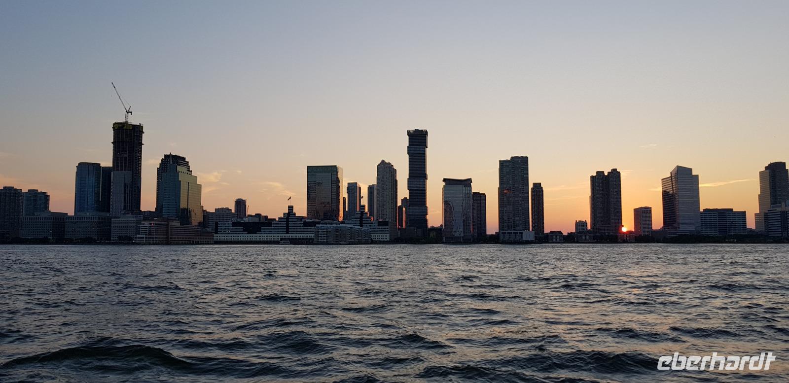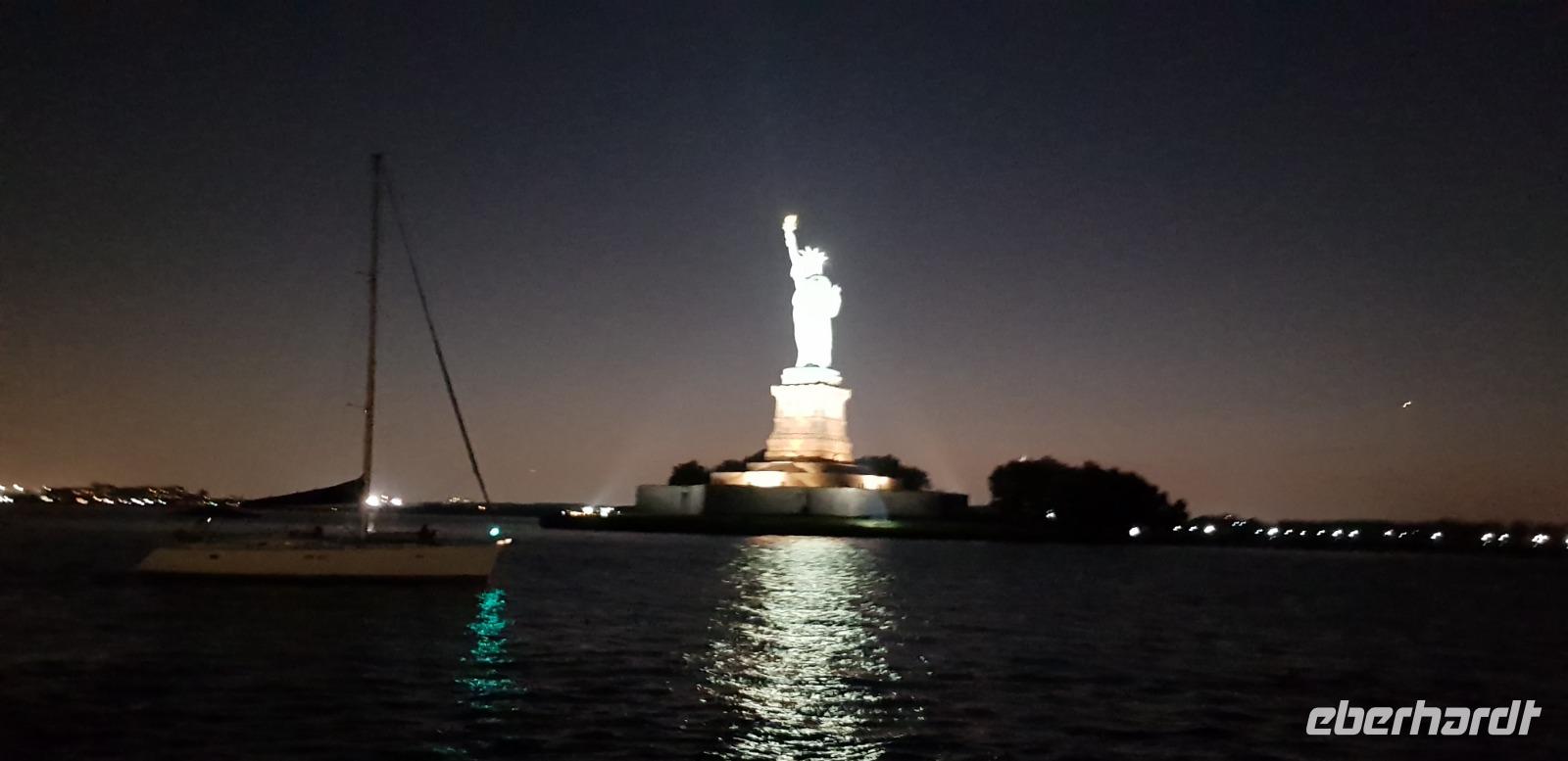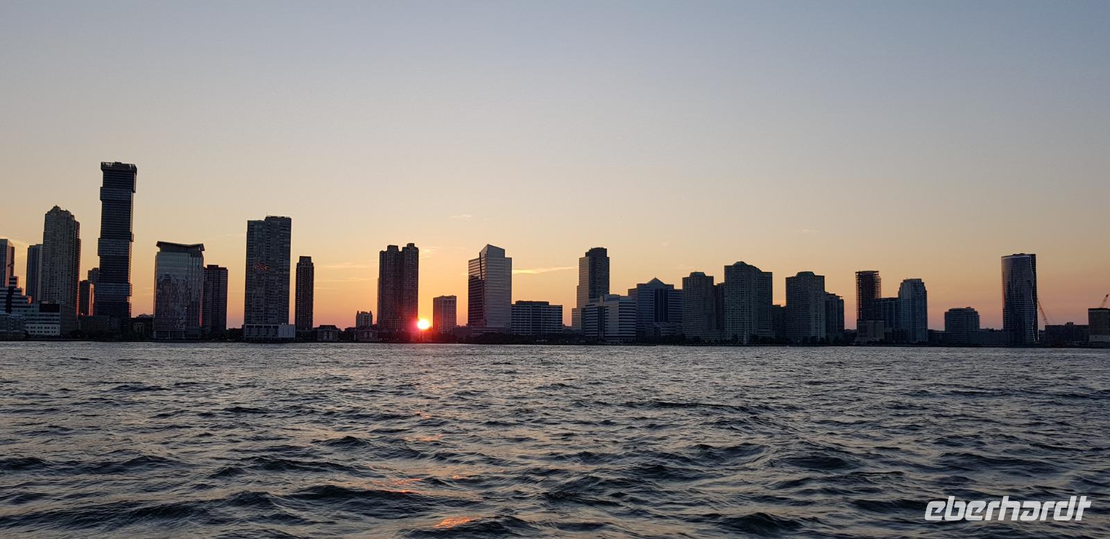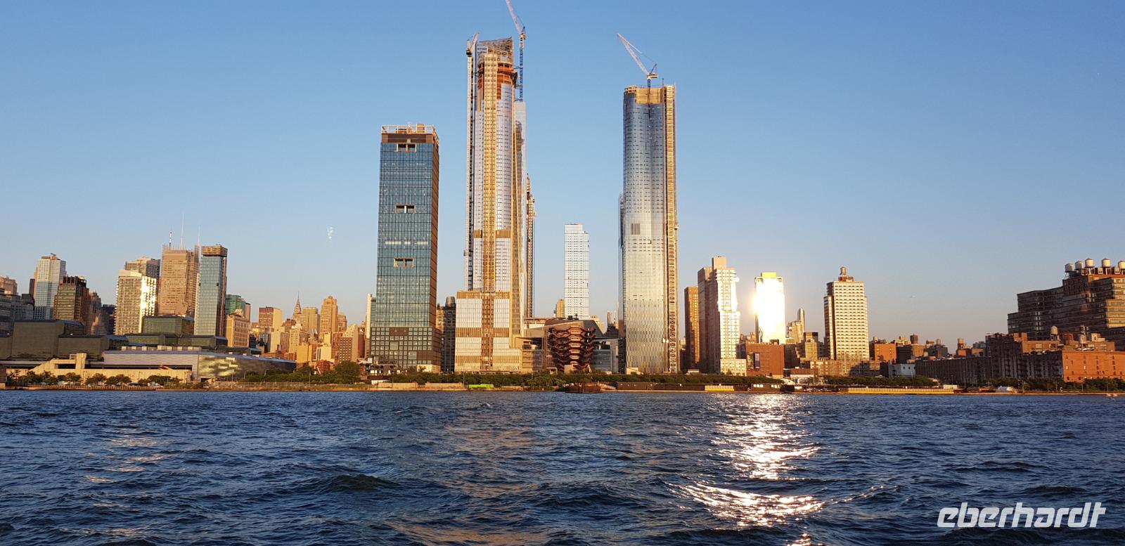 Den Vormittag verbrachte jeder individuell bis wir uns am Nachmittag wieder im Hotel trafen. Mit der U-Bahn fuhren wir gemeinsam zum High Line Park, einer alten Güterzugtrasse, die zu einer schönen grünen Parkanlage umgebaut wurde. Wir spazierten von einem Ende zum anderen, bewunderten die vielen Pflanzen und Blumen, die liebevoll gepflanzt wurden und machten einige Pausen auf den vielen Bänken des Parks. Wir waren sehr beeindruckt von den neu entstehenden Wolkenkratzern und Luxus-Apartments links und rechts der Trasse. Hier können sich die namenhaften Architekten aus aller Welt so richtig austoben. Zum Abschluss besuchten wir noch die Markthallen des Chelsea Markets, bevor wir mit der Subway zum Hotel zurück fuhren. Um 18Uhr stand schon unser Transfer zum Spirit Curise Pier bereit. Also fuhren wir ca. 35min. vom Hotel in Richtung Hudson River, um dort an Bord eines Dinner-Schiffs zu gehen. Wir legten ab und fuhren bei einem traumhaften Sonnenuntergang an der imposanten Skyline vorbei. An Bord fehlte es uns an nix. Es gab gut gekühlte Getränke und feinstes Essen. Ob Ente, Rindfleisch oder Fisch, es schmeckte wieder einmal hervorragend. Die Fahrt ging gute 3 Stunden und wir fuhren vorbei an Lower Manhattan, durchquerten die Brooklyn Bridge, Manhattan Bridge und passierten die Freiheitsstatue. Ein toller Abschluss einer grandiosen New York Reise. Gegen 22Uhr erreichten wir wieder den Pier und wer wollte besuchte mit mir noch die Skybar „Bar 54" im Hyatt Hotel, bevor wir todmüde ins Bett fielen. :-)