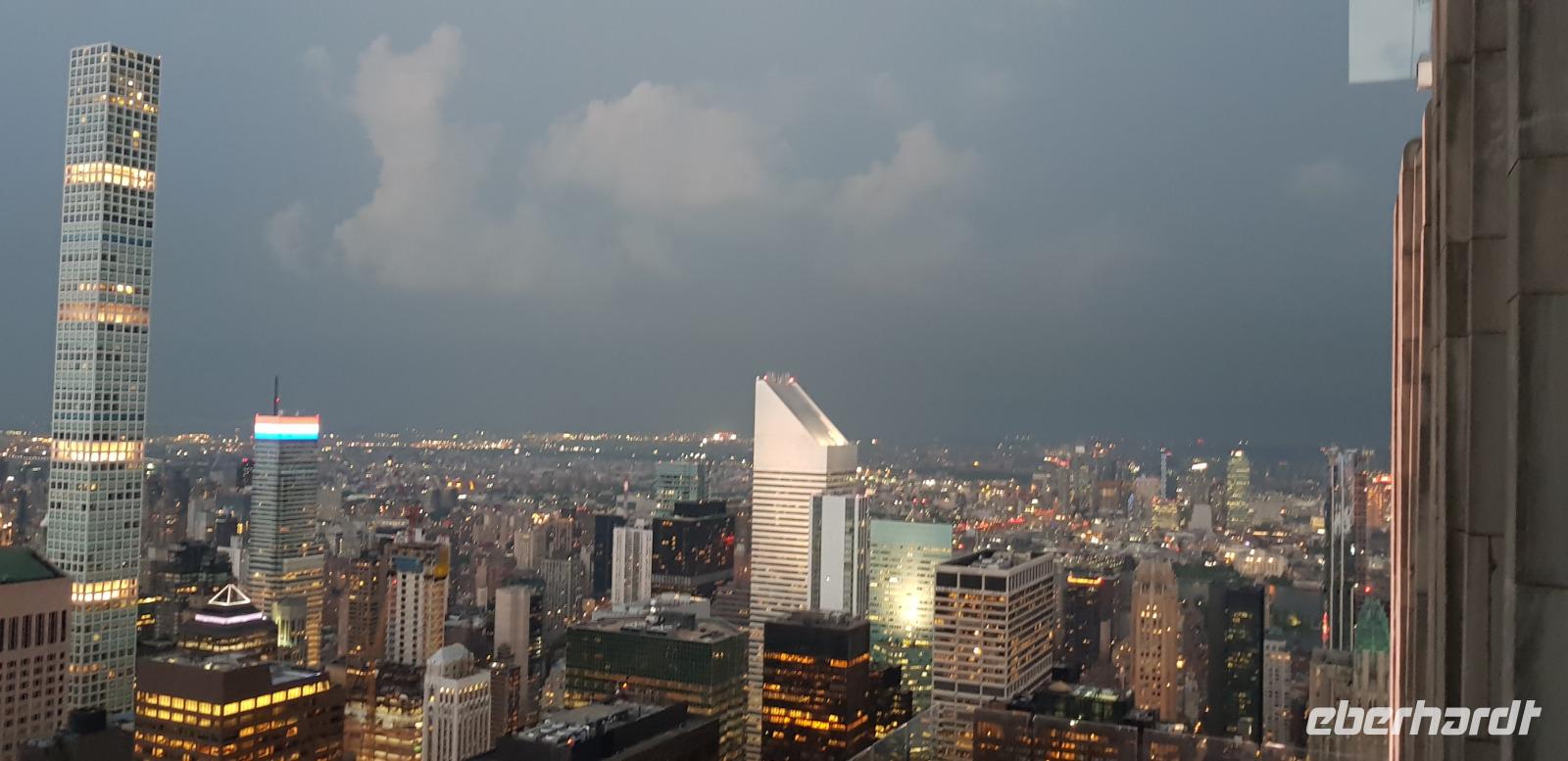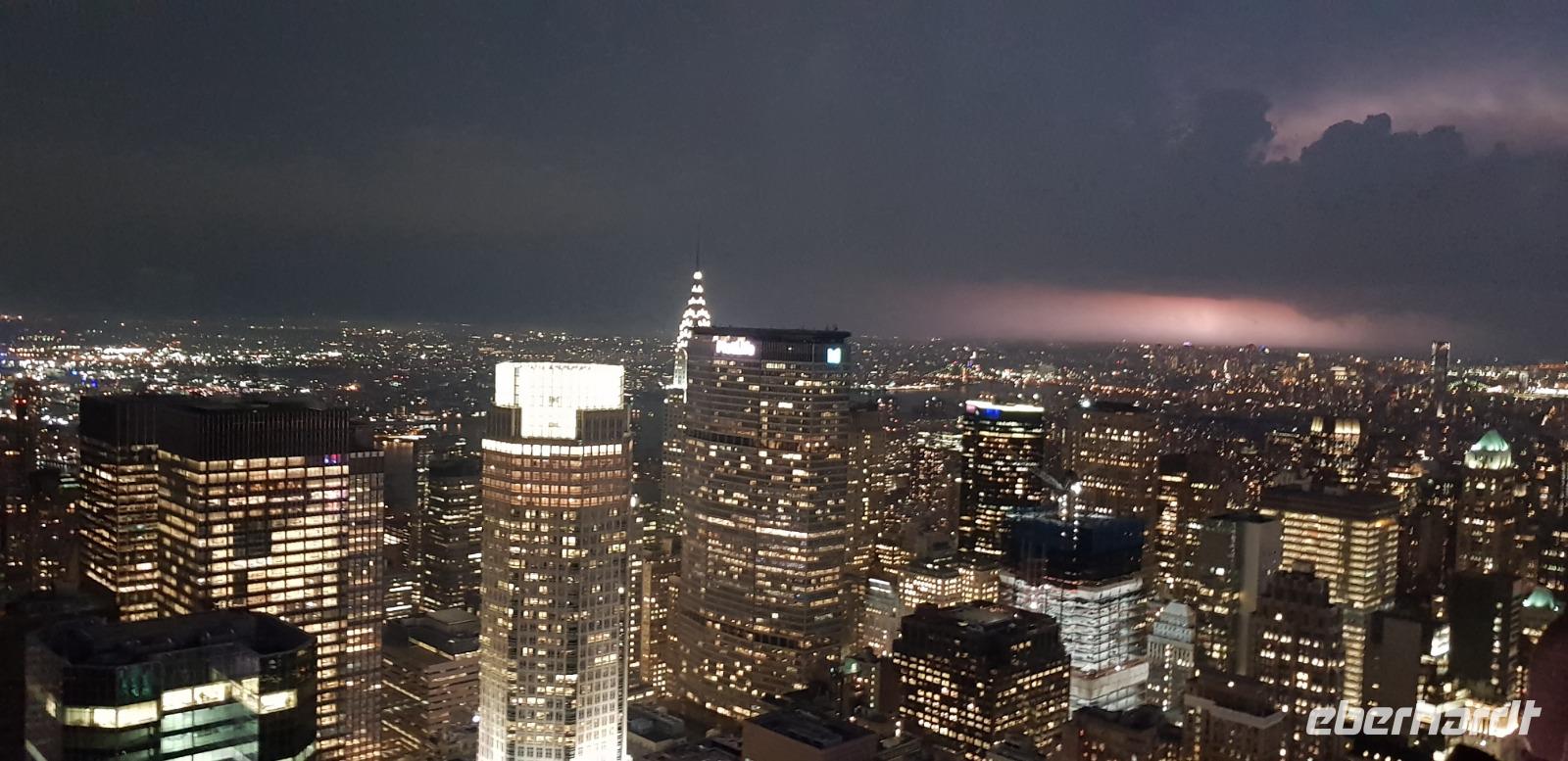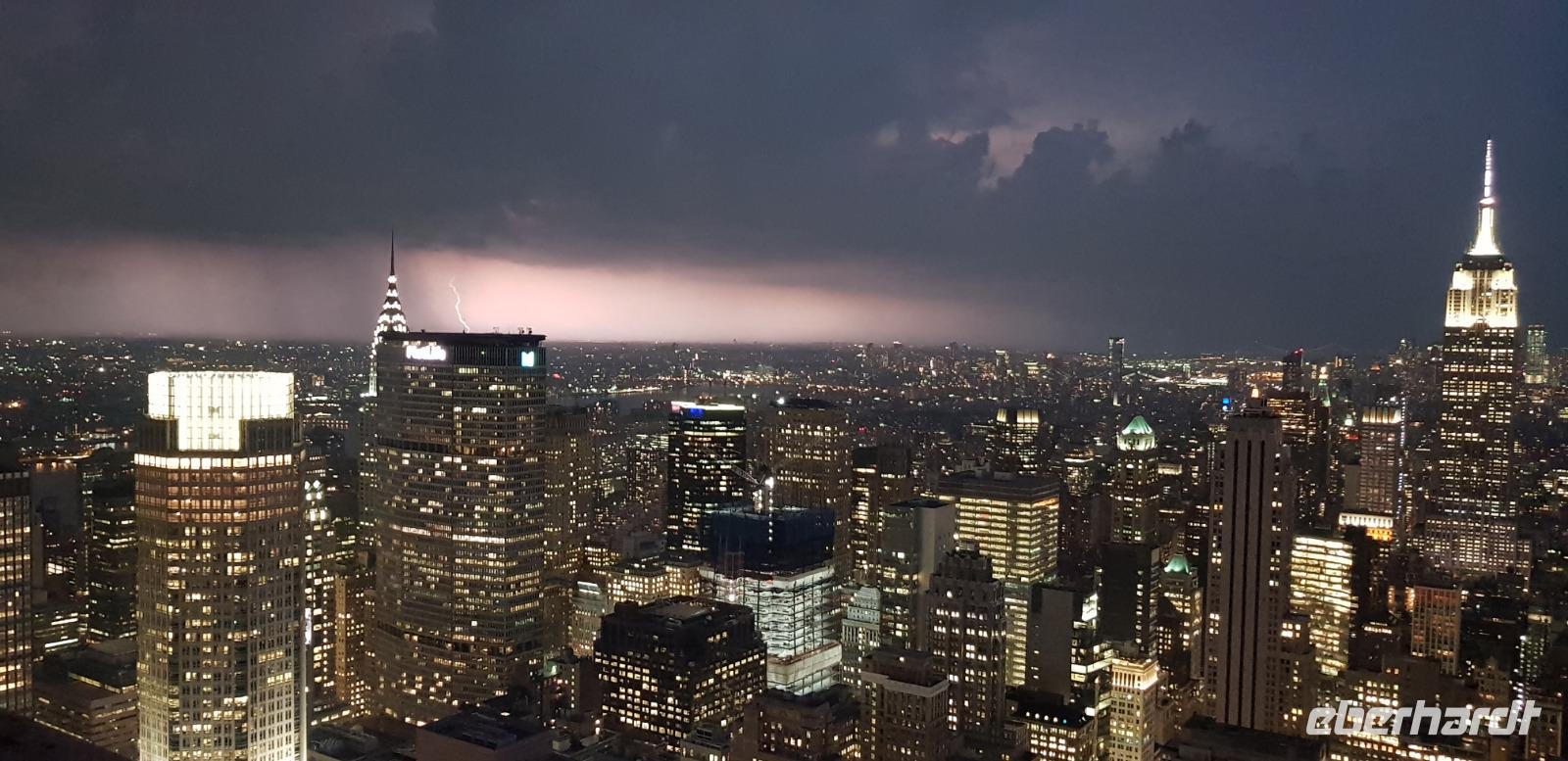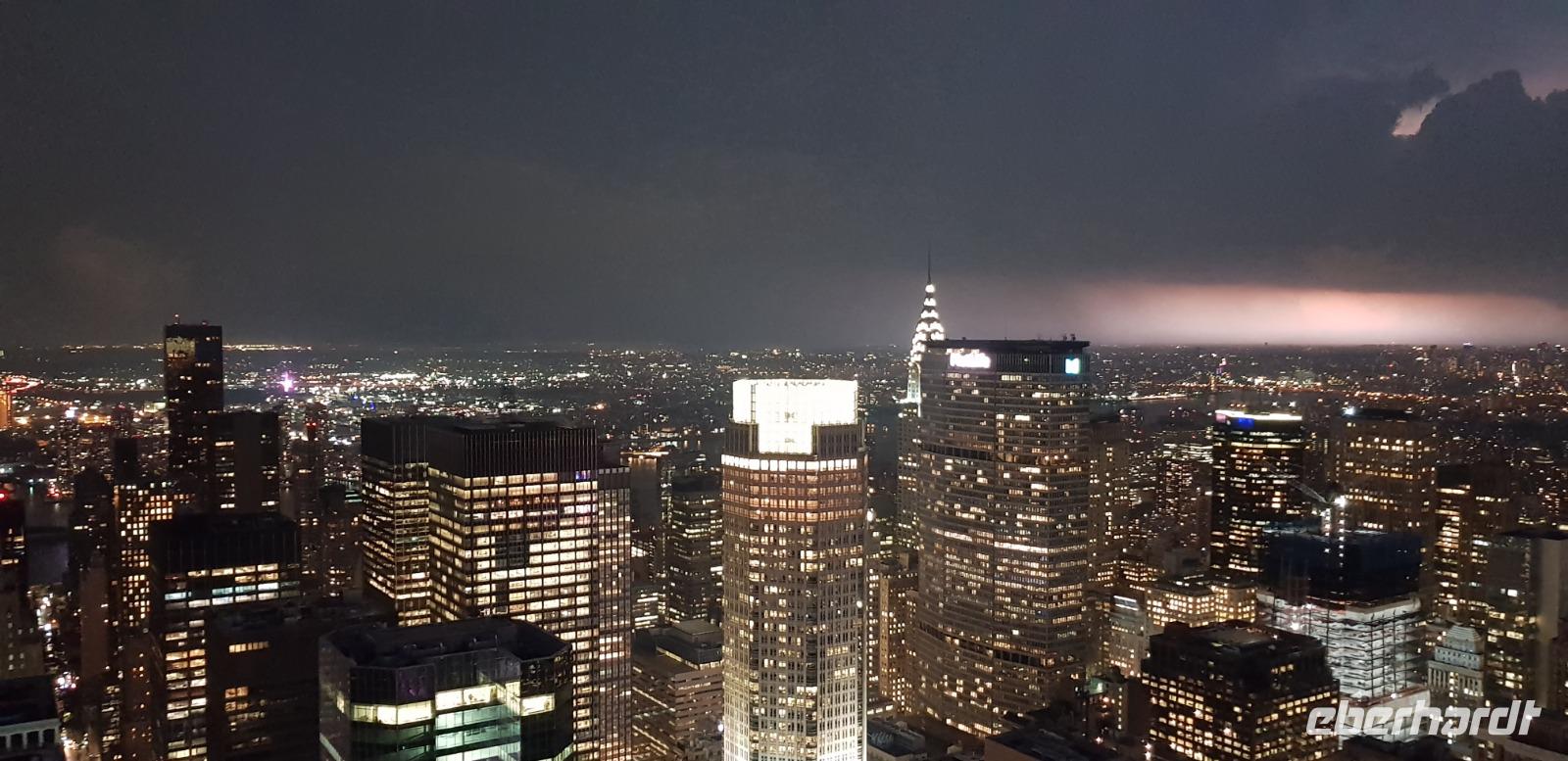 Am späten Nachmittag fuhren wir wieder mit der Subway zurück und besuchten noch die Aussichtsplattform „Top of the Rocks" im Rockefaller Center. Auch von hier war die Aussicht überwältigend. Jedoch begann es zu Donnern und Blitzen, was zu ganz besonderen Fotos führte. Als dann die Regenfront immer näher kam, schauten wir uns die Stadt weiter von drinnen an. Nichts desto trotz war es ein tolles Erlebnis.