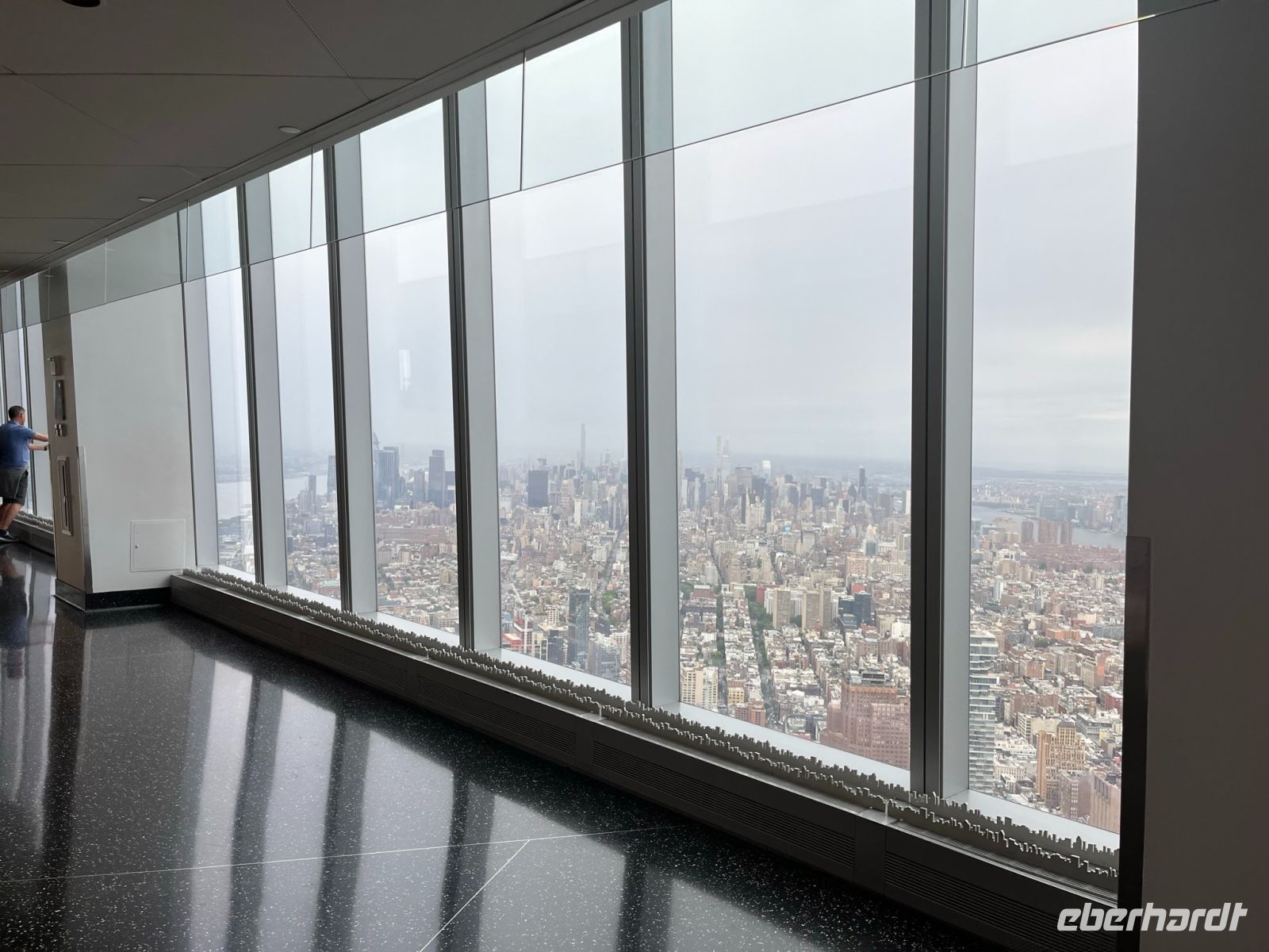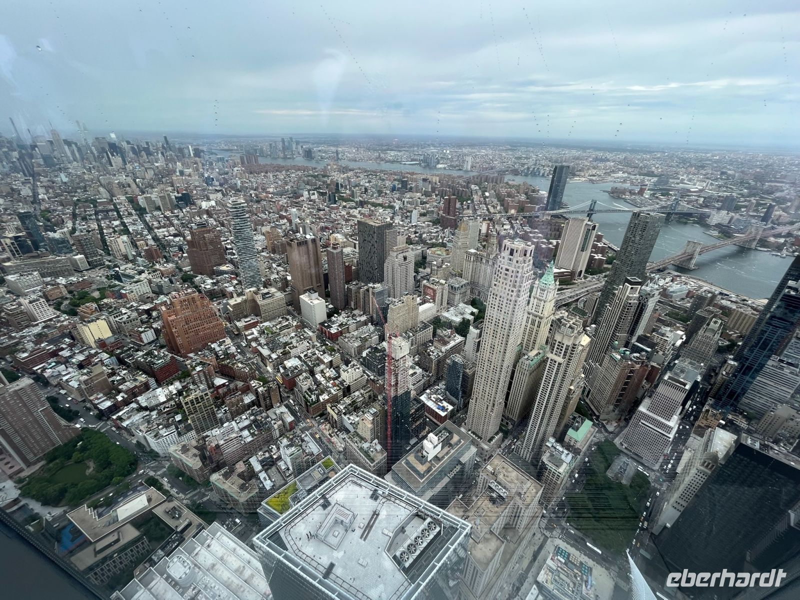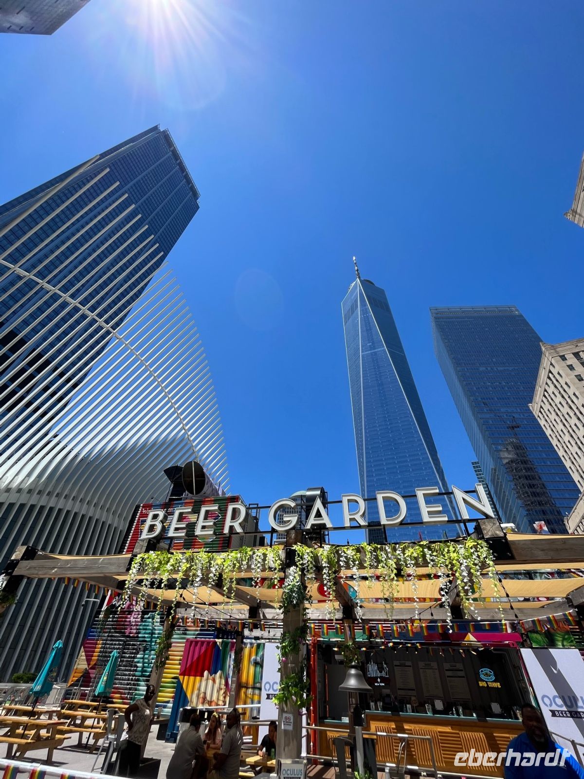 Um die zu uns genommen Kalorien wieder runterzubekommen, spazierten wir zum Brooklyn Bridge Park und dann weiter über die Brooklyn Bridge mit gigantischem Blick auf die Skyline. 8,5 km später beschlossen wir gemeinschaftlich, dass wir eine kleine Pause benötigten. Wir setzen uns in den Oculus Biergarten, den wir Tage zuvor entdeckt hatten und stärkten uns mit ein…zwei Bier. Mit Blick auf das 543 Meter hohe One World Trade Center saßen wir da in diesem Biergarten, genossen die Sonne und stärkten uns mit einem Getränk. Ein wenig später ging es allerdings schon weiter und wir fuhren in 47 Sekunden 102 Stockwerke hinauf auf das One World Trade Center mit einer sehr coolen Fahrtstuhlshow und einem noch cooleren Empfang oben auf der Plattform.