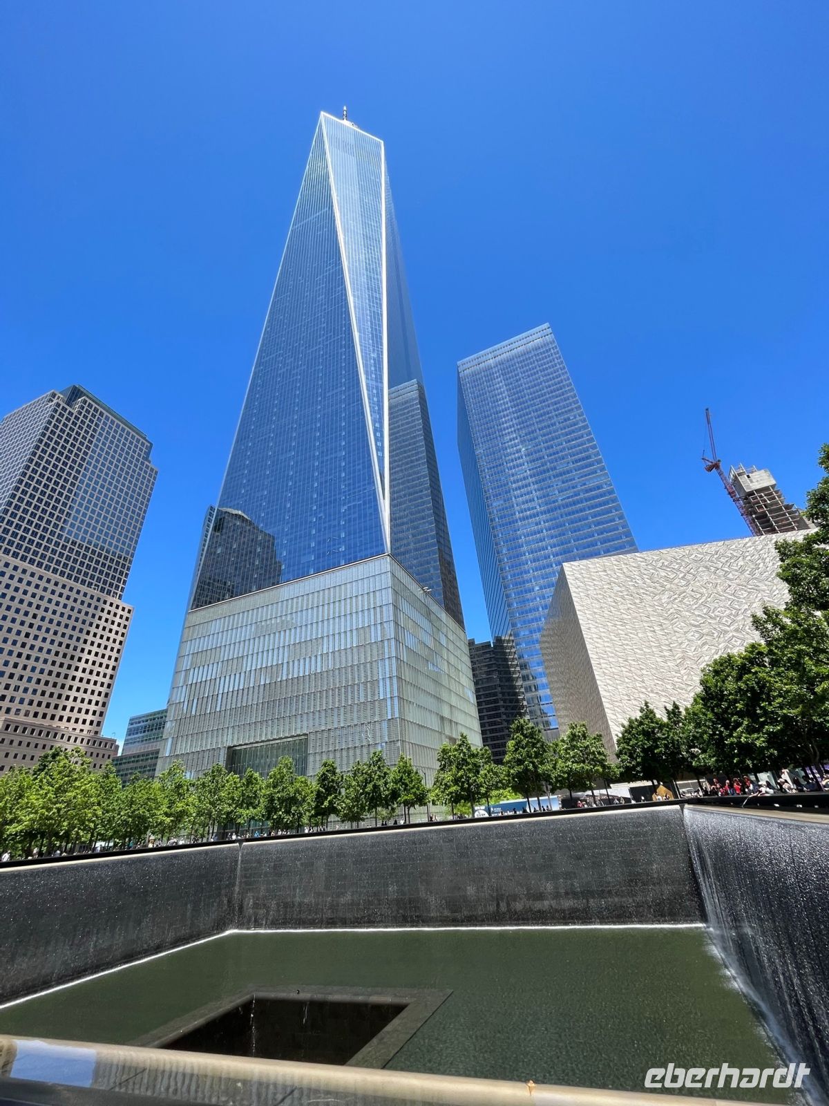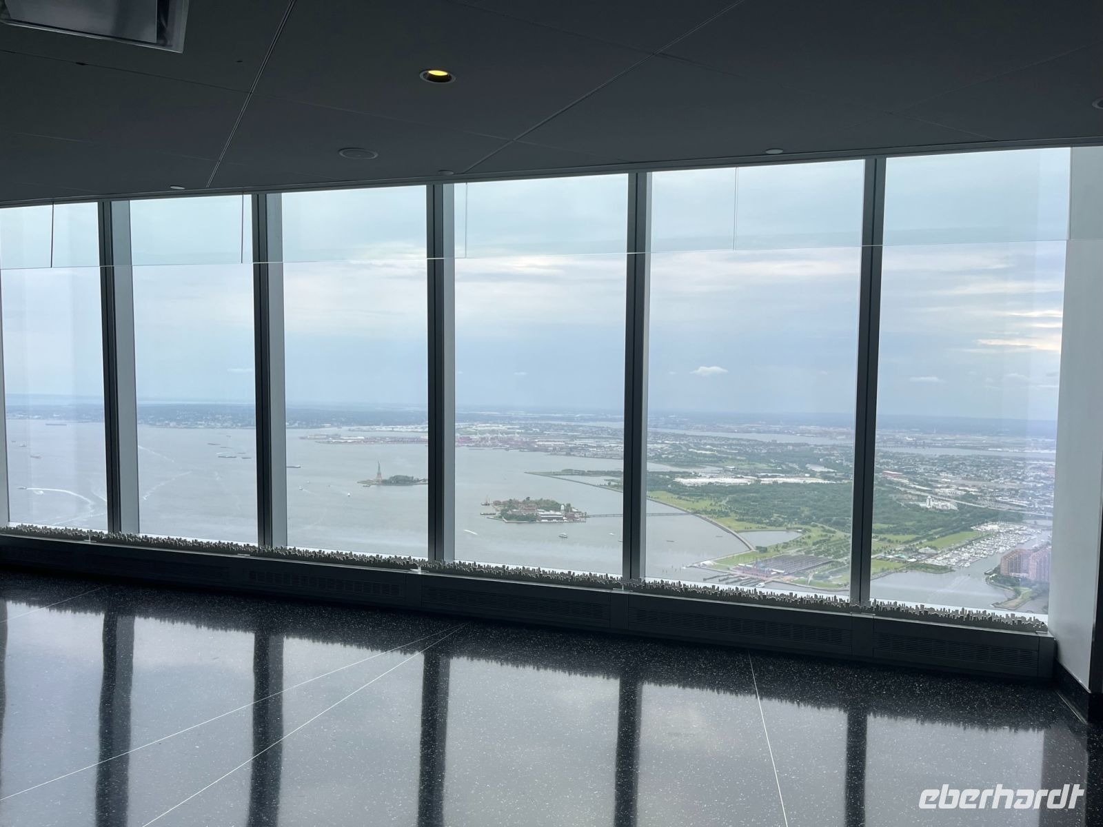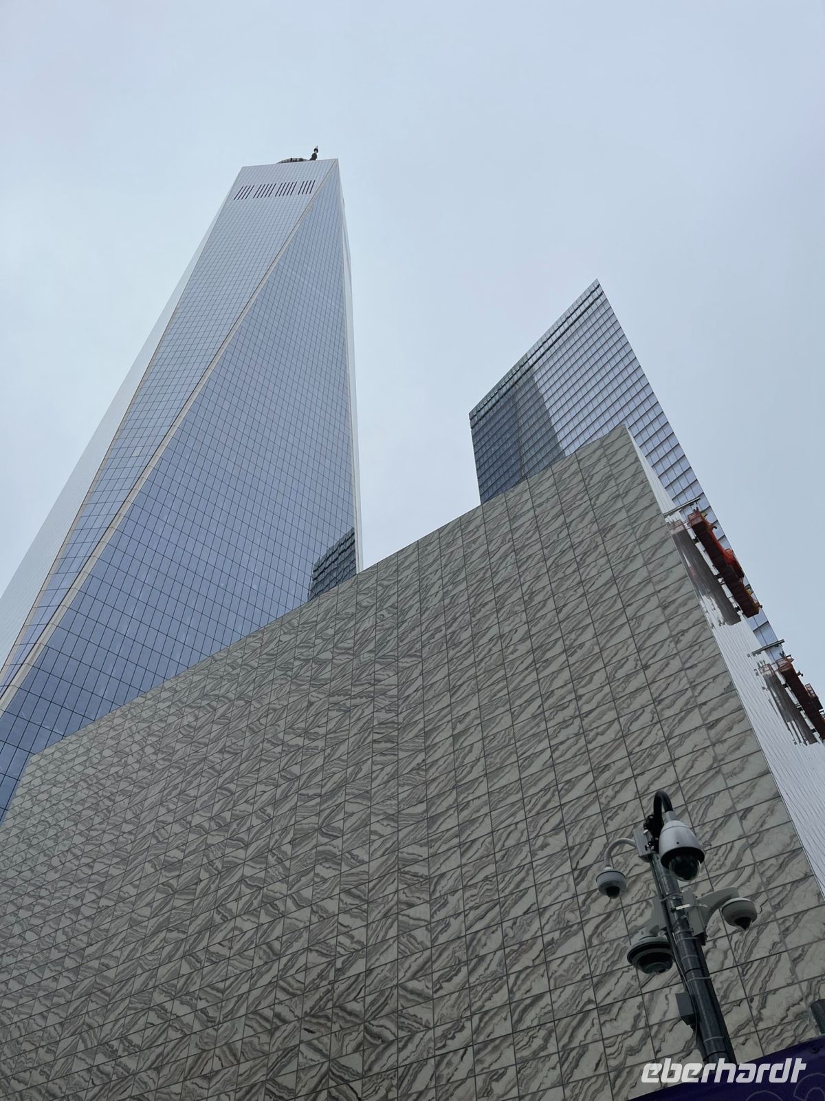 Um die zu uns genommen Kalorien wieder runterzubekommen, spazierten wir zum Brooklyn Bridge Park und dann weiter über die Brooklyn Bridge mit gigantischem Blick auf die Skyline. 8,5 km später beschlossen wir gemeinschaftlich, dass wir eine kleine Pause benötigten. Wir setzen uns in den Oculus Biergarten, den wir Tage zuvor entdeckt hatten und stärkten uns mit ein…zwei Bier. Mit Blick auf das 543 Meter hohe One World Trade Center saßen wir da in diesem Biergarten, genossen die Sonne und stärkten uns mit einem Getränk. Ein wenig später ging es allerdings schon weiter und wir fuhren in 47 Sekunden 102 Stockwerke hinauf auf das One World Trade Center mit einer sehr coolen Fahrtstuhlshow und einem noch cooleren Empfang oben auf der Plattform.