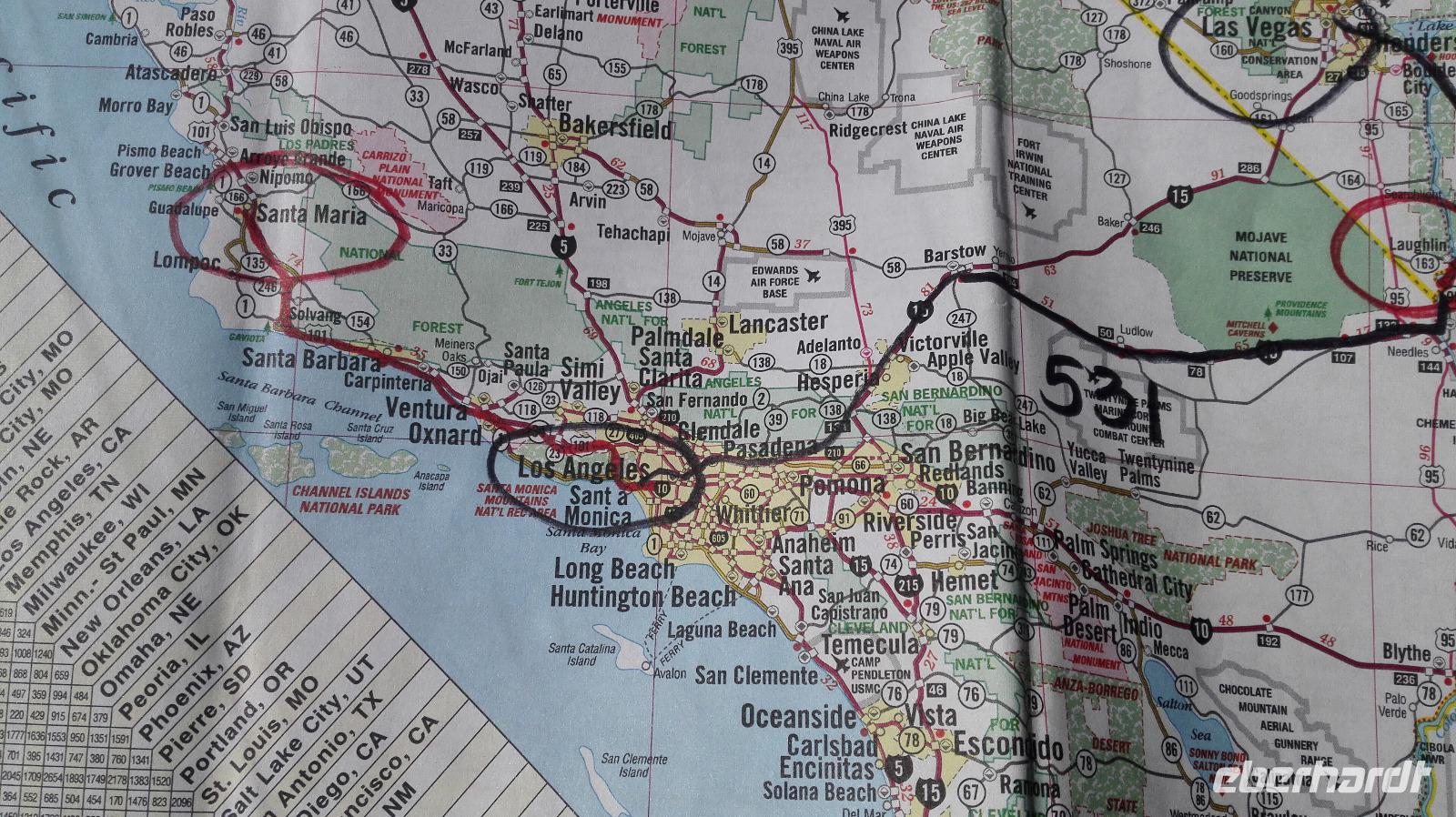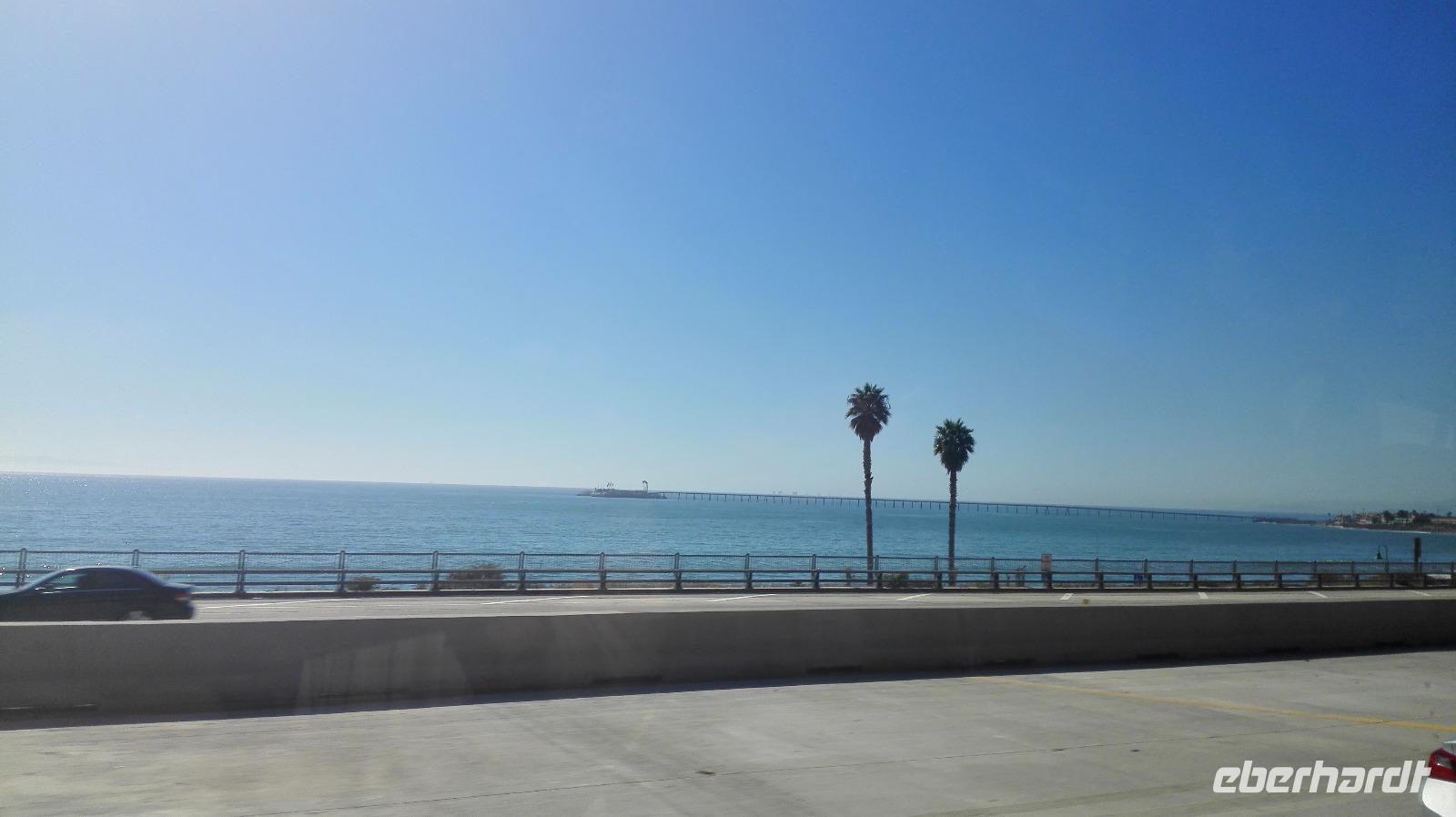 Wir stärken uns gemeinsam beim Frühstück vom Buffet im Hotel. Warm empfängt uns dieser Morgen, aber auch sehr windig. Bis wir die Koffer verladen haben, ziert eine Sturmfrisur unsere Köpfe. Wir fahren lange Zeit durch die Wüste. Das Land ist karg und eintönig. Catharina erzählt von den ersten Siedlern und wie beschwerlich es wohl gewesen sein muss, hier mit dem Planwagen und Ochsenfuhrwerk voran zu kommen. Am späten Vormittag erreichen wir die Westernstadt Calico. Wir bummeln zwischen den kleinen Geschäften, dem Salon, vorbei am Flaschenhaus durch das Örtchen. Ein bisschen fühlt man sich tatsächlich in die damalige Zeit zurück versetzt. Inzwischen ist es ziemlich warm geworden. Bei über 30 Grad fahren wir weiter in Richtung Los Angeles. Bereits bei der Einfahrt in die Stadt erfahren wir von Catharina allerhand Wissenswertes und stehen immer wieder im zähen Verkehr. Einmal quer durch die Stadt geht es zuerst zu den Universal Studios, um hier eine kleine, späte Mittagspause einzulegen, und anschließend weiter zum Santa Monica Pier. Wir haben freie Zeit, können durch die parallel verlaufende Einkaufsstraße schlendern oder barfuß am Stand entlang, durch die Gischt des Pazifik laufen. Wir treffen uns direkt auf dem Pier um zusammen zu Abend zu Essen. Bubba Gump, benannt nach dem Film Forrest Gump, so heißt unser Restaurant. Hier gibt es alles rund um Shrimps. Quirlig, laut und amerikanisch ist es hier. Doch das stört uns nicht. Die Sonne geht unter, während wir uns den ersten Gang schmecken lassen und taucht alles in ein orangenes Licht. Wahnsinn - Abendessen bei Sonnenuntergang am berühmten Santa Monica Pier mit Blick aufs Meer! Wirklich etwas ganz besonderes. Das Essen ist typisch amerikanisch, vielleicht nicht ganz nach Jedermanns Geschmack. Aber zum Reisen gehört es dazu, auch neue Dinge zu probieren und sich auch kulinarisch ein Bild eines Landes zu machen. Durch das nächtliche LA fahren wir zu unserem Hotel. Das Millenium Biltmore. Gold, prunkvoll und sehr luxuriös. Das perfekte Domizil für diese Nacht.