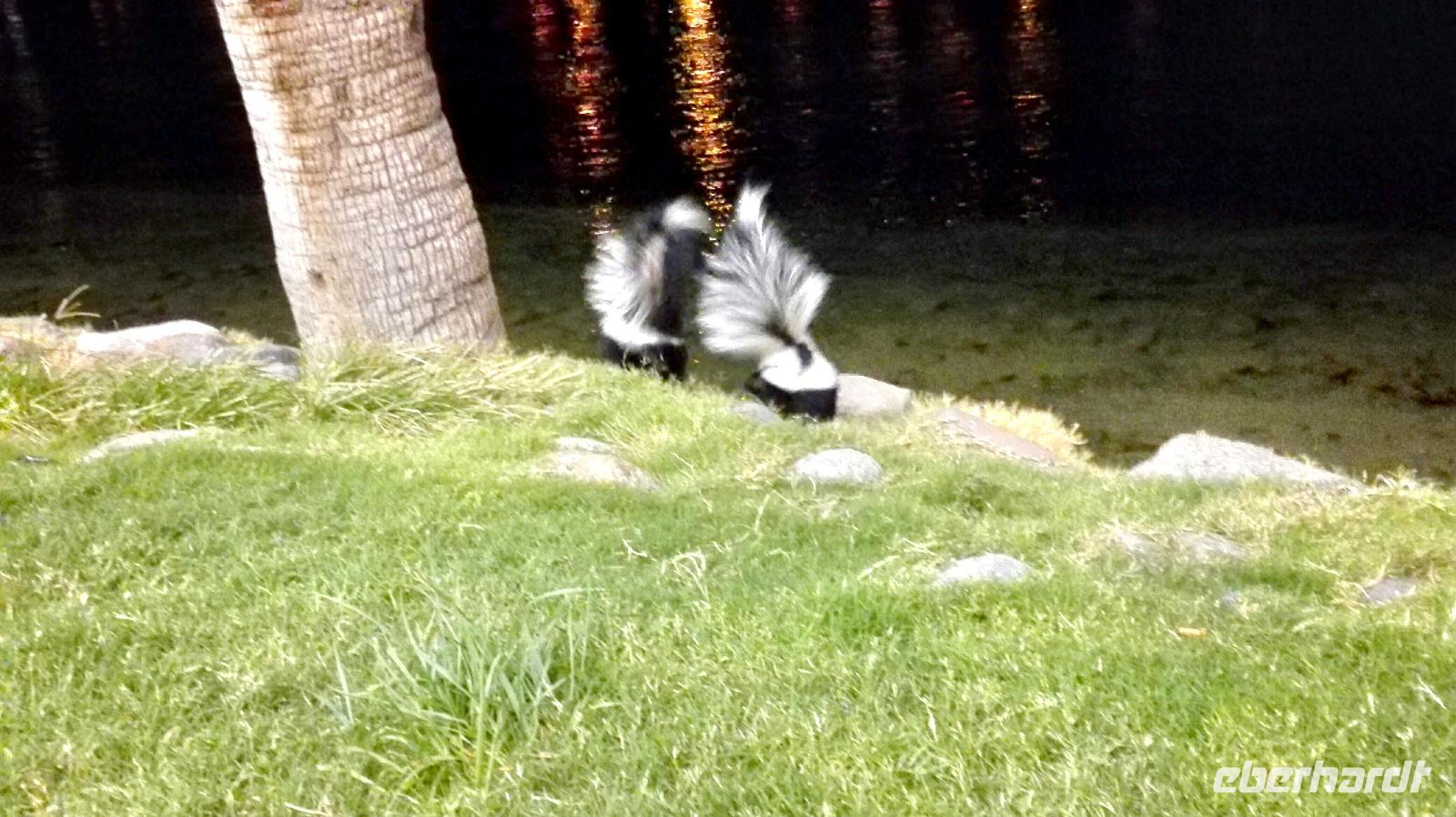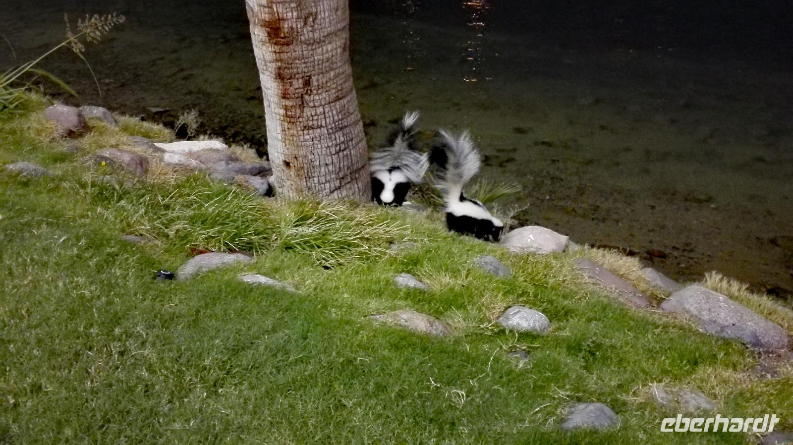 Wer will kann heute fakultativ den Grand Canyon von oben, aus der Luft erleben. Catharina organisiert Rundflüge mit dem Helikopter oder einem kleinen Sportflugzeug. Am frühen Morgen startet die Hälfte der Gruppe zum Fliegen. Alle anderen dürfen etwas länger schlafen. Waren die Tage doch voller neuer Eindrücke und die Zeitverschiebungen tragen auch dazu bei, dass eine Mütze Schlaf ganz gut tut. Am späten Vormittag starten wir noch einmal zum Grand Canyon. Ein anderer Aussichtspunkt, eine neue Perspektive - aber mindestens genauso beeindruckend. Auch heute gibt die Spätsommersonne alles was Sie kann. Knapp 34 Grad würde das Thermometer heute noch erreichen. Auch der Himmel leuchtet wieder in blau, sodass der Kontrast zum rot-orange farbigen Canyon unsere Bilder wieder einmal zu Postkartenmotiven werden lässt. Weiter geht die Fahrt nach Seligmann, ein kleines buntes Städtchen an der Route 66. Hier gibt es alles was irgendwie zur Kultstraße oder wie Catharina sagt, zur „Mother of Routes" gehört. Wir bummeln durch die kleinen Souvenirläden. Anschließend befahren wir die Route 66 für einige Kilometer, sehen Antilopen, zählen die Wagons der scheinbar endloslangen Züge und probieren unterwegs kleine Minidonuts, eine der vielen amerikanischen Spezialitäten. Am Abend erreichen wir Laughlin, eine Stadt direkt am Colorado River. Ein bisschen erinnert uns das Hotel an Las Vegas, befindet sich hier nämlich auch ein großes Casino im Erdgeschoss. Wir verabreden uns, wer möchte, zum gemeinsamen Abendessen vom Buffet und beschließen im Anschluss noch einen Verdauungsspaziergang zu unternehmen. Wir gehen am Fluss entlang. Hier gibt es Waschbären, Stinktiere und dicke schwarze Karpfen. Mutig versuchen wir die Stinktiere zu fotografieren. Immer wieder heben diese bedrohlich den Schwanz und wir treten den Rückzug an. Amüsiert beobachten wir die Tierchen und lassen so gut gelaunt diesen erlebnisreichen Tag ausklingen.