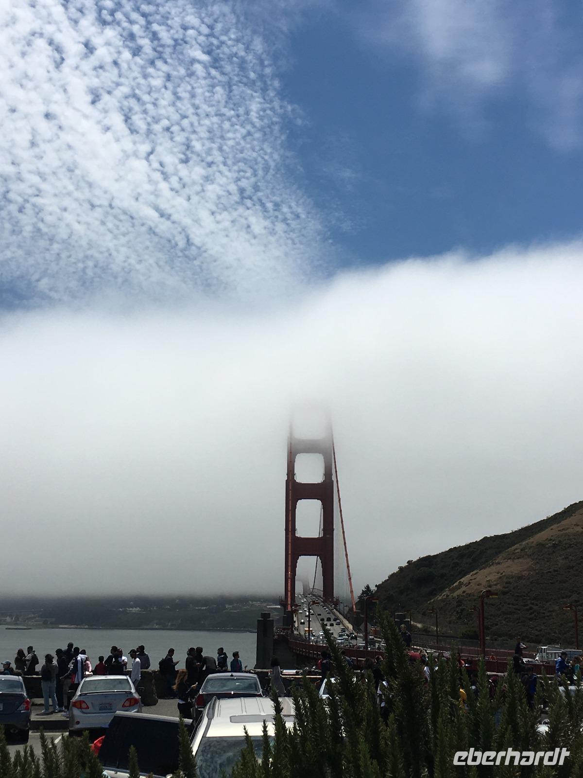 Puh, der erste Tag seit New York, an welchem wir nicht an unsere Koffer denken müssen, denn wir haben 2 Übernachtungen in San Francisco. Leider ist das Wetter alles andere als gut. Dicker Nebel hängt über der Skyline von San Francisco, auch die Golden Gate Bridge hüllt sich in Wolken. Wir lassen uns davon aber nicht beirren und haben die Gelegenheit zu einer Stadtrundfahrt durch SF. Alamo Square, Union Square, Chinatown. Zum Schluss bringt uns der Bus zur berühmten Golden Gate Bridge, welche wir zu Fuß überqueren wollen. Die gigantische Hängebrücke ist das Wahrzeichen der Stadt und für viele auch ein Nationalsymbol der Vereinigten Staaten. Die Brücke ist rund 2,7 Kilometer lang und 230 Meter hoch. Wir begeben uns auf den Weg über die Brücke und nach rund 40 Minuten erreichen wir das andere Ende. Hier nimmt uns wieder unser Busfahrer in Empfang und bringt uns nun nach Sausalito, eine kleine Künstlerkolonie, traumhaft in der Bucht von San Francisco gelegen. Leider haben wir hier nicht allzu viel Zeit, da wir unsere Fähre zurück nach San Francisco schaffen müssen. Am Pier 39 angekommen, schlendern wir noch ein wenig durch die Straßen und beobachten wieder zahlreiche Seelöwen und Robben beim Sonnenbad am Pier 39. Wir entschließen uns alle dazu, mit den berühmten Cable Cars zurück zum Hotel zu fahren. Ein absolutes Muss für jeden Besucher!