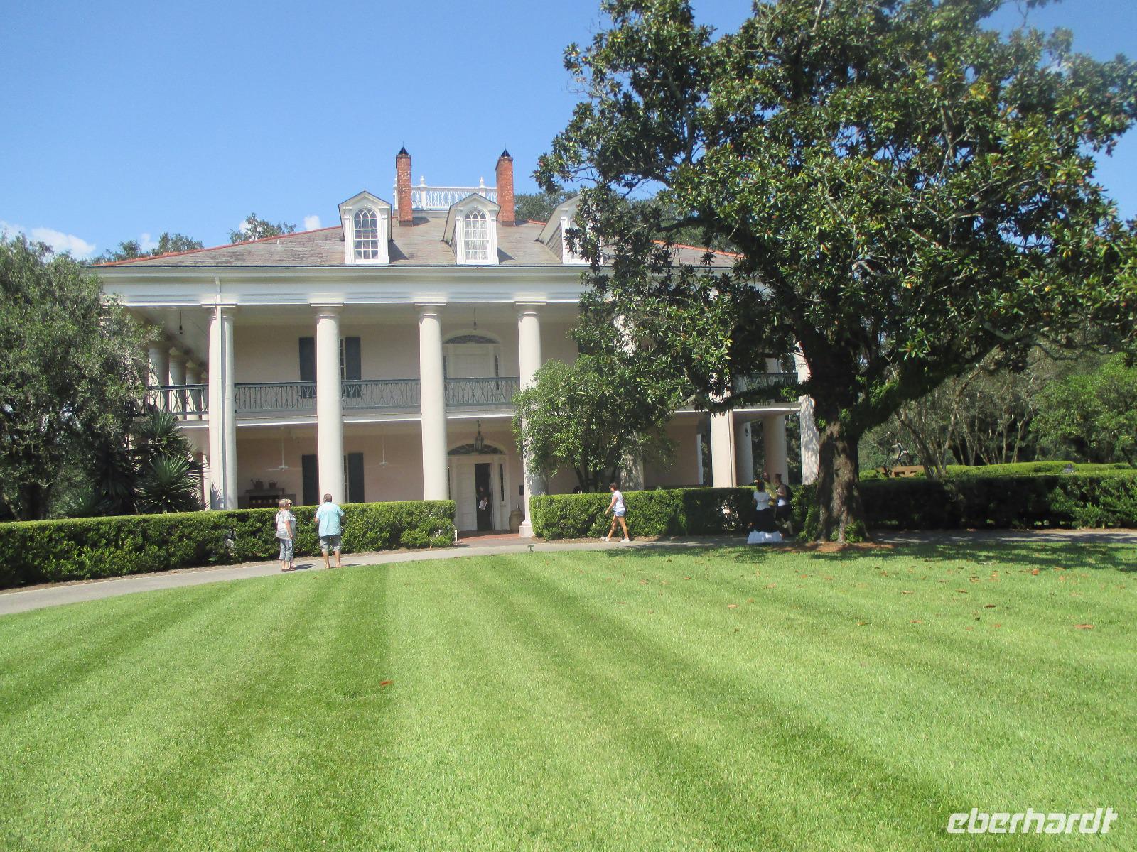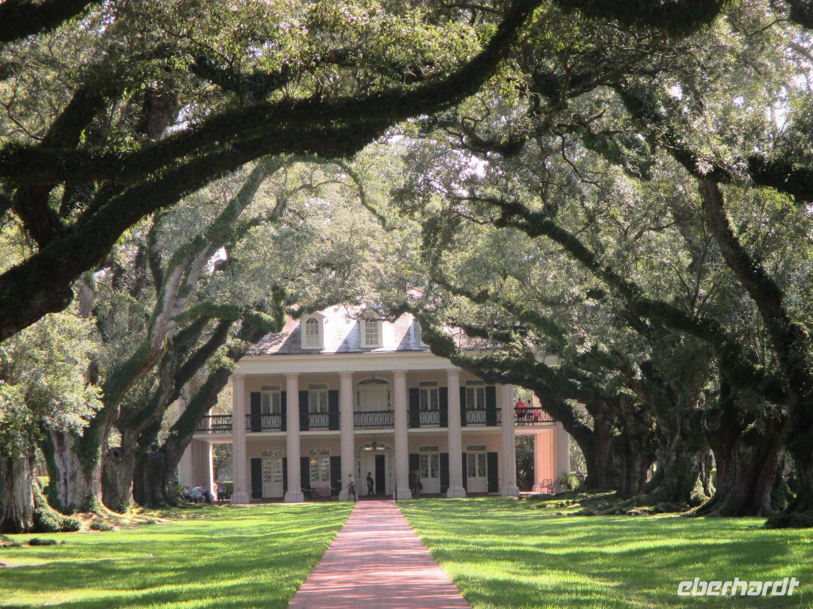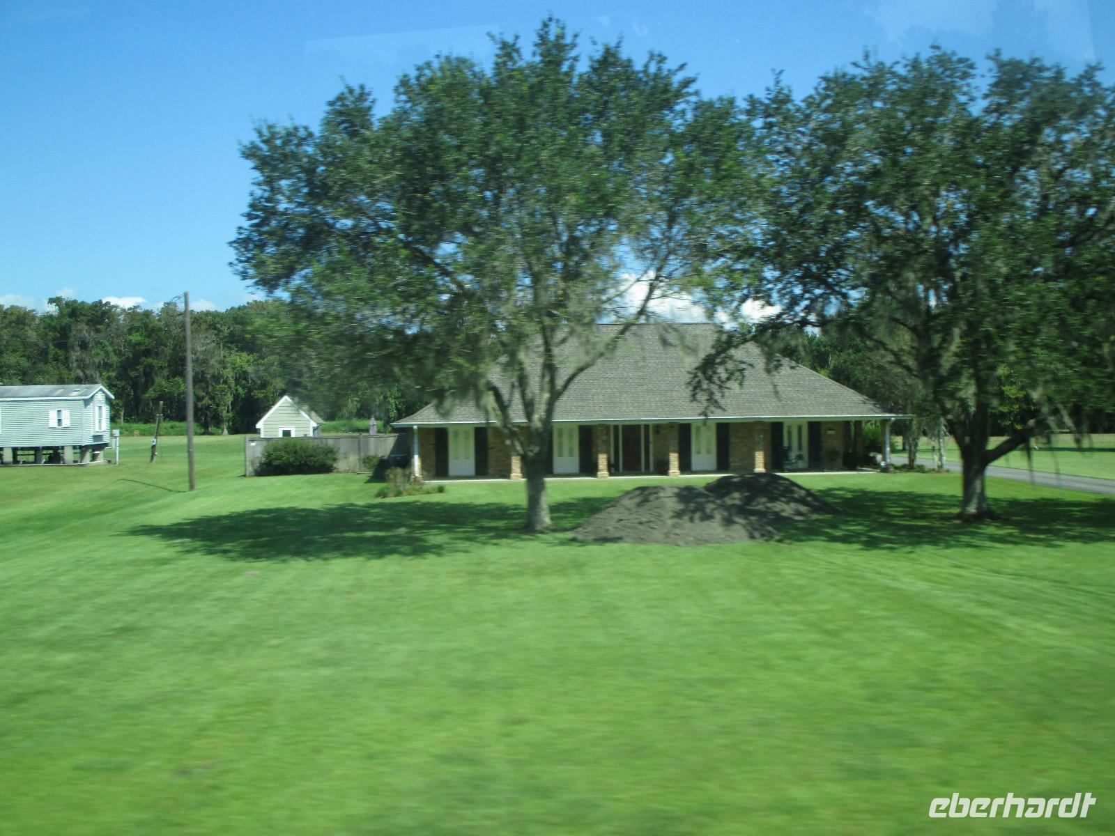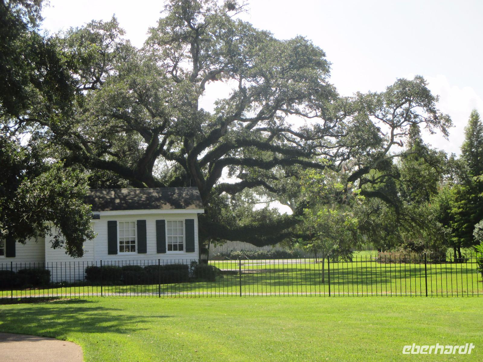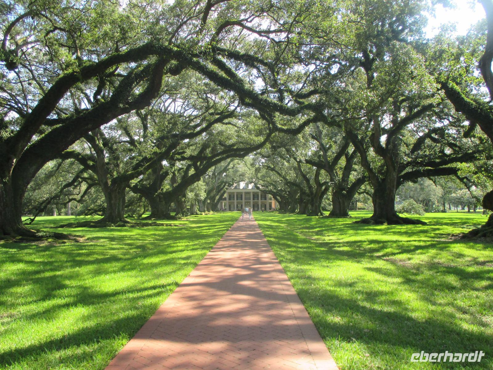 Ein weiteres Highlight erwartet uns heute. Aber leider heißt es erst einmal Abschied nehmen von New Orleans, eine Stadt, die uns sehr beeindruckt hat. Unser Weg führt uns durch die Abgeschiedenheit Louisanas zu Roland, der hier lebt und ein großes Stück Land besitzt. Er begrüßt uns ganz freudig und schon dürfen wir es uns auf seinem großen, zumindest für uns kleine Gruppe, gemütlich machen. Sicher lenkt er das Boot rückwärts aus dem Hafen hinaus und langsam gleiten wir entlang des Wasserkanals. Dabei sehen wir als allerstes einen Reiher. Aber auch die vielen Bäume mit dem spanischen Moos, das Schilf und all die endemischen Pflanzen lassen unsere Fotoapparate nicht ruhen. Nach einiger Zeit kommt der erste Alligator auf unser Boot zu. Roland versucht es mit Marshmallows anzufüttern aber wahrscheinlich hat es schon gefrühstückt, denn es bleibt ziemlich unbeeindruckt. Roland erzählt uns von seiner Kindheit hier im Sumpfgebiet und das er auch heute noch mit seinem Sohn und Enkelsohn Alligatoren jagen geht. Irgendwann bittet er uns, ein wenig leise zu sein, damit wir den Geräuschen der Natur lauschen können. Vorher allerdings kommt ein großer Alligator auf uns zu, der auch wieder mit Marshmallows angefüttert wird - und diesmal funktioniert auch der Trick den wir bekommen sehr gute Motive weil der Alligator ganz nah an unser Boot ran kommt. Wir bestaunen noch ein wenig die schöne Natur und lassen den Blick über das Wasser schweifen. Nach rund einer Stunde Fahrt legen wir wieder an und gehen an Bord des Busses. Leo fährt ein Stück zurück des Weges, den wir gekommen sind und schließlich biegen wir ab in Richtung Oak Alley Plantage, dem wunderschönen Herrschaftshaus, das von einer wunderschönen Eichenallee gesäumt ist. Ich persönlich dachte immer, das hier einst die Serie „Fackeln im Sturm" gedreht wurde aber das ist nicht richtig - dafür ist dieser Ort der Drehort für „Vom Winde verweht" gewesen - auch nicht schlecht, oder? Da wir bis zum Mittagessen, welches wir hier auf der Plantage einnehmen, Zeit haben, gehen wir mit Marguerite zu den ehemaligen Sklavenhäusern und sie erzählt und übersetzt uns das tragische Leben der Sklaven. Zum Mittagessen bedienen wir uns vom Buffet, welches wiederum mit Spezialitäten aus Louisana bestückt ist. Danach spazieren wir unter den Eichen entlang, wo wir bereits zu einer Privattour durch das Herrenhaus erwartet werden. In amerikanisches Mädchen mit einen sehr schönen Kleid führt uns durch den Salon, den Speisesaal und das Obergeschoss des Hauses und erzählt uns vom früheren Leben hier. Vier Dinge sind sogar noch Original. Vom Balkon aus, der im ersten Stock um das ganze Haus hin um führt sehen wir dann die bekannte Eichenallee - wunderhübsch. Nach der Führung laufen wir natürlich noch entlang der Allee, um wohl eines der bekanntesten Fotomotive hier auf der Plantage selbst zu schießen. Eine wirklich schöne Zeit hier geht zu Ende. Zurück am Bus erwartet uns eine längere Fahrt, die uns nach Natchez, unserem nächsten Übernachtungsort, führt. Nach einer kleinen Orientierungsfahrt checken wir um Hotel ein, das auf einem Hügel liegt und von wo aus wir einen tollen Blick auf den Mississippi haben. Am Abend treffen wir uns im Hotelrestaurant um noch ein paar Steaks und Biere zu bestellen. Unser ganz besonderer Drink-Tipp in diesem Haus: Wasser to go;-). An der Bar ist heute Abend Livemusik und wir sind ein wenig erstaunt, dass um zehn die Musiker schon ihre Instrumente abbauen und die Bar schließt aber so ist das hier leider bei den Amerikanern.