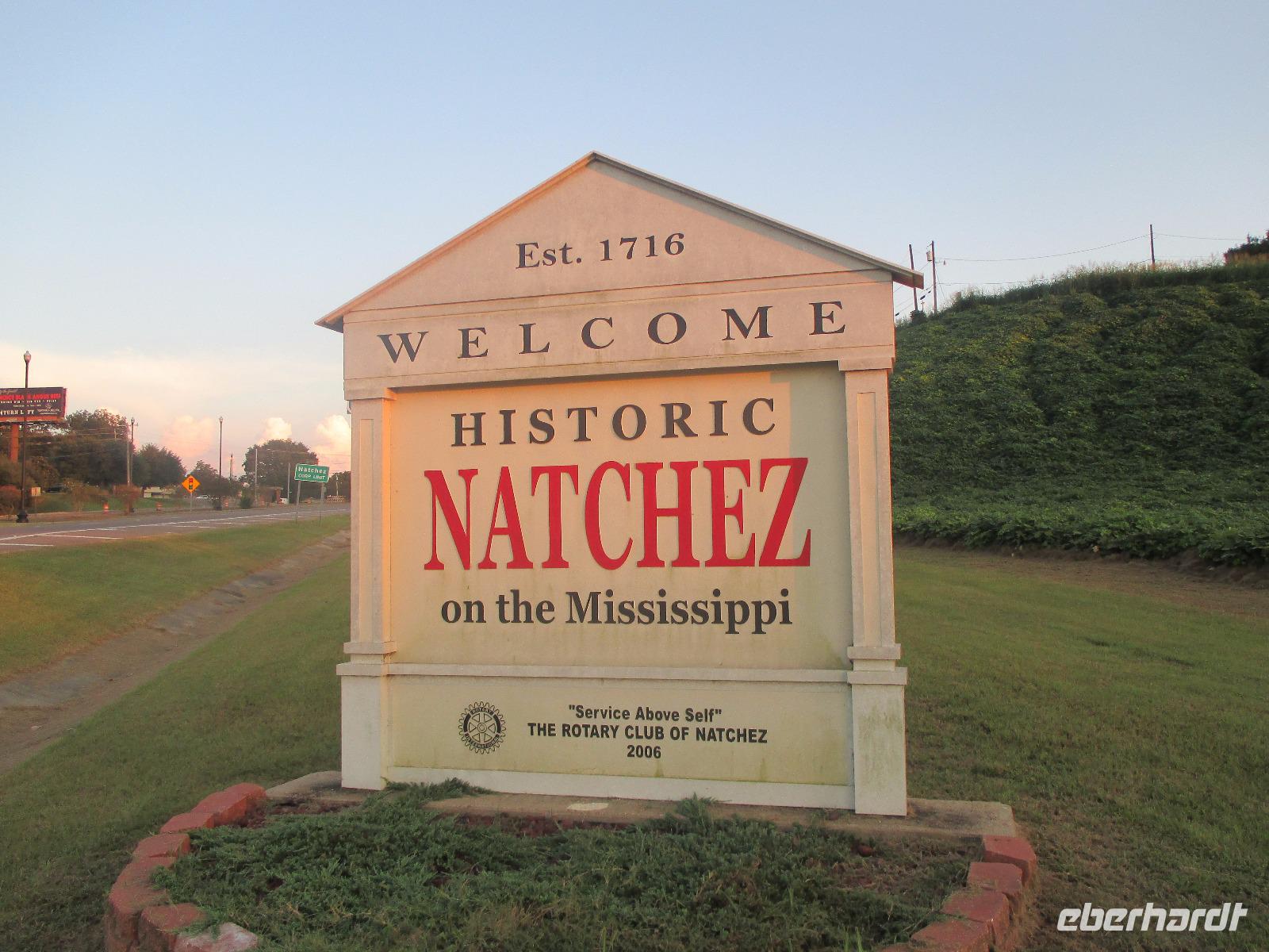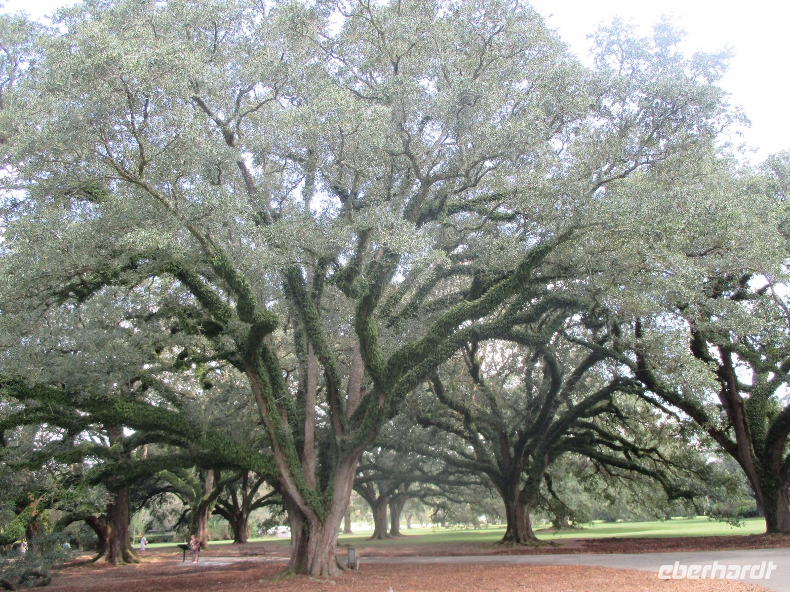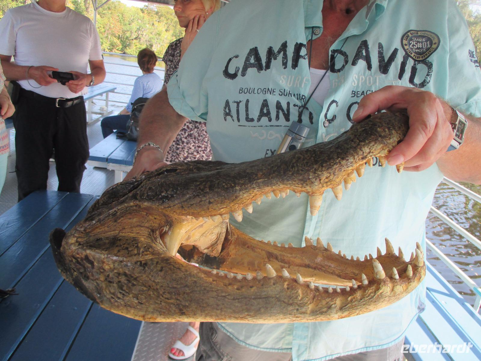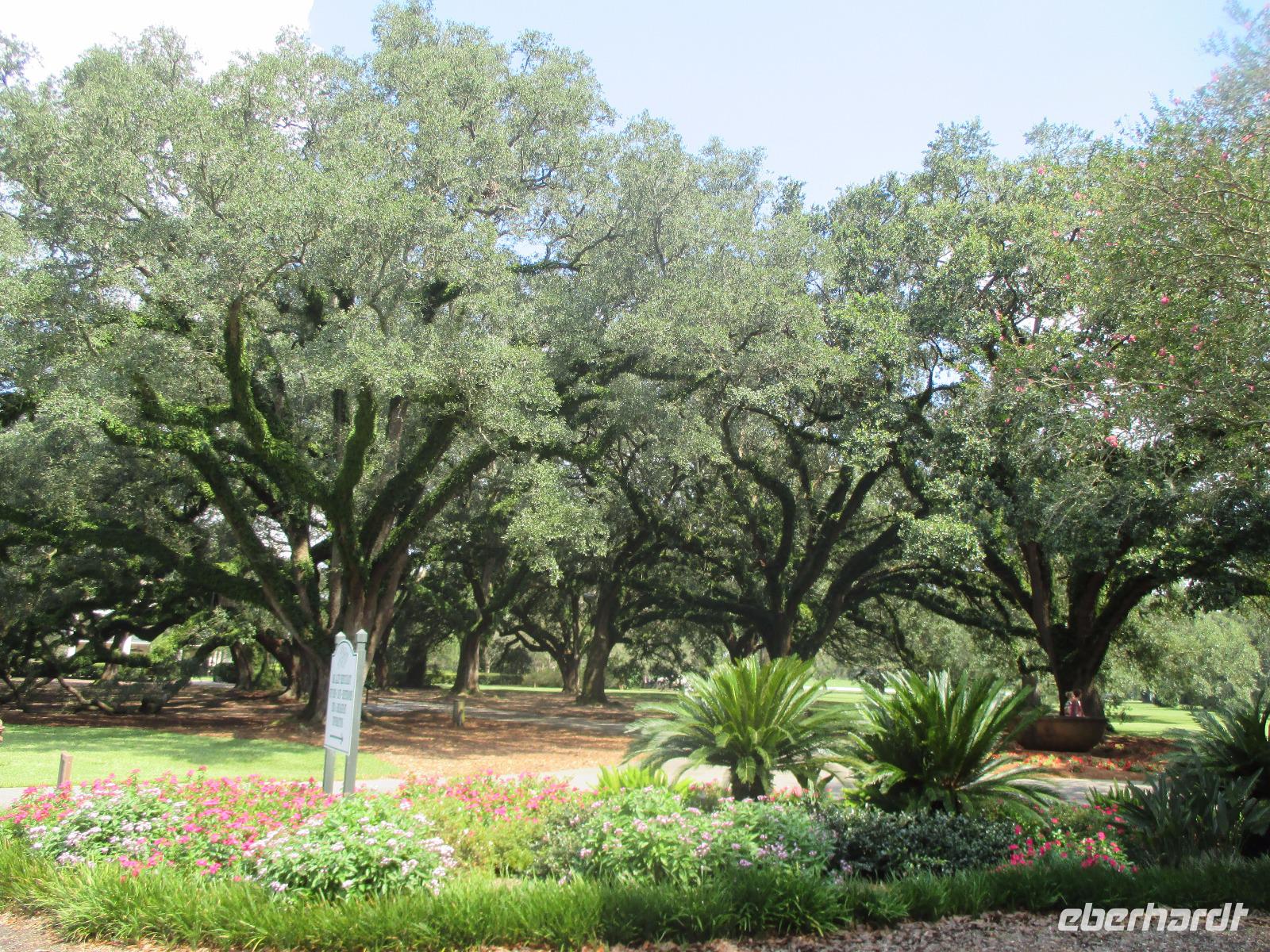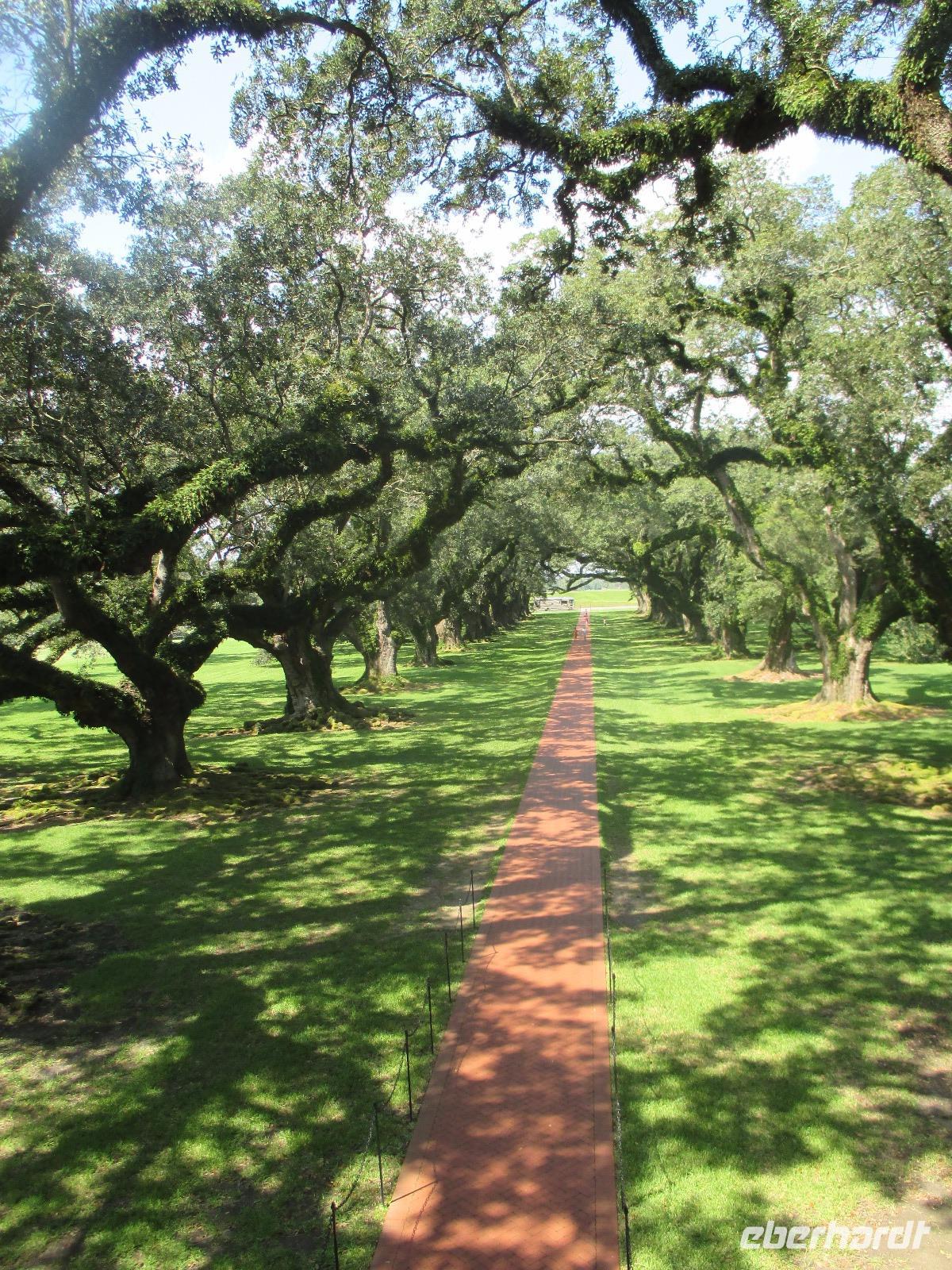 Ein weiteres Highlight erwartet uns heute. Aber leider heißt es erst einmal Abschied nehmen von New Orleans, eine Stadt, die uns sehr beeindruckt hat. Unser Weg führt uns durch die Abgeschiedenheit Louisanas zu Roland, der hier lebt und ein großes Stück Land besitzt. Er begrüßt uns ganz freudig und schon dürfen wir es uns auf seinem großen, zumindest für uns kleine Gruppe, gemütlich machen. Sicher lenkt er das Boot rückwärts aus dem Hafen hinaus und langsam gleiten wir entlang des Wasserkanals. Dabei sehen wir als allerstes einen Reiher. Aber auch die vielen Bäume mit dem spanischen Moos, das Schilf und all die endemischen Pflanzen lassen unsere Fotoapparate nicht ruhen. Nach einiger Zeit kommt der erste Alligator auf unser Boot zu. Roland versucht es mit Marshmallows anzufüttern aber wahrscheinlich hat es schon gefrühstückt, denn es bleibt ziemlich unbeeindruckt. Roland erzählt uns von seiner Kindheit hier im Sumpfgebiet und das er auch heute noch mit seinem Sohn und Enkelsohn Alligatoren jagen geht. Irgendwann bittet er uns, ein wenig leise zu sein, damit wir den Geräuschen der Natur lauschen können. Vorher allerdings kommt ein großer Alligator auf uns zu, der auch wieder mit Marshmallows angefüttert wird - und diesmal funktioniert auch der Trick den wir bekommen sehr gute Motive weil der Alligator ganz nah an unser Boot ran kommt. Wir bestaunen noch ein wenig die schöne Natur und lassen den Blick über das Wasser schweifen. Nach rund einer Stunde Fahrt legen wir wieder an und gehen an Bord des Busses. Leo fährt ein Stück zurück des Weges, den wir gekommen sind und schließlich biegen wir ab in Richtung Oak Alley Plantage, dem wunderschönen Herrschaftshaus, das von einer wunderschönen Eichenallee gesäumt ist. Ich persönlich dachte immer, das hier einst die Serie „Fackeln im Sturm" gedreht wurde aber das ist nicht richtig - dafür ist dieser Ort der Drehort für „Vom Winde verweht" gewesen - auch nicht schlecht, oder? Da wir bis zum Mittagessen, welches wir hier auf der Plantage einnehmen, Zeit haben, gehen wir mit Marguerite zu den ehemaligen Sklavenhäusern und sie erzählt und übersetzt uns das tragische Leben der Sklaven. Zum Mittagessen bedienen wir uns vom Buffet, welches wiederum mit Spezialitäten aus Louisana bestückt ist. Danach spazieren wir unter den Eichen entlang, wo wir bereits zu einer Privattour durch das Herrenhaus erwartet werden. In amerikanisches Mädchen mit einen sehr schönen Kleid führt uns durch den Salon, den Speisesaal und das Obergeschoss des Hauses und erzählt uns vom früheren Leben hier. Vier Dinge sind sogar noch Original. Vom Balkon aus, der im ersten Stock um das ganze Haus hin um führt sehen wir dann die bekannte Eichenallee - wunderhübsch. Nach der Führung laufen wir natürlich noch entlang der Allee, um wohl eines der bekanntesten Fotomotive hier auf der Plantage selbst zu schießen. Eine wirklich schöne Zeit hier geht zu Ende. Zurück am Bus erwartet uns eine längere Fahrt, die uns nach Natchez, unserem nächsten Übernachtungsort, führt. Nach einer kleinen Orientierungsfahrt checken wir um Hotel ein, das auf einem Hügel liegt und von wo aus wir einen tollen Blick auf den Mississippi haben. Am Abend treffen wir uns im Hotelrestaurant um noch ein paar Steaks und Biere zu bestellen. Unser ganz besonderer Drink-Tipp in diesem Haus: Wasser to go;-). An der Bar ist heute Abend Livemusik und wir sind ein wenig erstaunt, dass um zehn die Musiker schon ihre Instrumente abbauen und die Bar schließt aber so ist das hier leider bei den Amerikanern.