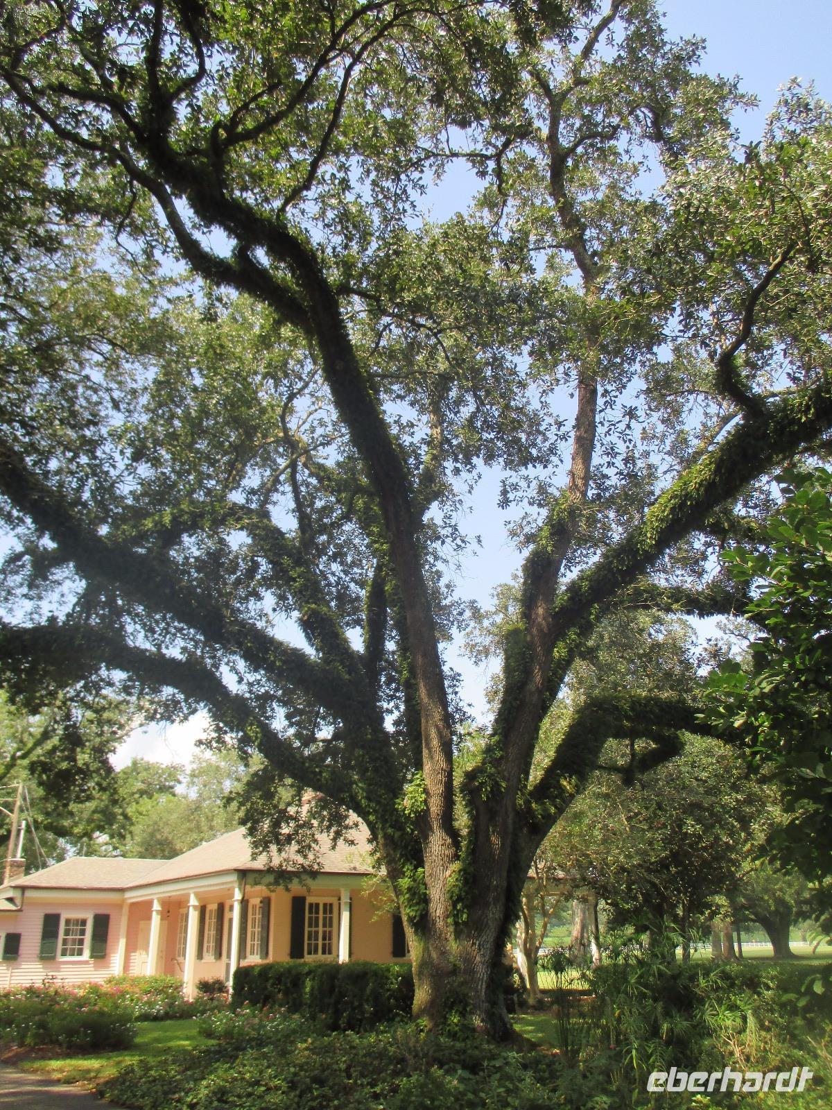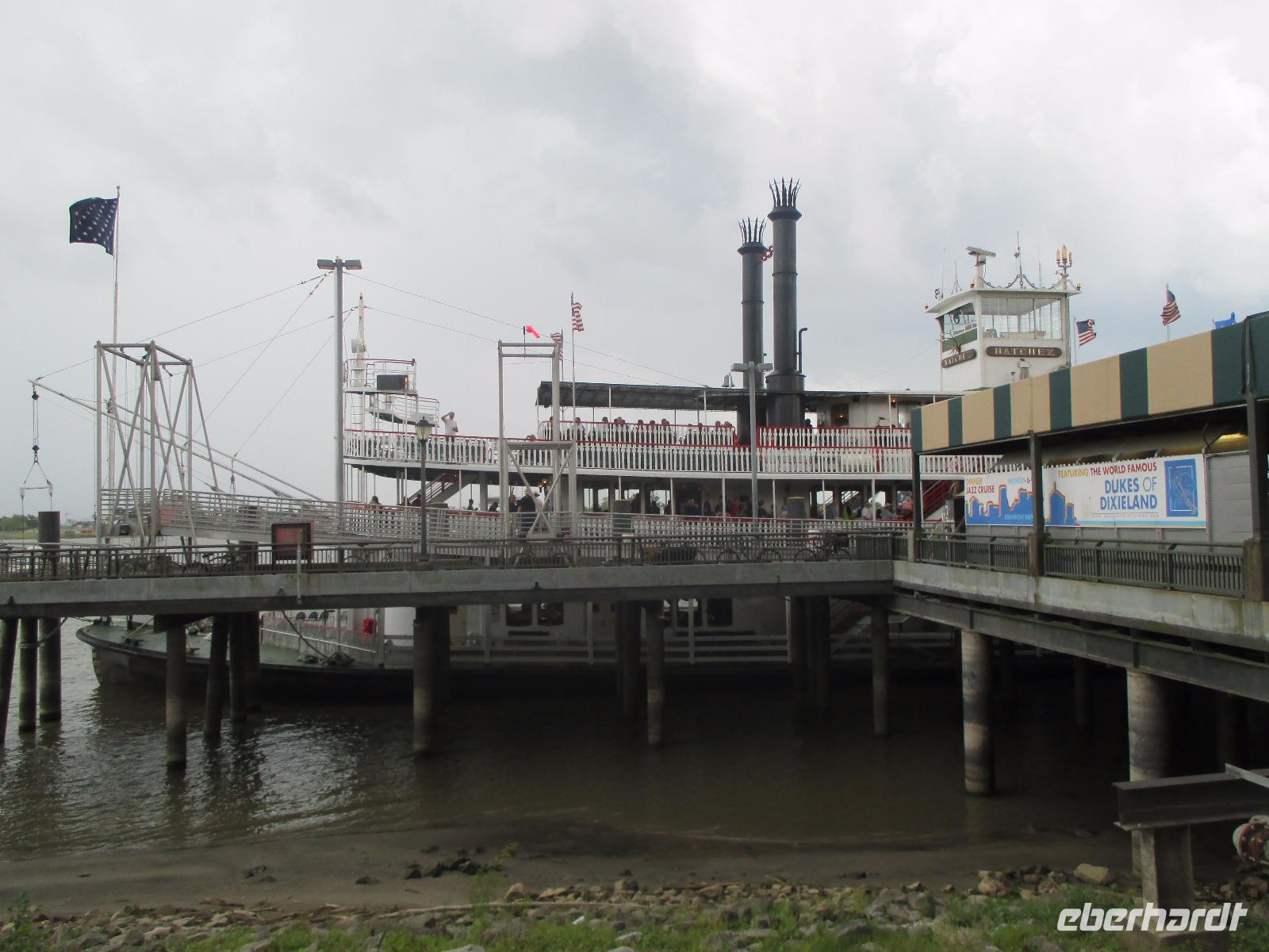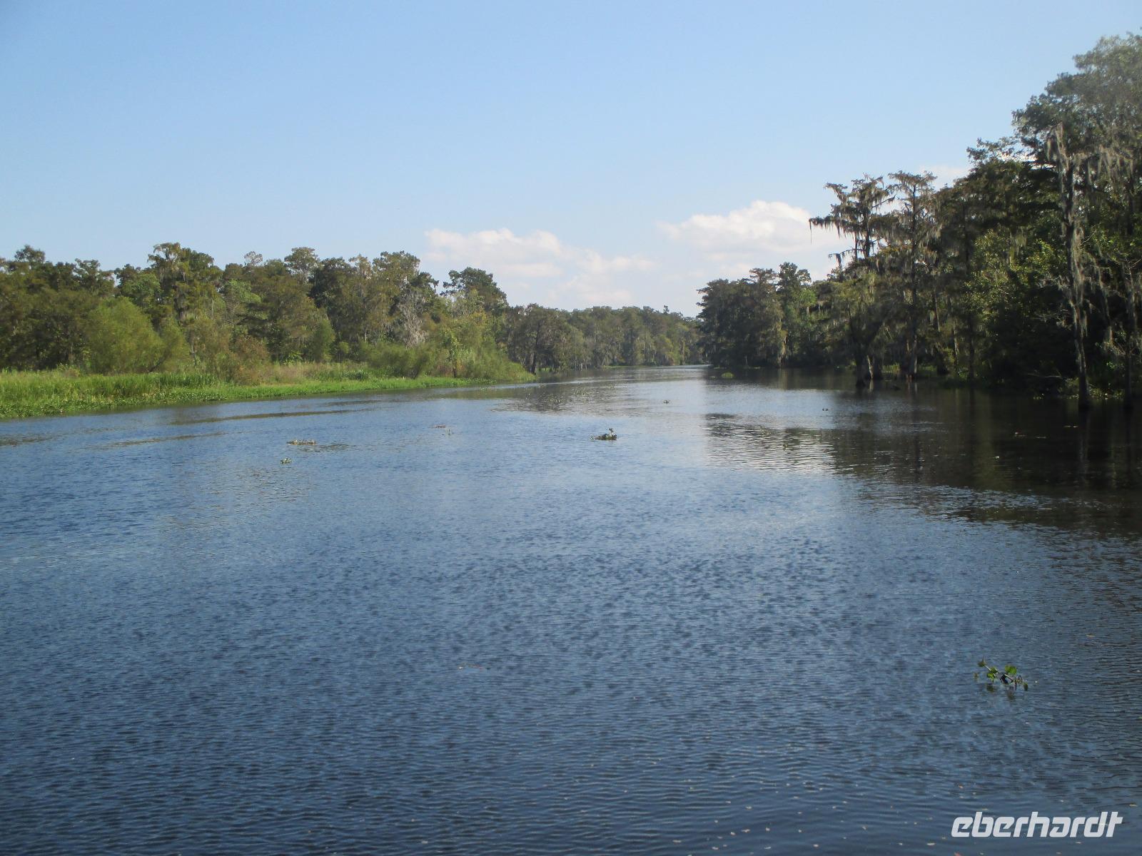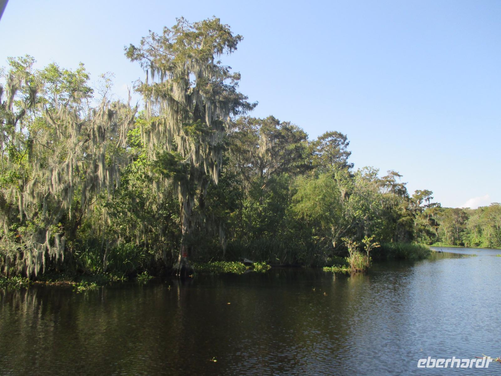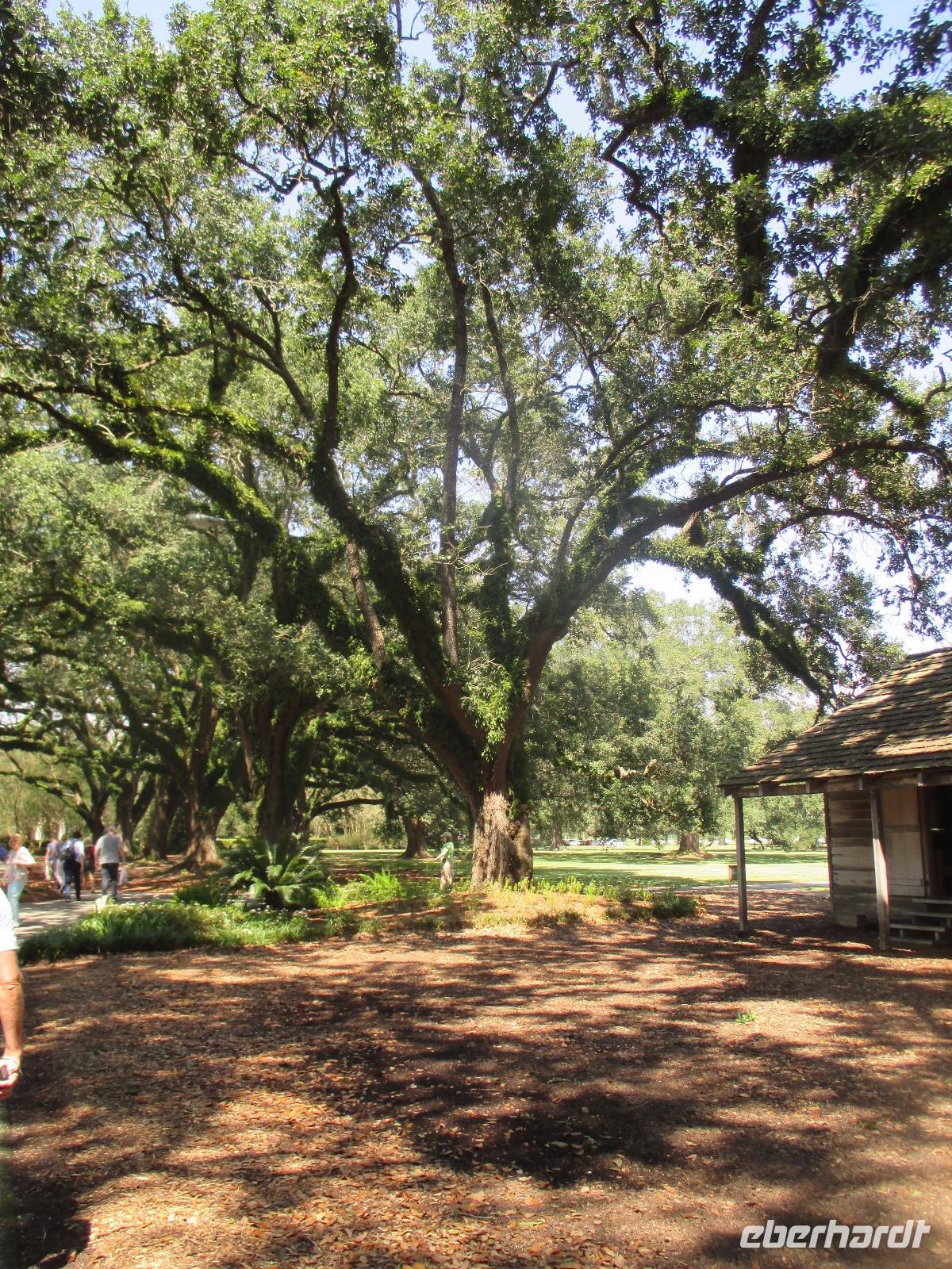 Ein weiteres Highlight erwartet uns heute. Aber leider heißt es erst einmal Abschied nehmen von New Orleans, eine Stadt, die uns sehr beeindruckt hat. Unser Weg führt uns durch die Abgeschiedenheit Louisanas zu Roland, der hier lebt und ein großes Stück Land besitzt. Er begrüßt uns ganz freudig und schon dürfen wir es uns auf seinem großen, zumindest für uns kleine Gruppe, gemütlich machen. Sicher lenkt er das Boot rückwärts aus dem Hafen hinaus und langsam gleiten wir entlang des Wasserkanals. Dabei sehen wir als allerstes einen Reiher. Aber auch die vielen Bäume mit dem spanischen Moos, das Schilf und all die endemischen Pflanzen lassen unsere Fotoapparate nicht ruhen. Nach einiger Zeit kommt der erste Alligator auf unser Boot zu. Roland versucht es mit Marshmallows anzufüttern aber wahrscheinlich hat es schon gefrühstückt, denn es bleibt ziemlich unbeeindruckt. Roland erzählt uns von seiner Kindheit hier im Sumpfgebiet und das er auch heute noch mit seinem Sohn und Enkelsohn Alligatoren jagen geht. Irgendwann bittet er uns, ein wenig leise zu sein, damit wir den Geräuschen der Natur lauschen können. Vorher allerdings kommt ein großer Alligator auf uns zu, der auch wieder mit Marshmallows angefüttert wird - und diesmal funktioniert auch der Trick den wir bekommen sehr gute Motive weil der Alligator ganz nah an unser Boot ran kommt. Wir bestaunen noch ein wenig die schöne Natur und lassen den Blick über das Wasser schweifen. Nach rund einer Stunde Fahrt legen wir wieder an und gehen an Bord des Busses. Leo fährt ein Stück zurück des Weges, den wir gekommen sind und schließlich biegen wir ab in Richtung Oak Alley Plantage, dem wunderschönen Herrschaftshaus, das von einer wunderschönen Eichenallee gesäumt ist. Ich persönlich dachte immer, das hier einst die Serie „Fackeln im Sturm" gedreht wurde aber das ist nicht richtig - dafür ist dieser Ort der Drehort für „Vom Winde verweht" gewesen - auch nicht schlecht, oder? Da wir bis zum Mittagessen, welches wir hier auf der Plantage einnehmen, Zeit haben, gehen wir mit Marguerite zu den ehemaligen Sklavenhäusern und sie erzählt und übersetzt uns das tragische Leben der Sklaven. Zum Mittagessen bedienen wir uns vom Buffet, welches wiederum mit Spezialitäten aus Louisana bestückt ist. Danach spazieren wir unter den Eichen entlang, wo wir bereits zu einer Privattour durch das Herrenhaus erwartet werden. In amerikanisches Mädchen mit einen sehr schönen Kleid führt uns durch den Salon, den Speisesaal und das Obergeschoss des Hauses und erzählt uns vom früheren Leben hier. Vier Dinge sind sogar noch Original. Vom Balkon aus, der im ersten Stock um das ganze Haus hin um führt sehen wir dann die bekannte Eichenallee - wunderhübsch. Nach der Führung laufen wir natürlich noch entlang der Allee, um wohl eines der bekanntesten Fotomotive hier auf der Plantage selbst zu schießen. Eine wirklich schöne Zeit hier geht zu Ende. Zurück am Bus erwartet uns eine längere Fahrt, die uns nach Natchez, unserem nächsten Übernachtungsort, führt. Nach einer kleinen Orientierungsfahrt checken wir um Hotel ein, das auf einem Hügel liegt und von wo aus wir einen tollen Blick auf den Mississippi haben. Am Abend treffen wir uns im Hotelrestaurant um noch ein paar Steaks und Biere zu bestellen. Unser ganz besonderer Drink-Tipp in diesem Haus: Wasser to go;-). An der Bar ist heute Abend Livemusik und wir sind ein wenig erstaunt, dass um zehn die Musiker schon ihre Instrumente abbauen und die Bar schließt aber so ist das hier leider bei den Amerikanern.
