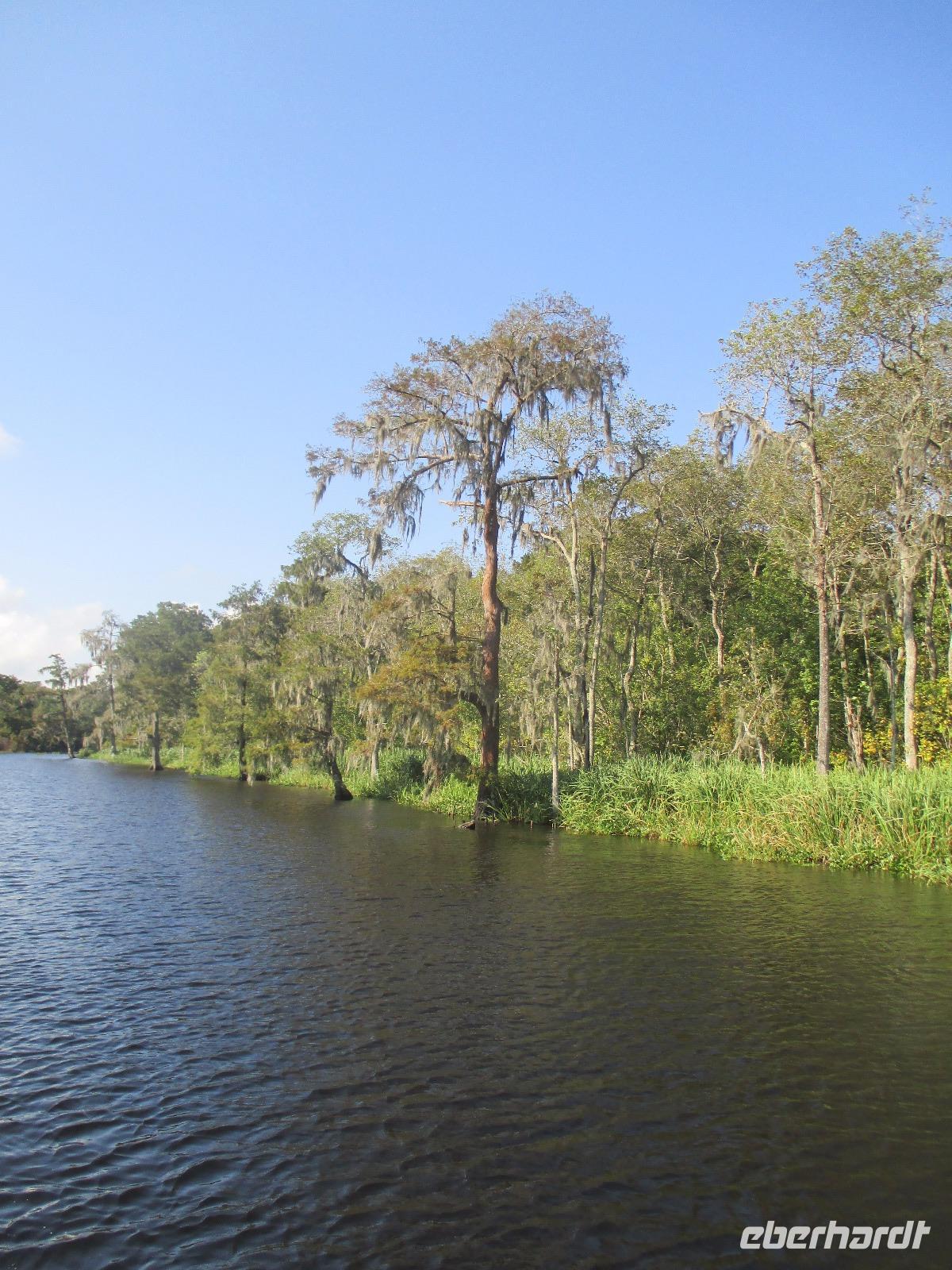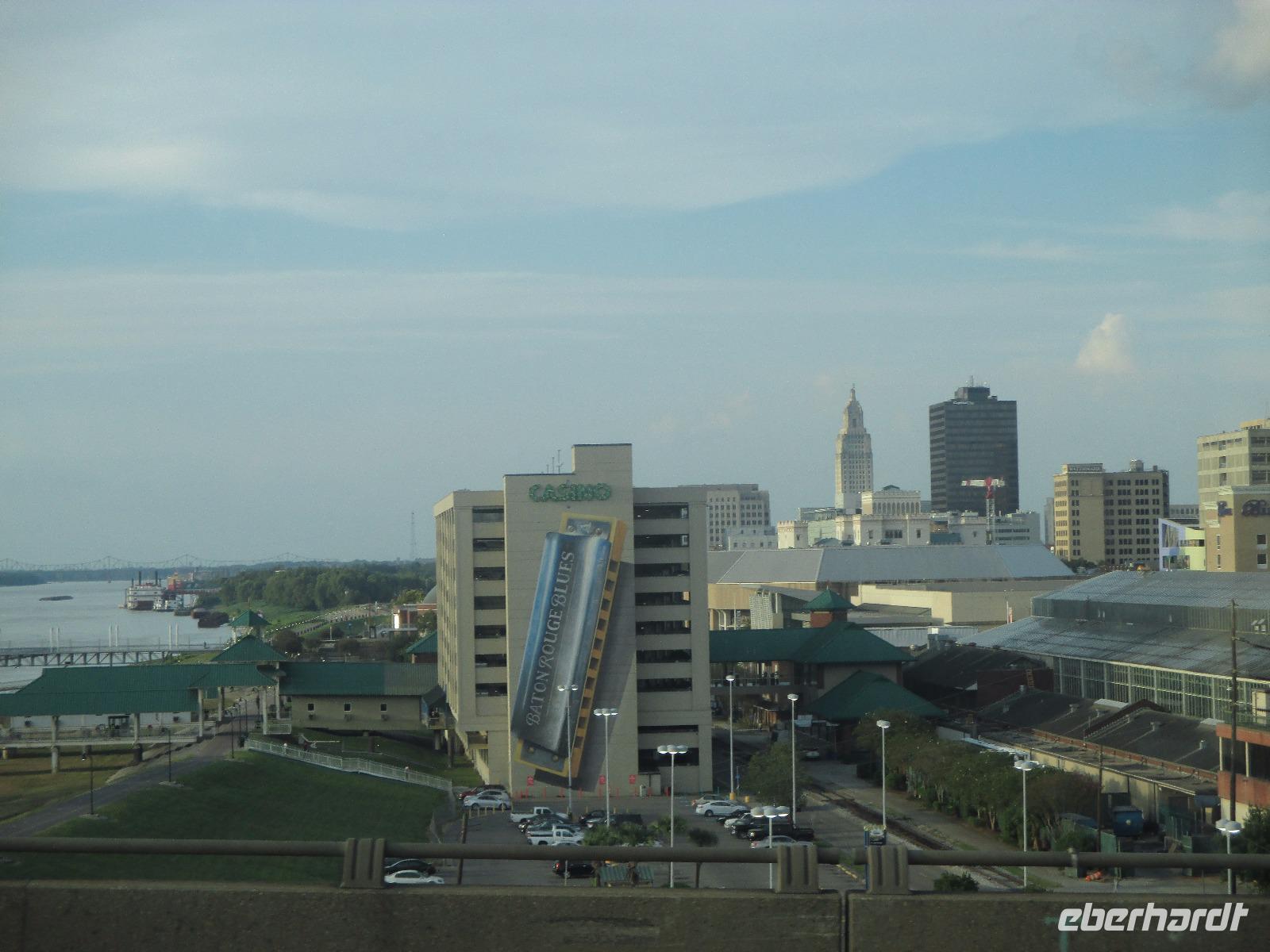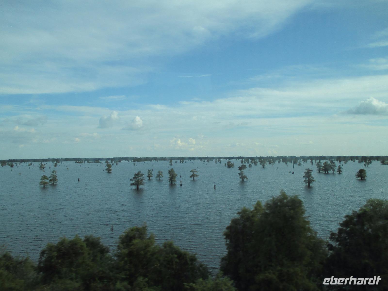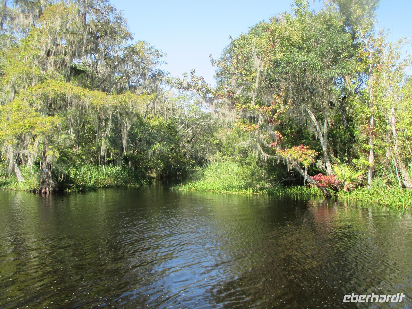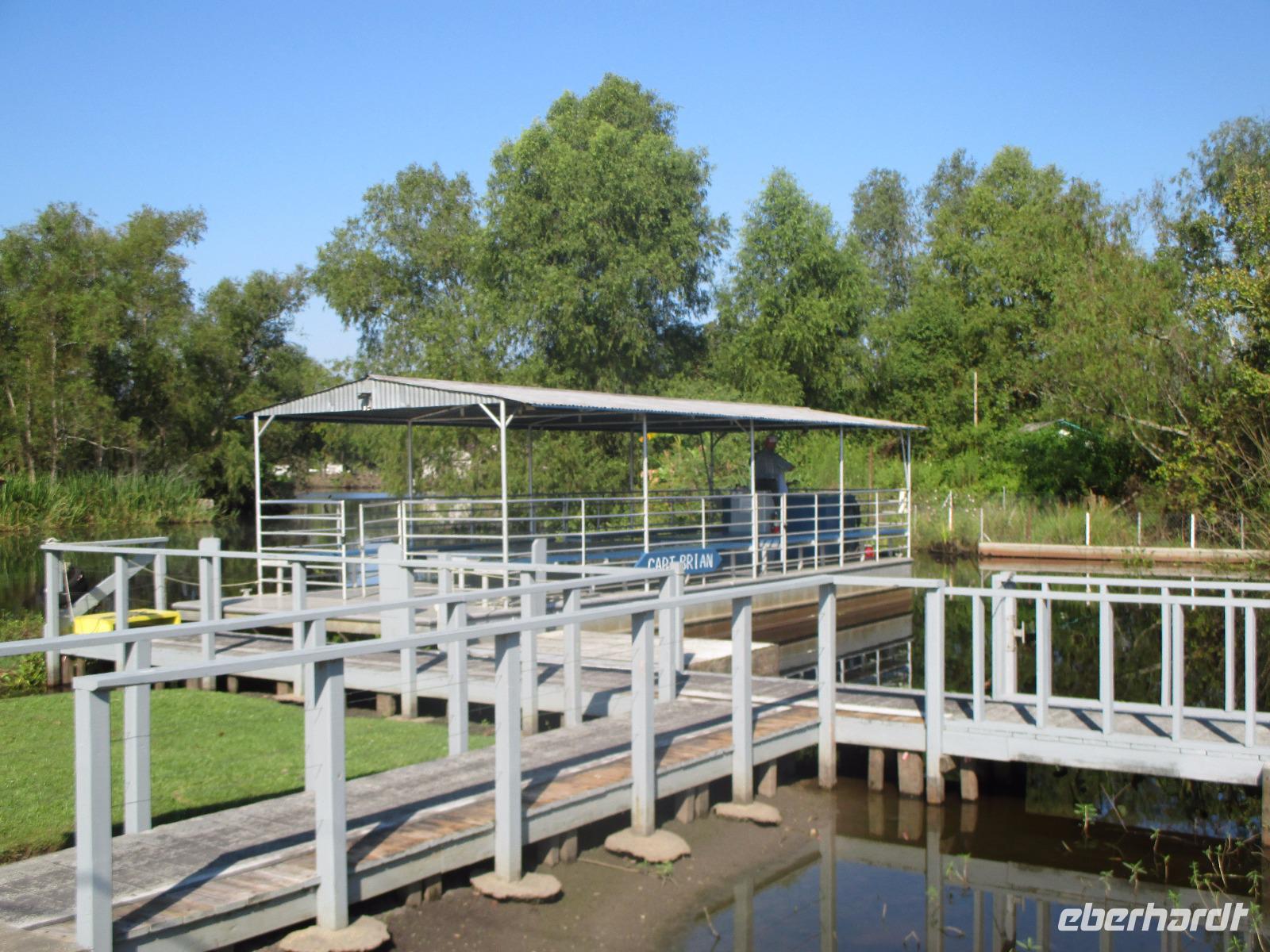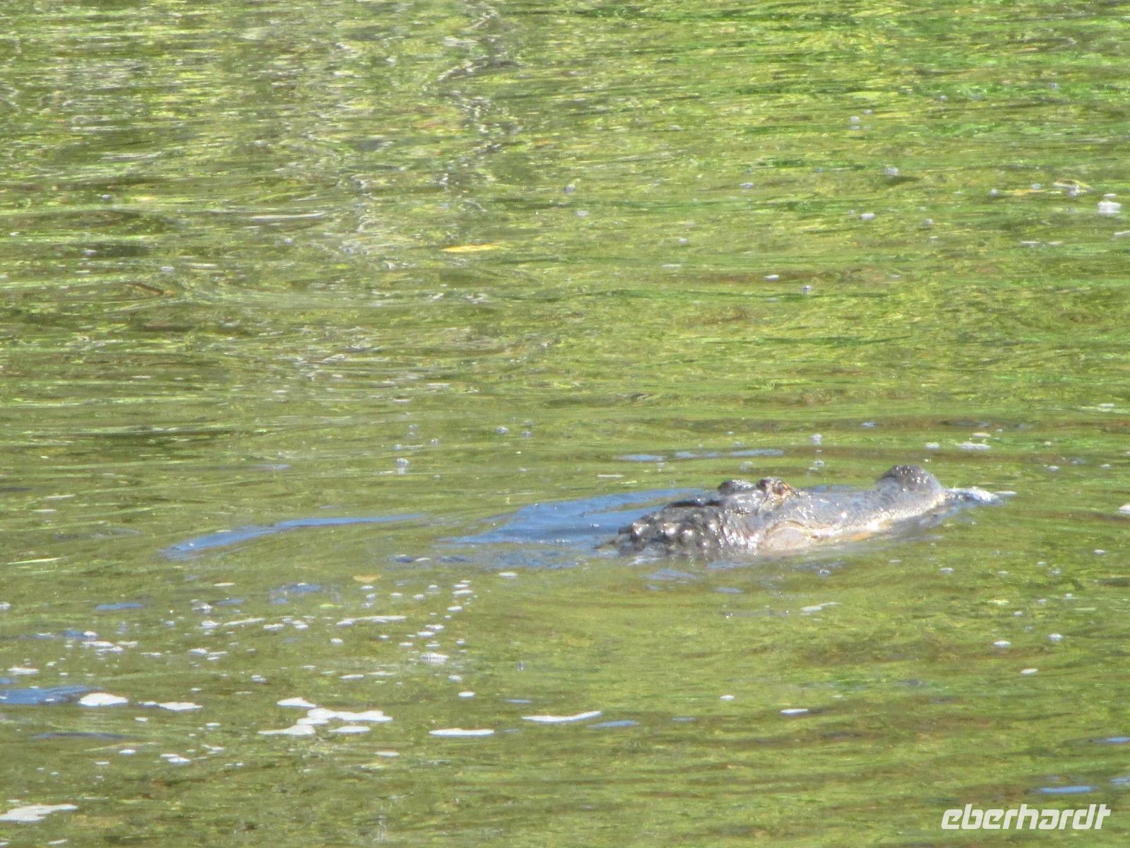 Ein weiteres Highlight erwartet uns heute. Aber leider heißt es erst einmal Abschied nehmen von New Orleans, eine Stadt, die uns sehr beeindruckt hat. Unser Weg führt uns durch die Abgeschiedenheit Louisanas zu Roland, der hier lebt und ein großes Stück Land besitzt. Er begrüßt uns ganz freudig und schon dürfen wir es uns auf seinem großen, zumindest für uns kleine Gruppe, gemütlich machen. Sicher lenkt er das Boot rückwärts aus dem Hafen hinaus und langsam gleiten wir entlang des Wasserkanals. Dabei sehen wir als allerstes einen Reiher. Aber auch die vielen Bäume mit dem spanischen Moos, das Schilf und all die endemischen Pflanzen lassen unsere Fotoapparate nicht ruhen. Nach einiger Zeit kommt der erste Alligator auf unser Boot zu. Roland versucht es mit Marshmallows anzufüttern aber wahrscheinlich hat es schon gefrühstückt, denn es bleibt ziemlich unbeeindruckt. Roland erzählt uns von seiner Kindheit hier im Sumpfgebiet und das er auch heute noch mit seinem Sohn und Enkelsohn Alligatoren jagen geht. Irgendwann bittet er uns, ein wenig leise zu sein, damit wir den Geräuschen der Natur lauschen können. Vorher allerdings kommt ein großer Alligator auf uns zu, der auch wieder mit Marshmallows angefüttert wird - und diesmal funktioniert auch der Trick den wir bekommen sehr gute Motive weil der Alligator ganz nah an unser Boot ran kommt. Wir bestaunen noch ein wenig die schöne Natur und lassen den Blick über das Wasser schweifen. Nach rund einer Stunde Fahrt legen wir wieder an und gehen an Bord des Busses. Leo fährt ein Stück zurück des Weges, den wir gekommen sind und schließlich biegen wir ab in Richtung Oak Alley Plantage, dem wunderschönen Herrschaftshaus, das von einer wunderschönen Eichenallee gesäumt ist. Ich persönlich dachte immer, das hier einst die Serie „Fackeln im Sturm" gedreht wurde aber das ist nicht richtig - dafür ist dieser Ort der Drehort für „Vom Winde verweht" gewesen - auch nicht schlecht, oder? Da wir bis zum Mittagessen, welches wir hier auf der Plantage einnehmen, Zeit haben, gehen wir mit Marguerite zu den ehemaligen Sklavenhäusern und sie erzählt und übersetzt uns das tragische Leben der Sklaven. Zum Mittagessen bedienen wir uns vom Buffet, welches wiederum mit Spezialitäten aus Louisana bestückt ist. Danach spazieren wir unter den Eichen entlang, wo wir bereits zu einer Privattour durch das Herrenhaus erwartet werden. In amerikanisches Mädchen mit einen sehr schönen Kleid führt uns durch den Salon, den Speisesaal und das Obergeschoss des Hauses und erzählt uns vom früheren Leben hier. Vier Dinge sind sogar noch Original. Vom Balkon aus, der im ersten Stock um das ganze Haus hin um führt sehen wir dann die bekannte Eichenallee - wunderhübsch. Nach der Führung laufen wir natürlich noch entlang der Allee, um wohl eines der bekanntesten Fotomotive hier auf der Plantage selbst zu schießen. Eine wirklich schöne Zeit hier geht zu Ende. Zurück am Bus erwartet uns eine längere Fahrt, die uns nach Natchez, unserem nächsten Übernachtungsort, führt. Nach einer kleinen Orientierungsfahrt checken wir um Hotel ein, das auf einem Hügel liegt und von wo aus wir einen tollen Blick auf den Mississippi haben. Am Abend treffen wir uns im Hotelrestaurant um noch ein paar Steaks und Biere zu bestellen. Unser ganz besonderer Drink-Tipp in diesem Haus: Wasser to go;-). An der Bar ist heute Abend Livemusik und wir sind ein wenig erstaunt, dass um zehn die Musiker schon ihre Instrumente abbauen und die Bar schließt aber so ist das hier leider bei den Amerikanern.
