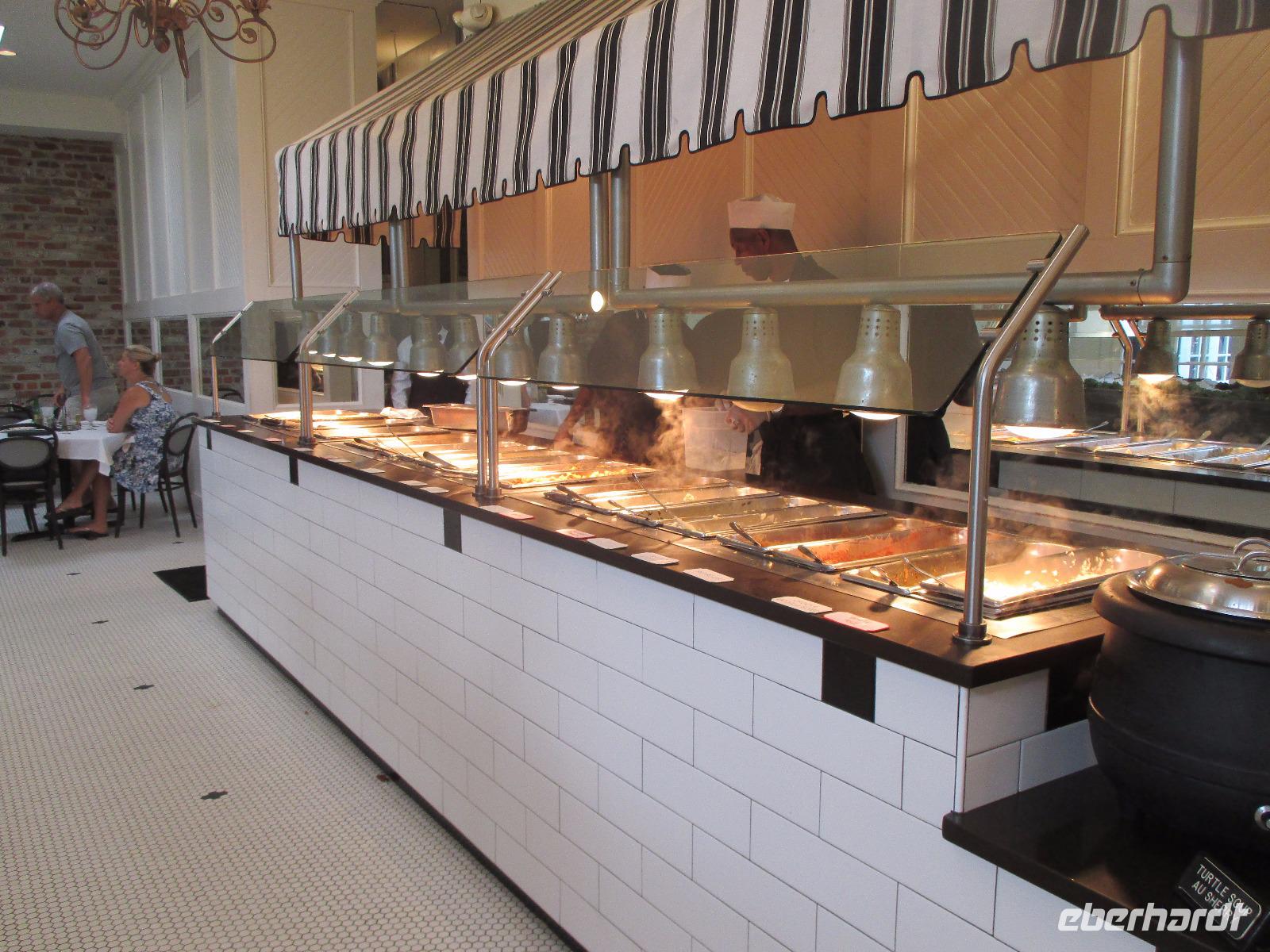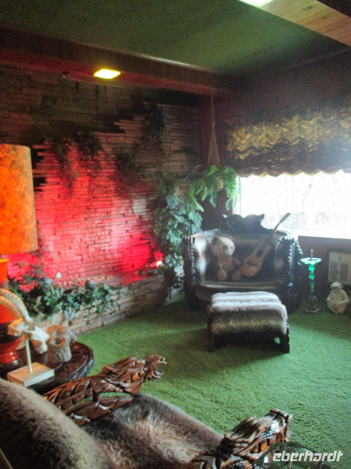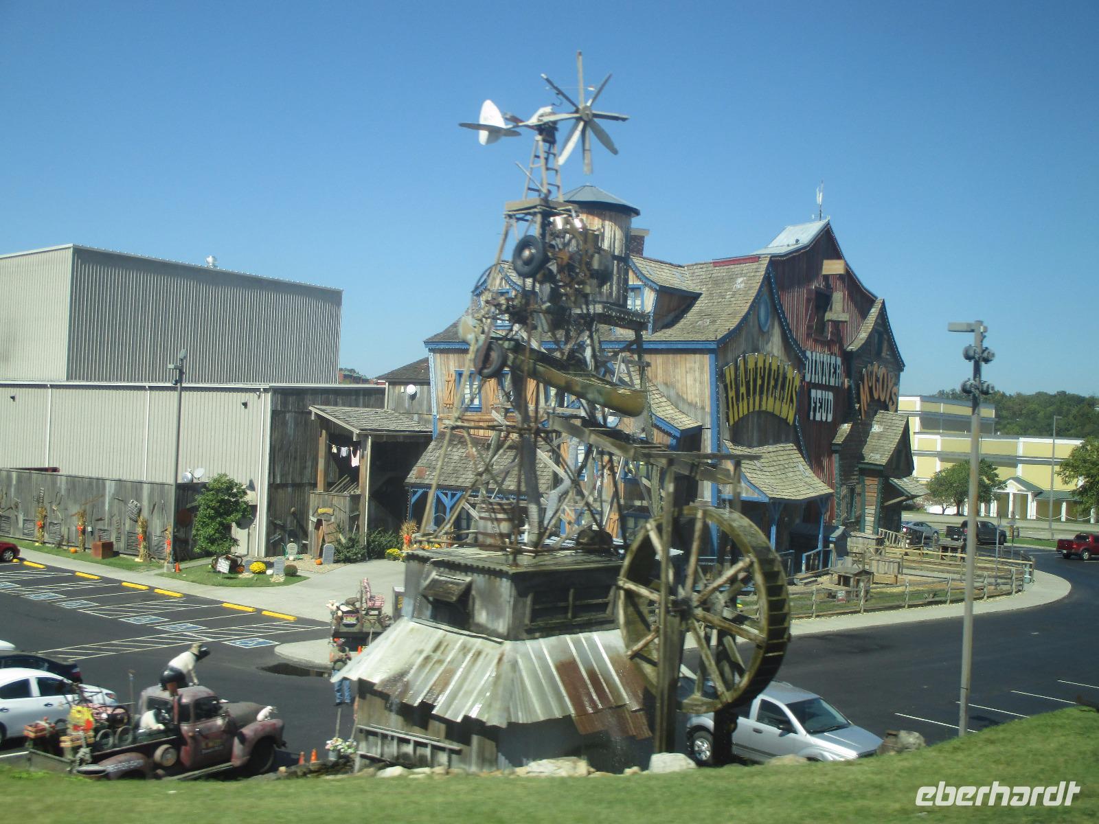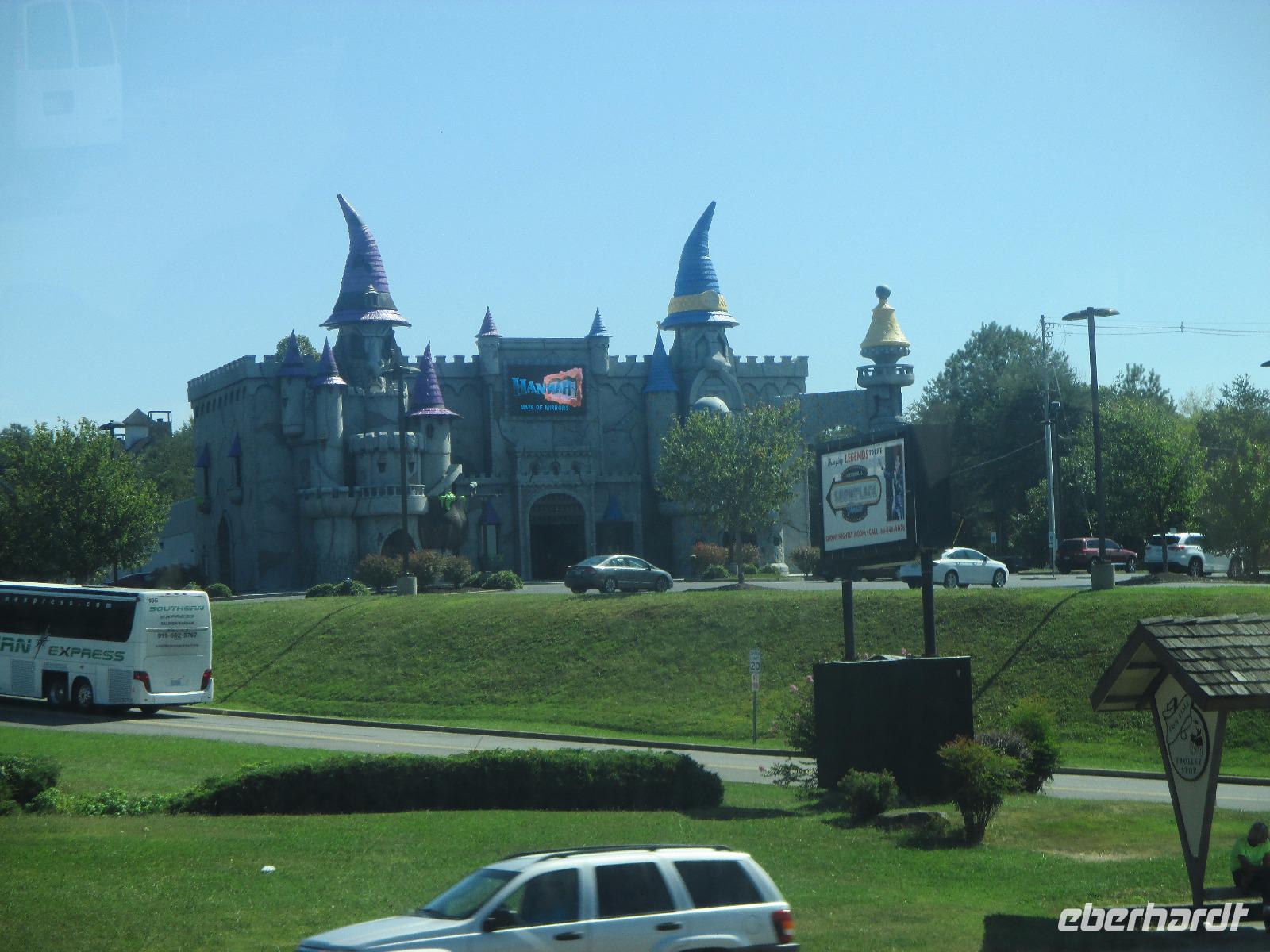 Auch das Frühstück im „„Frothy Monkey" ist sensationell und das Beste während unseres Aufenthaltes in den Südstaaten der USA. Danach besetzen wir wieder unsere Sitzplätze im Bus, der sich in Richtung Great Smoky Mountains in Bewegung setzt. Wir stoppen noch kurz an einem Supermarkt, indem wir für uns Mittagspicknick einkaufen. Leo bringt uns in Richtung Chereokee und wir passieren einen Ort nahe Dollywood (ein Vergnügungspark von Country Star Dolly Parton), der vor Kitsch nur so strotzt: Affen, Achterbahn, Weihnachtshäuser, eine nachgebaute Titanic und ein umgekipptes Haus sind nur einige Beispiele von Kuriositäten, die hier aufwarten. Endlich erreichen wir den Naturpark Great Smoky Mountains. Wir fahren hinauf und hinter jeder Biegung sind neue Naturbilder, die sich in unser Hirn abspeichern. Nach ein einem Fotostopp halten wir an einem Picknickarenal, wo wir unsere Mittagspause verbringen. Total romantisch an einem Fluss - hier kann man und frau es aushalten. Gut gestärkt fahren wir weiter und halten immer mal für Fotostopps. Schließlich halten wir am Informationszentrum der Great Smoky Mountains. Einige Reisegäste spazieren mit mir ein kleines Stück, andere gehen mit Marguerite in das Informationszentrum hinein. Die ganzen Eindrücke, die wir heute über den Tag erlebt haben, kann man eigentlich gar nicht in Worten wiedergeben. Über Chereokee, einem alten Indianerort, erreichen wir am Abend schließlich unseren Übernachtungsort Helen. Und welch Überraschung: Helen entpuppt sich als Nachbau einer bayrischen Stadt - überall Balkons und typisch bayrische Bauweise. Damit erklärt sich auch, warum wir heute Abend in einem deutschen Restaurant speisen - es gibt gar nichts anderes;-). Aber auch hier wartet eine Überraschung auf: es wird auf getafelt, im wahrsten Sinne des Wortes mit Spätzle, Rot- und Sauerkraut, Brat- und Weißwurst, Schnitzel, Rouladen, Kassler und Rinderbraten. Meine Reisegäste stürzen sich mit Begeisterung darauf. Auch die Speisekarte, die wir vorab betrachten, wartet mit zahlreichen deutschen Gerichten auf. Für die Verdauung werden noch einige Kräuter bestellt und voller Begeisterung spazieren wir anschließend zum Hotel zurück.