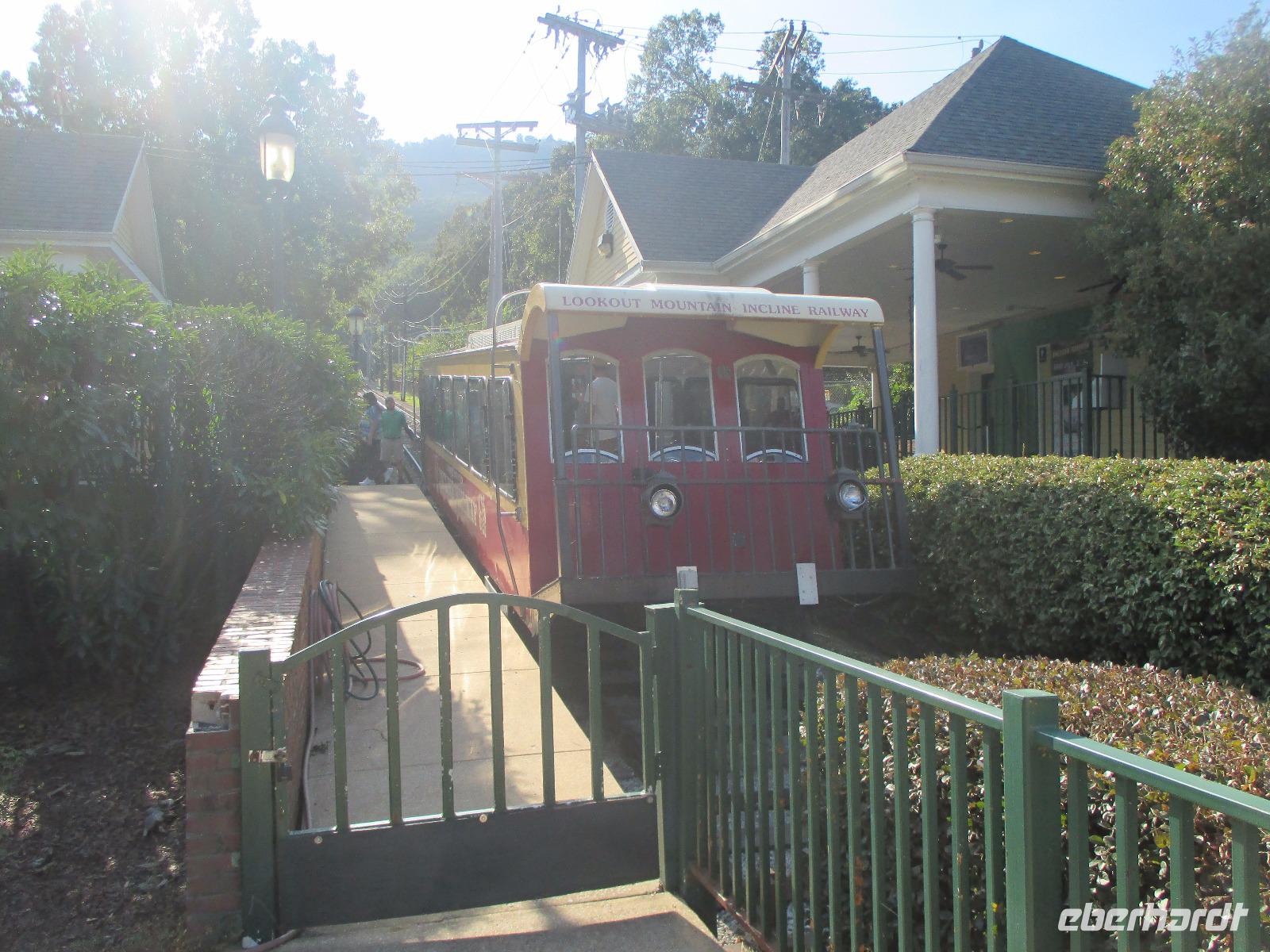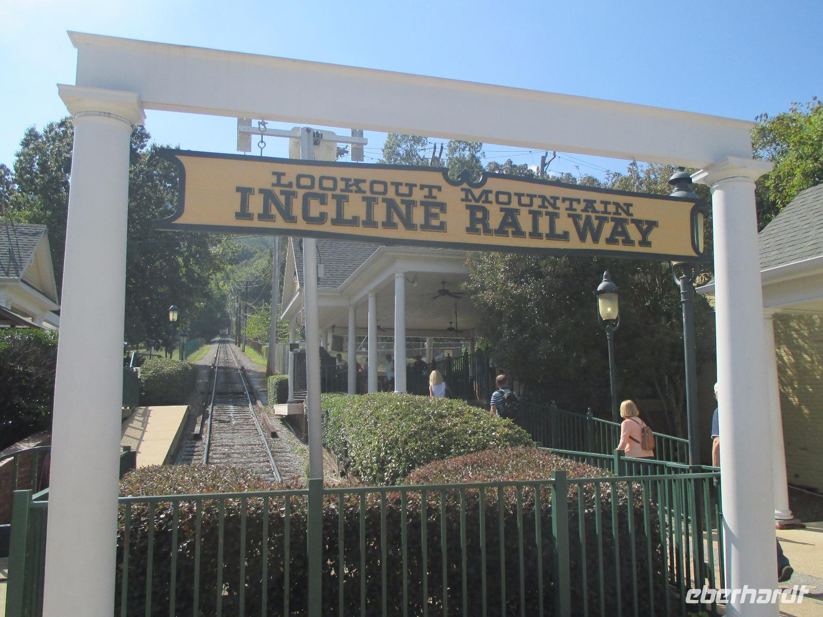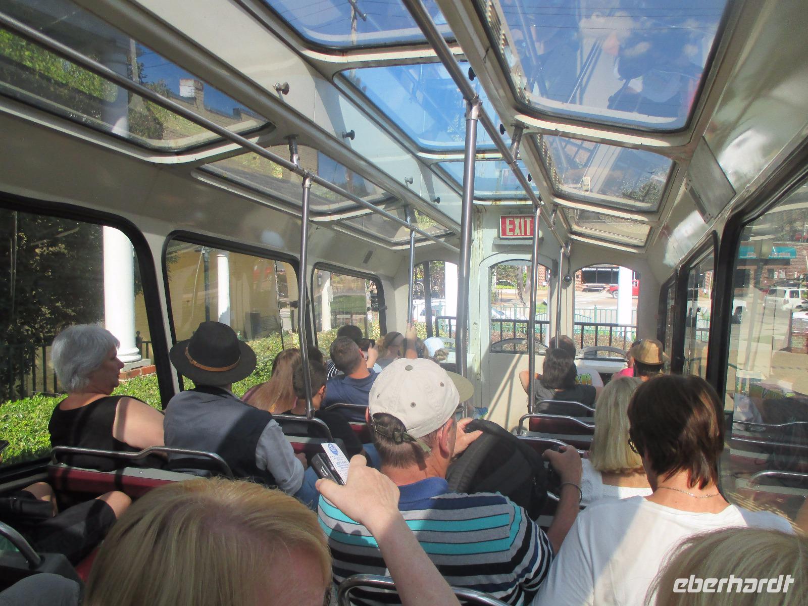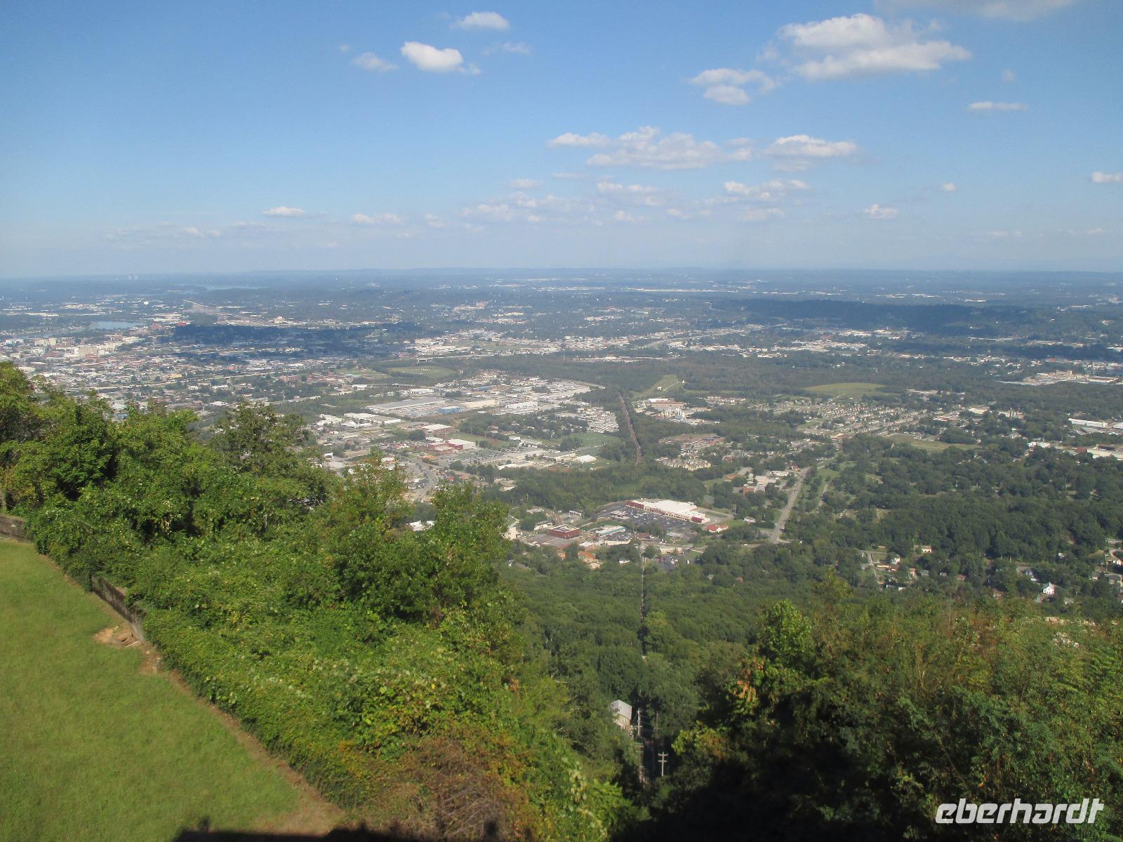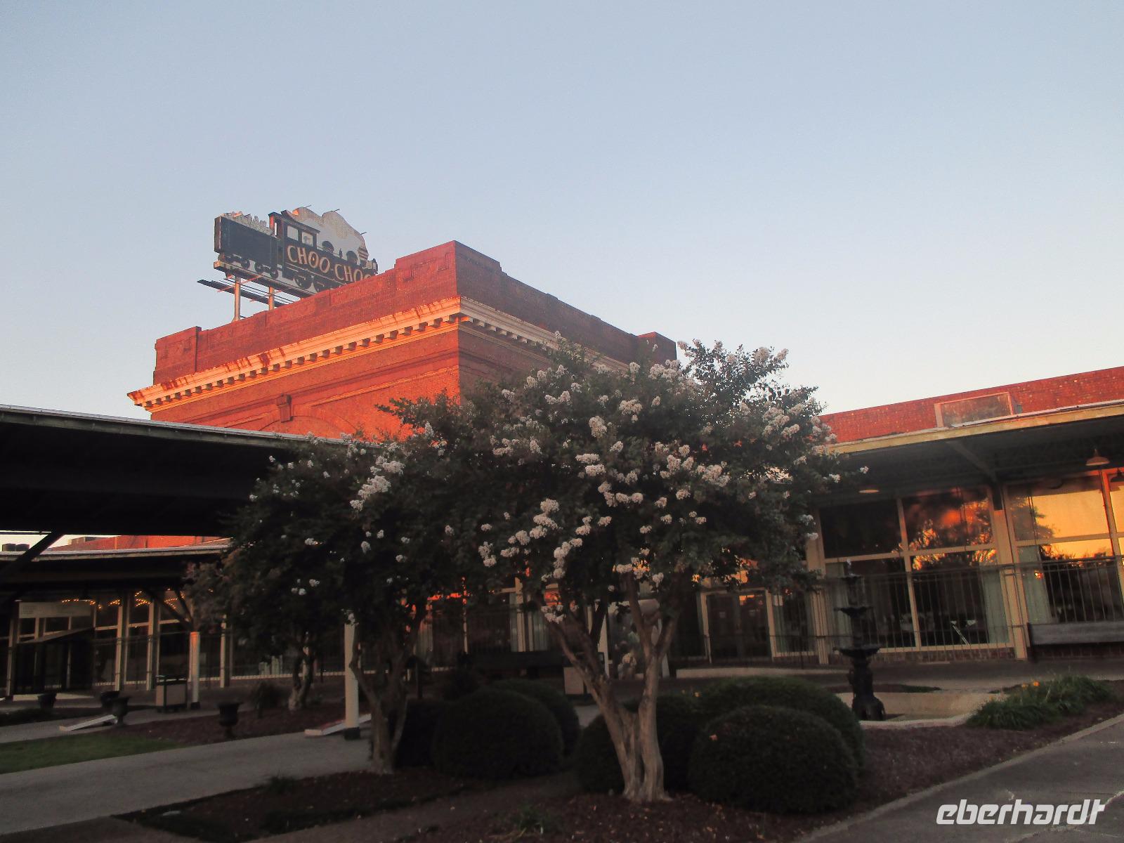 Leider ist heute der Luxus der letzten Tage vorbei und unser heutiger Startpunkt ist wieder 08:00 Uhr. Unser Weg führt uns in Richtung Lynchburg. Auf unserem Weg dahin sehen wir schon die ersten Ausläufer der Appalachen. Wir fahren nicht ganz zwei Stunden als wir unser Ziel, die Jack-Daniels-Destilliere. Da wir noch ein wenig Zeit bis zur Führung haben, schauen wir uns in der Eingangshalle um. Kurz nach 10 Uhr beginnt unsere Führung. Marguerite übersetzt für uns. Zunächst fahren wir mit dem Bus aus dem Gelände hinaus, ein Stück durch Lynchburg und steigen an einer andere Stelle des Firmengeländes wieder aus. Unser Guide erklärt uns, wie hier die Holzkohle hergestellt wird, sie zeigt uns die Wasserhöhle, aus der Herr Daniels das Wasser für die Whiskyproduktion und anschließend steht uns seine Statue für ein kleines Fotoshooting zur Verfügung. Nachdem uns der Guide noch sein Büro und den verhängnisvollen Tresor gezeigt hat, steigen wir wieder in den Bus ein. Nächster Stopp ist die Destillations-Halle, in der wir uns nur kurz aufhalten. Ein kleiner Film zeigt uns die Herstellung der Whisky-Fässer. Danach zeigt sie uns, wie die Flaschen etikettiert und verpackt werden. Zum Abschluss der Führung kommen wir noch in die große Lagerhalle. Die Führung endet im Werksverkauf, wo die Möglichkeit besteht, Whiskyflaschen käuflich zu erwerben. Wir machen noch ein kleines Fotoshooting auf einem überdimensionalen Schaukelstuhl und verbringen unsere Mittagspause in der Stadt Lynchburg. Diese ist aufgebaut wie eine kleine Westernstadt. Hier kann man zahlreiche Souvenirs, sei es verbunden mit der Jack-Daniels-Destillerie oder den Südstaaten, kaufen oder in den kleinen Cafés etwas essen oder trinken. Unser weiterer Weg führt uns nach Chattanooga. Kurz vor der Stadt müssen wir unsere Uhr um eine Stunde nach vorn stellen. Leo biegt auf den Parkplatz des Lookout Mountains ein und wir begeben uns zur Zugstation. Wir fahren mit der steilsten Zug, der Incline-Railway ca. 1,6 Kilometer hinauf. Steil deswegen weil die Steigung teilweise bis zu ca. 73% beträgt. Ziemlich steil und uns wird auch etwas mulmig, wenn wir nach hoch bzw. unten schauen. Oben angekommen, genießen wir einen Ausblick auf die weitläufige Landschaft und auf die Stadt Chattanooga. Natürlich nehmen wir den gleichen Weg hinab wie hinauf, also haben wir noch einmal ein tolles Zugerlebnis. Bevor wir in die Stadt zu unserem Hotel fahren, besuchen wir die mysteriösen Ruby-Wasserfälle. Mit einem Lift fahren wir in die Grotte hinab und spazieren rund 700 Fuß durch die Grotten und bestaunen dabei die angestrahlten Formationen. Einige erinnern an einen Elefantenfuß, Kartoffeln mit Steak, Kartoffelchips und auch Bacon. Wir kommen entlang der Hall of Dreams. Am Ende erreichen wir die legendären Ruby-Falls, ein Wasserfall in der Höhle mit einer enormen Höhe, auch der höchste Wasserfall in den Vereinigten Staaten von Amerika. Die Musik ertönt und der Wasserfall wird in bunten Farben angestrahlt. Ein schöner und seltener Anblick - da hat sich der Spaziergang untertage doch wirklich gelohnt. Zurück übertage wartet Leo bereits auf uns und bringt uns in die Stadt Chatanooga, in der wir heute in einem besonderen Hotel übernachten: in einem umgebauten Bahnhof. Nachdem wir unsere Zimmer im alten Bahnhofsgelände bezogen haben, nutzen wir noch die Zeit, um ein paar Fotos im Schwimmbad und von den ausgestellten Zugwagons zu schießen. Selbst in den Wagons sind Hotelzimmer untergebracht. Das alte Bahnhofshauptgebäude ist umgebaut und beherbergt neben der Rezeption auch das Restaurant „Frothy Monkey". Das erste Mal auf der gesamten Reise dürfen wir draußen sitzen. Natürlich nehmen wir das Angebot an, entziehen uns der typisch-amerikanischen Klimaanlage und genießen die laue Sommernacht in Chatanooga. Wir dürfen a-la-carte bestellen und werden nicht enttäuscht: das servierte Essen ist eines der besten auf der gesamten Rundreise.