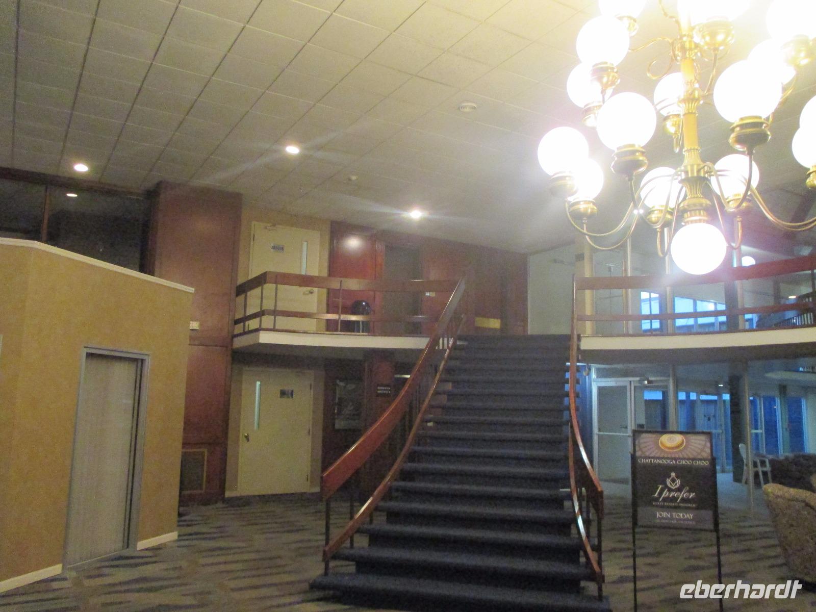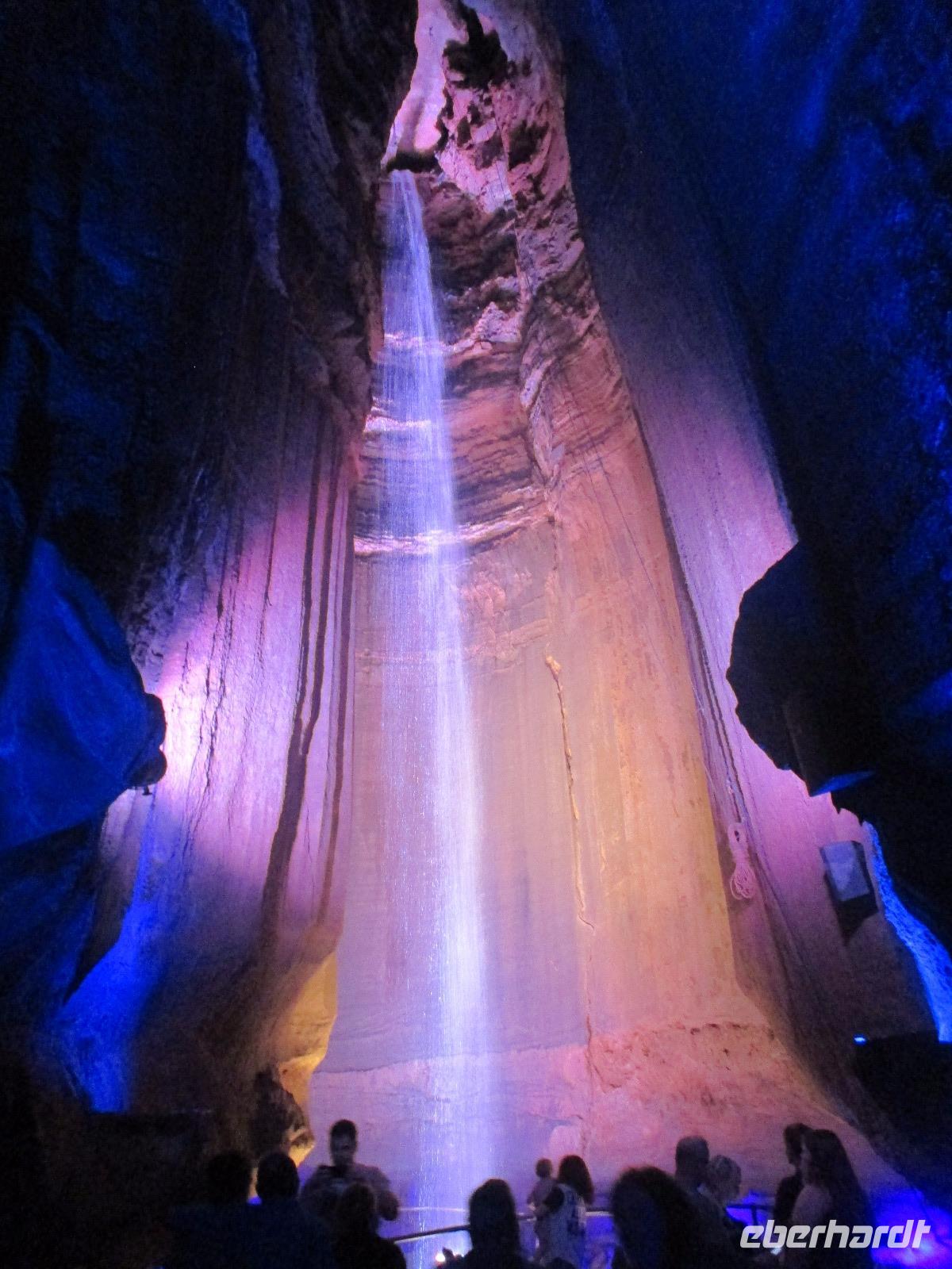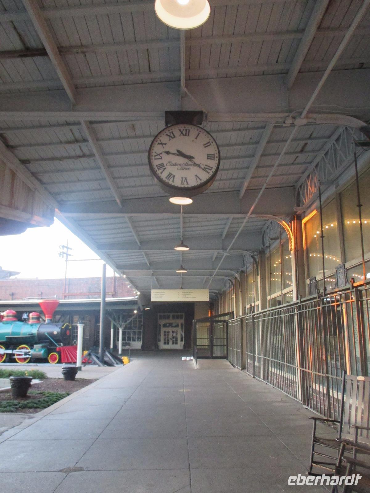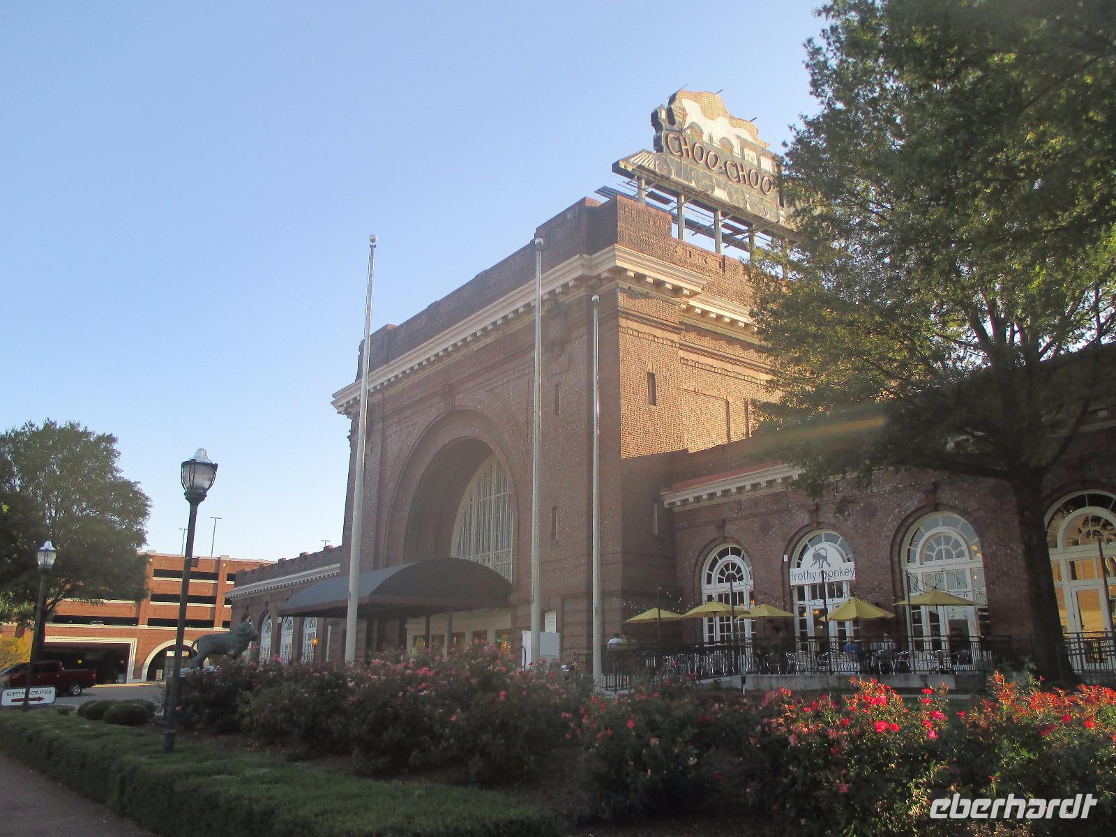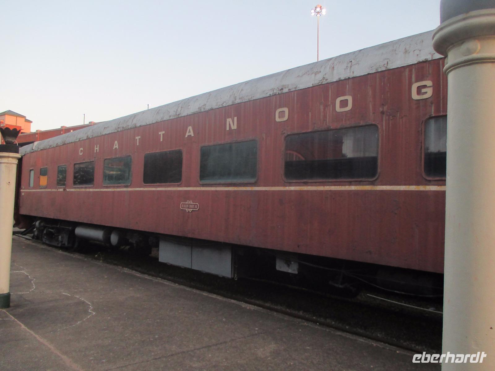 Leider ist heute der Luxus der letzten Tage vorbei und unser heutiger Startpunkt ist wieder 08:00 Uhr. Unser Weg führt uns in Richtung Lynchburg. Auf unserem Weg dahin sehen wir schon die ersten Ausläufer der Appalachen. Wir fahren nicht ganz zwei Stunden als wir unser Ziel, die Jack-Daniels-Destilliere. Da wir noch ein wenig Zeit bis zur Führung haben, schauen wir uns in der Eingangshalle um. Kurz nach 10 Uhr beginnt unsere Führung. Marguerite übersetzt für uns. Zunächst fahren wir mit dem Bus aus dem Gelände hinaus, ein Stück durch Lynchburg und steigen an einer andere Stelle des Firmengeländes wieder aus. Unser Guide erklärt uns, wie hier die Holzkohle hergestellt wird, sie zeigt uns die Wasserhöhle, aus der Herr Daniels das Wasser für die Whiskyproduktion und anschließend steht uns seine Statue für ein kleines Fotoshooting zur Verfügung. Nachdem uns der Guide noch sein Büro und den verhängnisvollen Tresor gezeigt hat, steigen wir wieder in den Bus ein. Nächster Stopp ist die Destillations-Halle, in der wir uns nur kurz aufhalten. Ein kleiner Film zeigt uns die Herstellung der Whisky-Fässer. Danach zeigt sie uns, wie die Flaschen etikettiert und verpackt werden. Zum Abschluss der Führung kommen wir noch in die große Lagerhalle. Die Führung endet im Werksverkauf, wo die Möglichkeit besteht, Whiskyflaschen käuflich zu erwerben. Wir machen noch ein kleines Fotoshooting auf einem überdimensionalen Schaukelstuhl und verbringen unsere Mittagspause in der Stadt Lynchburg. Diese ist aufgebaut wie eine kleine Westernstadt. Hier kann man zahlreiche Souvenirs, sei es verbunden mit der Jack-Daniels-Destillerie oder den Südstaaten, kaufen oder in den kleinen Cafés etwas essen oder trinken. Unser weiterer Weg führt uns nach Chattanooga. Kurz vor der Stadt müssen wir unsere Uhr um eine Stunde nach vorn stellen. Leo biegt auf den Parkplatz des Lookout Mountains ein und wir begeben uns zur Zugstation. Wir fahren mit der steilsten Zug, der Incline-Railway ca. 1,6 Kilometer hinauf. Steil deswegen weil die Steigung teilweise bis zu ca. 73% beträgt. Ziemlich steil und uns wird auch etwas mulmig, wenn wir nach hoch bzw. unten schauen. Oben angekommen, genießen wir einen Ausblick auf die weitläufige Landschaft und auf die Stadt Chattanooga. Natürlich nehmen wir den gleichen Weg hinab wie hinauf, also haben wir noch einmal ein tolles Zugerlebnis. Bevor wir in die Stadt zu unserem Hotel fahren, besuchen wir die mysteriösen Ruby-Wasserfälle. Mit einem Lift fahren wir in die Grotte hinab und spazieren rund 700 Fuß durch die Grotten und bestaunen dabei die angestrahlten Formationen. Einige erinnern an einen Elefantenfuß, Kartoffeln mit Steak, Kartoffelchips und auch Bacon. Wir kommen entlang der Hall of Dreams. Am Ende erreichen wir die legendären Ruby-Falls, ein Wasserfall in der Höhle mit einer enormen Höhe, auch der höchste Wasserfall in den Vereinigten Staaten von Amerika. Die Musik ertönt und der Wasserfall wird in bunten Farben angestrahlt. Ein schöner und seltener Anblick - da hat sich der Spaziergang untertage doch wirklich gelohnt. Zurück übertage wartet Leo bereits auf uns und bringt uns in die Stadt Chatanooga, in der wir heute in einem besonderen Hotel übernachten: in einem umgebauten Bahnhof. Nachdem wir unsere Zimmer im alten Bahnhofsgelände bezogen haben, nutzen wir noch die Zeit, um ein paar Fotos im Schwimmbad und von den ausgestellten Zugwagons zu schießen. Selbst in den Wagons sind Hotelzimmer untergebracht. Das alte Bahnhofshauptgebäude ist umgebaut und beherbergt neben der Rezeption auch das Restaurant „Frothy Monkey". Das erste Mal auf der gesamten Reise dürfen wir draußen sitzen. Natürlich nehmen wir das Angebot an, entziehen uns der typisch-amerikanischen Klimaanlage und genießen die laue Sommernacht in Chatanooga. Wir dürfen a-la-carte bestellen und werden nicht enttäuscht: das servierte Essen ist eines der besten auf der gesamten Rundreise.