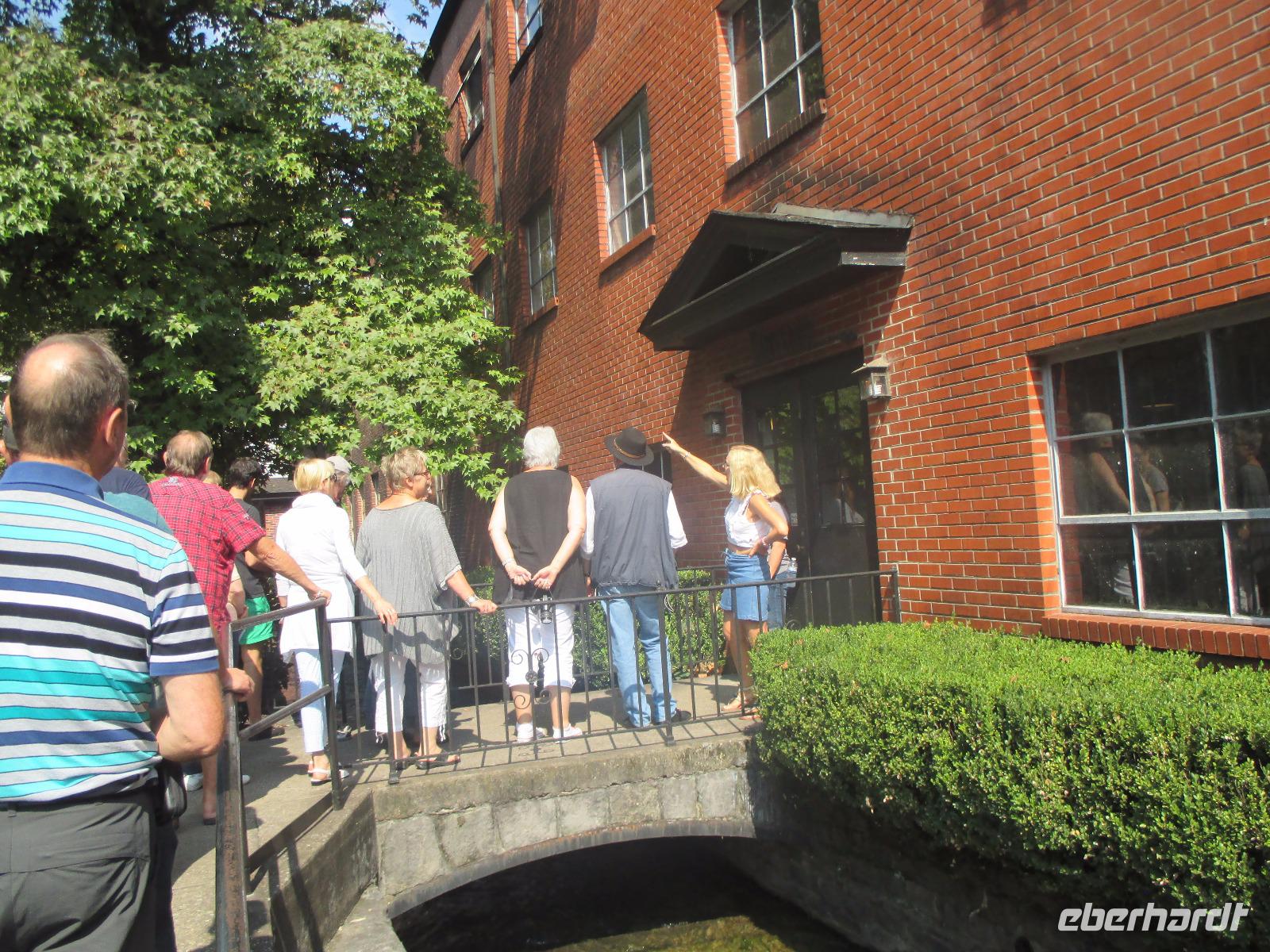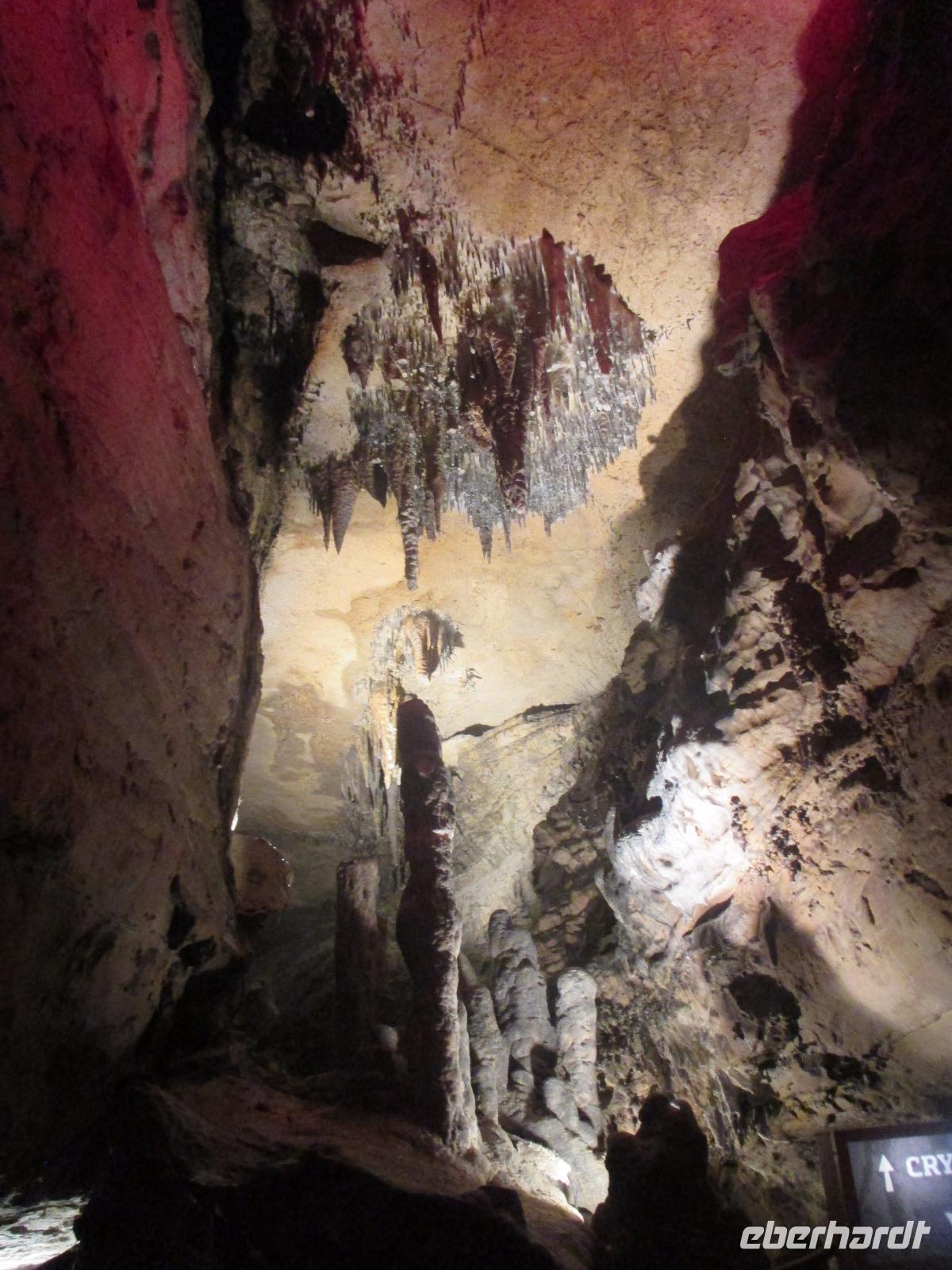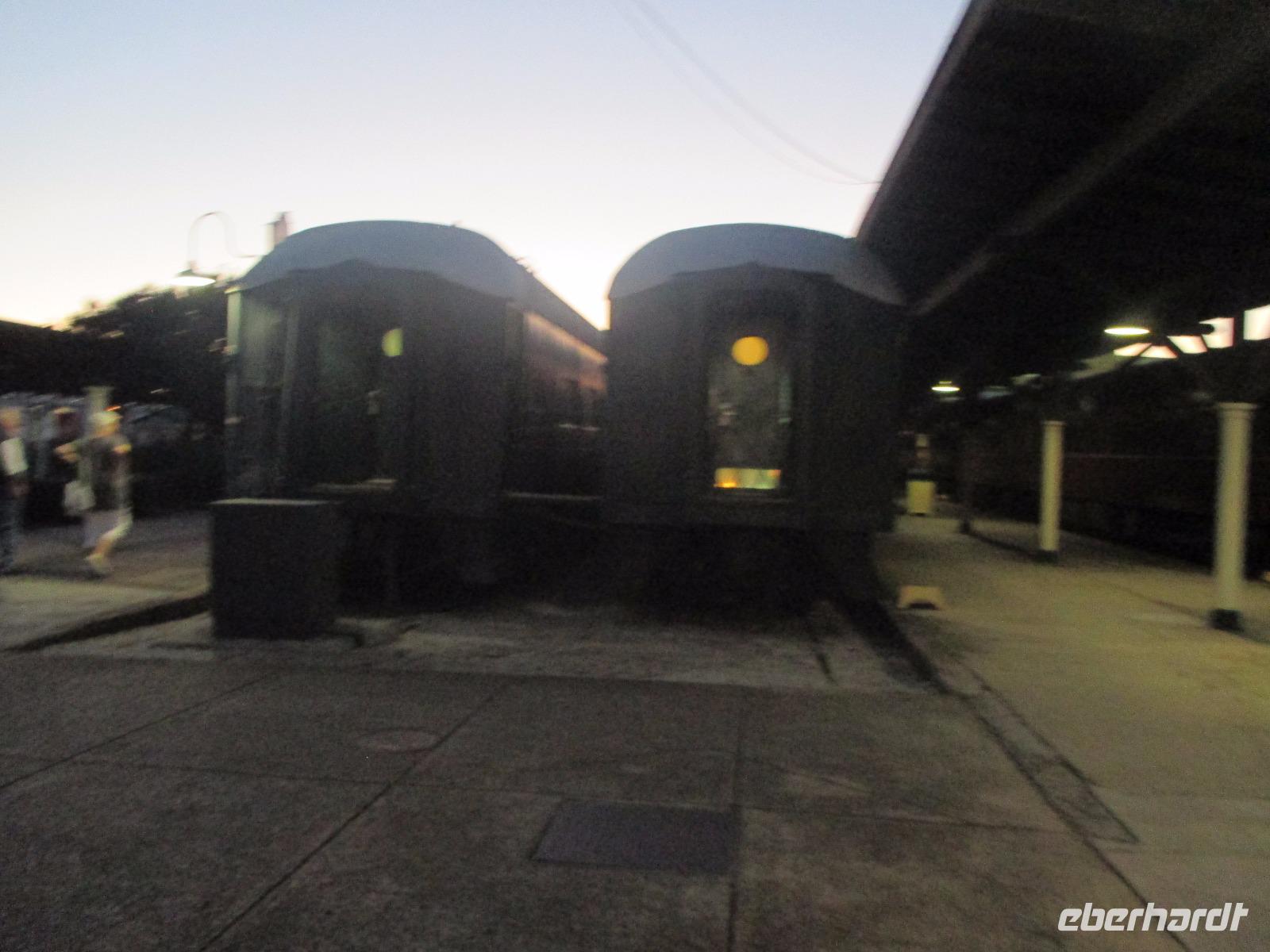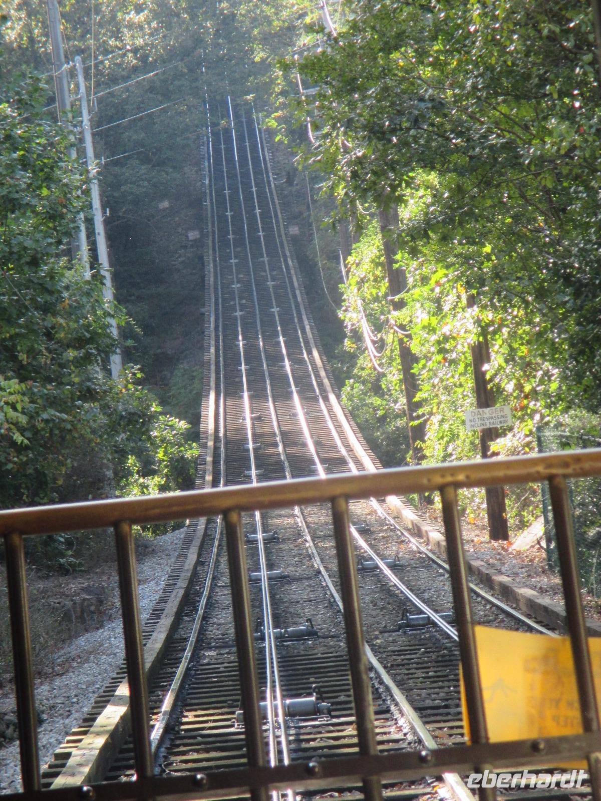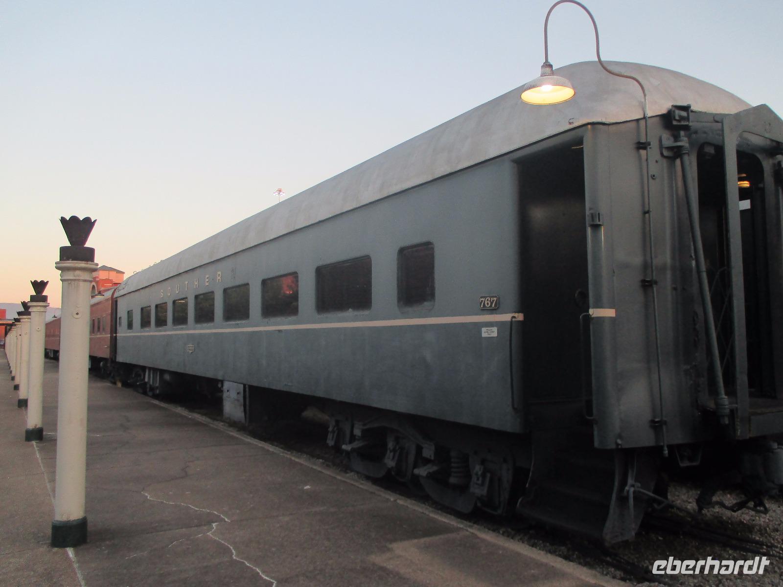 Leider ist heute der Luxus der letzten Tage vorbei und unser heutiger Startpunkt ist wieder 08:00 Uhr. Unser Weg führt uns in Richtung Lynchburg. Auf unserem Weg dahin sehen wir schon die ersten Ausläufer der Appalachen. Wir fahren nicht ganz zwei Stunden als wir unser Ziel, die Jack-Daniels-Destilliere. Da wir noch ein wenig Zeit bis zur Führung haben, schauen wir uns in der Eingangshalle um. Kurz nach 10 Uhr beginnt unsere Führung. Marguerite übersetzt für uns. Zunächst fahren wir mit dem Bus aus dem Gelände hinaus, ein Stück durch Lynchburg und steigen an einer andere Stelle des Firmengeländes wieder aus. Unser Guide erklärt uns, wie hier die Holzkohle hergestellt wird, sie zeigt uns die Wasserhöhle, aus der Herr Daniels das Wasser für die Whiskyproduktion und anschließend steht uns seine Statue für ein kleines Fotoshooting zur Verfügung. Nachdem uns der Guide noch sein Büro und den verhängnisvollen Tresor gezeigt hat, steigen wir wieder in den Bus ein. Nächster Stopp ist die Destillations-Halle, in der wir uns nur kurz aufhalten. Ein kleiner Film zeigt uns die Herstellung der Whisky-Fässer. Danach zeigt sie uns, wie die Flaschen etikettiert und verpackt werden. Zum Abschluss der Führung kommen wir noch in die große Lagerhalle. Die Führung endet im Werksverkauf, wo die Möglichkeit besteht, Whiskyflaschen käuflich zu erwerben. Wir machen noch ein kleines Fotoshooting auf einem überdimensionalen Schaukelstuhl und verbringen unsere Mittagspause in der Stadt Lynchburg. Diese ist aufgebaut wie eine kleine Westernstadt. Hier kann man zahlreiche Souvenirs, sei es verbunden mit der Jack-Daniels-Destillerie oder den Südstaaten, kaufen oder in den kleinen Cafés etwas essen oder trinken. Unser weiterer Weg führt uns nach Chattanooga. Kurz vor der Stadt müssen wir unsere Uhr um eine Stunde nach vorn stellen. Leo biegt auf den Parkplatz des Lookout Mountains ein und wir begeben uns zur Zugstation. Wir fahren mit der steilsten Zug, der Incline-Railway ca. 1,6 Kilometer hinauf. Steil deswegen weil die Steigung teilweise bis zu ca. 73% beträgt. Ziemlich steil und uns wird auch etwas mulmig, wenn wir nach hoch bzw. unten schauen. Oben angekommen, genießen wir einen Ausblick auf die weitläufige Landschaft und auf die Stadt Chattanooga. Natürlich nehmen wir den gleichen Weg hinab wie hinauf, also haben wir noch einmal ein tolles Zugerlebnis. Bevor wir in die Stadt zu unserem Hotel fahren, besuchen wir die mysteriösen Ruby-Wasserfälle. Mit einem Lift fahren wir in die Grotte hinab und spazieren rund 700 Fuß durch die Grotten und bestaunen dabei die angestrahlten Formationen. Einige erinnern an einen Elefantenfuß, Kartoffeln mit Steak, Kartoffelchips und auch Bacon. Wir kommen entlang der Hall of Dreams. Am Ende erreichen wir die legendären Ruby-Falls, ein Wasserfall in der Höhle mit einer enormen Höhe, auch der höchste Wasserfall in den Vereinigten Staaten von Amerika. Die Musik ertönt und der Wasserfall wird in bunten Farben angestrahlt. Ein schöner und seltener Anblick - da hat sich der Spaziergang untertage doch wirklich gelohnt. Zurück übertage wartet Leo bereits auf uns und bringt uns in die Stadt Chatanooga, in der wir heute in einem besonderen Hotel übernachten: in einem umgebauten Bahnhof. Nachdem wir unsere Zimmer im alten Bahnhofsgelände bezogen haben, nutzen wir noch die Zeit, um ein paar Fotos im Schwimmbad und von den ausgestellten Zugwagons zu schießen. Selbst in den Wagons sind Hotelzimmer untergebracht. Das alte Bahnhofshauptgebäude ist umgebaut und beherbergt neben der Rezeption auch das Restaurant „Frothy Monkey". Das erste Mal auf der gesamten Reise dürfen wir draußen sitzen. Natürlich nehmen wir das Angebot an, entziehen uns der typisch-amerikanischen Klimaanlage und genießen die laue Sommernacht in Chatanooga. Wir dürfen a-la-carte bestellen und werden nicht enttäuscht: das servierte Essen ist eines der besten auf der gesamten Rundreise.
