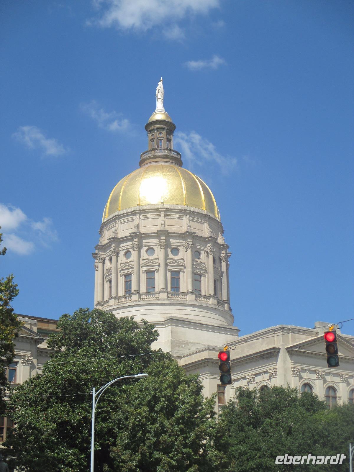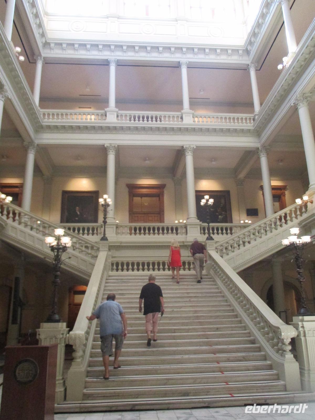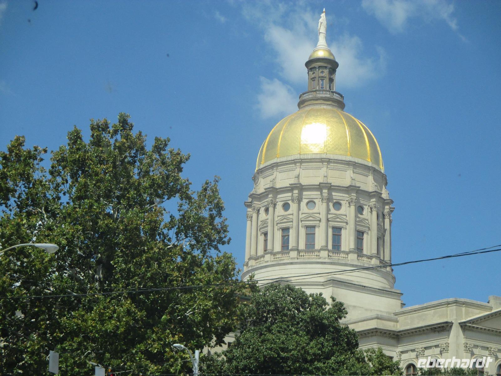 Leider ist heute unser letzer vollständiger Tag in den Südstaaten der USA angebrochen. Leo bringt uns in rund anderthalb Stunden Fahrt nach Atlanta. Schon von weitem sehen wir die Hochhäuser von Downtown Atlanta. Auf dem Highway kommen wir auch an der Statue des olympischen Feuers vorbei. Vorbei am Coca-Cola-Museum erreichen wir das Hauptgebäude von CNN. In der Eingangshalle gibt es zahlreiche Verkaufsstände für Nahrungsmittel sowie Souvenirläden. Von Marguerite erhalten wir ein mehrseitiges Formular mit der deutschen Erklärung zur Führung, die wir gleich erhalten werden, da eine Übersetzung leider nicht möglich ist. Nach einer sehr strengen Personenkontrolle fahren wir mit einer steilen Rolltreppe nach oben und kommen in einem Raum hinein, wo uns der Guide die verschiedenen CNN-Beschilderung (regional und international) erklärt als auch die Aufgabe des Aufnahmeleiters, der aus mehreren Bildern entscheiden muss, wann welches Bild auf Sendung geht. Der nächste Stopp ist in einem Studio, wo unser Guide den Teleprompter erklärt, warum die Nachrichtensprecher trotz Ablesens der Nachrichten zusätzlich die Blätter umblättern als auch die „green wall". Lustig wird es als ein Freiwilliger vor der grünen Wand einen blauen Umhang bekommt. Plötzlich sehen wir im Fernseher nur noch seinen Kopf. Unser nächster Halt ist der Newsroom, in dem wir von oben in das Großraumbüro hineinschauen können. Wir haben noch einige andere Stopps von Untersender von CNN und mittels unser Übersetzung auf Papier erhalten wir sogar noch mehr Informationen, als der englischsprachige Guide an die anderen Teilnehmer weitergibt. Danach gehen wir weiter zum Bus und kommen sowohl am Basketball- und Football-Station vorbei. Leider hat Atlanta nicht viel zu bieten und daher fahren wir weiter zum Kapital. Maguerite schlägt vor, unsere Pässe mitzunehmen, damit wir versuchen, ins Innere des Kapitols zu kommen. Und wir haben auch Glück und dürfen hinein. Nach Pass- und Personenkontrolle erklärt sich ein netter Mann sogar dazu bereit, eine kleine Führung mit uns zu unternehmen. Er erklärt uns einige Bilder, die Bildung des Houses of Parliament und wir dürfen sogar in einen Sitzungssaal hinein. Die Möbel sind alle noch original aus dem 19. Jahrhundert. Er erklärt uns die Vorgehensweise hier und wir dürfen alle Fragen stellen, die uns einfallen. Wir sind beeindruckt. Nachdem sich der nette Mann verabschiedet hat, schauen wir uns noch die Ausstellung in der dritten Etage an. Unser nächster Programmpunt ist Martin Luther King. Wir halten an der Kirche, in der er seine Reden gehalten hat. Diese werden mittels eines Lautsprechers eingespielt und erzeugen bei uns Gänsehaut. Vorbei an seinem Grab führt uns Marguerite im Anschluss zu seinem Geburtshaus. Über die bekannten Shotgun-Häuser erreichen wir das Martin-Luther-King-Museum für die Bürgerrechtsbewegung. Zahlreiche Videos zu seinem Leben und seiner Beerdigung eingespielt und viele Plakate zu seiner Mission sind zu sehen. Nach einem Stopp an einem Hotel mit besonderer Architektur (das Hotel hat mehr als 47 Etagen die schief nach oben gebaut sind), checken wir in unserem Hotel ein. Leider müssen wir uns nun von Leo verabschieden, der zurück nach New Orleans fahren muss. Da wir bis zum Abendessen noch ein wenig Zeit haben, fahren Marguerite und ich auf Gästewünsch mit einigen Reiseteilnehmern zu einer Mall, um noch ein wenig zu shoppen. Unser Abschiedsabendessen nehmen wir im „Vom-Winde-verweht"-Restaurant Pittypat´s Porch ein. Und hier bekommen meine lieben Gäste auch, auf Wunsch, endlich ihre langersehnten Steaks;-)