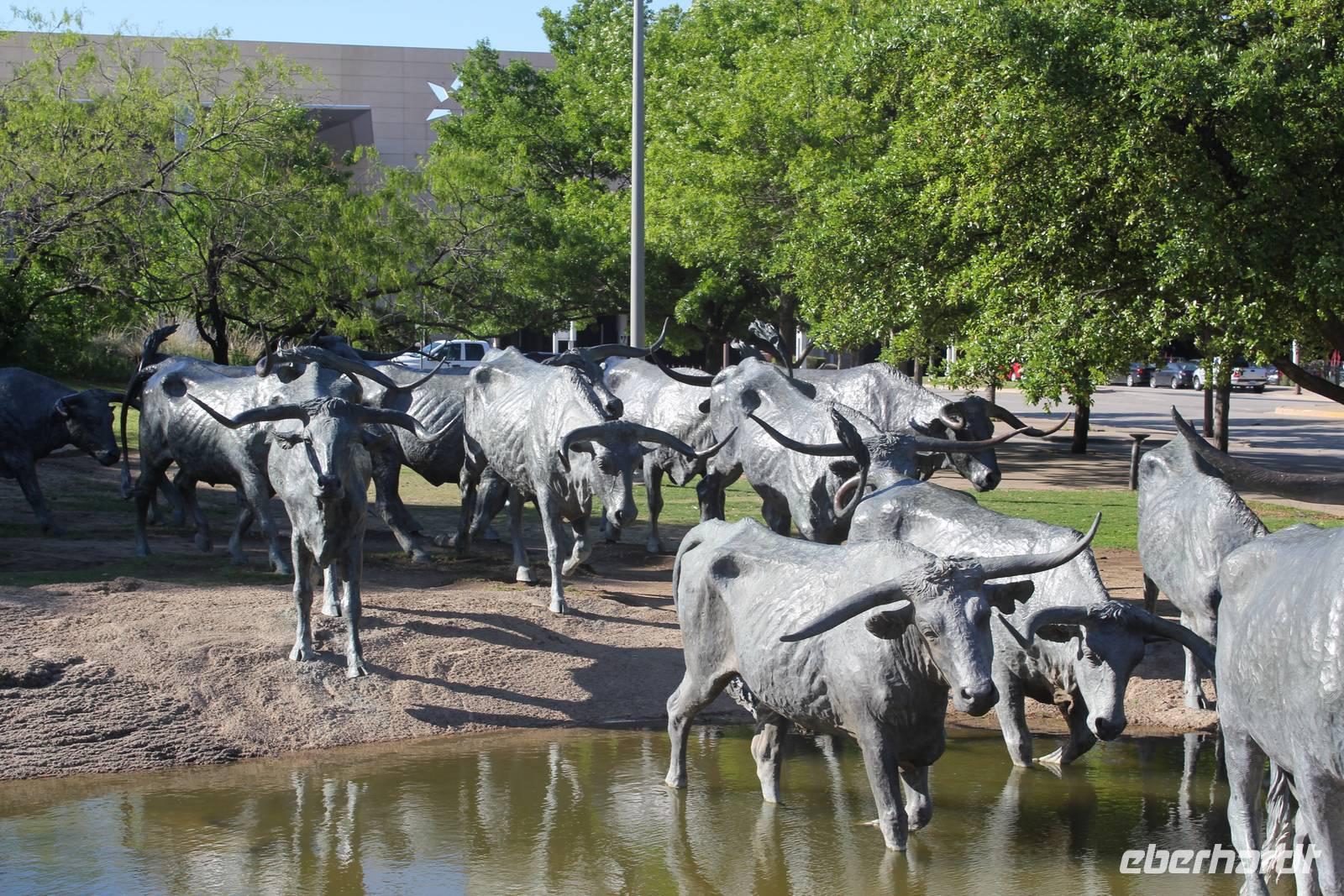Der Tag beginnt mit einem typisch amerikanischen Frühstück: Bagels mit Cream Cheese, Rührei, Muffins und frisches Obst lassen uns wohl genährt in den Tag starten! So beginnen wir unsere Stadtrundfahrt durch Dallas - das Zentrum für Handel und Verkehr in Texas. Erstes Ziel ist das historische Viertel West End, das sich durch hübsche, rote Backsteinhäuser auszeichnet. Bei einer frischen Brise aber strahlendem Sonnenschein machen wir unseren ersten Fotostopp am Pioneer Plaza mit dem Langhornrindherde-Denkmal, das an die Zeit Texas' vor dem Ölboom erinnert, in der die Rinderzucht der wichtigste Wirtschaftszeig war. Elisa bezwingt eines der tollkühnen Langhornrinder, bevor es weiter geht vorbei am Gebäude des „Dallas Morning Newspaper" und dem historischen „Old Red Museum", dessen Bauwerk uns mit seinen Türmchen und der kleckerburgartigen Fassade entzückt. Wir passieren das höchste Gebäude der 1,2 Millionen Einwohnerstadt, das „Bank of America Plaza"-Gebäude und erreichen die „American Airlines Arena", die nicht nur Heimat des Basketballteams „Dallas Mavericks" ist, sondern sich auch innerhalb von 2 Stunden in eine Eishockeyarena umbauen lässt! Vor der Arena begegnen wir zwar leider nicht Dirk Nowitzki (dann hätte sich Elisa auch leider von der Gruppe verabschieden müssen ), dafür aber einer Gruppe von „Mariachi" - eine traditionelle mexikanische Musikgruppe, die uns auch glatt mit einer kleinen musikalischen Show beglückt! Eine tolle Überraschung!