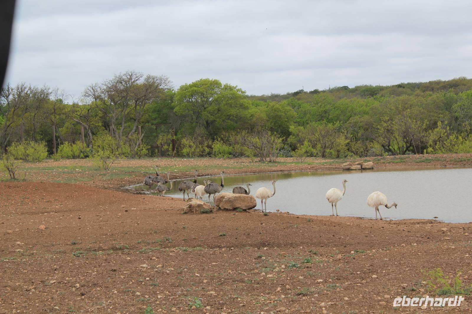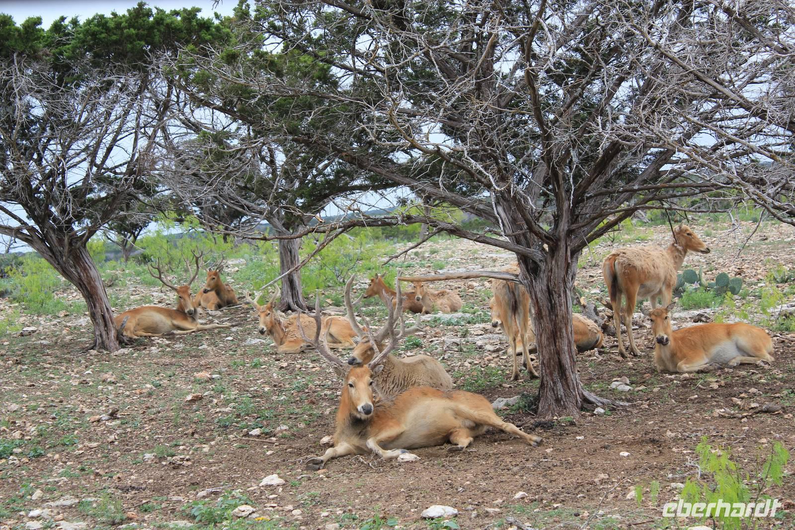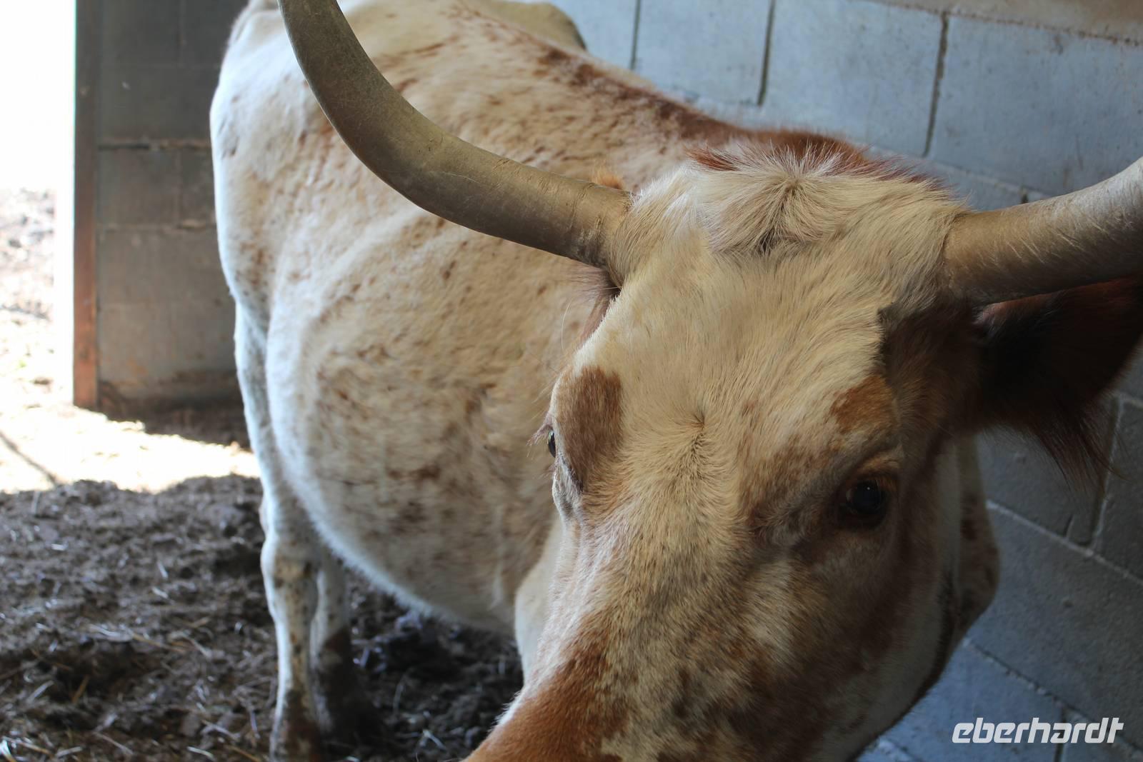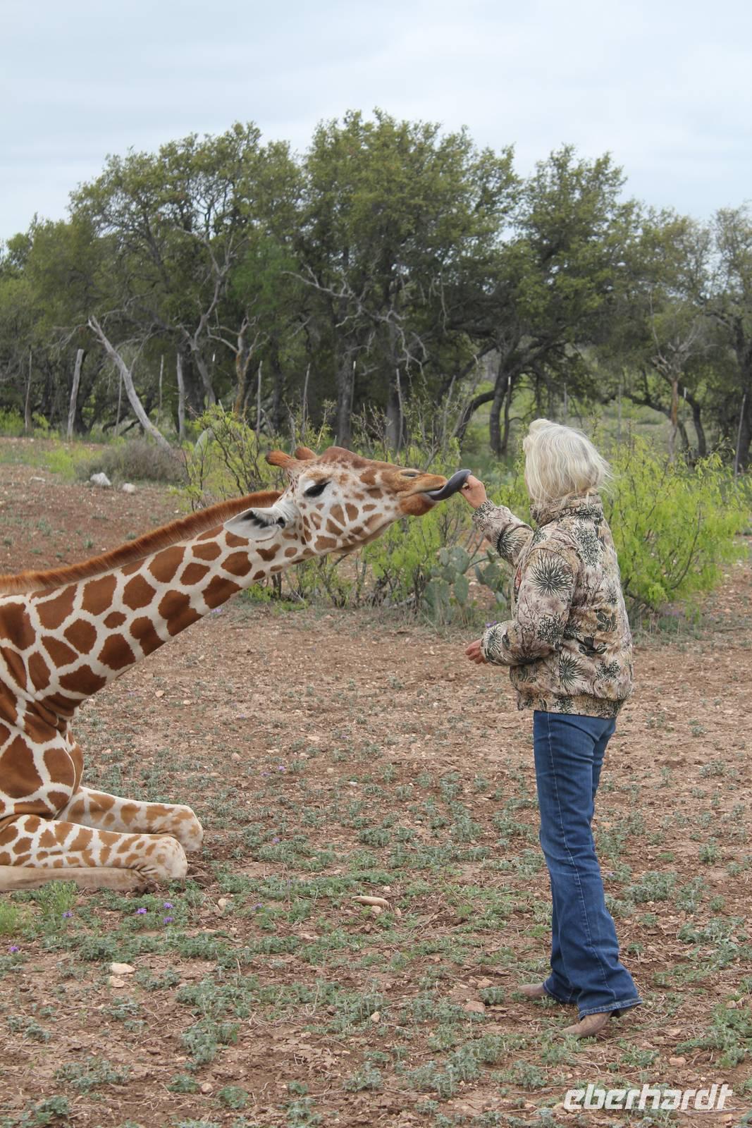Ein traumhaftes Frühstück lässt uns heute energiegeladen in den Tag starten! Um 8:30 Uhr machen wie uns auf in Richtung „Y.O. Ranch", der ältesten familienbetriebenen und noch aktiven Ranch in Texas! 1880 kaufte Familie Schreiner die heutzutage 12.140 ha große Farm, die sich inzwischen von nur traditioneller Rinderzucht zur einer wahren Attraktion für Touristen und Einheimischen entwickelt hat: über 50 verschiedene Tierarten, darunter viele die vom Aussterben bedroht sind, haben hier ihr zu Hause und werden tagtäglich liebevoll umsorgt, leben aber dennoch in freier Wildbahn. Bevor wir das eigentliche Hauptgebäude der Ranch erreichen, holpern wir bereits eine halbe Stunde über das endlos weit scheinende Gelände und erspähen die ersten trägen Langhornrinder und Antilopen zwischen steinigen Feldern und Kaktusfeigen. Bei unserer Safari durch 2 Teile der Ranch, auf unbefestigten Wegen, werden wir nicht nur ordentlich durchgeschüttelt, sondern sehen auch zahlreiche wunderbare Tiere: verschiedene Antilopen- und Hirscharten, das mit der Flache aufgezogene Zebra Tobi, Damwild, Kudus und viele mehr! Unsere Fotoapparate laufen heiß, doch es sollte noch besser kommen: Gnus, Emus, Strauße und schließlich 3 Giraffen kommen wir mit unserem ausgedienten Schulbus ganz nah! Unsere Führerin Debbie füttert ihre Lieblinge mit Keksen und frischem Gemüse und bietet uns somit einmalige Fotomotive, wie zum Beispiel der leidenschaftliche Giraffenkuss für Matt! Auch der Strauß schaut neugierig in unser Busfenster und versucht mit seinem langen Hals über das Lenkrad hinweg einen Keks zu ergattern! Ein wahres Spektakel. Einige der hier lebenden exotischen Tiere aus Indien, Pakistan, China oder Afrika sind in ihren Herkunftsländern bereits ausgestorben. Nach dem Spaß stärken wir uns nun bei einem typisch texanischen Ranch-Mittagessen, mit Rindfleisch, braunen Bohnen und unglaublich leckerem selbstgemachten Mandel-Käsekuchen!