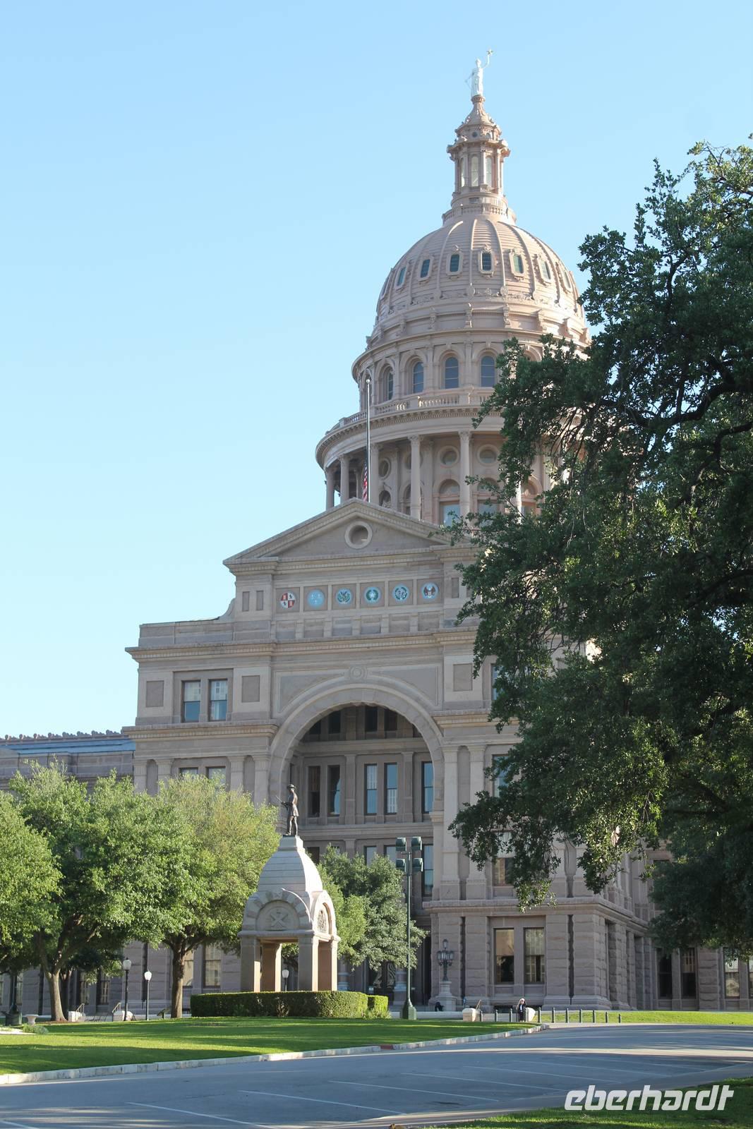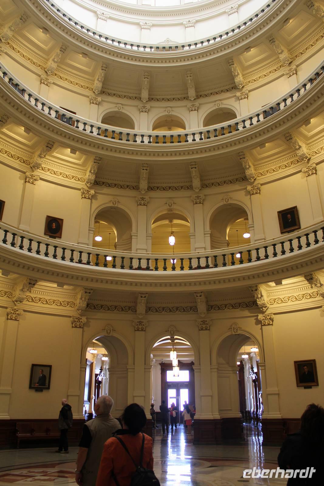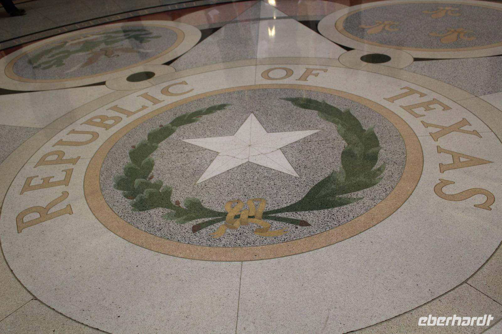 Zu Fuß machen wir uns auf und spazieren in der Sonne zum nahe gelegenen Kapitol. Und weil in Texas ja bekanntlich alles etwas größer ist, überragt das Parlamentsgebäude das Kapitol in Washington um ganze 2,10 Meter. Nach einem ausgiebigen Bummel durch den umliegenden Park des beeindruckenden Kalksteingebäudes, das mit vielen historischen Denkmälern geschichtlicher Zeitzeugen geziert ist, betreten wir das Innere des 1853 durch den amerikanischen Architekten Elijah E. Meyer fertig gestellte Bauwerk. Bei einer Führung mit einem echten Texaner, mit typisch enthusiastischen, leicht übertriebenen Ausführungen, erfahren wir mehr über den Regierungssitz des Bundesstaates, in dem der Senat nur aller 2 Jahre für 140 Tage zusammen kommt um sämtliche Gesetze für die kommenden 2 Jahre zu verabschieden.