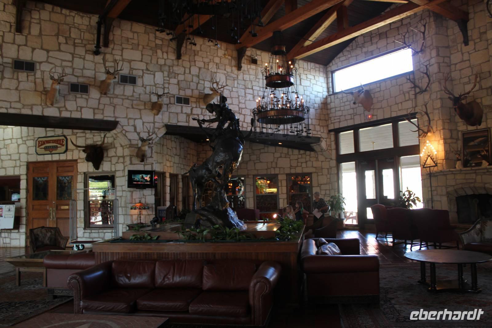 Nach so viel Kultur sind wir nun doch alle ein wenig müde und freuen uns nun auf die Ankunft in unserem Hotel im Ranch-Stil „Y.O. Ranch Resort" in Kerrville. Die beeindruckende Lobby begeistert uns mit den Sesseln aus Büffelfell, ausgestopften Rindern an der Wand und Kronleuchtern aus Brandeisen! Wir stellen fix unsere Koffer ab und erfahren bei Nachos mit Avocado-Creme und einem Gläschen kühlen Rot- oder Weißweins mehr über die Gestaltung der Hotellobby und die Herkunft der verschiedenen Möbelstücke. Die vergoldeten Türen zum Restaurant sowie die schwere Tresortür der Rezeption stammen z.B. aus einer alten Bank. Schließlich genießen wir unser Abendessen im stilvoll eingerichteten Restaurant und lassen den erlebnisreichen Tag entspannt ausklingen. (187 km)
