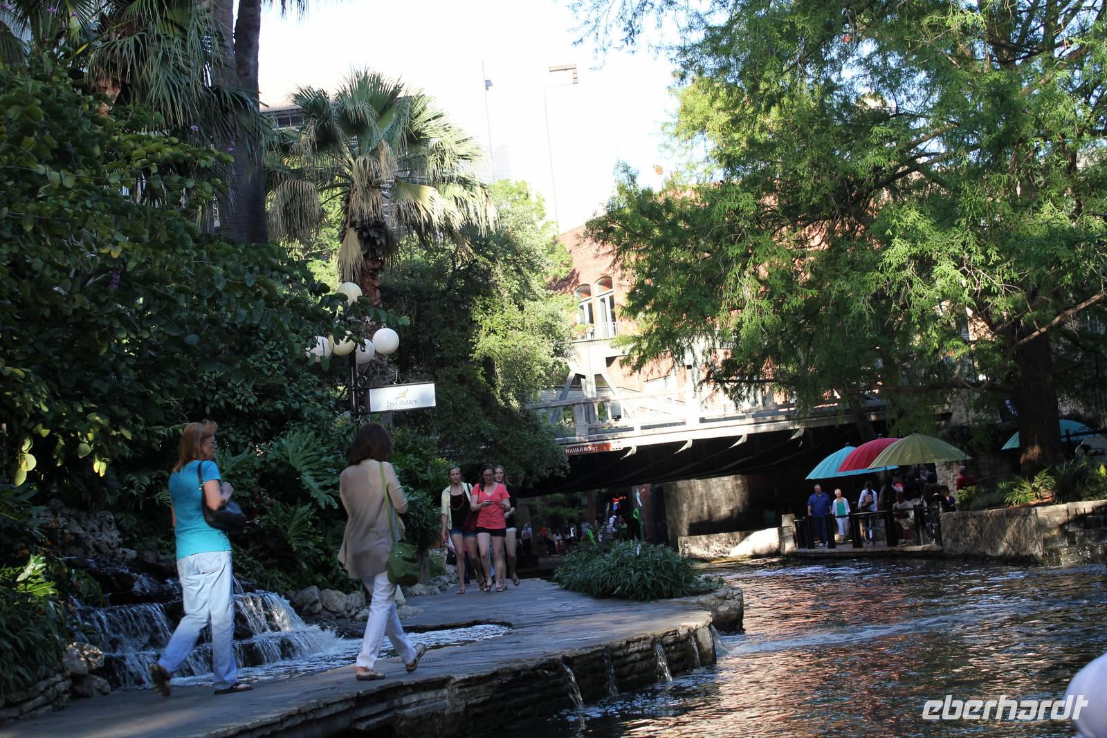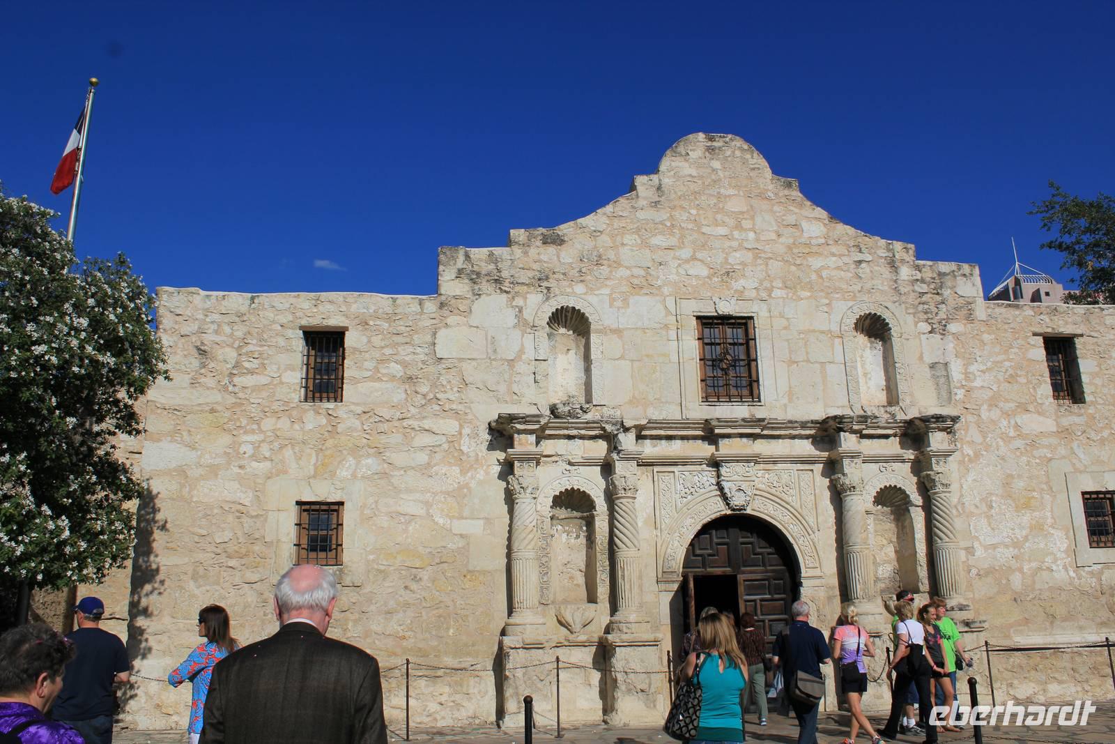 Satt und zufrieden verlassen wir nun wieder die „Y.O. Ranch" und fahren in Richtung San Antonio, der 7.-größten Stadt der Vereinigten Staaten. Zu sanften Klängen der texanischen Sängerin Norah Jones schunkeln wir der für ihre kulturelle Vielfalt bekannten 1,3 Millionen Einwohner Stadt entgegen. Leider müssen wir bei unserer Ankunft etwas auf unsere Hotelzimmer warten, doch zum Glück kommt Matts Reiseleiter-Freundin Tony vorbei und stimmt uns auf das derzeitige Stadtfest „Fiesta" ein, mit dem San Antonio an die Schlacht von 1838 zwischen „The Alamo" und San Jacinto erinnert, bei der Texas seine Unabhängigkeit von Mexiko erlangte und zu einer eigenständigen Republik wurde - „the Lone State". Tony erzählt uns über die Traditionen des Festivals und beglückt uns mit bunten Schmuckketten, mit denen wir uns dem verrückten Treiben anpassen! Als unsere Zimmer nun endlich bezogen sind, geht es mit Tony zunächst zum Alamo Plaza, wo auch wir uns einer Fiesta-Tradition annehmen: Die „Casarones" sind bunte lehre Eierschalen, die mit Konfetti gefüllt sind. Als Zeichen der Liebe schlägt man sich die Eier gegenseitig auf den Kopf. Und so dauert es nicht lange und unsere Häupter sind über und über mit Konfetti verziert! So bunt geschmückt widmen wir uns trotzdem kurz der Historie San Antonios und besichtigen das Alamo - eine zum Fort ausgebaute ehemalige Missionsstation, die die Schlacht von Alamo, dem texanischen Unabhängigkeitskrieg, anschaulich darstellt.