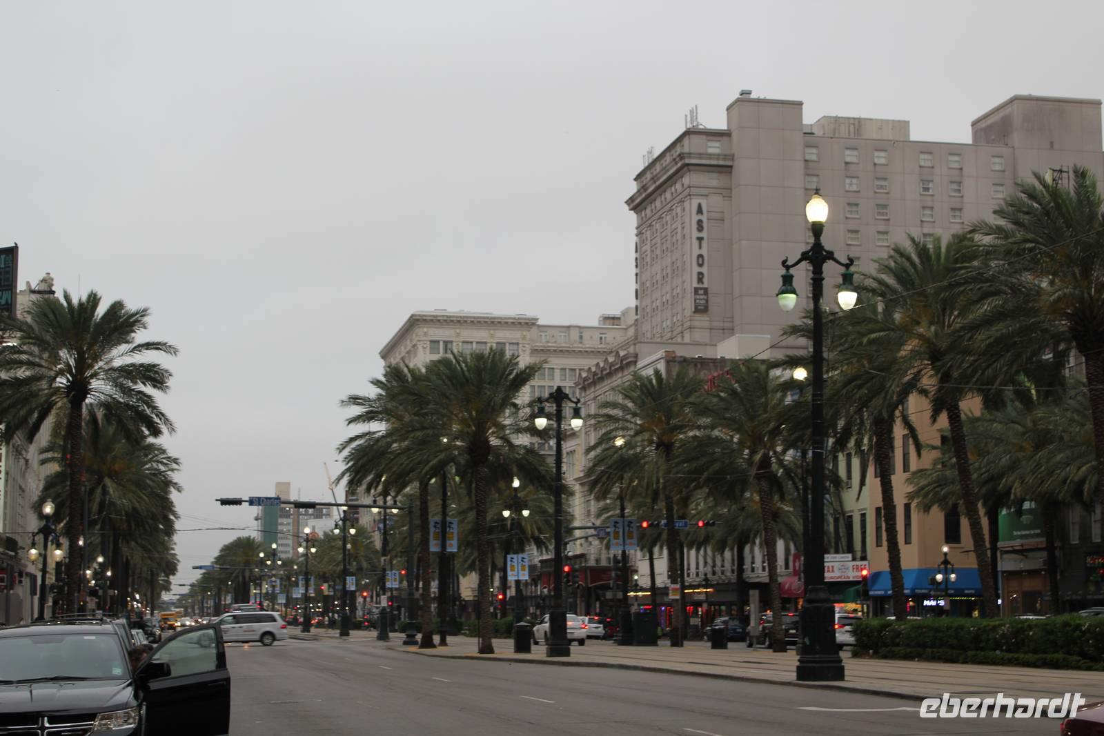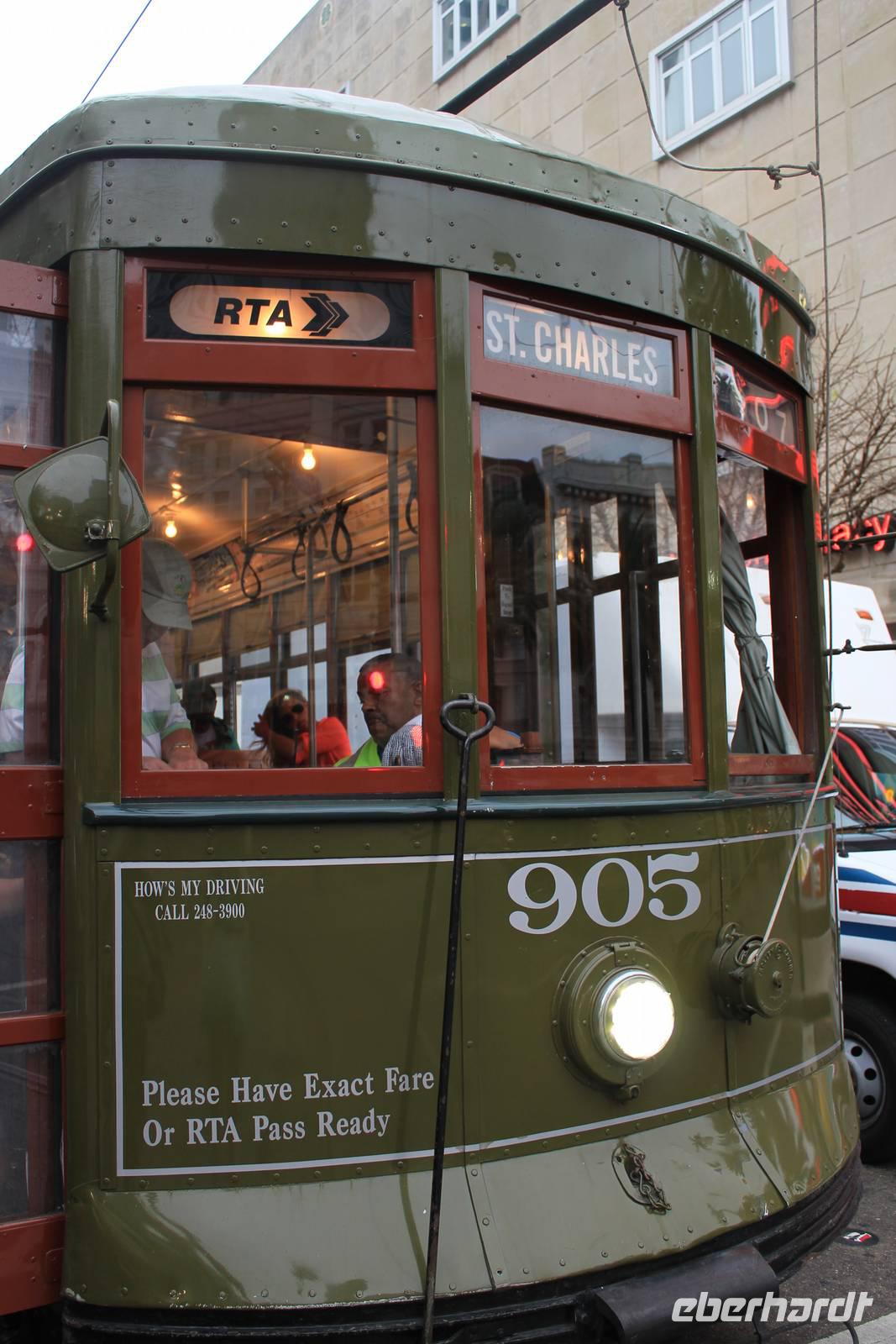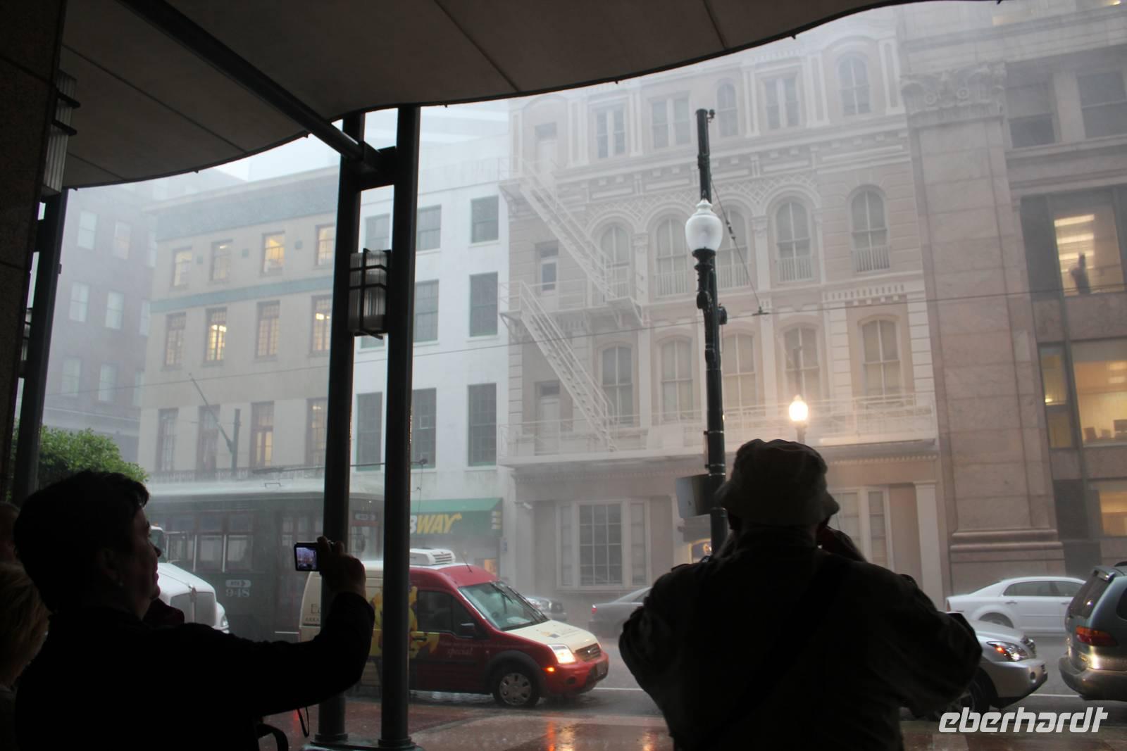 Hochmotiviert New Orleans zu Fuß zu erkunden, starten wir heute erneut mit einem wurst- und käsegespickten Frühstück in den Tag! Um 9 geht es bei schwül-warmer Luft los zur Haltestelle des „St. Charles Streetcar". In einem der grünen historischen Straßenbahnwagen aus den Jahren 1923/24 mit Holzbänken und Messinggriffen wollen wir nostalgisch durch den Garden District fahren, das Villenviertel der etwas wohlhabenderen Bevölkerung von New Orleans. Vorbei am Lee Circle mit einer Statue von General Louis, Hauptstreitkräfteführer des Bürgerkriegs, passieren wir nur wenig später schönste Herrenhäuser, verziert mit hohen Säulen, gusseisernen Geländern, hübschen Gärten und detailverliebten Schmuckstücken. Ein Haus ist schöner als das nächste, wie zum Beispiel das „Hochzeitstortenhaus oder der Campus der Loyola Universität. Am Ende des hübschen Viertels steigen wir aus und bedrohlich dunkle Wolken ziehen bereits langsam am Himmel auf, als würden sie uns warnen wollen. Und nur wenig später ist es dann soweit. Was als sanfter Schauer beginnt, entpuppt sich schnell als ein waschechter Wutausbruch des Himmels! (und dabei hat Matt gestern so schön seine Rippchen aufgegessen) Wir haben keine andere Wahl als in einem Einkaufszentrum Unterschlupf zu suchen und abzuwarten. Doch die Himmelsschleusen wollen sich nicht schließen und riesige Tropfen peitschen mit heftigem Sturm durch die bereits überfluteten Straßen. So schlimm es ist, bekommen wir nun immerhin einen Eindruck von der Katastrophe die sich mit Hurrikan Katrina im Jahr 2005 ereignete. Seit dem konnte die Stadt leider nicht genügend Geld aufbringen, das Kanalisations- und Abflusssystem wieder vollständig in Schuss zu bringen.
