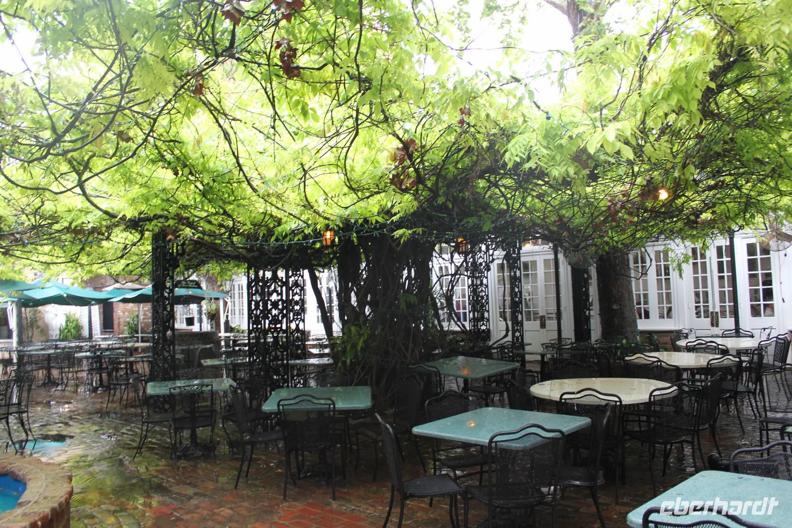 Wir beschließen mit insgesamt 5 Taxis zu unserem Mittagsrestaurant zu fahren: „Court of two sisters", ein Lokal mit wunderschönem Innenhof und Jazz-Life-Musik. Doch leider können wir heute nicht auf verschnörkelten weißen Stühlen unter einem Blätterdach sitzen, sondern machen es uns (mit nassen Füßen) drin gemütlich und lassen uns das leckere Buffet reichlich schmecken! Die Stadt die durch französische Kreolen gegründet wurde, präsentiert uns hier die Küche dieser sowie der Cajuns. Meeresfrüchte, die tollsten Salatvariationen, Torten und Kokosfrüchte füllen unsere Bäuche. Und da New Orleans nicht nur die Geburtsstätte des Jazz sondern auch eine der musikalisch reichsten Städte Amerikas ist, wird unser leckeres Mahl von einer 3-köpfigen fantastischen Live-Band begleitet. Da sind die nassen Füße doch schnell wieder vergessen - aber nur bis wir zum Ausgang kommen und unseren Spaziergang durch das French Quarter beginnen wollen. Es regnet noch immer und wir beschließen kurzerhand zum Hotel zurück zu gehen und um 17 Uhr noch einen letzten Versuch zu starten. Dieser sollte gelingen! Es ist trocken und so besuchen wir nun das einen starken französischen Einfluss zeigende alte Stadtzentrum. Besonders charakteristisch sind nicht nur die z.T. 100 bis 250 Jahre alten Häuser mit Arkaden, schmiedeeisernen Balkonen und malerischen Innenhöfen, sondern auch die zahlreichen Jazz- und Musiklokale, die das Viertel zu einer Vergnügungsmeile machen. Auf der Bourbon Street passieren wir Vergnügungsstätten von höchst unterschiedlichem Niveau (manche Frauen können sich nicht einmal etwas zum Anziehen leistenJ). Unser 1. Ziel ist der St. Louis Cemetery (Friedhof) No. 1. Das hier meistbesuchte Grab ist das der Voodoo-Königin Marie Laveau. Da der Grundwasserspiegel selbst hier inmitten des Stadtzentrums sehr hoch liegt, sind die Gräber oberirdisch angelegt.