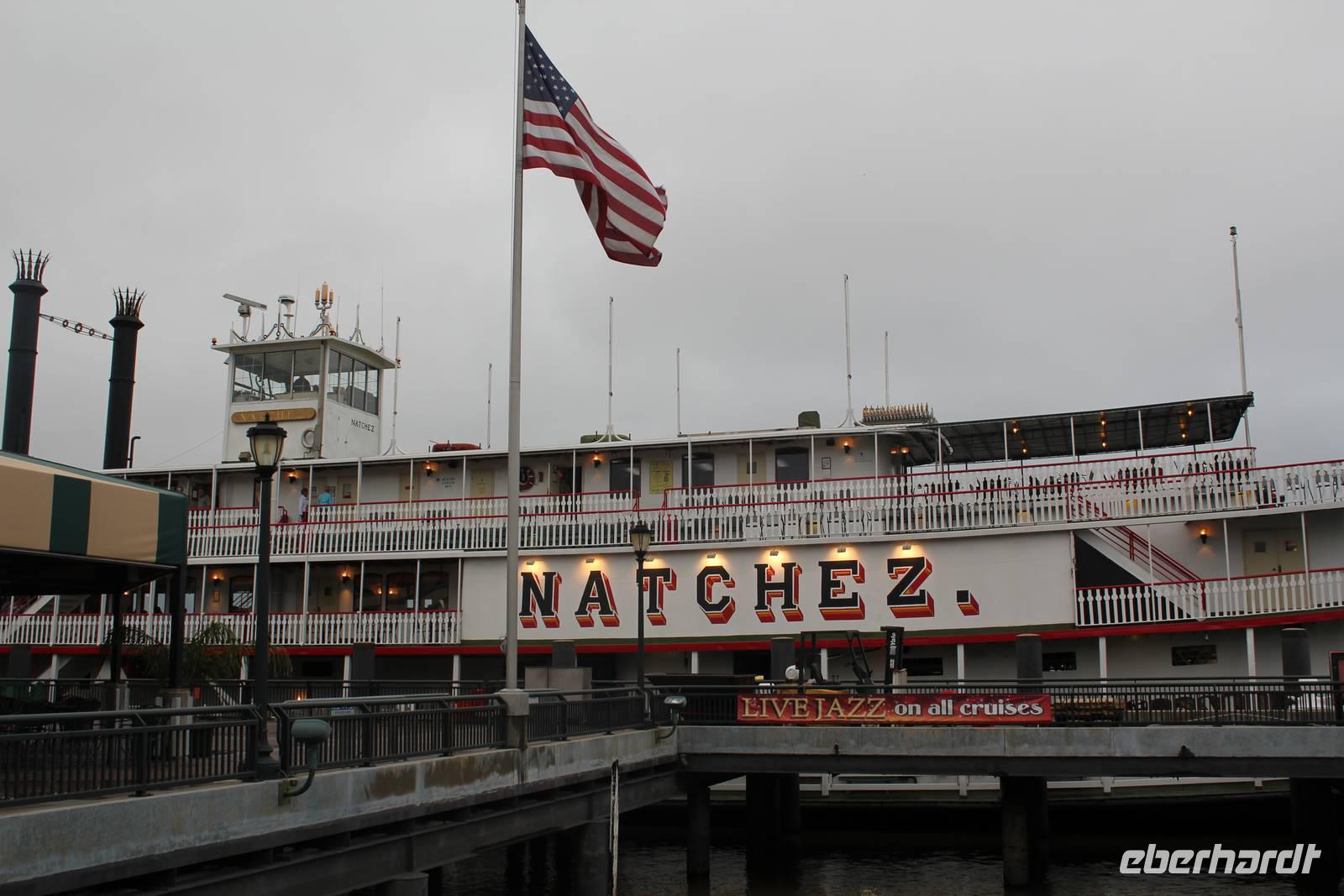 Nun bewegen wir uns gemütlich in Richtung Flussufer des Mississippi. Wir blicken über den Jackson Square und auf die hübsche Kathedrale St. Louis, die wahrhaftig die älteste Kathedrale der Vereinigten Staaten ist (1851). Nicht verpassen dürfen wir auch das „Café du Monde", wo es die berühmten leckeren „Beignets" gibt. Die dick mit Puderzuckern bestäubten Brandteigbällchen werden von den zahlreichen Gästen in den heißen Milchkaffee getunkt. Doch wir sind noch statt von unserem köstlichen Mittagessen und freuen uns jetzt auf unsere anstehende Schaufelraddampferschifffahrt auf dem Mississippi! Der gigantische Dampfer mit dem Namen „Natchez" steht schon bereit und lockt mit fröhlichen Jazzklängen. Allein das Schaufelrad wiegt stattliche 26 Tonnen und auch dem Maschinenraum können wir bestaunen (nicht zuletzt weil es hier so schön warm ist!). Um 19 Uhr legen wir mit einem kräftigen „Tuuuuuut tuuuuut" ab und schippern für 2 Stunden mit Blick auf die hellerleuchtete Stadt und ihr Umland auf dem Mississippi. Leider ist es doch etwas frisch und so sind wir nach 2 wunderschönen Stunden auch nicht traurig nun in unsere warmen Hotelbetten huschen zu können. Getreu dem Motto „nur die Harten komm' in' Garten", haben wir diesen Tag trotz einiger Herausforderungen und Spannungspunkte genossen!