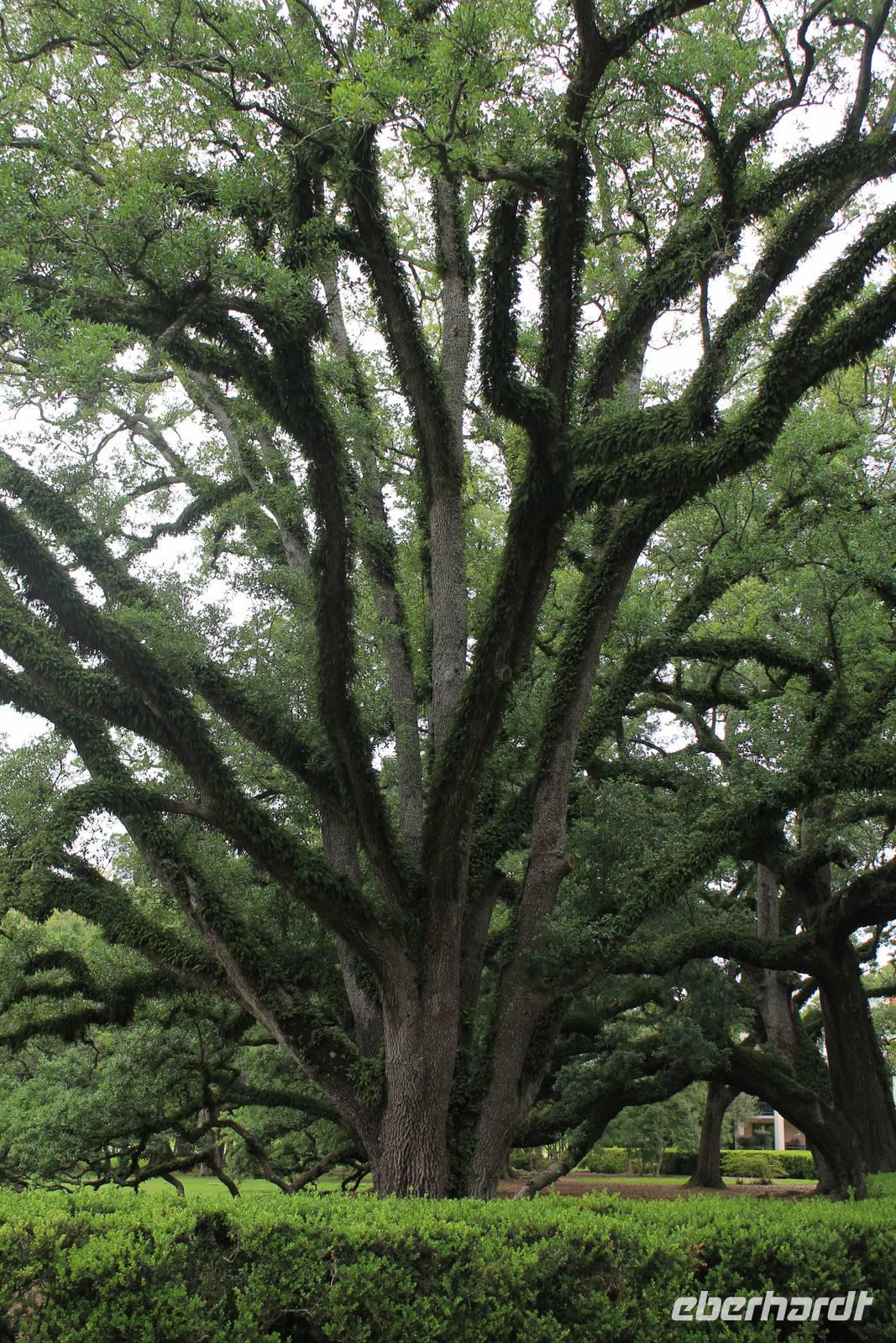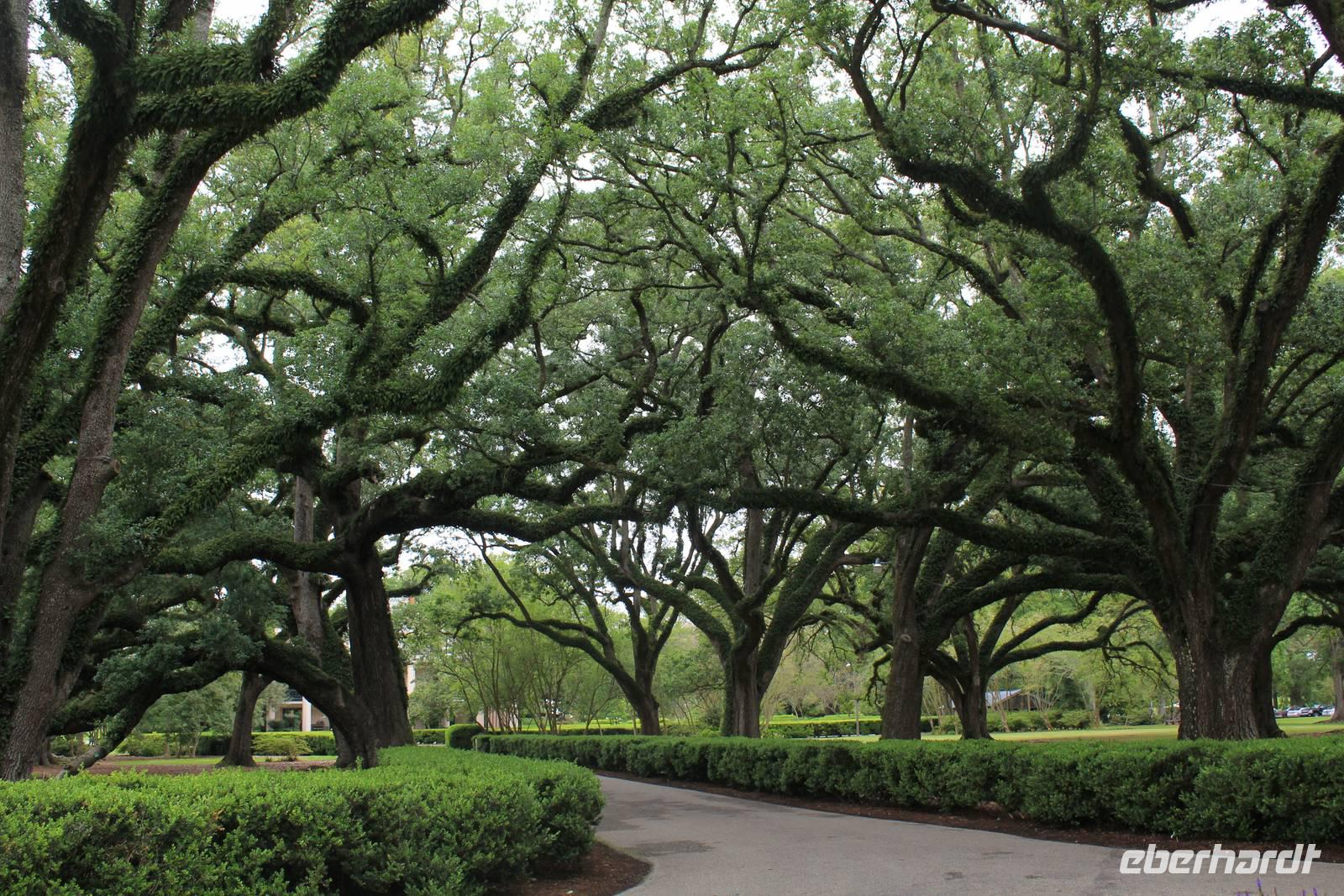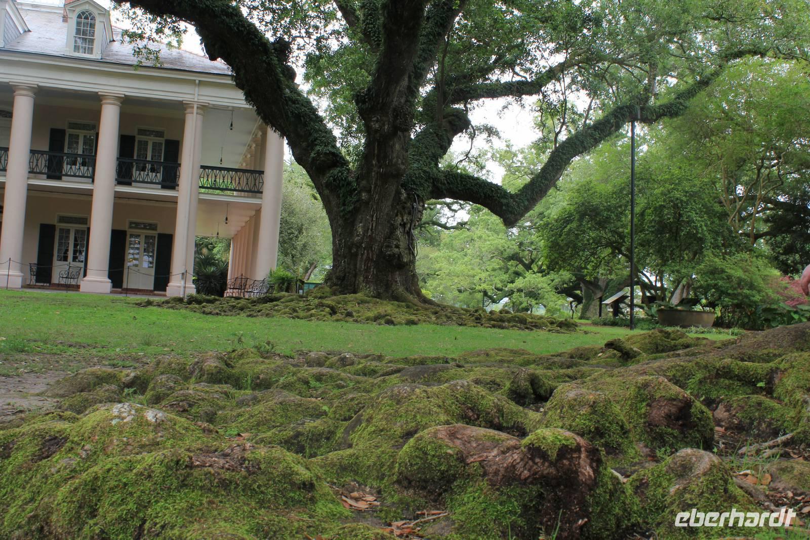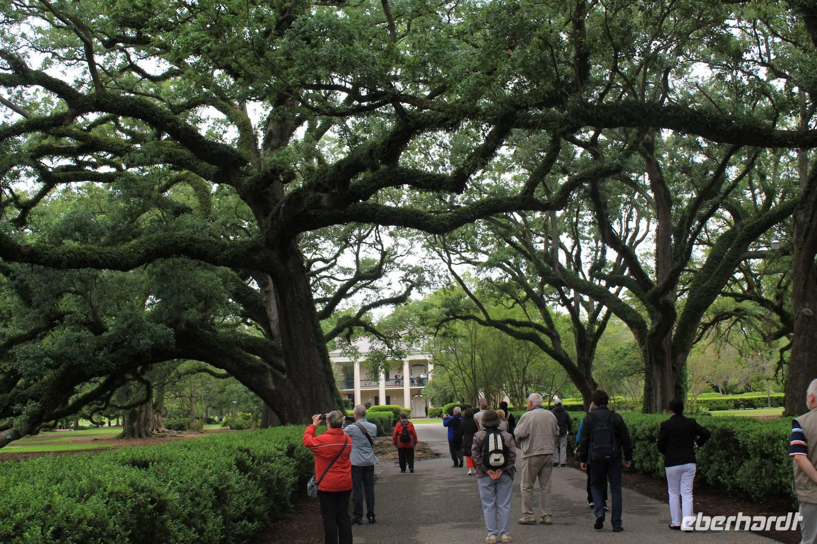 An das Frühstück auf Plastiktellern haben wir uns ja nun langsam gewöhnt - und so auch an das Käse-und Wurstbuffet von Elisa, was wir auch am heutigen Morgen wieder vorfinden. Bei etwas trübem Wetter verlassen wir New Orleans und machen uns auf zur berühmten Oak Alley Plantage. Nach circa 1,5 Stunden erreichen wir das aus so manchen Südstaaten-Filmen bekannte Anwesen. Hauptattraktion ist die 240-Meter lange Allee mit den im frühen 18. Jh. gepflanzten Eichbäumen, die den Mississippi mit dem 1837/38 erbauten Herrenhaus verbindet. Die ersten Besitzer der einstigen Zuckerrohrplantage waren Jacques und Celina Roman und heutzutage versinnbildlicht die Plantage nicht nur das Zeitalter der schmerzlichen Sklaverei, sondern auch eine Zeit in der die Liebe zu einem Grundbesitz und zu der Familie eine außerordentliche Rolle spielte. Bei unserer interessanten Führung durch das im spätgriechischen Stil erbaute Haus, das von 28 Säulen umringt ist, erfahren wir so manch wissenswertes Detail über den Werdegang der historischen Plantage. Nach dem Tod von Jacques Roman im Jahr 1848 führte Celina Roman die Plantage für 11 Jahre - leider erfolglos. Auch Sohn Henri konnte das Blatt nicht wenden und so wurde die Oak Alley Plantage im Jahr 1866 an seine Gläubiger überschrieben. In den folgenden Jahren wechselten die Besitzer des Öfteren, bevor die Familie Stewart im Jahr 1925 das Anwesen für 50.000 Dollar kaufte und noch einmal 60.000 Dollar in die Renovierung des verfallenen Hauses steckte. Mrs. Stewart gründete kurz vor Ihrem Tod im Jahre 1972 die „Oak Alley Stiftung" zum Erhalt der Kultur und der Geschichte der Plantage. Das Herzstück sind wahrlich die 28 stattlichen Lebenseichen, die einst von einem unbekannten französischen Siedler in 2 Reihen gepflanzt wurden.