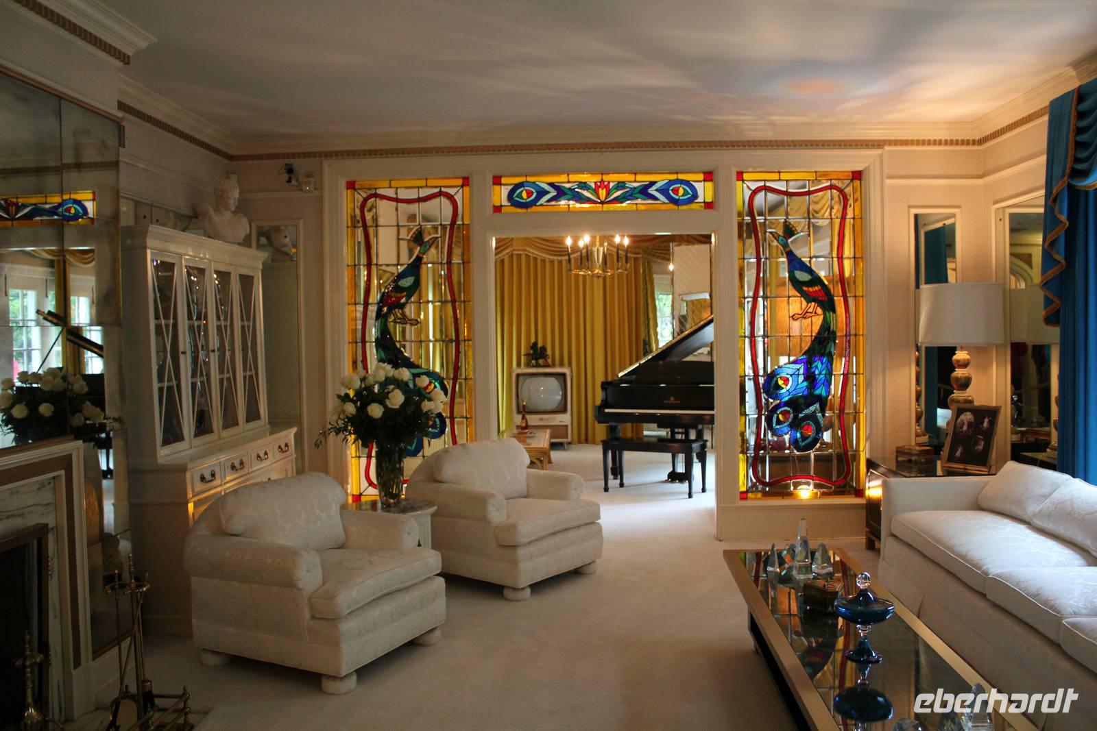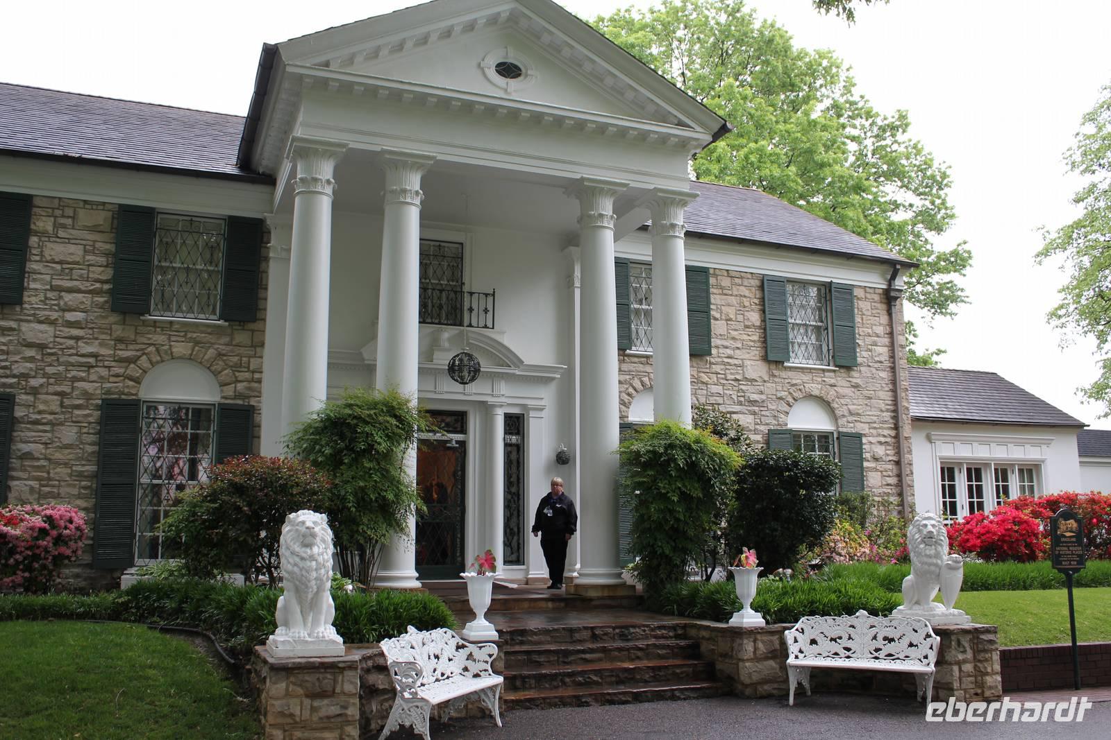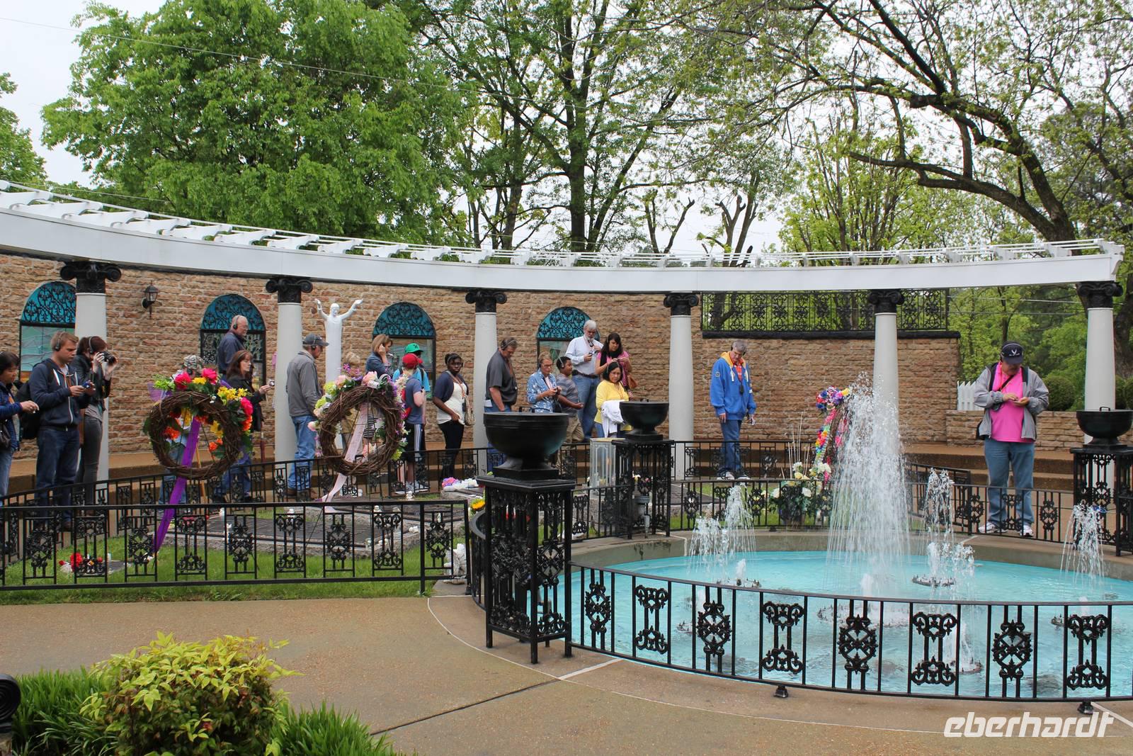 Bereits heute Nacht haben wir den Groll des Himmels (über unsere Essensmengen kann es jedenfalls nicht sein, wir tun unser Bestes!) gespürt, die Regentropfen trommelten an die Scheibe und der Gewitterdonner dröhnte über Memphis. So treten wir alle regensicher ausgestattet den Tag an und wollen zunächst das Wohnhaus von Weltstar & König des Rock' n Roll Elvis Presley besuchen - Graceland! Aus der ganzen Welt pilgern jährlich ca. 600.000 Besucher hierher um zu sehen wir Elvis lebte und wo er begraben ist. Mit einem Shuttle Bus fahren wir auf die andere Straßenseite des Elvis Presley Boulevard und bekommen Kopfhörer, die uns in deutscher Sprache über das Anwesen führen. Elvis gestaltete das 1939 erbaute Gebäude nach seinen Vorlieben um und so findet man heute diverse verrückt gestaltete Räume wieder: das Billardzimmer ist komplett mit Vorhängen ausgekleidet, im Fernsehzimmer findet man Spiegel an der Decke und nicht unerwähnt bleiben darf das Dschungel-Zimmer, das sich durch grünen Teppich auf dem Boden und an der Decke, einem Springbrunnen und extravagant geschnitzten Holzsesseln auszeichnet. In dem Trophy-Raum und dem Raquethall werden viele Erinnerungsstücke seines immensen Erfolges präsentiert, wie z.B. seine goldenen Schallplatten und Auszeichnungstrophäen. Im Garten erreicht man schließlich seine letzte Ruhestätte, wo er neben seinen Eltern, seinem Bruder und seiner Großmutter bestattet wurde. Elvis Presley starb am 16. August 1977 im zarten Alter von nur 42 Jahren an einer Medikamentenvergiftung in seiner Villa. Nach dieser tollen Tour, die auf eine überaus anschauliche Art und Weise, mit regelmäßiger musikalischer Untermalung, das Leben, die Wohltätigkeit und den Erfolg des Musikers zeigt, geht es zurück zum Besucherzentrum. Hier lassen wir es uns nicht nehmen in den vielen Souvenirgeschäften ein paar Erinnerungsstücke zu erstehen.