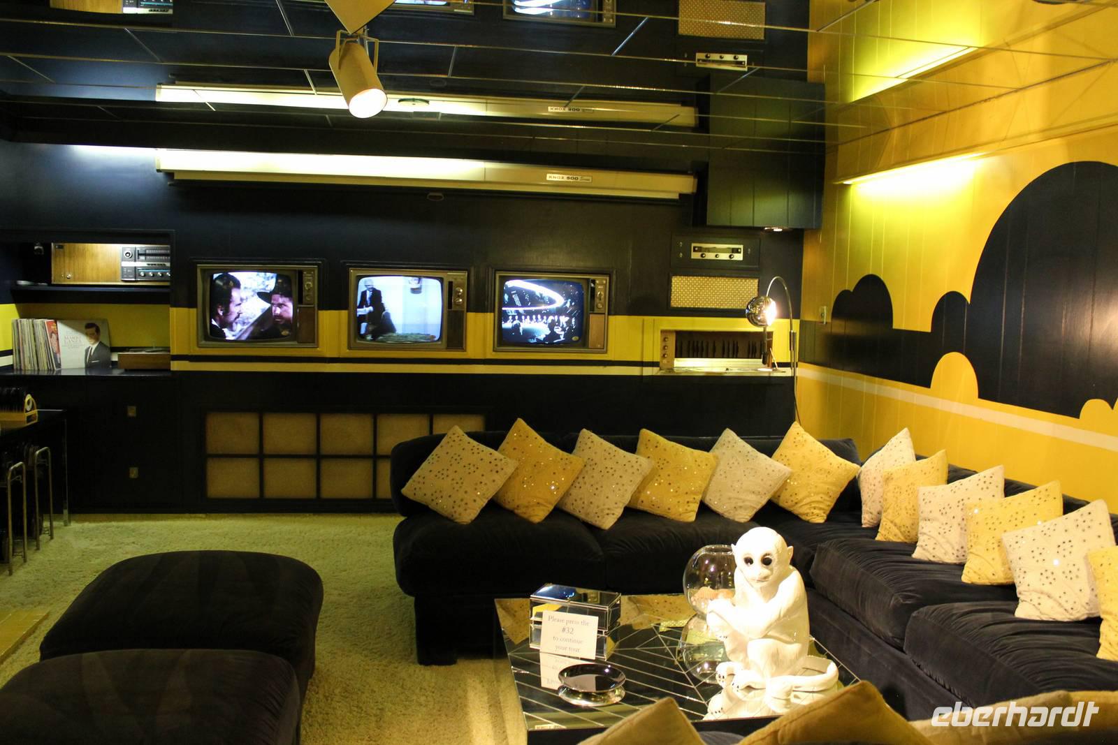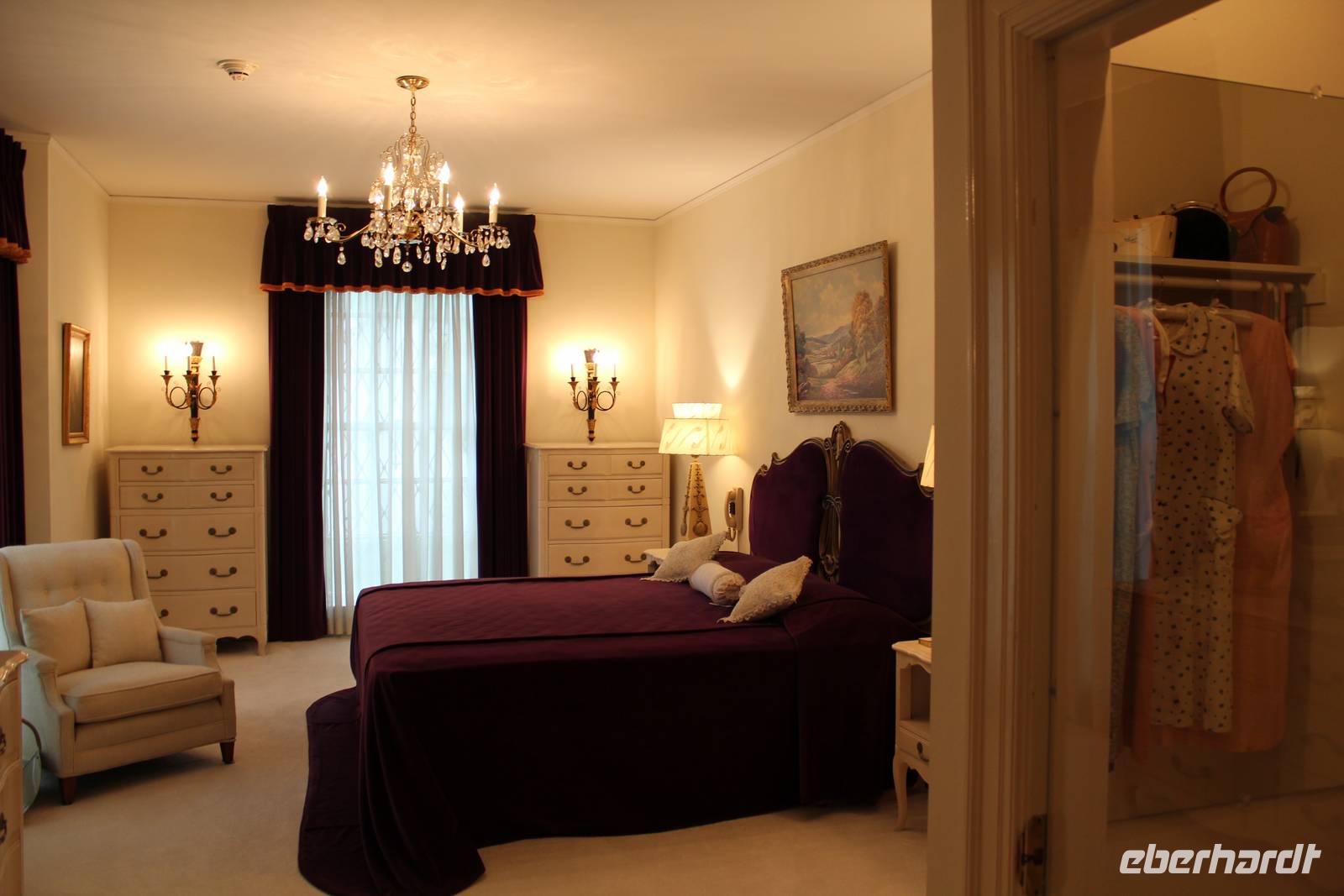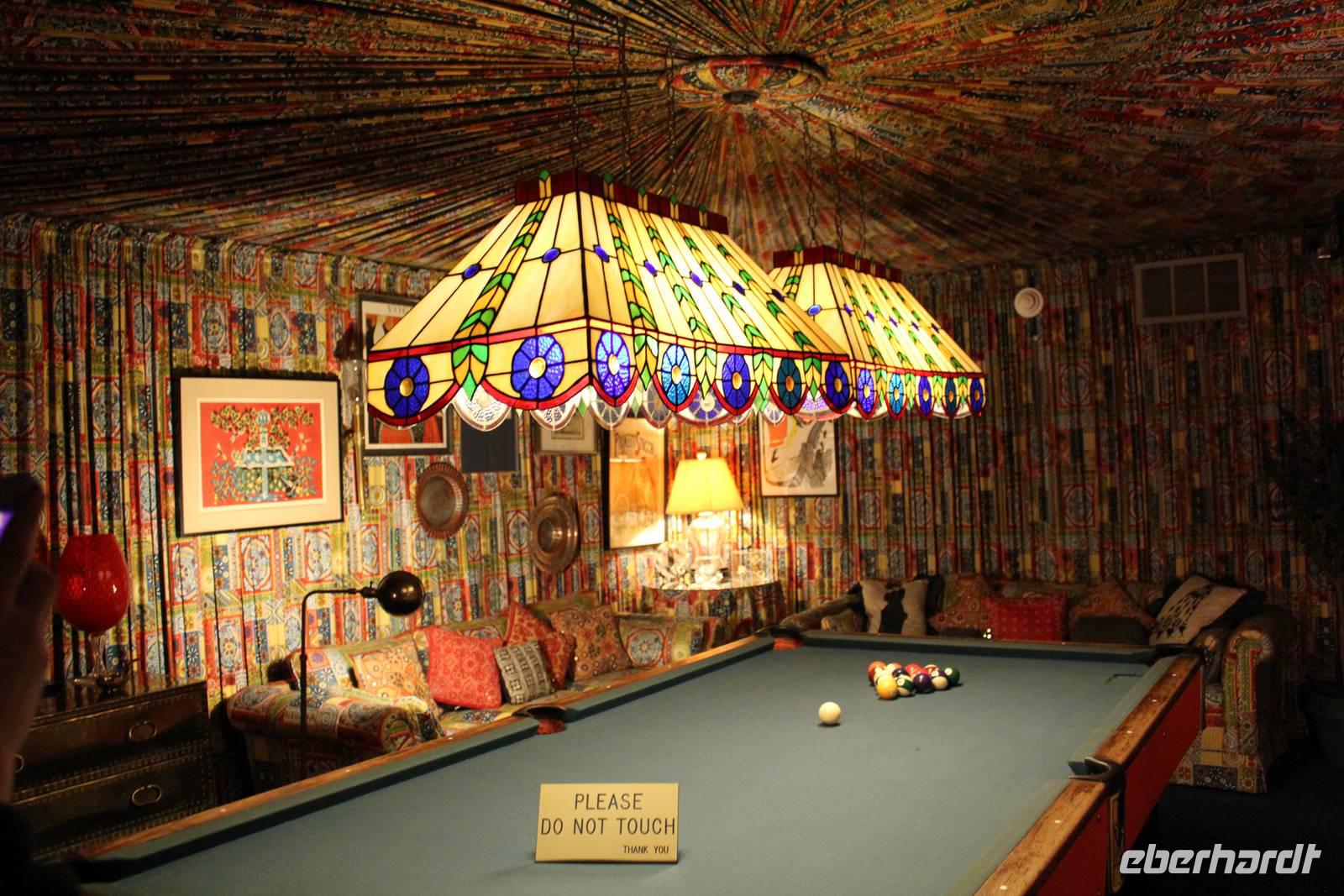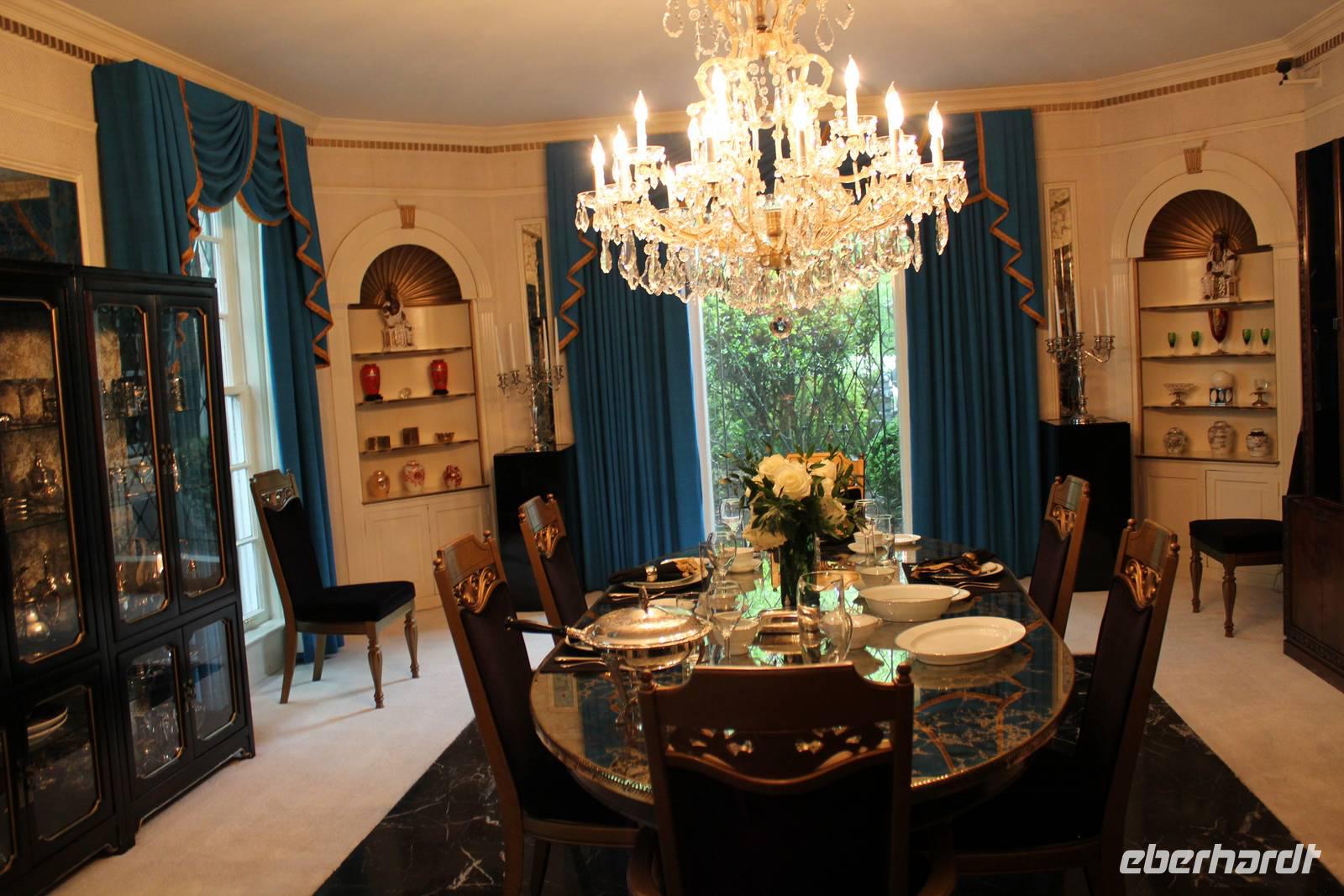 Bereits heute Nacht haben wir den Groll des Himmels (über unsere Essensmengen kann es jedenfalls nicht sein, wir tun unser Bestes!) gespürt, die Regentropfen trommelten an die Scheibe und der Gewitterdonner dröhnte über Memphis. So treten wir alle regensicher ausgestattet den Tag an und wollen zunächst das Wohnhaus von Weltstar & König des Rock' n Roll Elvis Presley besuchen - Graceland! Aus der ganzen Welt pilgern jährlich ca. 600.000 Besucher hierher um zu sehen wir Elvis lebte und wo er begraben ist. Mit einem Shuttle Bus fahren wir auf die andere Straßenseite des Elvis Presley Boulevard und bekommen Kopfhörer, die uns in deutscher Sprache über das Anwesen führen. Elvis gestaltete das 1939 erbaute Gebäude nach seinen Vorlieben um und so findet man heute diverse verrückt gestaltete Räume wieder: das Billardzimmer ist komplett mit Vorhängen ausgekleidet, im Fernsehzimmer findet man Spiegel an der Decke und nicht unerwähnt bleiben darf das Dschungel-Zimmer, das sich durch grünen Teppich auf dem Boden und an der Decke, einem Springbrunnen und extravagant geschnitzten Holzsesseln auszeichnet. In dem Trophy-Raum und dem Raquethall werden viele Erinnerungsstücke seines immensen Erfolges präsentiert, wie z.B. seine goldenen Schallplatten und Auszeichnungstrophäen. Im Garten erreicht man schließlich seine letzte Ruhestätte, wo er neben seinen Eltern, seinem Bruder und seiner Großmutter bestattet wurde. Elvis Presley starb am 16. August 1977 im zarten Alter von nur 42 Jahren an einer Medikamentenvergiftung in seiner Villa. Nach dieser tollen Tour, die auf eine überaus anschauliche Art und Weise, mit regelmäßiger musikalischer Untermalung, das Leben, die Wohltätigkeit und den Erfolg des Musikers zeigt, geht es zurück zum Besucherzentrum. Hier lassen wir es uns nicht nehmen in den vielen Souvenirgeschäften ein paar Erinnerungsstücke zu erstehen.