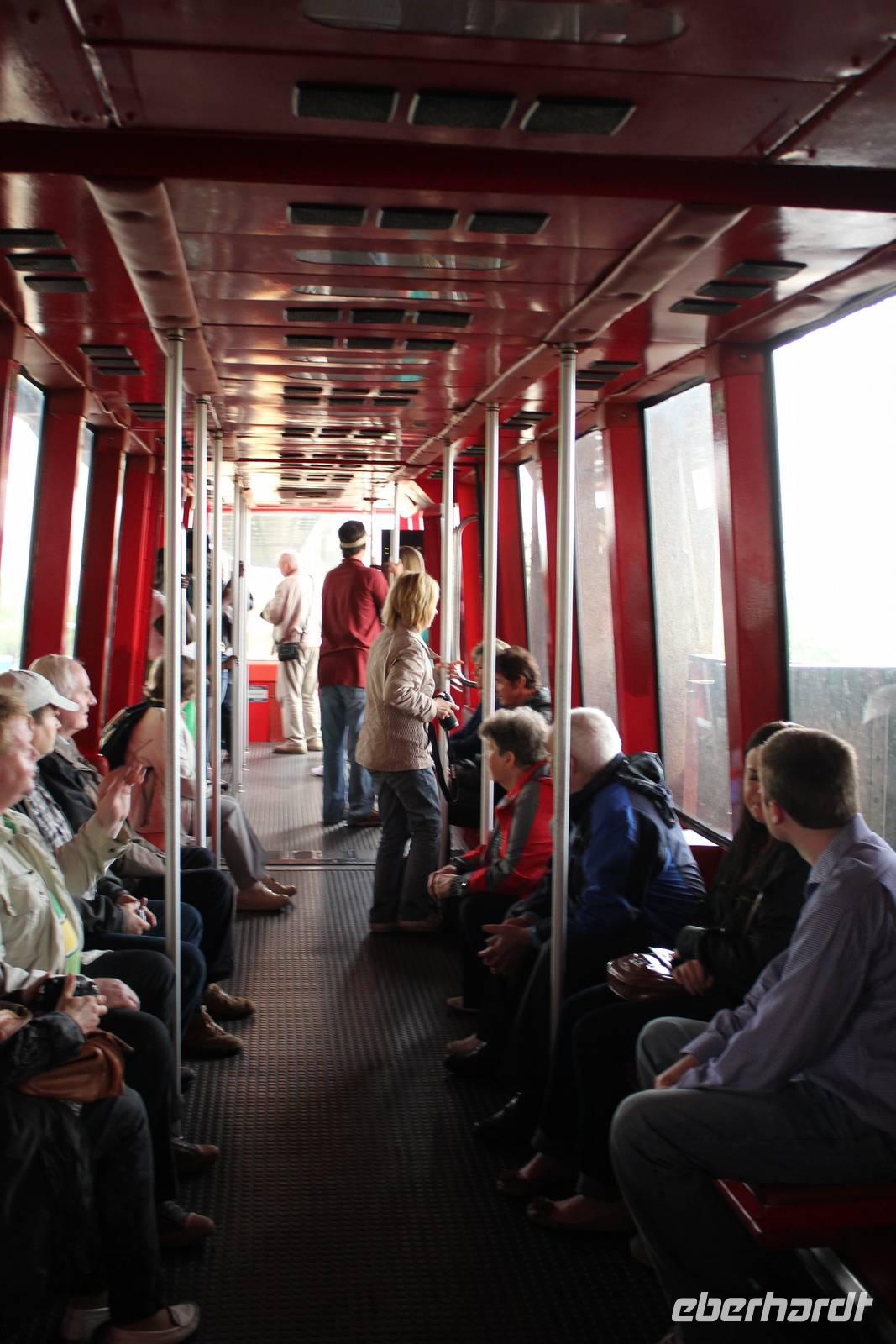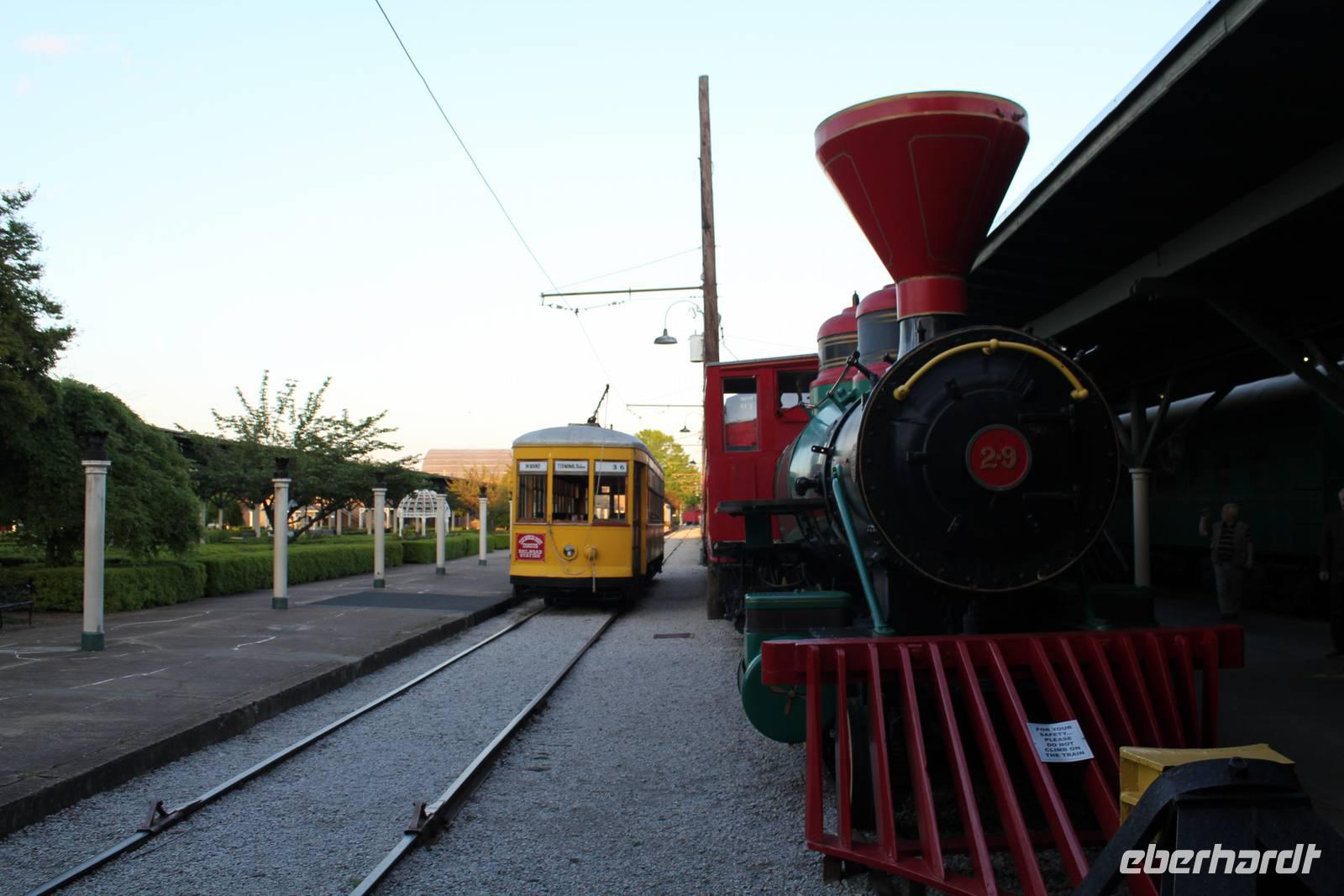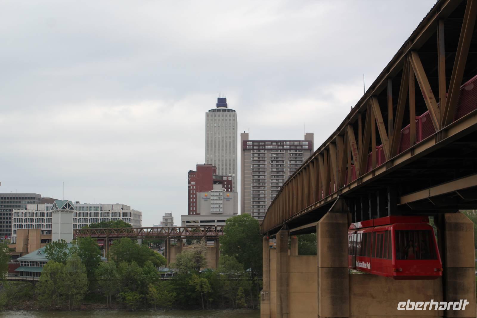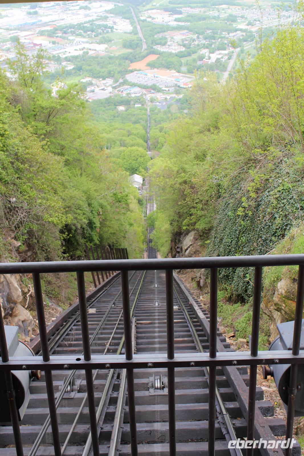 Weiter geht unsere Fahrt durch das Hinterland von Tennessee und es wird immer hügeliger, ja sogar bergiger kann man hier fast sagen. Unser Bus schraubt sich in Serpentinen nach oben und wir blicken hinab auf grüne Wälder und Täler. In dieser wunderschönen Landschaft müssen wir nun auch eine Stunde zurück lassen und stellen unsere Uhren eine Stunde vor. Unser nächstes Ziel ist der Lookout Mountain bei Chattanooga. Auf diesen führt eine Standseilbahn, die Incline Railway, die es in sich hat: es handelt sich um die steilste Seilbahn der Welt, mit einer maximalen Steigung von 72,7%! In ca. 10 Minuten geht es über 1,6 km nach oben. Von hier bietet sich uns ein herrlicher Ausblick auf das umliegende Tal, den gewaltigen Tennessee River und das Städtchen Chattanooga. Gäbe es eine schönere Stelle als nun ENDLICH die vor ein paar Stunden noch schmerzlich vermisste Jack Daniels Verkostung nachzuholen? . Matt & Elisa zaubern eine Flasche hervor und wenig später stoßen wir hier oben auf dem Lookout Mountain auf unsere aufregende Reise, unsere tolle Reisegruppe und vor allem auf Mr. Jack Daniel an! Mhh, das flüssige Gold rinnt unsere Kehlen hinab und fühlt sich herrlich warm im Bauch an! Die anschließende Abfahrt mit der Standseilbahn wird gleich noch etwas aufregender! Unsere Erkundungen gehen weiter und so besichtigen wir als nächstes die Höhlen des Lookout Mountain mit dem unterirdischen Wasserfall Ruby Falls. Leo Lambert aus Indiana entdeckte den gigantischen Wasserfall 1940 zufällig. In 300 Metern Tiefe wandeln wir durch die futuristisch aussehenden Höhlengänge und begegnen fantasiereichen Formationen wir einem Kaktus, einer Elefantenfuß, aber auch Kartoffelchips und Speck! Unser Weg ist gesäumt von beeindruckenden Stalaktiten und Stalagmiten, bevor wir schließlich den 44 Meter hohen Wasserfall erreichen, den Lambert nach seiner Frau Ruby benannte. Das Spektakel unserer Bewunderung wird mit Lichteffekten und dramatischer Musik in Szene gesetzt - typisch amerikanisch eben. Beeindruckend ist es allemal, wie die Wassermassen in die Tiefe stürzen, ungeklärt von wo sie kommen mögen, und sich ihren Weg in den Tennessee River bahnen. Zurück geht es an die Erdoberfläche und nach einem eindrucksvollen langen Tag freuen wir uns nun auf unser Hotel: das Chattanooga Choo Choo! Der einstige Bahnhof verdankt seine Berühmtheit dem Bandleader Glenn Miller, der das Gebäude mit seinem Hit von 1941 „Pardon me, boys, ist hat the Chattanooga Choo Choo?" unsterblich machte. Das Bahnhofsgebäude ist im Jahre 1909 im viktorianischen Stil erbaut wurden und beeindruckend ist nicht nur die fantastische Bahnhofshalle/ Lobby, sondern auch das wunderschön gestaltete Garden Restaurant sowie die sich auf dem Gelände befindenden historischen Züge, die es zu bestaunen gilt. Wir lassen uns das Abendessen in tollem Ambiente munden, bevor wir morgen als frühe Vögel Würmer fangen wollen (bzw. nach Atlanta aufbrechen). (290 km)