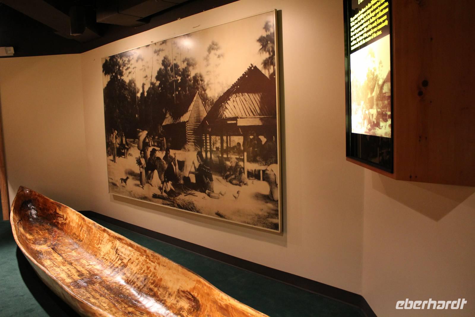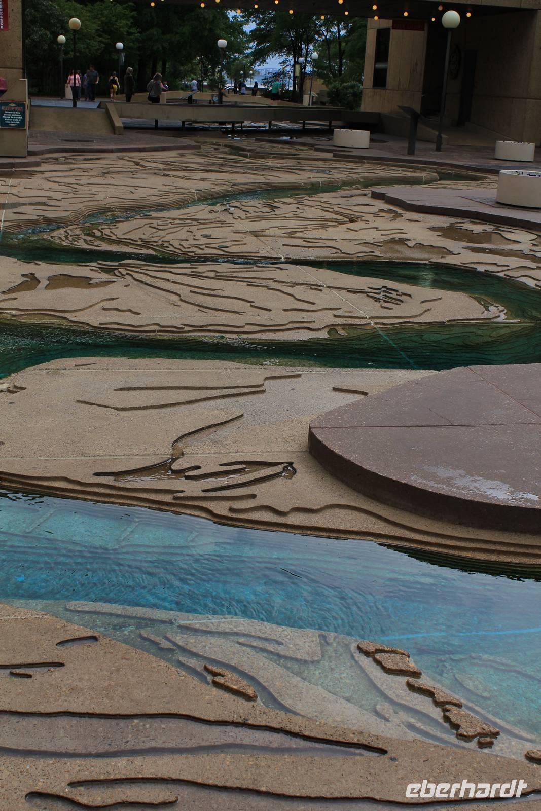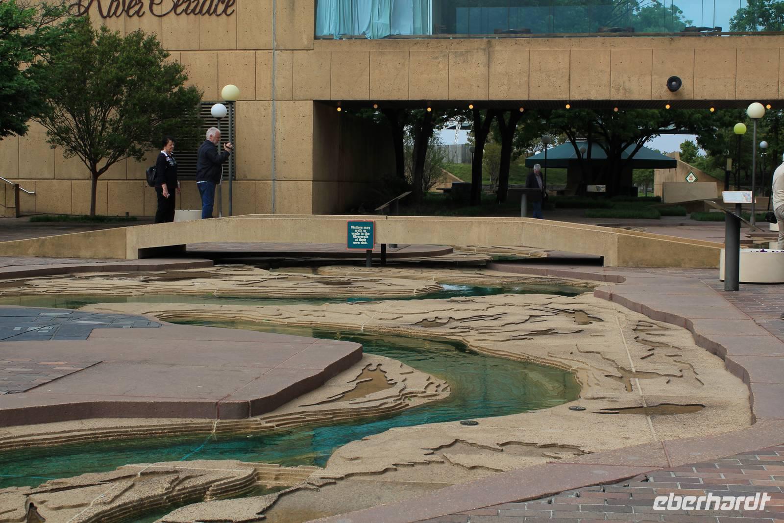 Um unsere Mittagspause zu verbringen und auch um dem einen oder anderen Shoppingwunsch entgegenzukommen, besuchen wir nun eine Shoppingmall. Leckere Snacks und tolle Geschäfte lassen die Zeit viel zu schnell vergehen. Doch wir wollen heute noch mehr erleben und so geht die kurze Fahrt ans Ufer des Mississippi, von wo aus wir mit dem roten Monorail von der Innenstadt zur Mud-Island („Schlamminsel") fahren. Von der künstlichen Insel mitten im Mississippi haben wir einen tollen Ausblick auf Downtown Memphis. Auch besuchen wir das Mississippi-Museum, das in sehr ausführlicher Weise über die Entwicklung, Nutzung, den Segen & Fluch des Flusses für die Menschen berichtet. Mit viel Liebe zum Detail wurden ganze Schiffsteile der einstigen Dampfschiffe nachgebaut und ausführlichst wird über die Kriege, die musikalischen Einflüsse und über vieles mehr vergangener Zeiten berichtet. Matt übersetzt uns alles eifrig und mehr und mehr verstehen wir die Liebe und hohe Bedeutung des Mississippi für die Menschen der 10 Bundesstaaten durch die er fliest. Hauptattraktion auf Mud Island ist weiterhin ein Model des Flusses, der sogenannte River Walk, denn man kann tatsächlich den gesamten Verlauf des Mississippi „erwandern". Sämtliche Windungen, Zuflüsse, Uferformationen und Städte sind maßstabsgetreu nachgebildet. 1746 Steinplatten wurden für dieses kleine Kunstwerk verarbeitet, in die man die Topographie des Flusses einmeißelte. 1450 km Flussverlauf wurden so auf einer Länge von fast 1 km nachgestellt!