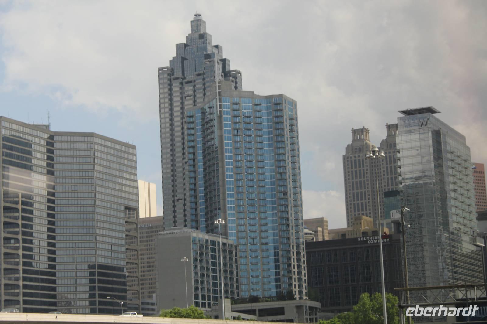 Nach einem kurzen Fotostopp am Eingangsschild des Great Smoky Mountains Nationalpark fahren wir unserer Mittagspause entgegen, die wir im Besucherzentrum des Parks am Oconaluftee Fluss verbringen. Bei strahlendem Sonnenschein genießen wir Sandwiches und Salat, begleitet vom Zwitschern der Vögel und die frische Waldluft einatmend. Hier findet man auch ein kleines Freilicht-Mountain Farm Museum, das anhand alter Gebäude zeigt wie man um 1850 in den abgeschiedenen Great Skmokies lebte. Auch wenn wir es hier noch Stunden aushalten würden müssen wir weiter. Denn gegen 16 Uhr erwartet uns Waltraud zu unserer Stadtführung in der Hauptstadt Georgias - Atlanta. Georgia ist einer der 13 Gründungsstaaten der USA und trägt den Namen des englischen Königs George II. Der wirtschaftlich stärkste Staat der Südstaaten wird auch „The Peach State" genannt, was sich unschwer erkennen lässt: Pfirsiche glänzen auf den Nummernschilder der Autos, auf Werbeplakaten und auf zahlreichen Straßenschilder findet man das Wort „Peach". Natürlich ist der riesige Wirtschafszweig des Pfirsichanbaus für den Stolz verantwortlich. Aber auch generell ist besonders Atlanta eine namenhafte Wirtschaftshochburg: mehr als 500 international operierende Unternehmen haben hier ihren Sitz. Neben Coca Cola und CNN findet man in der 500.000 Einwohner Stadt außerdem noch den Sitz von Delta Air Lines oder auch der Telekommunikationsfirma AT&T. Stadtführerin Waltraud nimmt uns nun mit auf eine interessante Tour. Zuerst fahren wir durch Downtown, das wirtschaftliche Zentrum der im Jahr 1837 als Eisenbahnknotenpunkt gegründeten Stadt. Wir folgen der Peachtree Street, einer Hauptmagistrale die die Stadt komplett durchquert. Vorbei am schönen historischen Gebäude des Fox-Theaters, passieren wir das einstige Wohnhaus von Margaret Mitchell, der Autorin des weltberühmten Buches „vom Winde verweht". Es geht durch Midtown, wo sich vor allem die kulturellen Zentren, wie das Goethe Institut und namenhafte Theater und Museen angesiedelt haben.