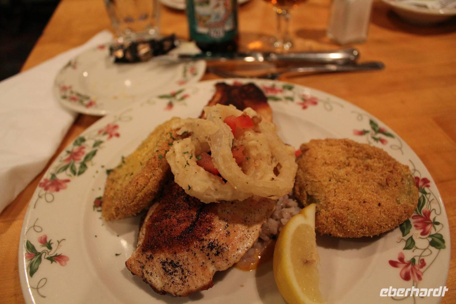 Nach so viel Busfahren heute sind wir doch etwas geschafft, nutzen die kleine Pause in unserem Hotel direkt in der Innenstadt, bevor nur wenige Minuten zu unserem Abendessen im Restaurant „Pittypat's Porch" spazieren. Nicht nur köstliche Rippchen und Hühnchen gibt es heute, sondern auch noch einmal lecker gegrillten Lachs! Mmhh... (632 km)