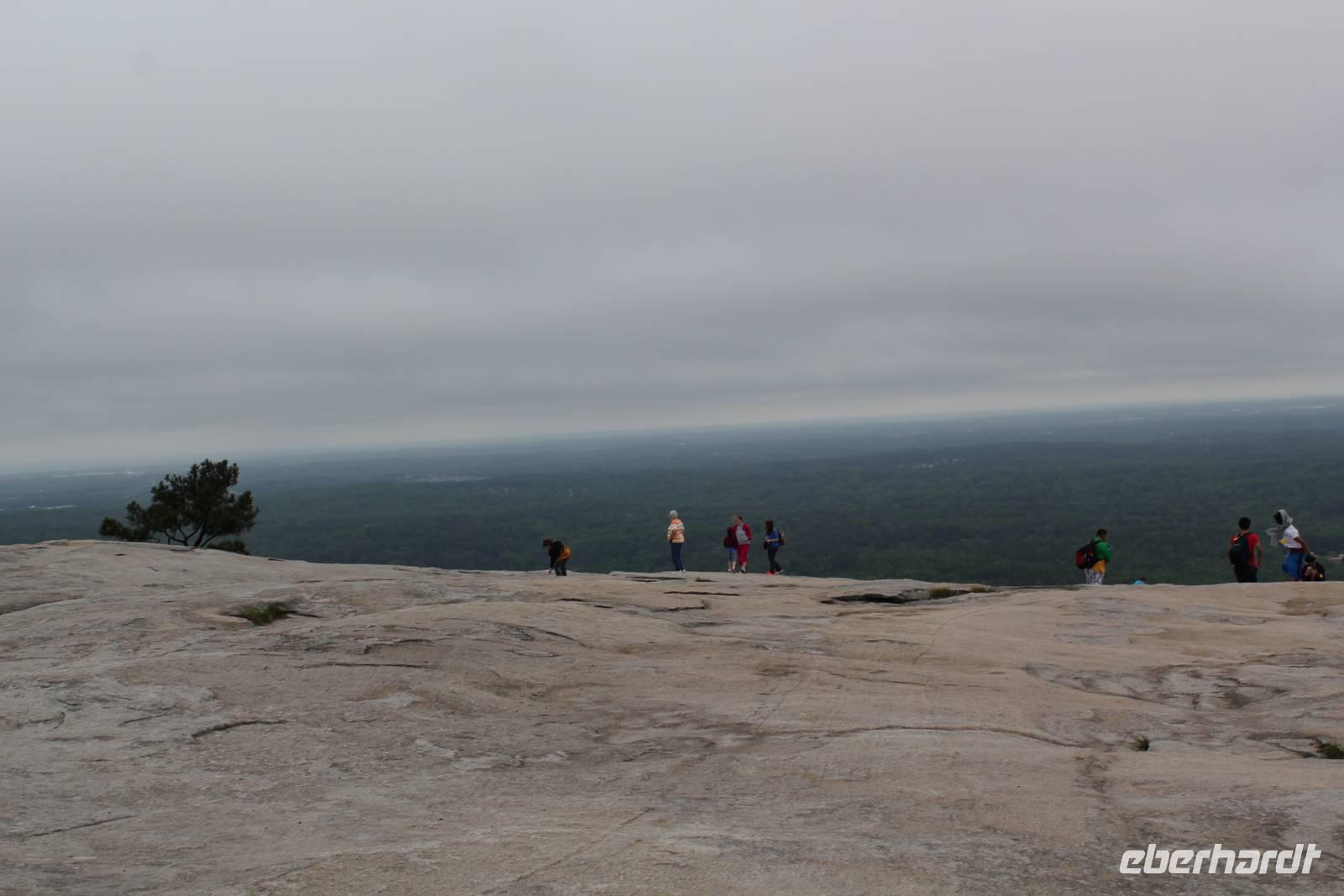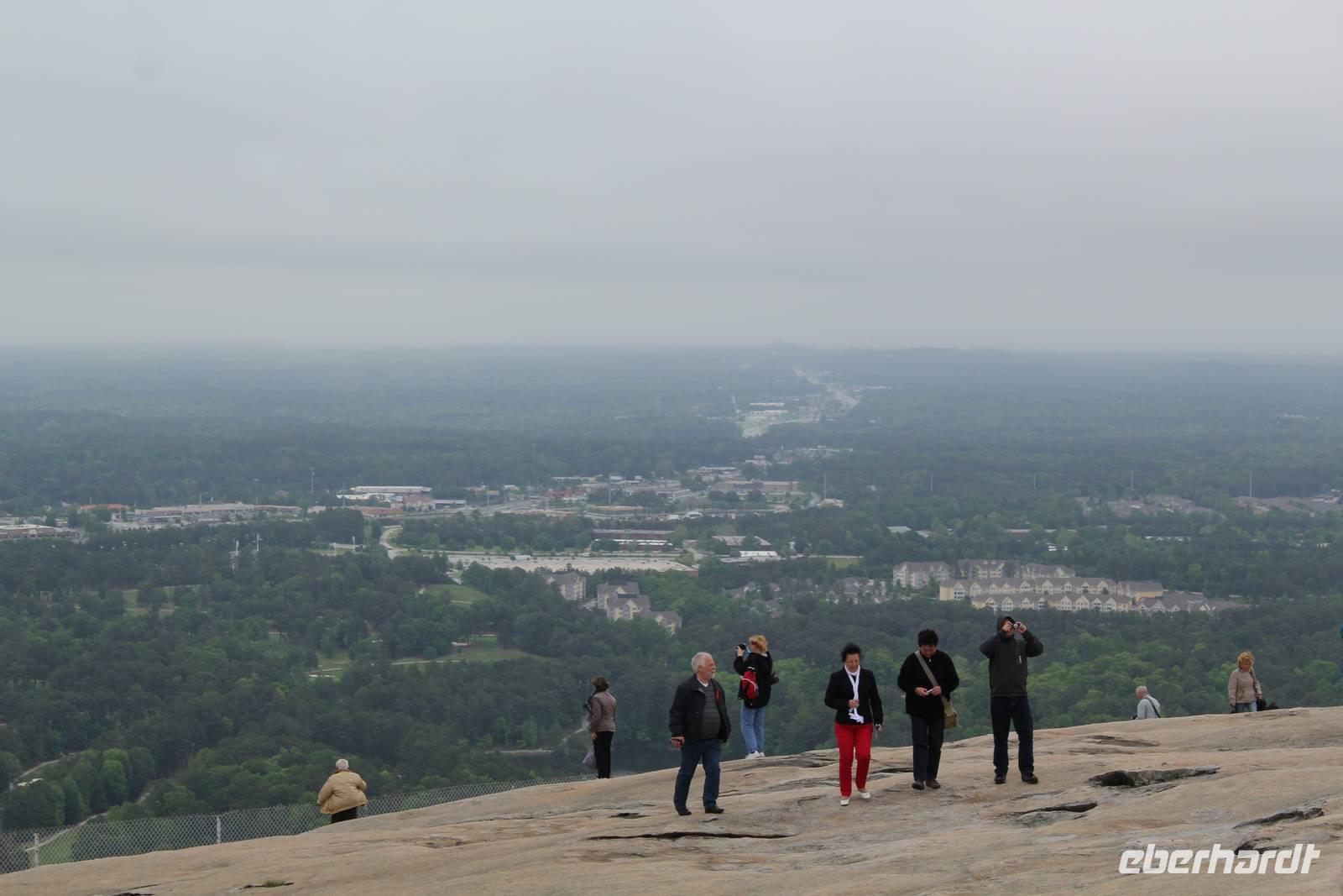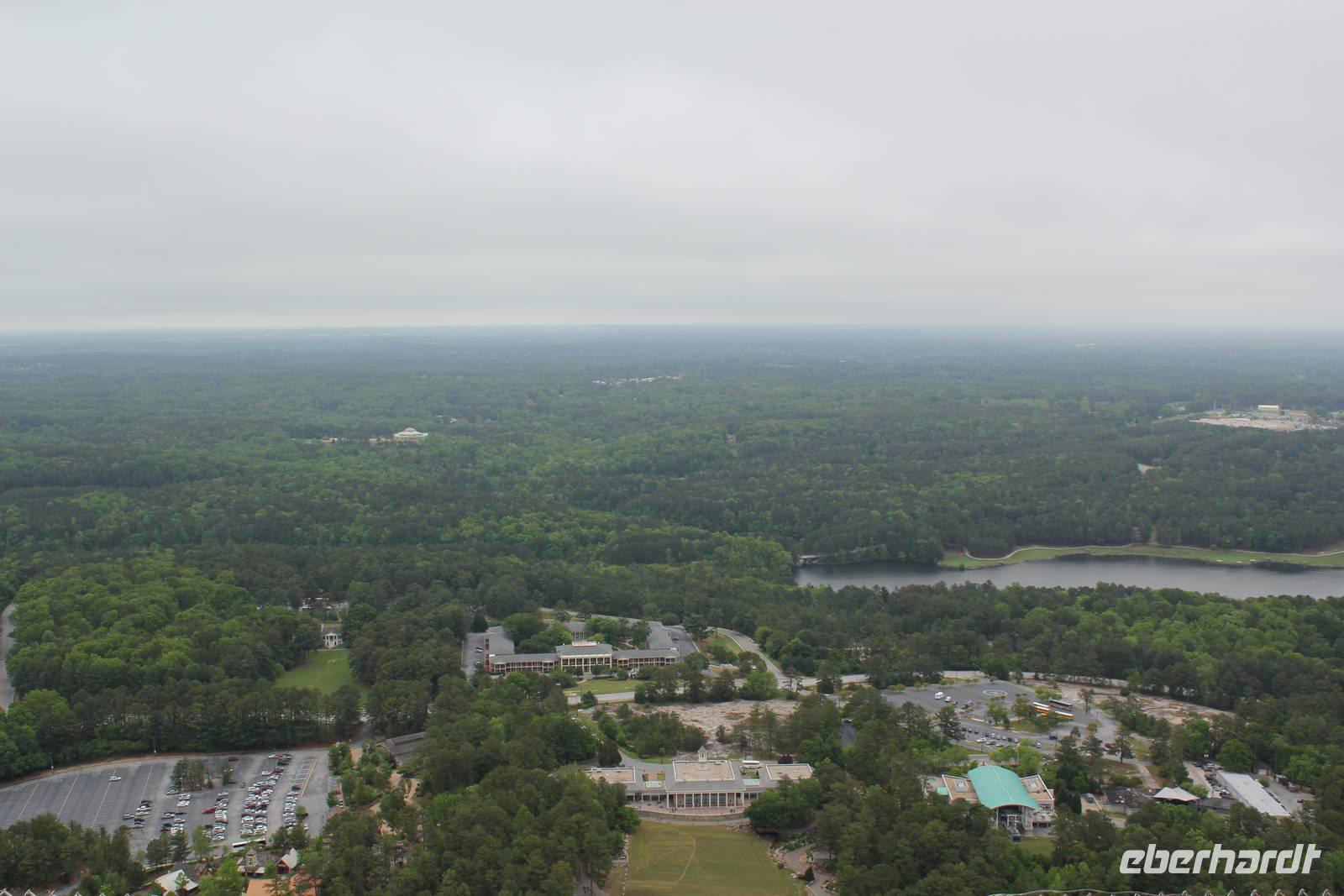 Mit vollen Bäuchen packen wir ein letztes Mal unsere Koffer in den Bus und machen uns auf zu einem zusätzlichen Programmpunkt den uns Matt für heute vorgeschlagen hat. Wir besuchen den Stone Mountain Park, eine Gedenkstätte für die im Bürgerkrieg gefallenen Südstaatler in Form eines idyllischen grünen Parks, durchzogen mit Teichen und Wanderwegen. Das Herz des Geländes ist der 236 Meter hohe, größte Granitmonolith der Welt. Ein riesiger „Stein" mitten in der dichten Waldlandschaft, als wäre er mit aller Gewalt vom Himmel gefallen! An der Ostflanke des „Ayers Rock in Atlanta" wurde zwischen 1923 und 1970 ein 1.600 m2 großes Reiterrelief herausgemeißelt - das größte der Welt! Es zeigt die 3 Anführer der Konföderierten und bietet uns trotz dichter Wolken ein tolles Fotomotiv. Mit einer Seilbahn fahren wir auf den Steinberg hinauf und genießen bei ordentlichem Wind einen Blick über die Weite Georgias. Sogar die Skyline Atlantas ist in der Ferne zu sehen.