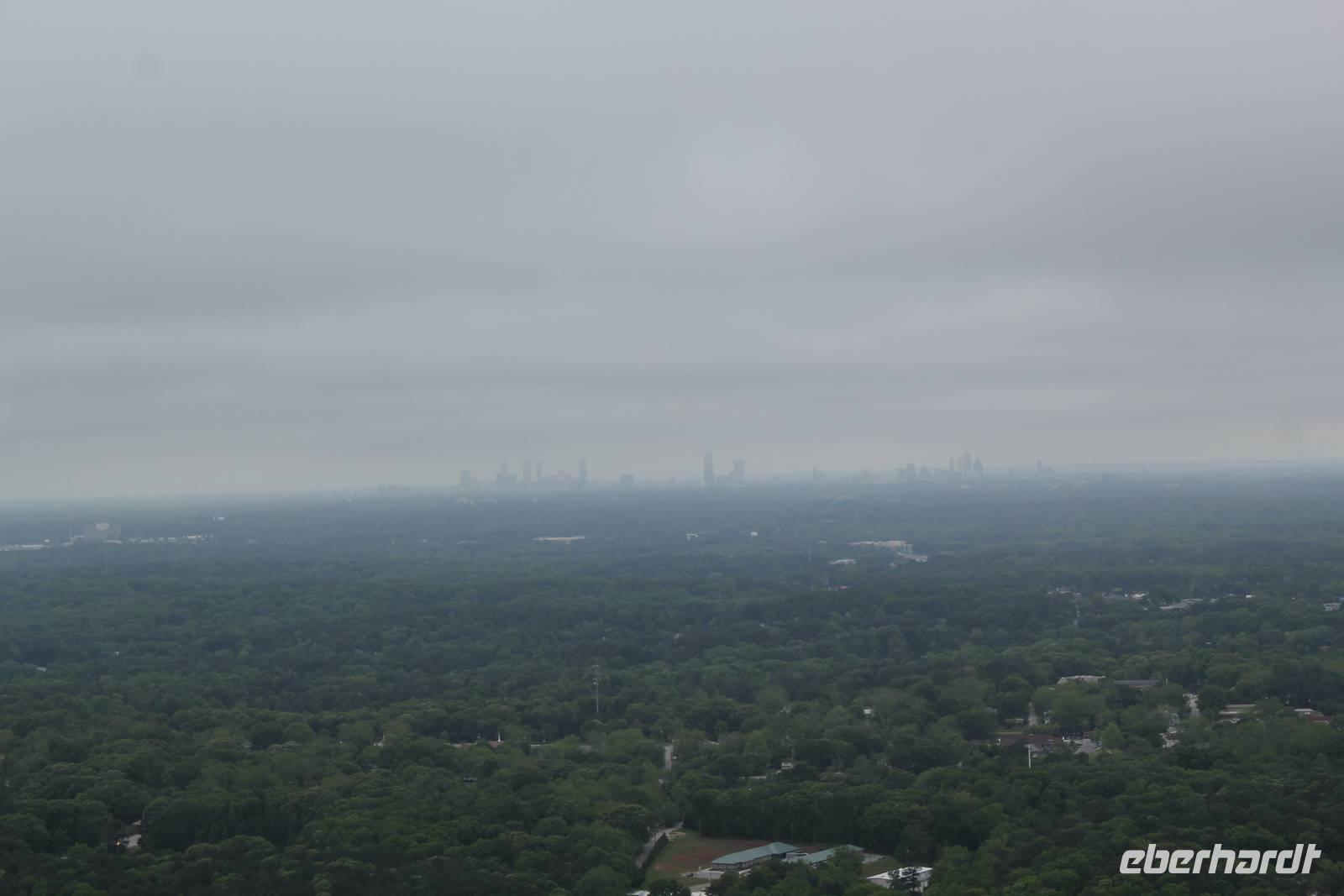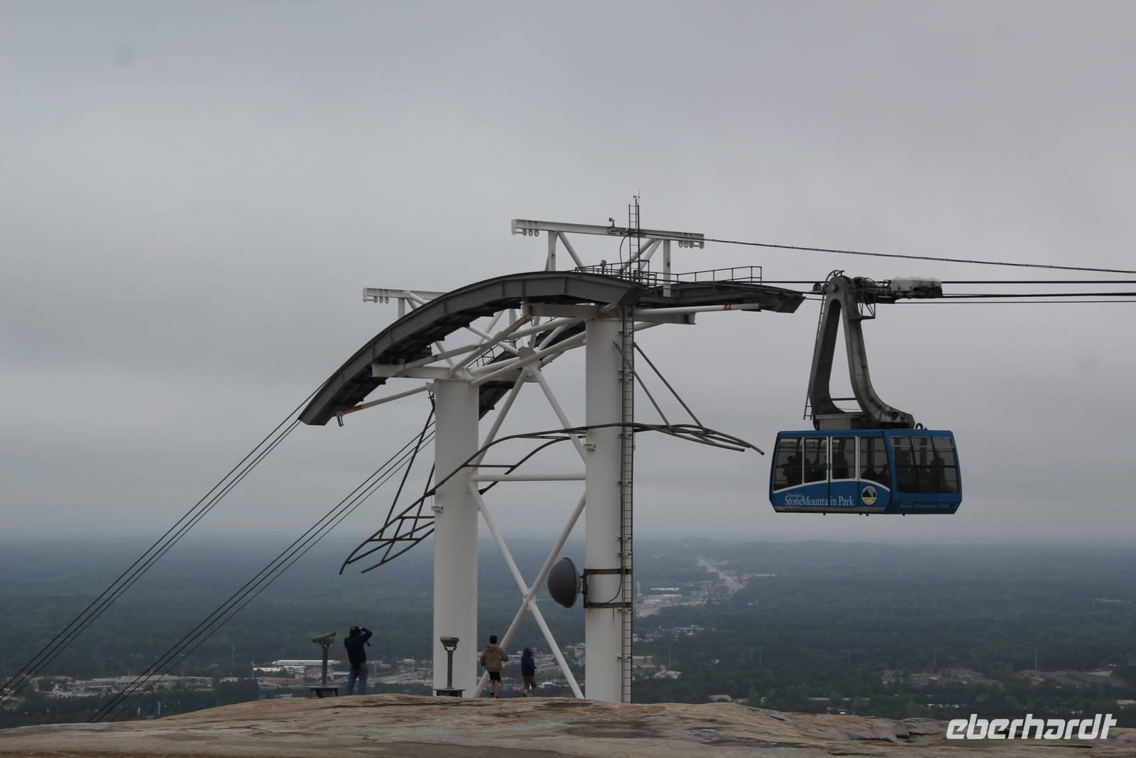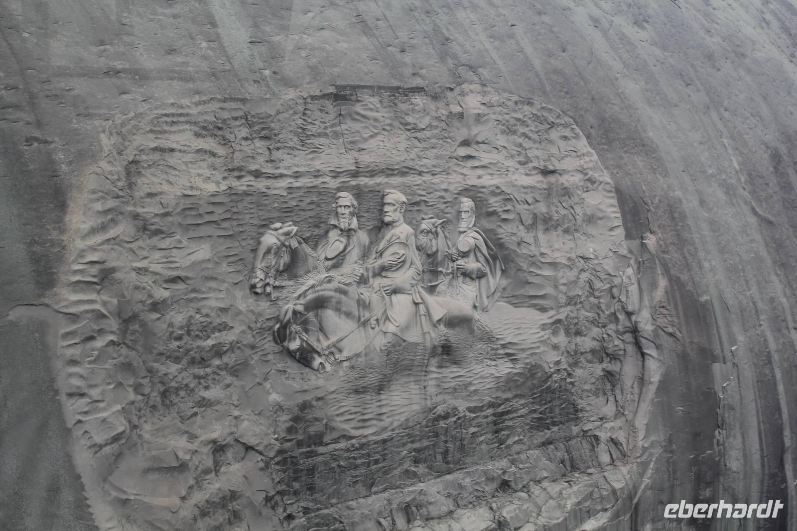 Mit vollen Bäuchen packen wir ein letztes Mal unsere Koffer in den Bus und machen uns auf zu einem zusätzlichen Programmpunkt den uns Matt für heute vorgeschlagen hat. Wir besuchen den Stone Mountain Park, eine Gedenkstätte für die im Bürgerkrieg gefallenen Südstaatler in Form eines idyllischen grünen Parks, durchzogen mit Teichen und Wanderwegen. Das Herz des Geländes ist der 236 Meter hohe, größte Granitmonolith der Welt. Ein riesiger „Stein" mitten in der dichten Waldlandschaft, als wäre er mit aller Gewalt vom Himmel gefallen! An der Ostflanke des „Ayers Rock in Atlanta" wurde zwischen 1923 und 1970 ein 1.600 m2 großes Reiterrelief herausgemeißelt - das größte der Welt! Es zeigt die 3 Anführer der Konföderierten und bietet uns trotz dichter Wolken ein tolles Fotomotiv. Mit einer Seilbahn fahren wir auf den Steinberg hinauf und genießen bei ordentlichem Wind einen Blick über die Weite Georgias. Sogar die Skyline Atlantas ist in der Ferne zu sehen.