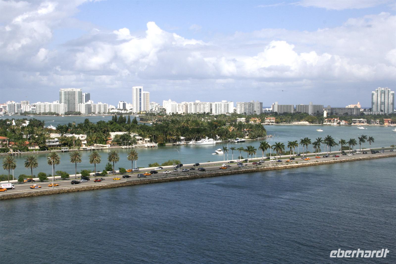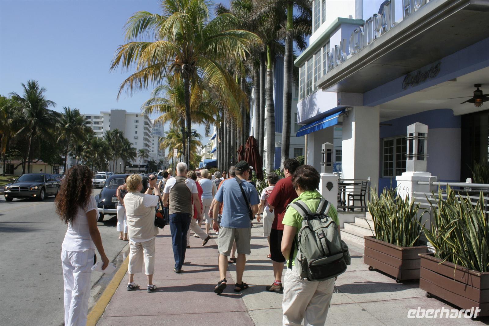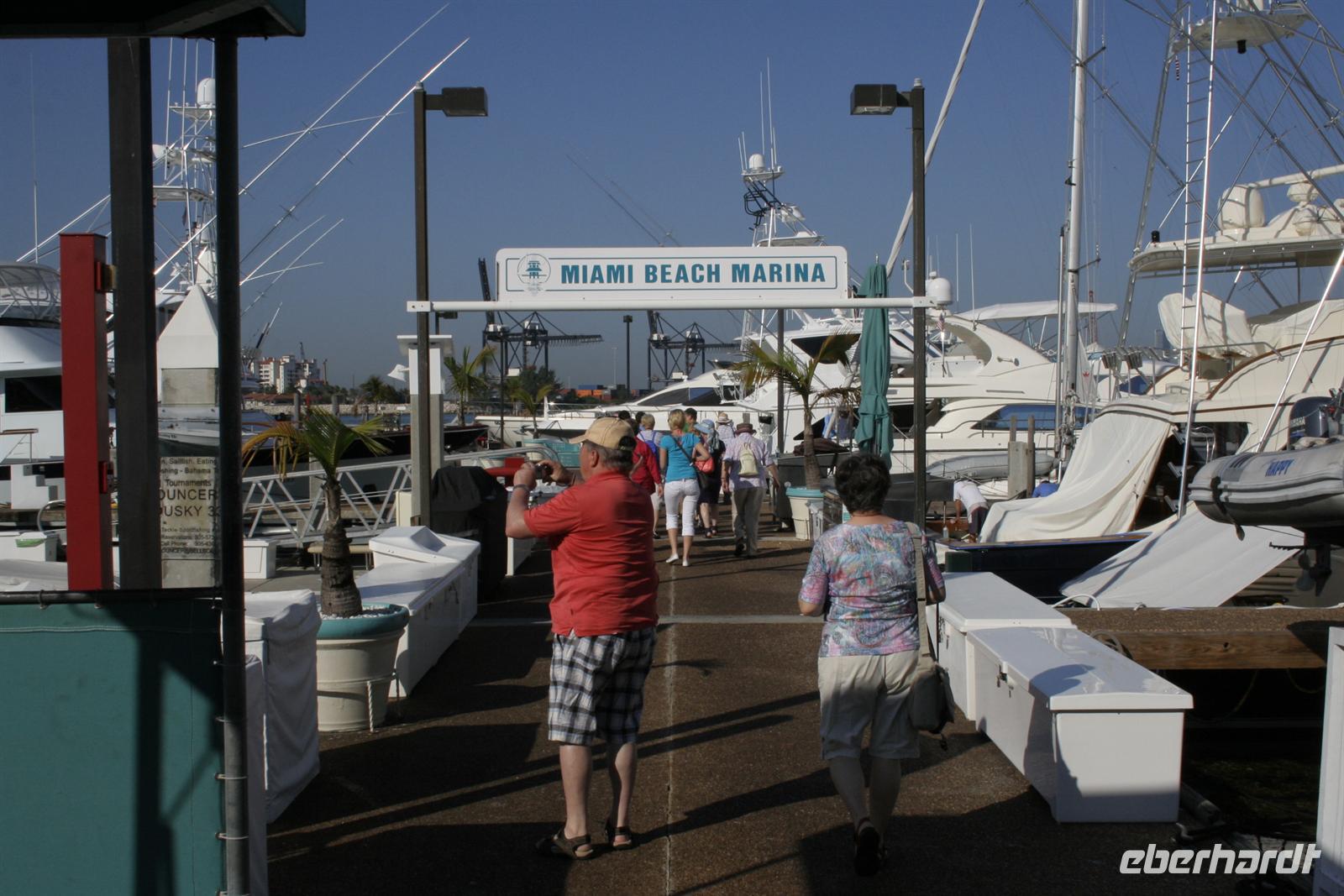 Nach dem Haustür-Transfer zum Flughafen am frühen Morgen und unseren Zubringerflügen von Berlin, Dresden und Leipzig treffen wir uns alle im Flughafen Frankfurt/Main am Abfluggate nach Miami. Pünktlich um 10.10 Uhr beginnt unser Transatlantik-Flug mit Lufthansa. Der Flug dauert etwa zehn Stunden. An Bord werden zwei warme Mahlzeiten serviert und wir bekommen das US-Zollformular. Ich helfe allen Gästen beim Ausfüllen des Formulars. (Diesmal gibt es das Formular nur in Englisch und nicht wie sonst üblich auf Deutsch. Es ist ein älteres Flugzeug, wir haben kein Unterhaltungsprogramm in jedem Sitz, sondern nur einige Monitore oben.) Am frühen Nachmittag landen wir in Miami und passieren die Einreisekontrolle. Hier benötigt man den Pass und das ausgefüllte Zollformular. Die Einreisegenehmigung „Esta“ haben wir ja schon vor der Reise für alle Gäste im Internet beantragt und eingeholt. Die Einreise verläuft ohne Probleme.