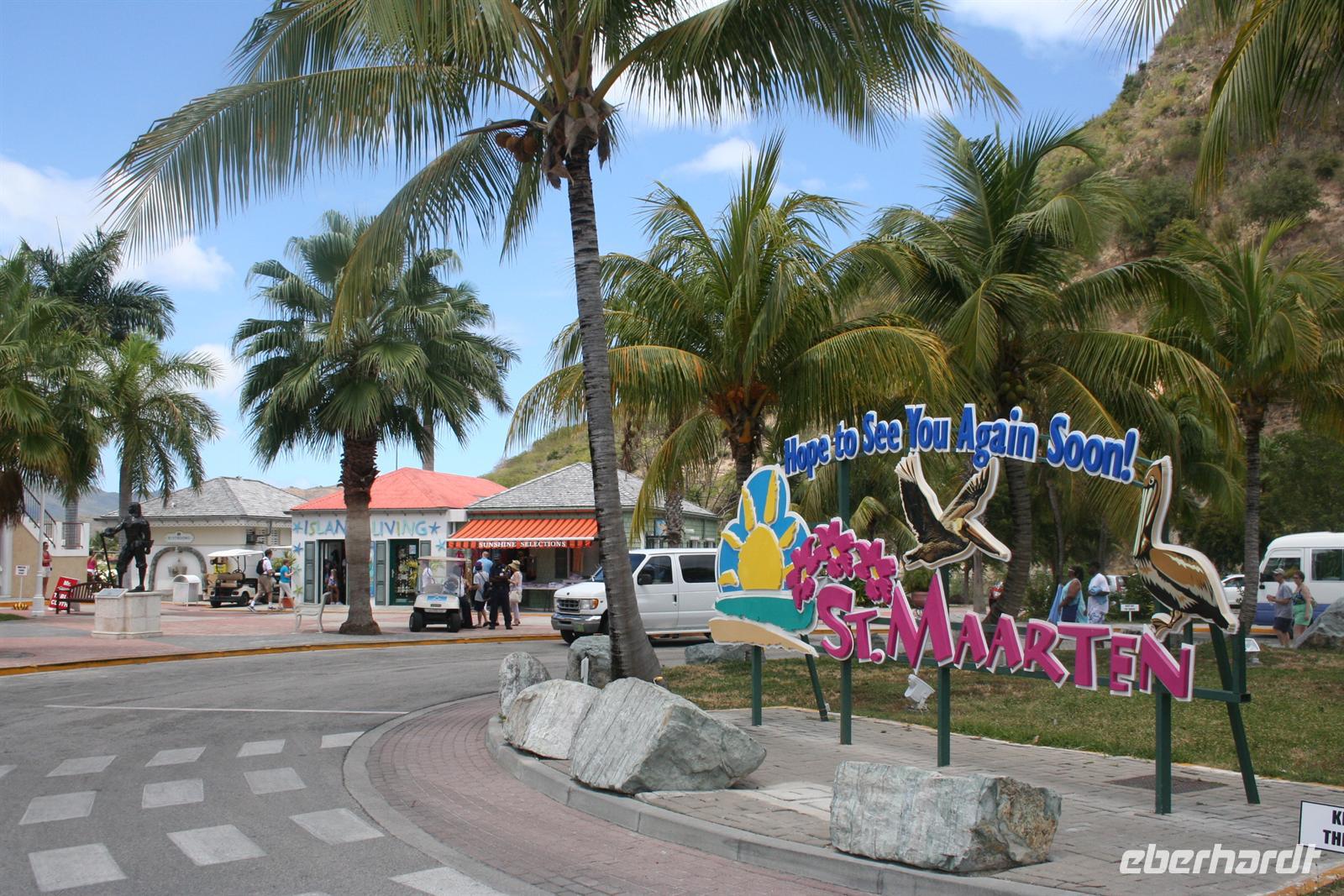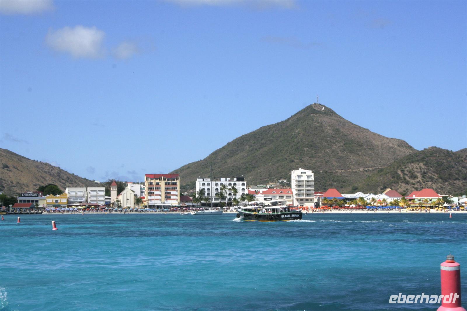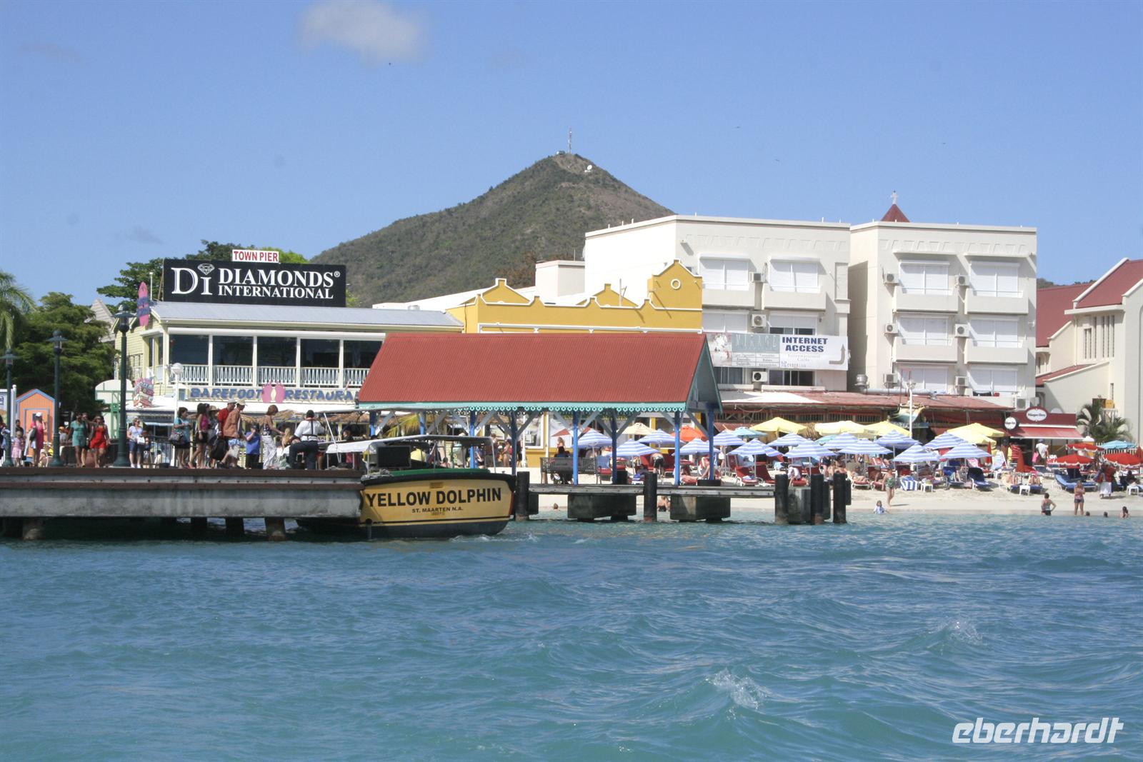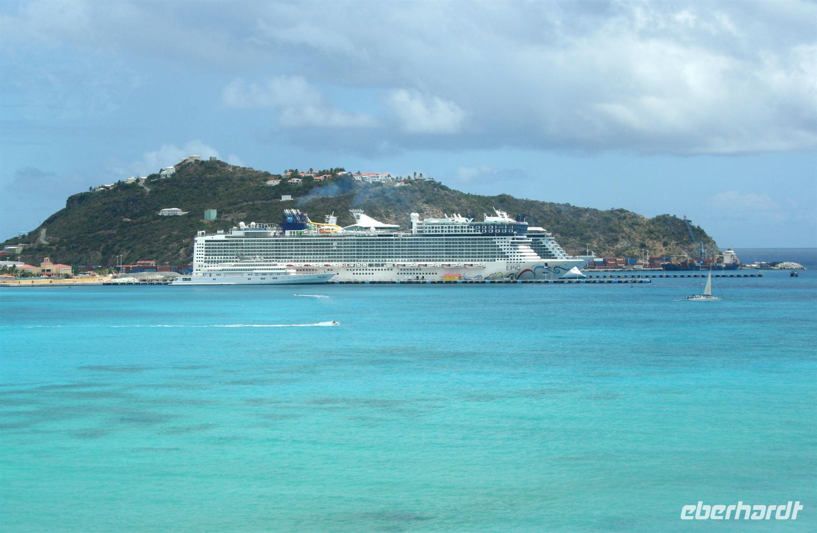 Für unseren ersten Landgang legt die „Norwegian Epic“ gegen 8.00 Uhr am Kreuzfahrtpier von Philipsburg, der Hauptstadt des niederländischen Teils der Insel St. Maarten an. Wir haben einen deutschsprachigen Reiseleiter engagiert, der speziell für unsere Eberhardt-Reisegruppe eine Inselrundfahrt macht. Im klimatisierten Kleinbus beginnen wir unseren Ausflug in Philipsburg und fahren einmal um die ganze Insel St. Maarten, die übrigens in einen niederländischen Teil und einen französischen Teil (Sainte Martin) gegliedert ist.