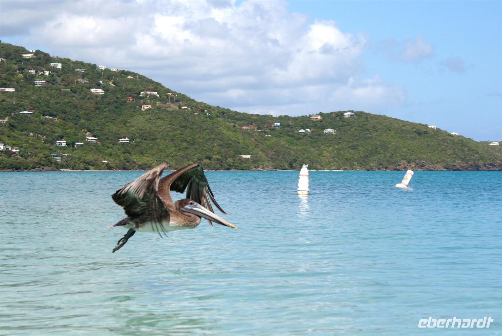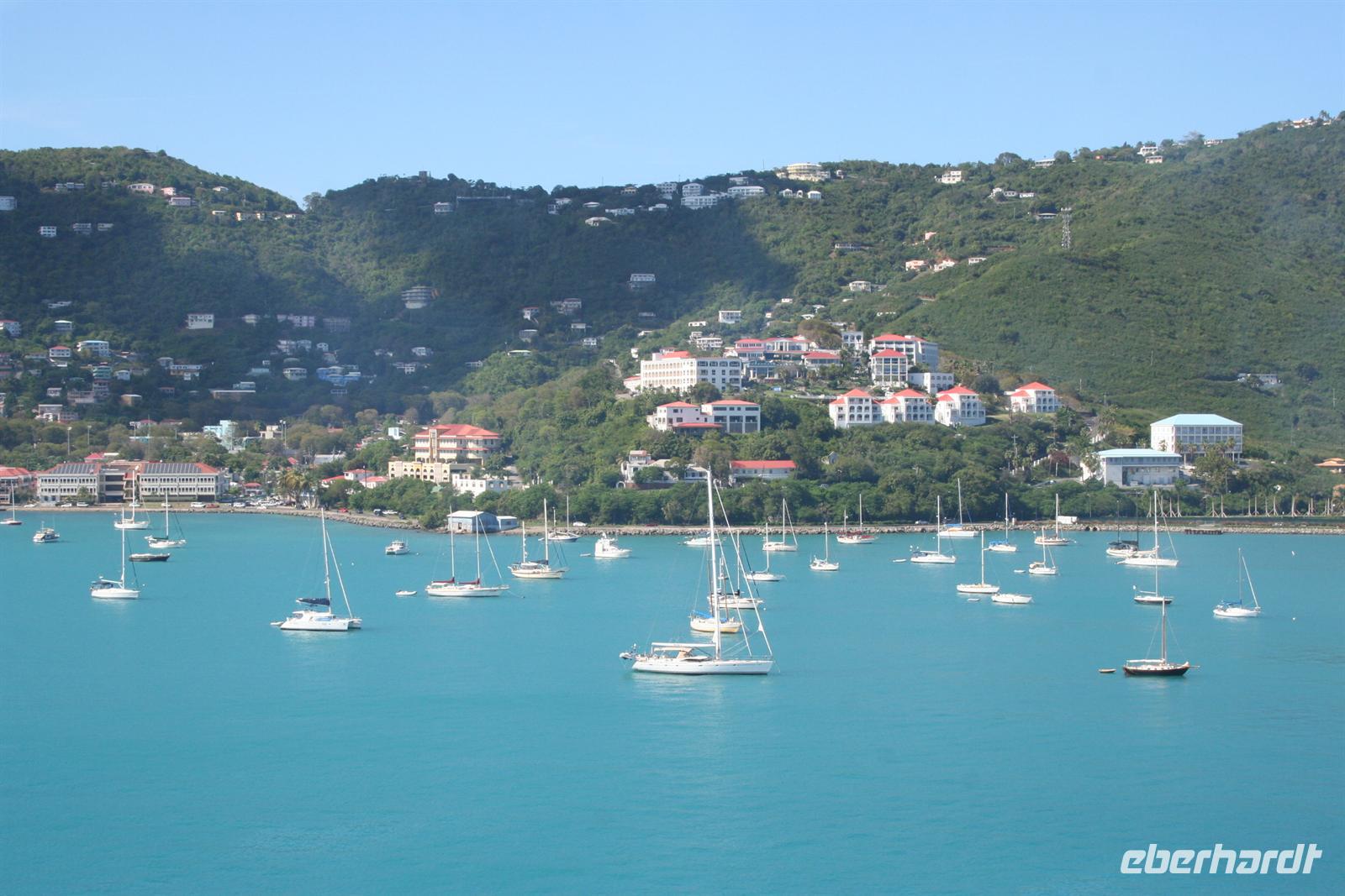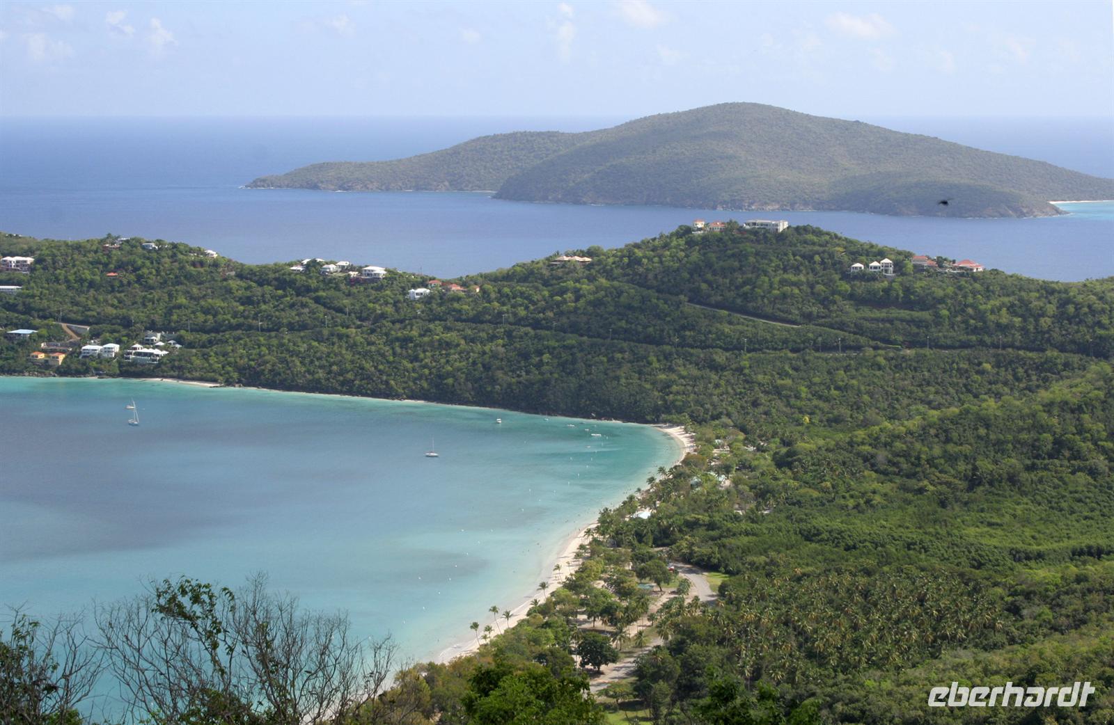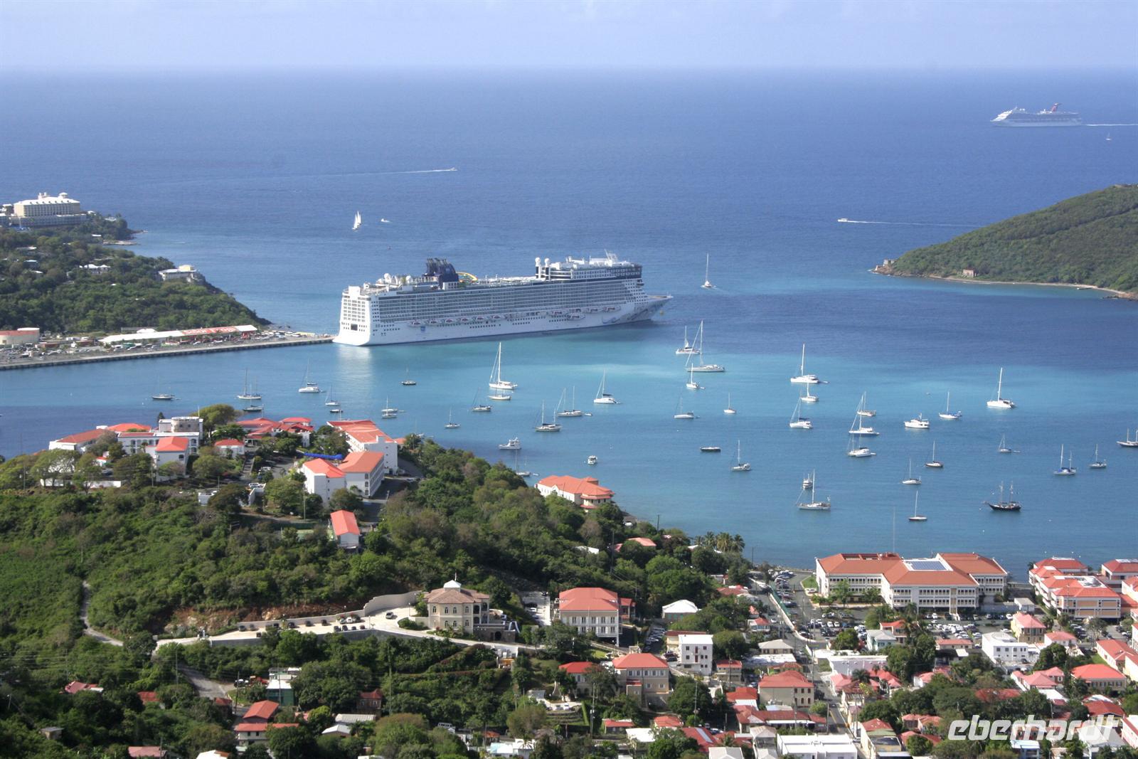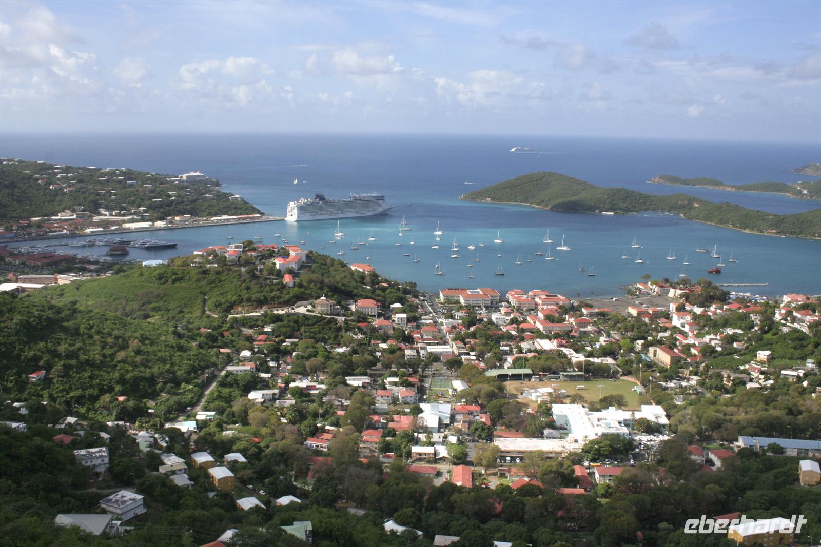 Heute gehen wir auf der Karibikinsel St. Thomas an Land. Sie gehört zu den US-amerikanischen Jungferninseln (US Virgin Islands), die 1493 von Christopher Kolumbus entdeckt wurden. Später besetzte Dänemark die Insel und die Hauptstadt erhielt den Namen der Frau des damaligen dänischen Königs - Charlotte Amalie. 1917 wurden St. Thomas und die Nachbarinseln St. John und St. Croix an die USA verkauft. Unser Schiff legt am Morgen an einem der beiden Kreuzfahrt-Piers von Charlotte Amalie an. Wir gehen gemeinsam von Bord und besteigen einen der Safari-Busse für unseren Landausflug auf St. Thomas. Wie auf den benachbarten Britischen Jungferninseln herrscht hier im einzigen Gebiet der USA Linksverkehr, was wir mit Erstaunen bei unserer ersten Fahrt feststellen. Durch die Hauptstadt Charlotte Amalie geht es zunächst auf einen Aussichtspunkt hoch über der Stadt, von dem wir die ganze Bucht mit den Häfen überblicken. Das Wetter ist fantastisch bei Sonnenschein und etwa 30 °C. Ein weiterer Fotostopp zeigt uns die Nordseite der Insel mit der Magens Bay und den vorgelagerten unbewohnten Inseln, die heute meist Naturschutzgebiete sind. Dann fahren hinunter zur Magens Bay, wo wir einen zweistündigen Badeaufenthalt am traumhaften Karibikstrand genießen. Es gibt ein Café, einen Souvenirladen und Umkleidekabinen am Strand. Während des Badens im türkisblauen Wasser beobachten wir sogar Pelikane, Tölpel, Fische und Wasserschildkröten. So stellt man sich einen Urlaub in der Karibik vor!