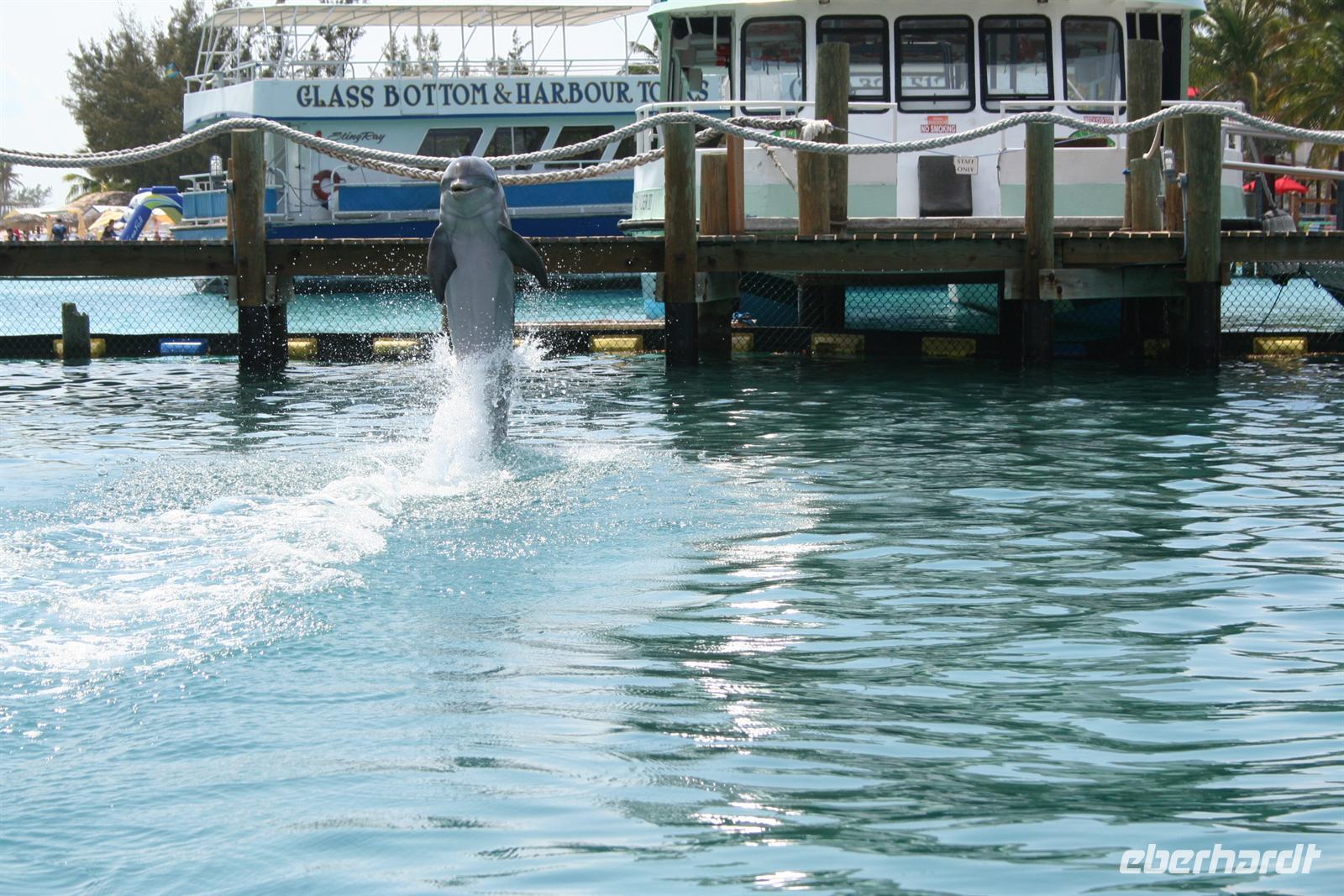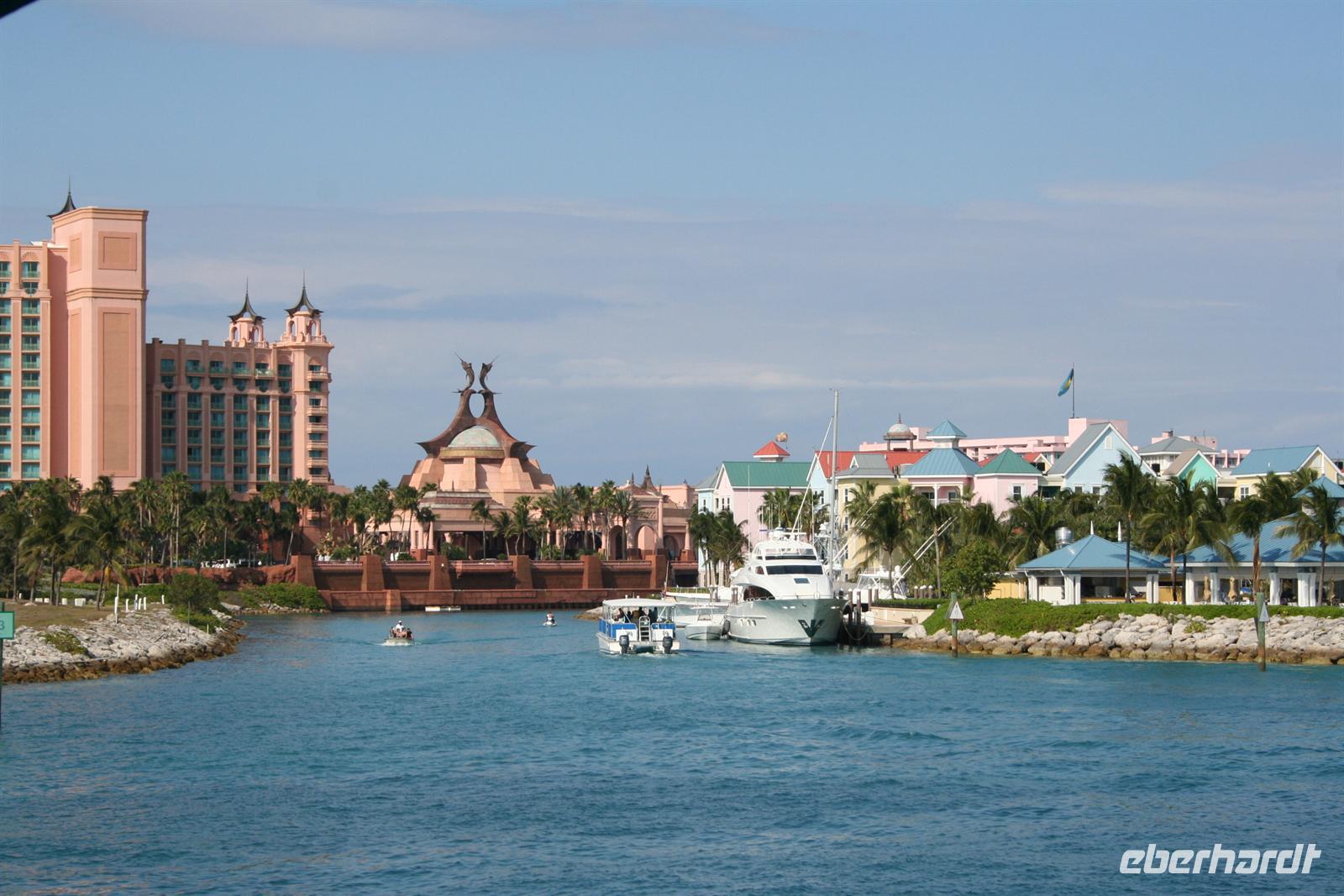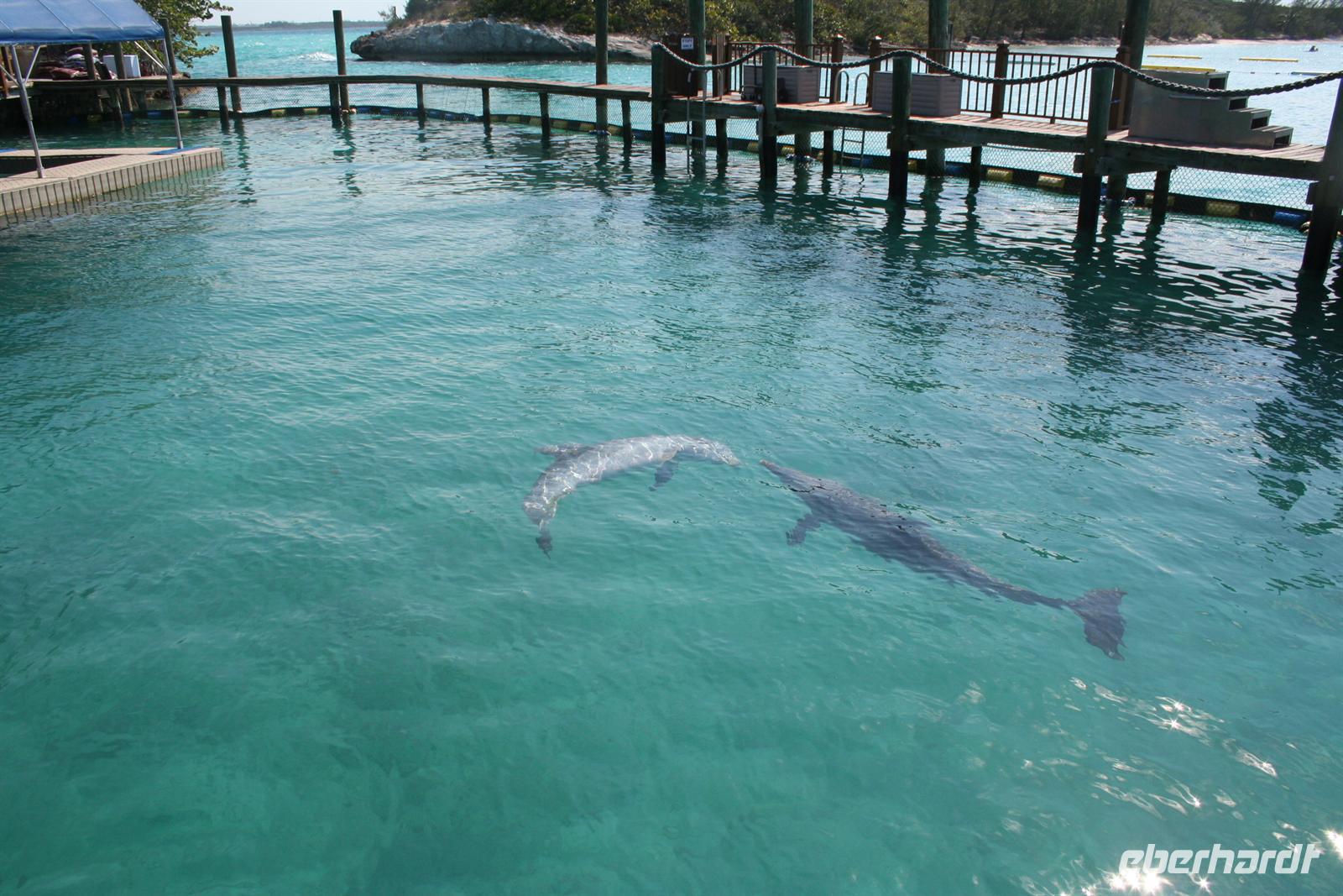 Nach einem Seetag an Bord der „Norwegian Epic“ erreichen wir die Bahamas. Wir legen an der Insel New Providence am Kreuzfahrt-Pier der Hauptstadt Nassau an. Von hier sind es nur wenige Geh-Minuten zu den Haupteinkaufsstraßen und zum Stadtzentrum von Nassau. Auf unserem Ausflugsprogramm steht heute aber zunächst eine Bootsfahrt zur Blue Lagoon Island, einer kleinen Insel, auf der sich ein Delfin-Erlebnis-Zentrum befindet. Die Überfahrt vorbei an den Stränden von New Providence und dem bekannten Hotel „Atlantis“ dauert etwa 45 Minuten. Im Blue Lagoon Dolphin Center erhalten wir eine kleine Einführung zur Arbeit des Zentrums und zum Training der hier heimischen Flaschennasen-Delfine. Auch für die weltberühmten Flipper-Filme wurden hier die Delfine trainiert.