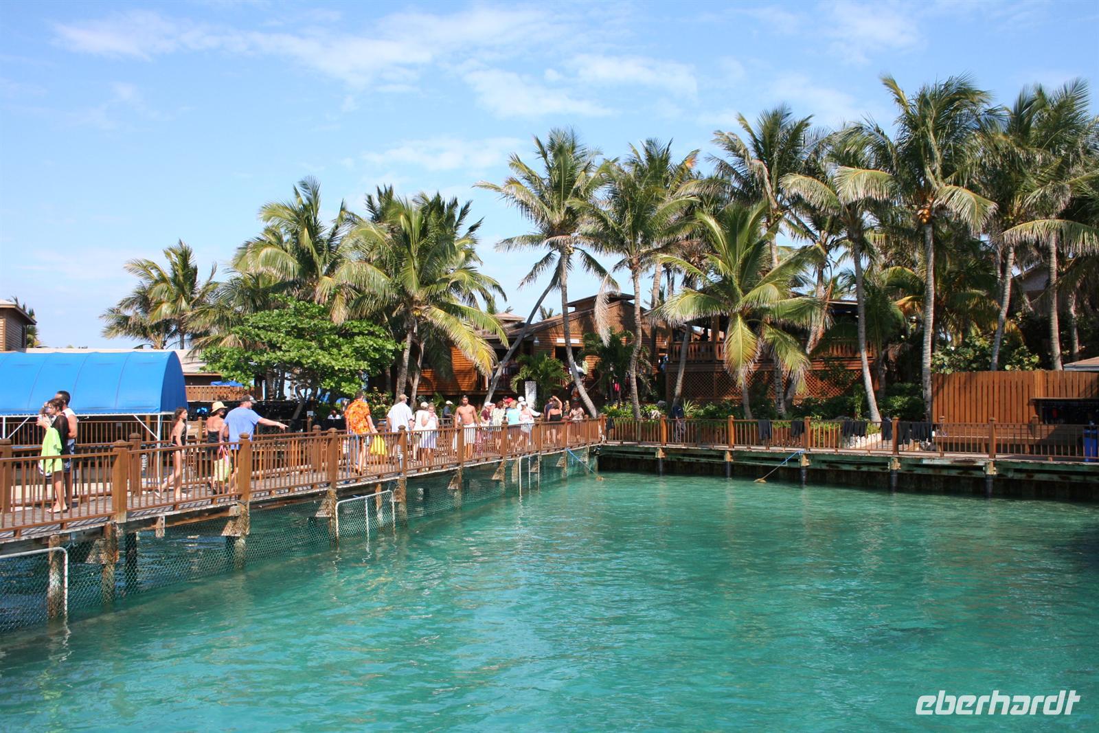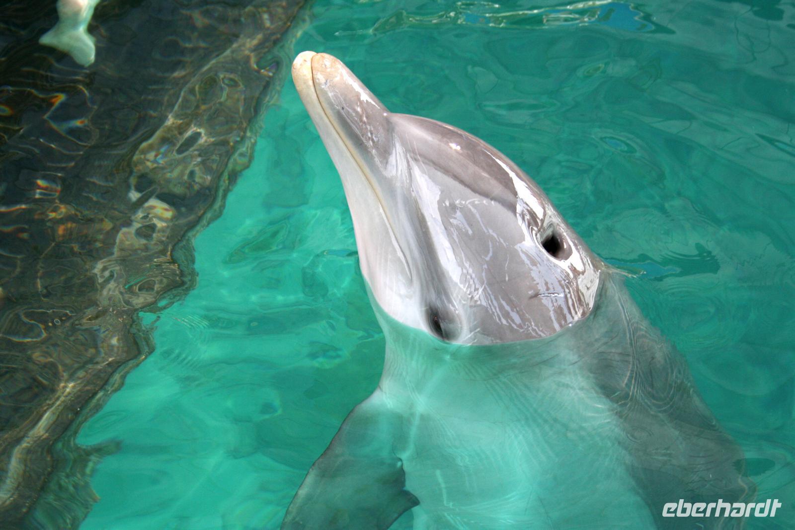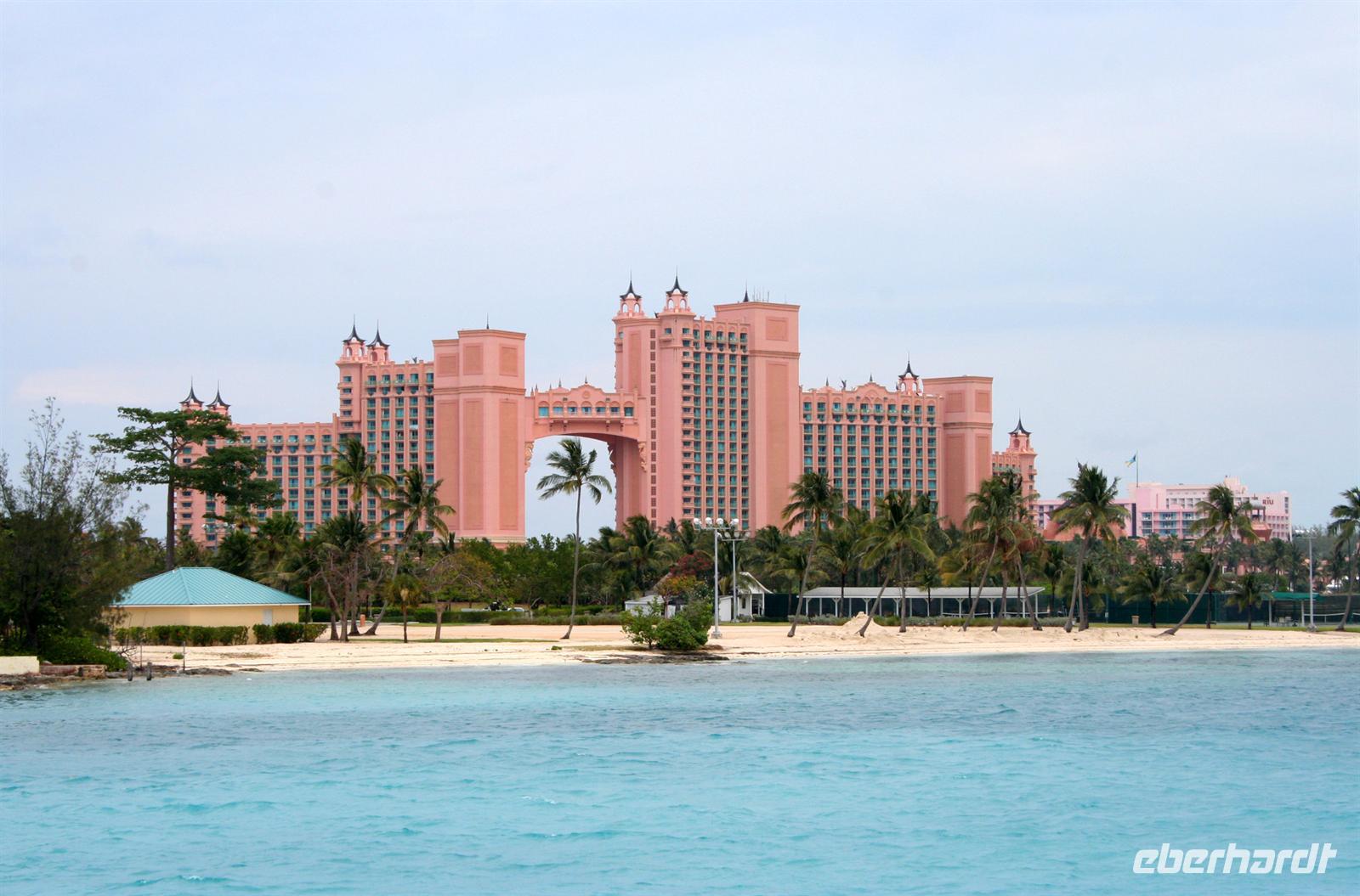 Nach einem Seetag an Bord der „Norwegian Epic“ erreichen wir die Bahamas. Wir legen an der Insel New Providence am Kreuzfahrt-Pier der Hauptstadt Nassau an. Von hier sind es nur wenige Geh-Minuten zu den Haupteinkaufsstraßen und zum Stadtzentrum von Nassau. Auf unserem Ausflugsprogramm steht heute aber zunächst eine Bootsfahrt zur Blue Lagoon Island, einer kleinen Insel, auf der sich ein Delfin-Erlebnis-Zentrum befindet. Die Überfahrt vorbei an den Stränden von New Providence und dem bekannten Hotel „Atlantis“ dauert etwa 45 Minuten. Im Blue Lagoon Dolphin Center erhalten wir eine kleine Einführung zur Arbeit des Zentrums und zum Training der hier heimischen Flaschennasen-Delfine. Auch für die weltberühmten Flipper-Filme wurden hier die Delfine trainiert.