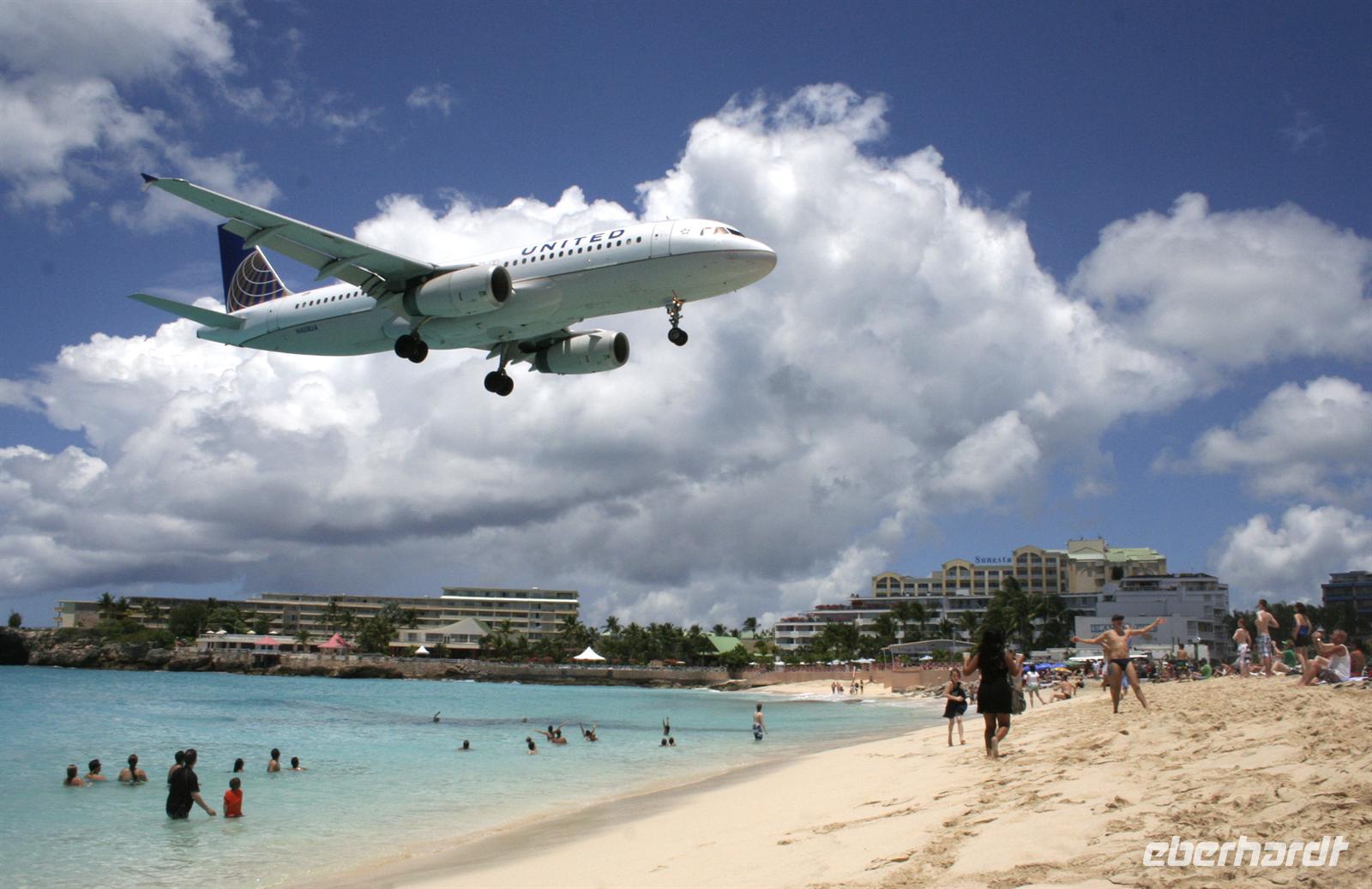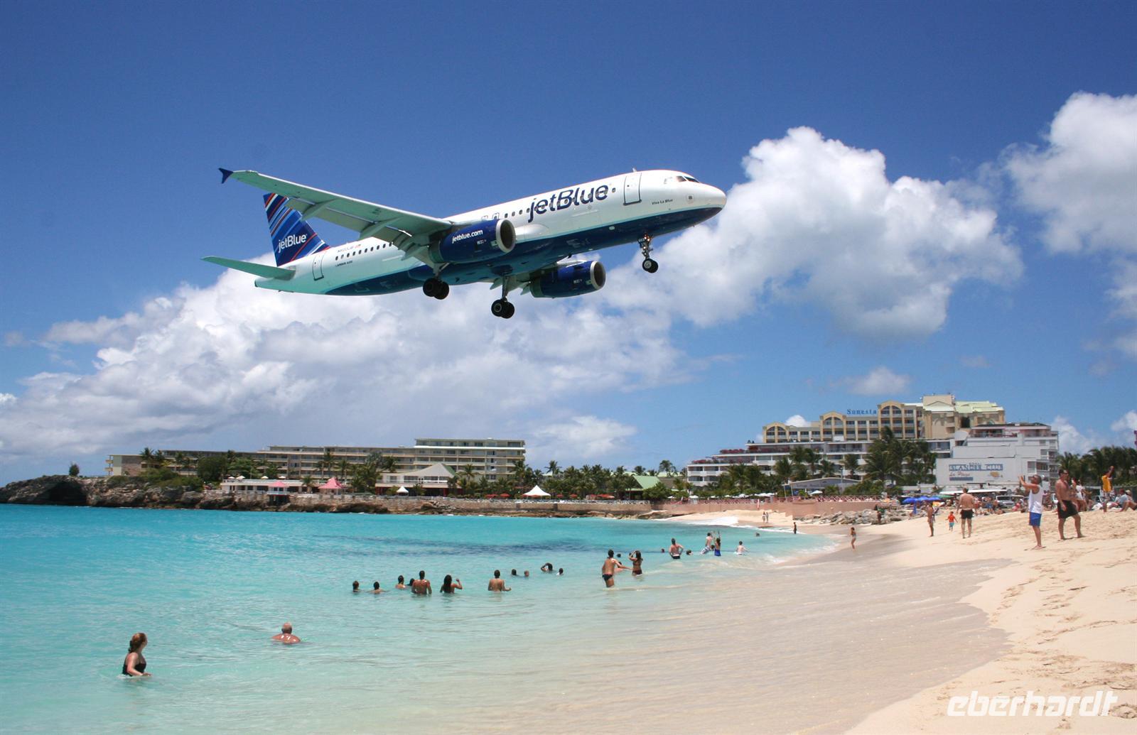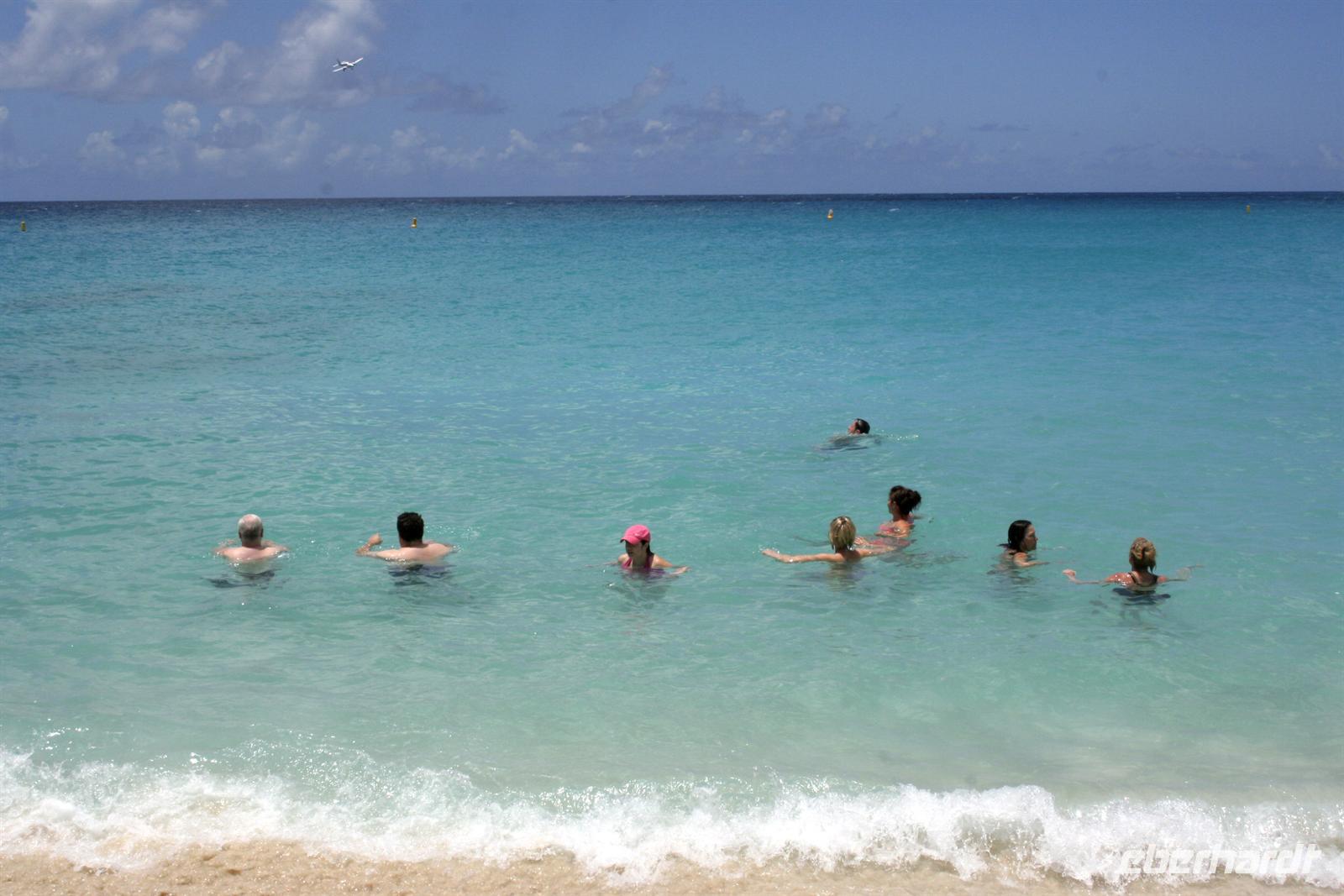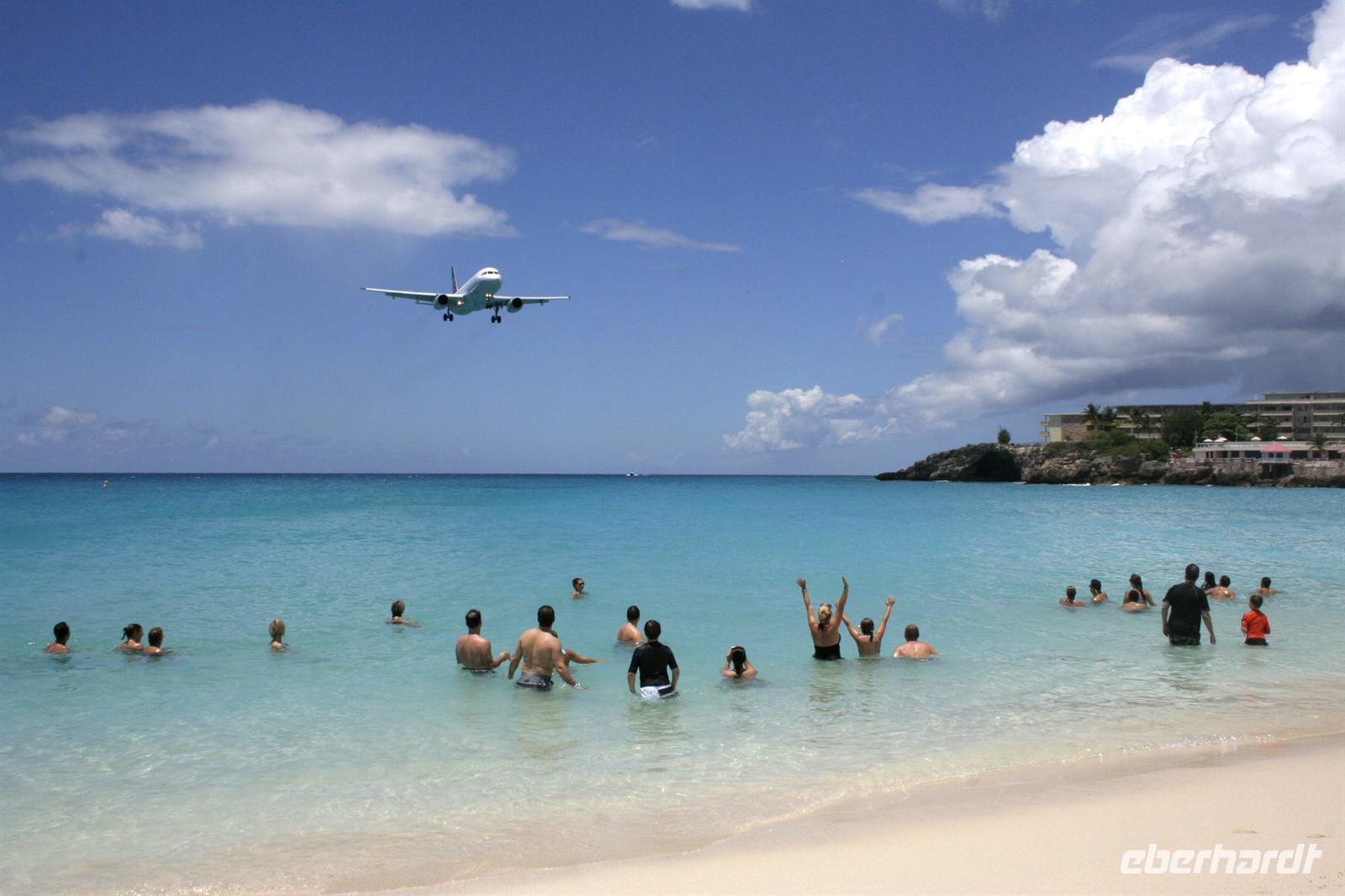 Mit einem Fotostopp am Oyster Pond und vorbei an der Orient Bay (dem einzigen FKK-Badestrand der Insel) geht es über Grand Case bis nach Marigot, der Hauptstadt des französischen St. Martin. Hier legen wir eine Pause zum Bummeln an der hübschen Hafenpromenade ein. Einige von uns erklimmen bei einem 15-minütigen Spaziergang das alte Fort Louis. Von der kleinen Festung, die einst zum Schutz vor Piraten diente, sieht man noch einige Mauern und Kanonen. Der Aufstieg lohnt sich vor allem wegen des Panoramablickes über die Stadt Marigot, die Karibik-Bucht und die weitläufige Lagune. Zurück in den niederländischen Teil über Mullet Bay fahren wir weiter zum weltbekannten Strand Maho Beach. Dieser ist vor allem berühmt, wegen seiner unmittelbaren Nähe zum Juliana Airport. Hier fliegen die Flugzeuge beim Landeanflug nur ein paar Meter über den Strand hinweg. Das müssen wir natürlich unbedingt sehen! Wir legen eine einstündige Badepause am Maho Beach ein und erleben neben dem weißen Sandstrand und dem herrlichen türkisfarbenem Meer auch den Landeanflug mehrerer Flugzeuge. Auf einem Surfbrett der „Sunset Bar“ sind sogar die Landezeiten aller Flugzeuge vermerkt. Es ist der Wahnsinn, wenn eine große Linienflugmaschine mit lautem Getöse über die Köpfe der Urlauber hinweg fegt!