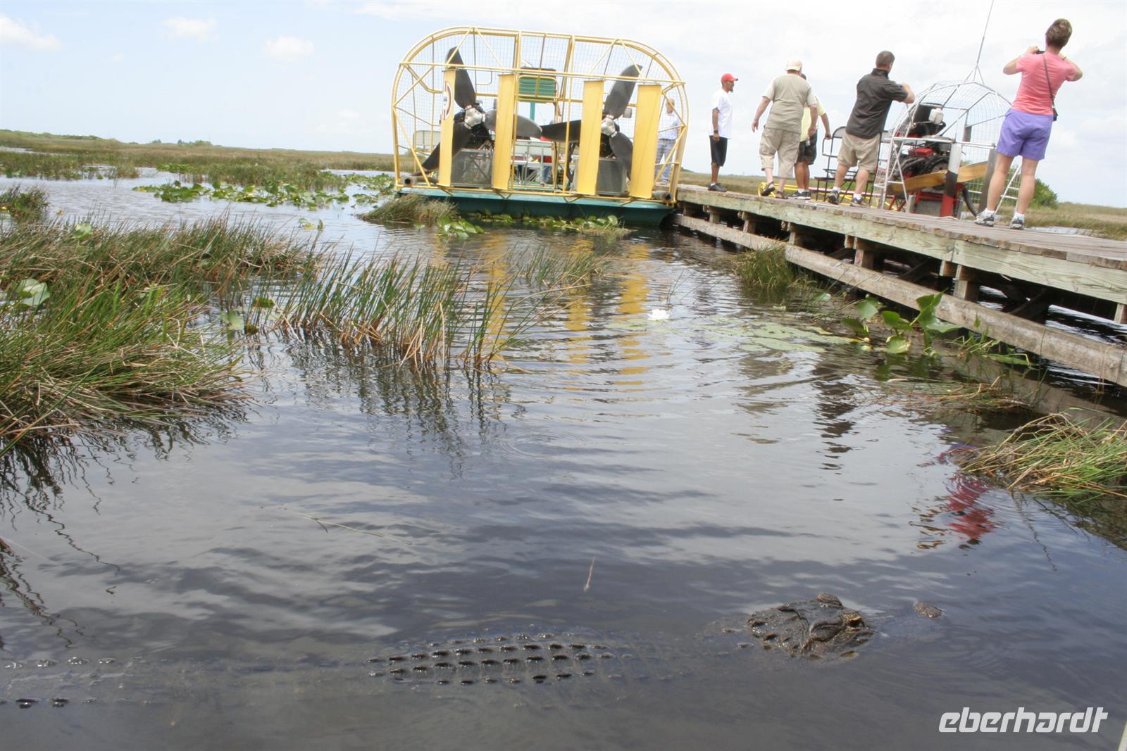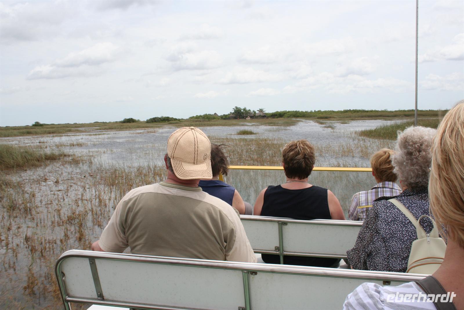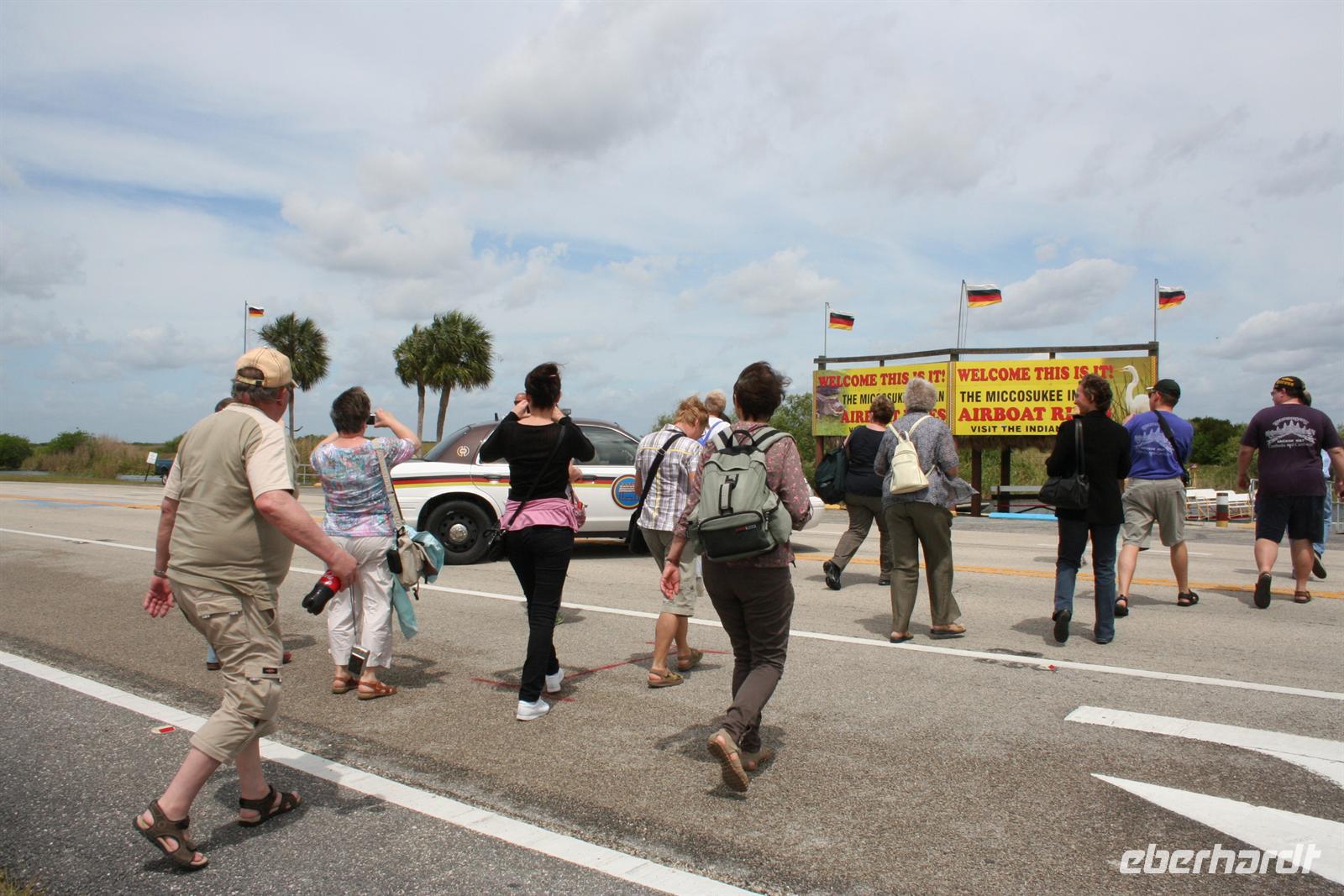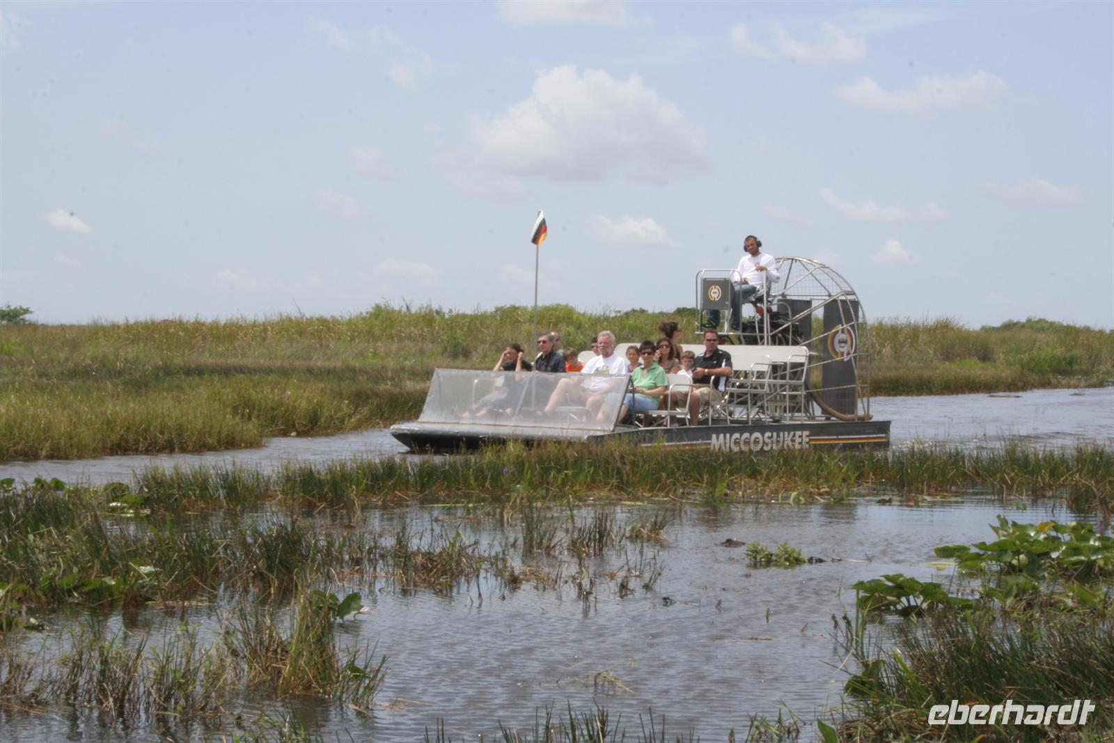 Heute steht ein Ausflug in den Everglades-Nationalpark auf unserem Programm. Nach dem Frühstück im Hotel geht es um 9.30 Uhr mit dem Bus los in Richtung West-Florida. Wir fahren den so genannten Tamiami Trail entlang, den US Highway 41, der die Atlantikküste Floridas mit dem Golf von Mexiko verbindet. Es ist ein künstlich geschaffener Damm, der zwischen dem Everglades-Nationalpark und dem Indianergebiet der Miccosukee liegt. Wir erreichen das Miccosukee Indian Village, ein nachgebautes Indianerdorf, das einige Traditionen und Lebensweisen der Miccosukee-Indianer zeigt. Bei einer Führung sehen wir verschiedene mit Palmblättern gedeckte Häuschen - die so genannten Chickees. In einem Chickee wird gekocht und gegessen, im anderen geschlafen und im nächsten werden traditionelle Handarbeiten wie Patchwork oder Schmuckherstellung betrieben. Bei einer kleinen Vorführung zeigt uns ein Miccosukee-Indianer den Umgang mit Alligatoren. Aus dem Ringen mit Alligatoren soll übrigens sogar das Wrestling entstanden sein. Jeder kann auch ein Foto mit einem kleinen Alligator auf dem Arm machen. Der kleine Alligator fasst sich angenehm warm an. In einem Museumsraum sehen wir einen kurzen Film über das Leben der Indianer in den Everglades und die Tiere, die hier in der weiten Wasserlandschaft leben. Damit wir sicher den Tamiami Trail Highway überqueren können, kommt extra für uns ein Polizeiwagen mit Blaulicht. Echt amerikanisch! Von der anderen Straßenseite startet nämlich unsere Propellerbootfahrt durch das Everglades-Gebiet der Miccosukee. Das Wort Everglades leitet sich ab von „Everywhere glades“, was bedeutet „überall Lichtungen“. Da die Propellermotoren ziemlich laut sind, bekommen wir einen Gehörschutz. Dann geht es los: in einem großen Propellerboot fegen wir über die Wasserlandschaft der Everglades. Wir stoppen an einer Insel, die ebenfalls den Miccosukee-Indianern gehört. Hier sehen wir eine Alligator und einige Fischreiher. Insgesamt dauert die Fahrt etwa eine Stunde. Für viele Gäste war die Propellerbootfahrt ein Highlight unserer Florida-Reise. Auf dem Rückweg nach Miami legen wir eine Pause in einem der größten Einkaufszentren Miamis ein, der Dolphin Mall. Hier gibt es neben zahlreichen Geschäften auch Fast Food jeglicher Art. Gegen 16.45 Uhr sind wir zurück am Hotel und nutzen den Nachmittag zur Entspannung am Pool oder am Strand von Miami Beach.