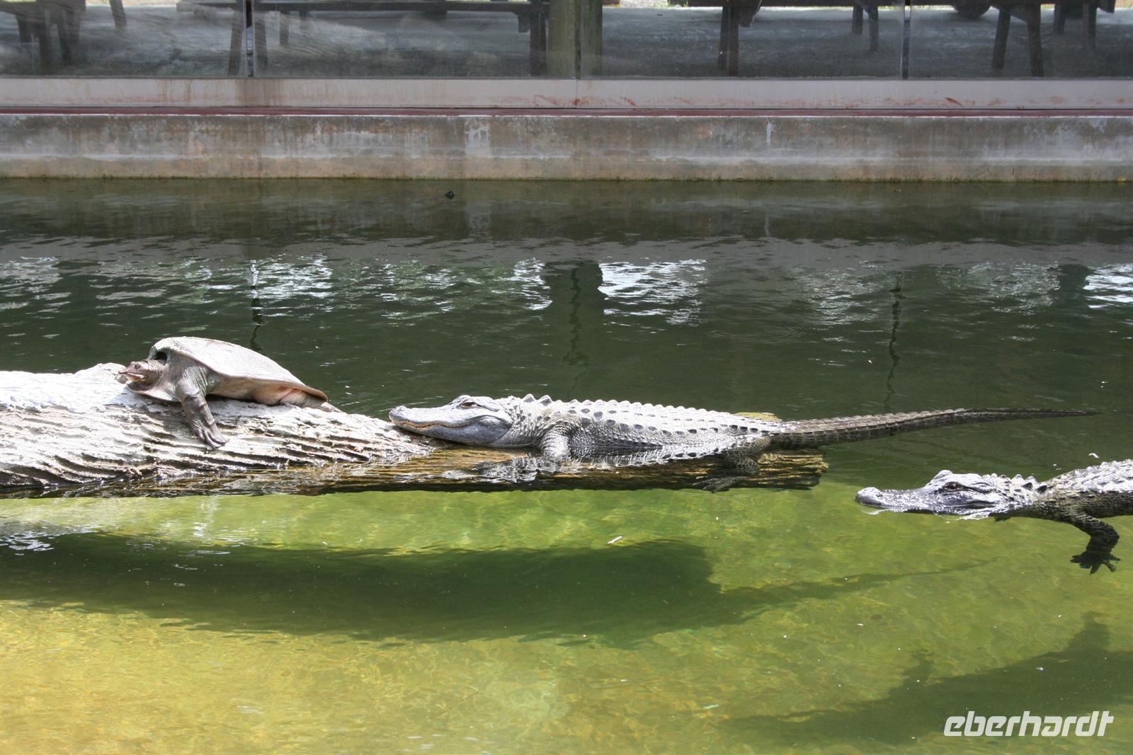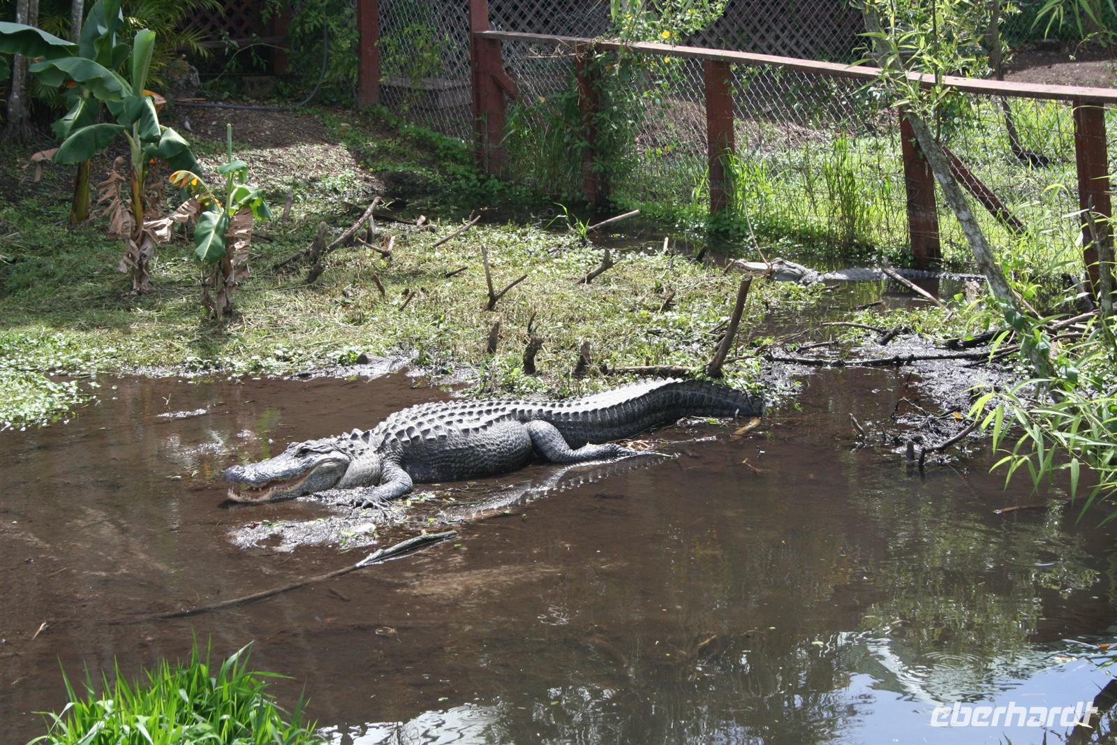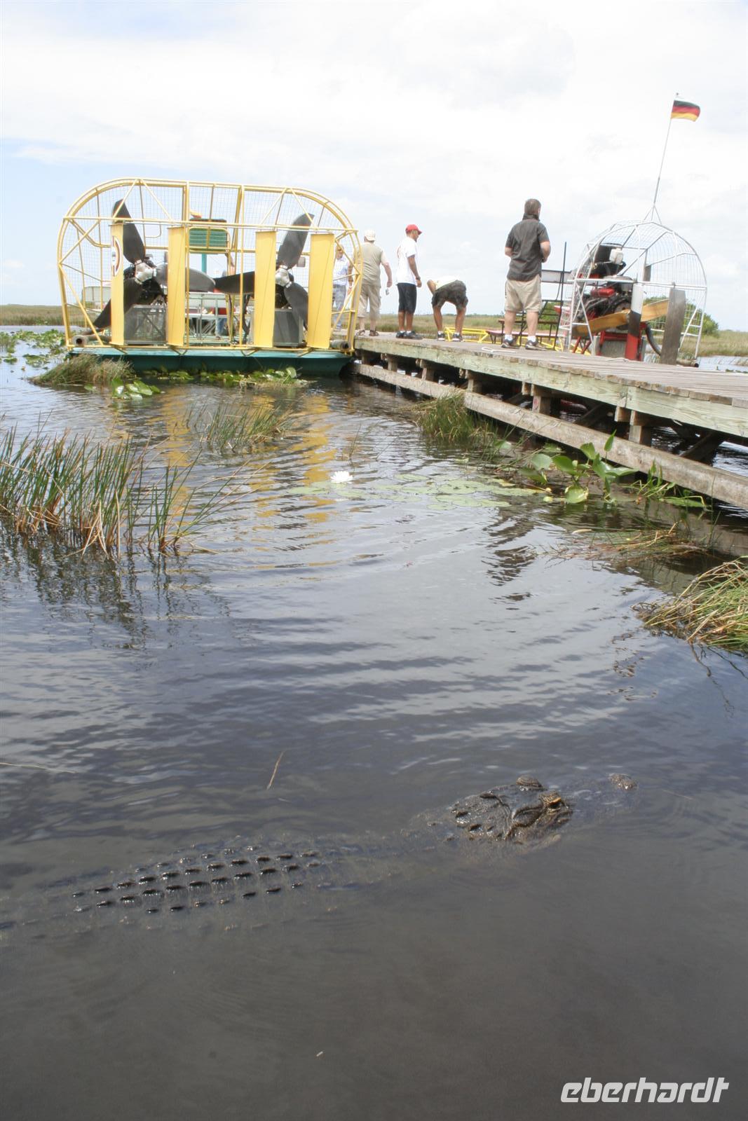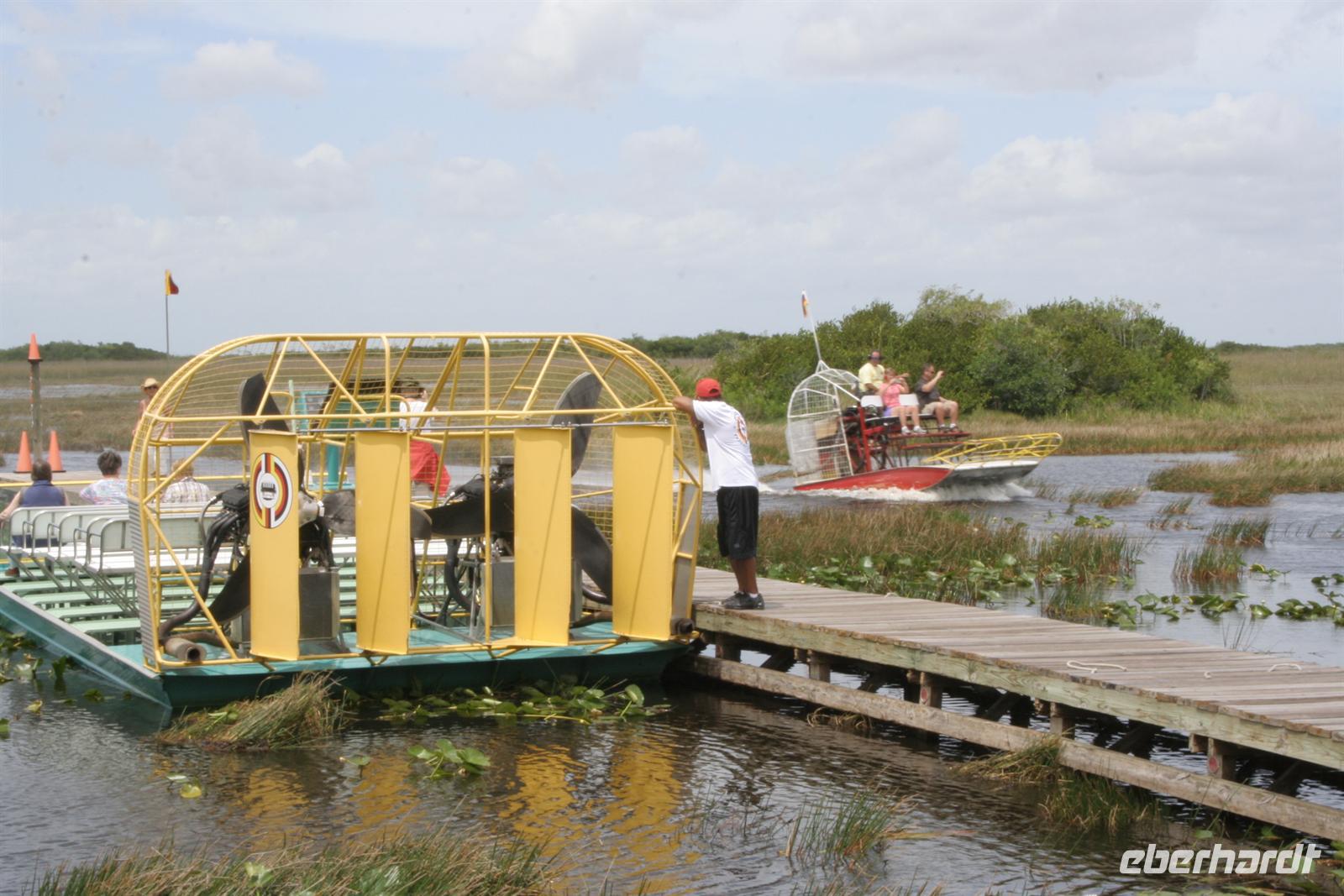 Heute steht ein Ausflug in den Everglades-Nationalpark auf unserem Programm. Nach dem Frühstück im Hotel geht es um 9.30 Uhr mit dem Bus los in Richtung West-Florida. Wir fahren den so genannten Tamiami Trail entlang, den US Highway 41, der die Atlantikküste Floridas mit dem Golf von Mexiko verbindet. Es ist ein künstlich geschaffener Damm, der zwischen dem Everglades-Nationalpark und dem Indianergebiet der Miccosukee liegt. Wir erreichen das Miccosukee Indian Village, ein nachgebautes Indianerdorf, das einige Traditionen und Lebensweisen der Miccosukee-Indianer zeigt. Bei einer Führung sehen wir verschiedene mit Palmblättern gedeckte Häuschen - die so genannten Chickees. In einem Chickee wird gekocht und gegessen, im anderen geschlafen und im nächsten werden traditionelle Handarbeiten wie Patchwork oder Schmuckherstellung betrieben. Bei einer kleinen Vorführung zeigt uns ein Miccosukee-Indianer den Umgang mit Alligatoren. Aus dem Ringen mit Alligatoren soll übrigens sogar das Wrestling entstanden sein. Jeder kann auch ein Foto mit einem kleinen Alligator auf dem Arm machen. Der kleine Alligator fasst sich angenehm warm an. In einem Museumsraum sehen wir einen kurzen Film über das Leben der Indianer in den Everglades und die Tiere, die hier in der weiten Wasserlandschaft leben. Damit wir sicher den Tamiami Trail Highway überqueren können, kommt extra für uns ein Polizeiwagen mit Blaulicht. Echt amerikanisch! Von der anderen Straßenseite startet nämlich unsere Propellerbootfahrt durch das Everglades-Gebiet der Miccosukee. Das Wort Everglades leitet sich ab von „Everywhere glades“, was bedeutet „überall Lichtungen“. Da die Propellermotoren ziemlich laut sind, bekommen wir einen Gehörschutz. Dann geht es los: in einem großen Propellerboot fegen wir über die Wasserlandschaft der Everglades. Wir stoppen an einer Insel, die ebenfalls den Miccosukee-Indianern gehört. Hier sehen wir eine Alligator und einige Fischreiher. Insgesamt dauert die Fahrt etwa eine Stunde. Für viele Gäste war die Propellerbootfahrt ein Highlight unserer Florida-Reise. Auf dem Rückweg nach Miami legen wir eine Pause in einem der größten Einkaufszentren Miamis ein, der Dolphin Mall. Hier gibt es neben zahlreichen Geschäften auch Fast Food jeglicher Art. Gegen 16.45 Uhr sind wir zurück am Hotel und nutzen den Nachmittag zur Entspannung am Pool oder am Strand von Miami Beach.