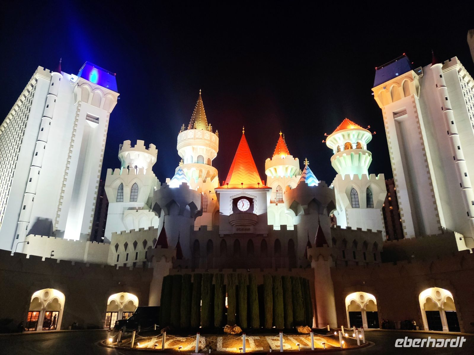 Um 11:00 traf ich meine 16 Gäste am Abfluggate des Frankfurter Flughafens. Leicht verspätet startet dann unsere Discover Airlines-Maschine Richtung Las Vegas. Der knapp elfstündige Flug verlief weitestgehend problemlos, das Einreiseprozedere allerdings zog sich ein wenig in die Länge. Nachdem dann alle ihren Stempel im Pass und wir unseren Busfahrer gefunden hatten, ging’s direkt zum Hotel Excalibur- gerade mal 10 Minuten vom Flughafen entfernt und einem Märchenschloss nachempfunden. Die Zimmersuche gestaltete sich als echte Herausforderung angesichts der Weitläufigkeit des Hotelkomplexes. Nach einer kleinen Verschnaufpause trafen wir uns alle zum Abendessen bei „Buca die Beppo“ und genossen italienische Spezialitäten. Auf Glücksspiel hatte danach keiner mehr Lust- zu lang war der Tag und so fielen alle dann relativ zeitig in ihren Betten.