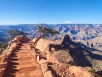 Für zwei Herren aus unserer Gruppe stand heute Morgen erst einmal ein Helikopterflug über dem Grand Canyon auf dem Programm. Ganz erfüllt kamen beide zurück und dann ging’s auch schon wieder für alle in den Park, wo wir heute an verschiedenen Stellen insgesamt 10 km wandern sollten. Zunächst spazierten wir entlang des South Rim Trails zum Hopi Point, dann ein Stück weiter mit dem Bus und schließlich zu Fuß zu Hermit’s Rest, dem letzten Aussichtspunkt entlang der Südkante. Anschließend brachten uns drei verschiedene Shuttle-Busse zum Ausganspunkt des South Kaibab Trails, der uns in den Canyon hinein führte. Jeder ganz individuell in seinem Tempo wanderte soweit hinunter, wie es die Zeit und die körperliche Fitness zuließen- schließlich musste man den kompletten Weg auch wieder hoch. Nach knapp zwei Stunden waren alle wieder oben und wir trafen unseren Busfahrer David wieder, der uns zum Hotel brachte. Abendessen gab’s heute in einem nahegelegen Steakhouse.