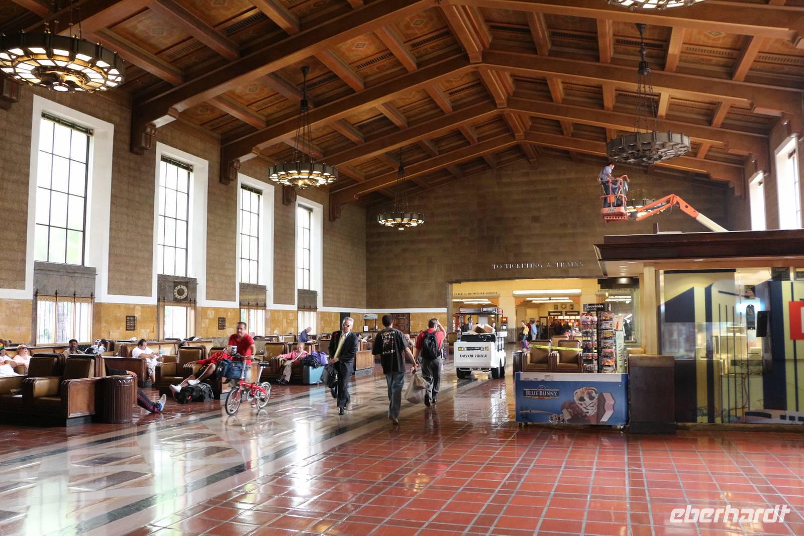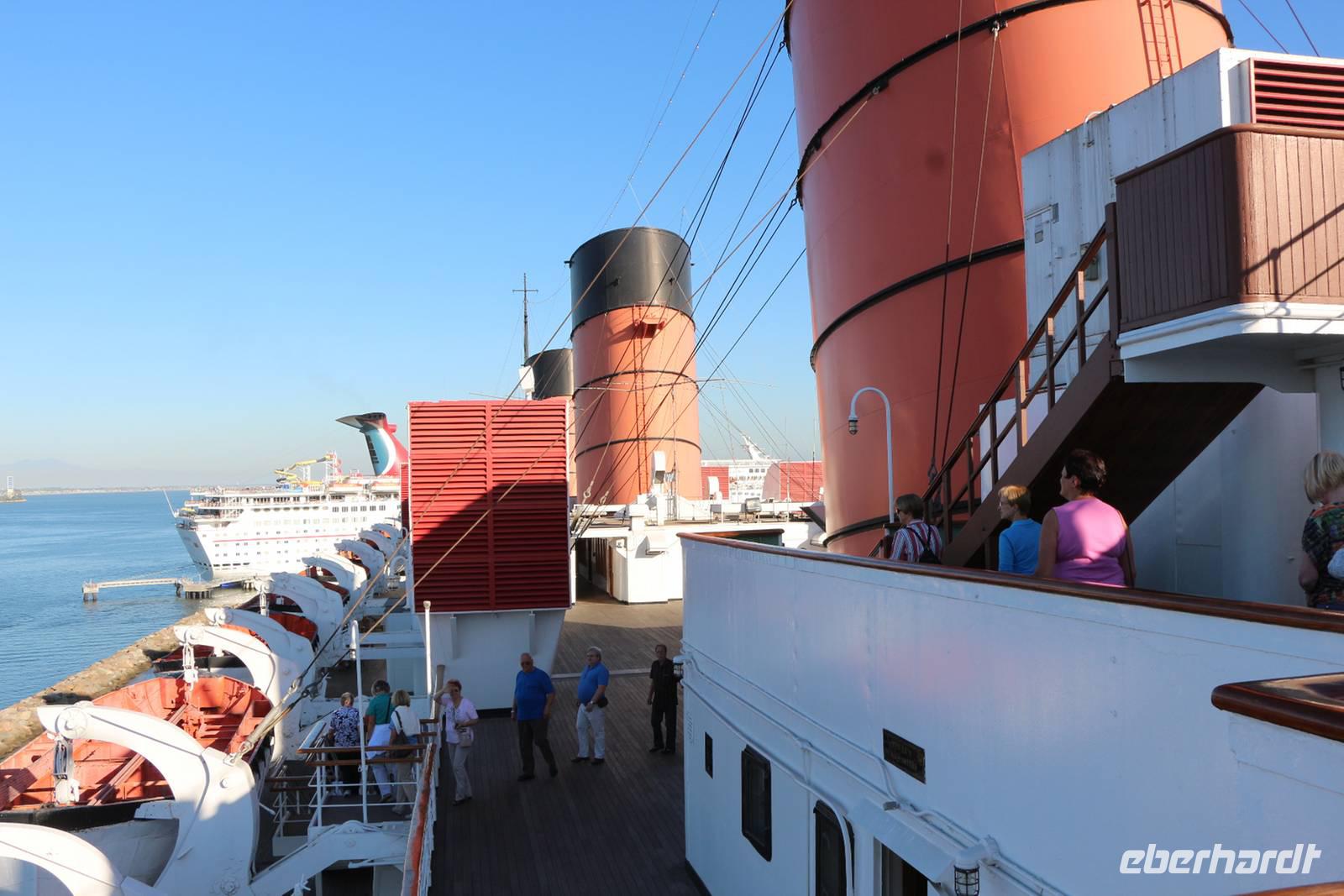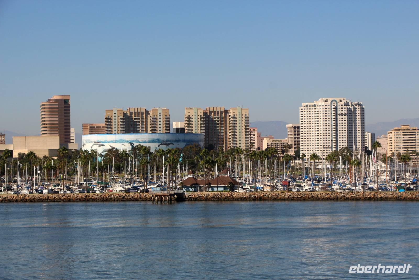 Von Frankfurt startete unsere komplette Reisegruppe von 25 Personen mit Lufthansa in Richtung West-USA (Zeitverschiebung: minus 9 Stunden). Nach unserer Landung in Los Angeles passierten wir zwar mit etwa 30 Minuten Wartezeit, aber ohne Probleme die Einreisekontrolle im Flughafen. Als Reisebegleitung helfe ich allen Gästen bei Fragen am Schalter. Von allen Fingern werden Fingerabdrücke genommen und von jedem Gesicht wird ein Foto gemacht ... und schon haben wir die Einreiseprozedur zügig gemeistert. Am Ausgang empfängt uns unsere örtliche Reiseleiterin Janny, eine gebürtige Holländerin, die schon seit über 20 Jahren in den USA lebt und sich bestens auskennt. Unser Bus bringt uns in etwa 30 Minuten vom Flughafen nach Long Beach, wo uns das erste Highlight der Reise erwartet: Wir wohnen zwei Nächte auf dem berühmten Schiff "Queen Mary", das heute als riesiges Hotelschiff und Museum dient. Die "Queen Mary" wurde 1936 als Luxusliner für Atlantiküberquerungen und Kreuzfahrten in den Dienst gestellt. Noch heute fühlt man sich in frühere Zeiten zurückversetzt, denn die Ausstattung der Räume und viele Einbauten in den Kabinen sind noch im originalen Zustand erhalten. Bei einem Schiffsrundgang zeigt uns Janny die schönsten Teile des Schiffes: das Promenadendeck mit Geschäften und Restaurants, die Observation Bar im Art Deco Stil, die Flaniermeile mit dem gewachsten Holzfußböden, das Sonnendeck, die ehemaligen Kapitänswohnung und die Brücke mit den historischen Steuerinstrumenten. Wir wohnen in originalen Kabinen, die nach heutigem Standard ausgestattet sind und dennoch über viele historische Einbauten verfügen und ein museales Flair ausstrahlen. Unser Begrüßungsabendessen nehmen wir im Promenade Cafe an Bord ein mit tollem Blick auf die Bucht von Long Beach.