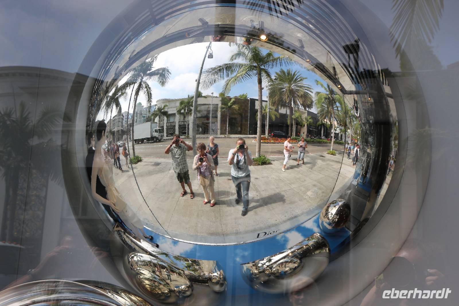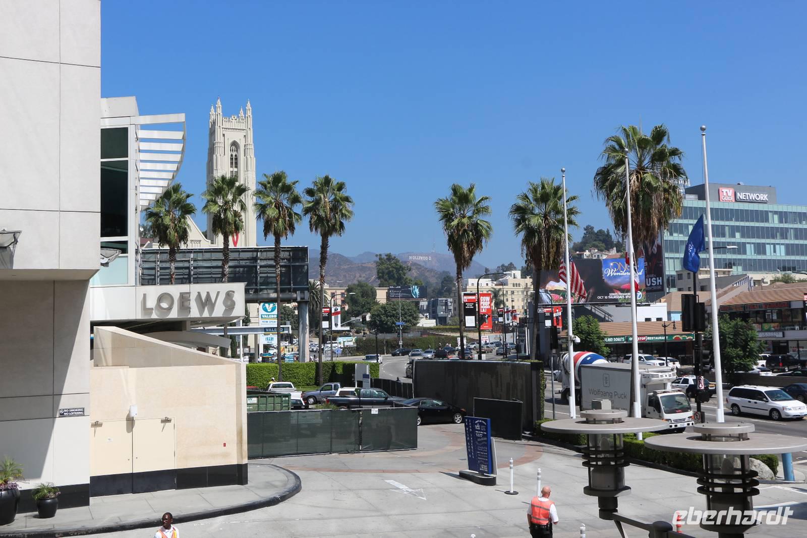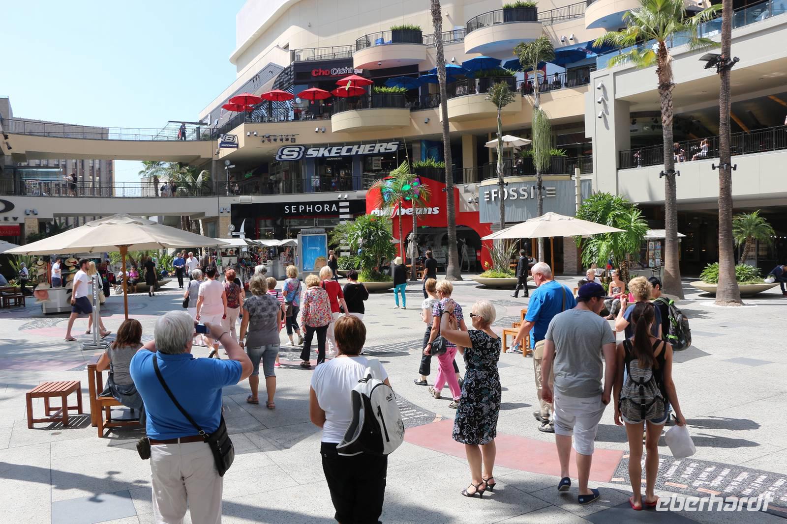 Unser nächstes Ziel ist der berühmte Rodeo Drive, ein Prachtboulevard mit Geschäften aller namhafter Designer. Hier kaufen die Schönen und Reichen ein. Auch das Hotel Beverly Wilshire befindet sich hier. Es beherbergte schon viele Prominente wie Elvis Presley, John Lennon, Al Pacino oder den Dalai Lama - und der Film "Pretty Woman" mit Julia Roberts und Richard Gere wurde hier gedreht. Nach einem Spaziergang am Rodeo Drive fahren wir in den Stadtteil Beverly Hills, in dem zahlreiche Promis leben. Hier befindet sich auch der Hollywood Boulevard, den wir uns nun aus der Nähe ansehen. Von einer Aussichtsterrasse bestaunen wir den weißen Hollywood-Schriftzug in den Hügeln der Beverly Hills, bevor wir selbst den "Walk of Fame" betreten. Der Fußweg mit den mehr als 2500 roten Sternen der Stars am Hollywood Boulevard gehört zu den bekanntesten Sehenswürdigkeiten von Los Angeles. Wir spazieren entlang des Boulevards, sehen das Dolby Theater und das Chinesische Theater, welche heutzutage für die Oscar-Verleihungen dienen. Auf einem kleinen Platz vorm Chinesischen Theater befinden sich die Hand- und Fußabdrücke der Hollywood-Stars, von Marilyn Monroe über Harry Potter bis Michael Jackson.