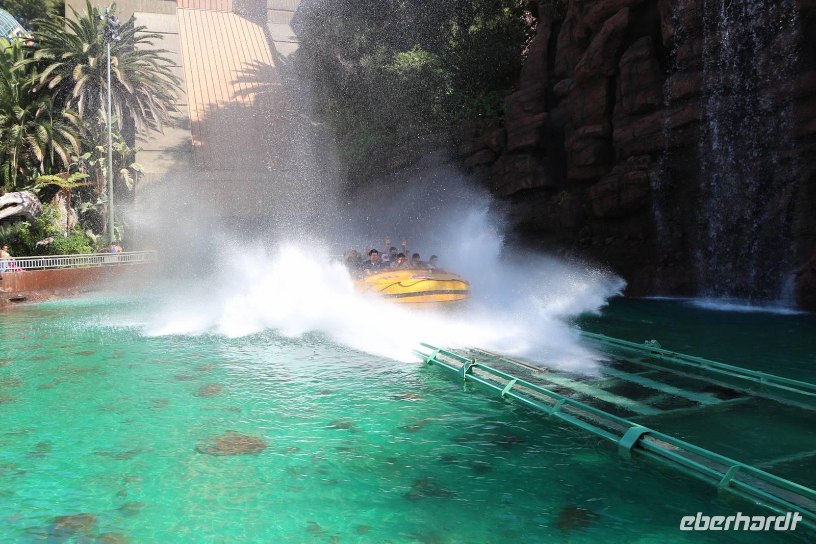 Zunächst gehen wir zum Abfahrtspunkt der Studio Tour. Mit einem bereiften Minizug fahren wir dabei durch die gesamte Außenanlage des Filmparks mit seinen riesigen Produktionshallen und nachgebauten Stadtkulissen. Es folgen spannende Höhepunkte, die wir äußerst realistisch erleben: Mit 3D-Brille ausgestattet fahren wir in eine Halle, in der links und rechts Leinwände den Kampf von T-Rex und King-Kong zeigen. Durch die 3D-Effekte und Schüttelbewegungen des Zuges scheinen die Szenen unheimlich real. Ähnlich aufregend sind eine Flutwellen- und Erdbeben-Simulation sowie der Angriff des Weißen Haies! Die Studio-Tour ist ein wirklich lohnendes Erlebnis! Nach einer Stärkung in einem der zahlreichen Imbiss-Angebote, erkunden wir den Filmpark, der in einem unterem und einem oberen Level verschiedene Attraktionen und Shows bietet. Eigentlich könnte man hier mindestens einen ganzen Tag zubringen, wir entscheiden uns für die Showfahrt "The Mummie", eine Art Achterbahnfahrt im Dunkeln mit gruseligen Showeffekten, und die 3D-Fahrt "The Transformers", eine äußerst spektakuläre Simulation mit 3D-Brille. Zum Abschluss besuchen wir die Waterworld-Show - eine Stuntshow mit Wasser- und Feuereffekten, Booten und Flugzeug.