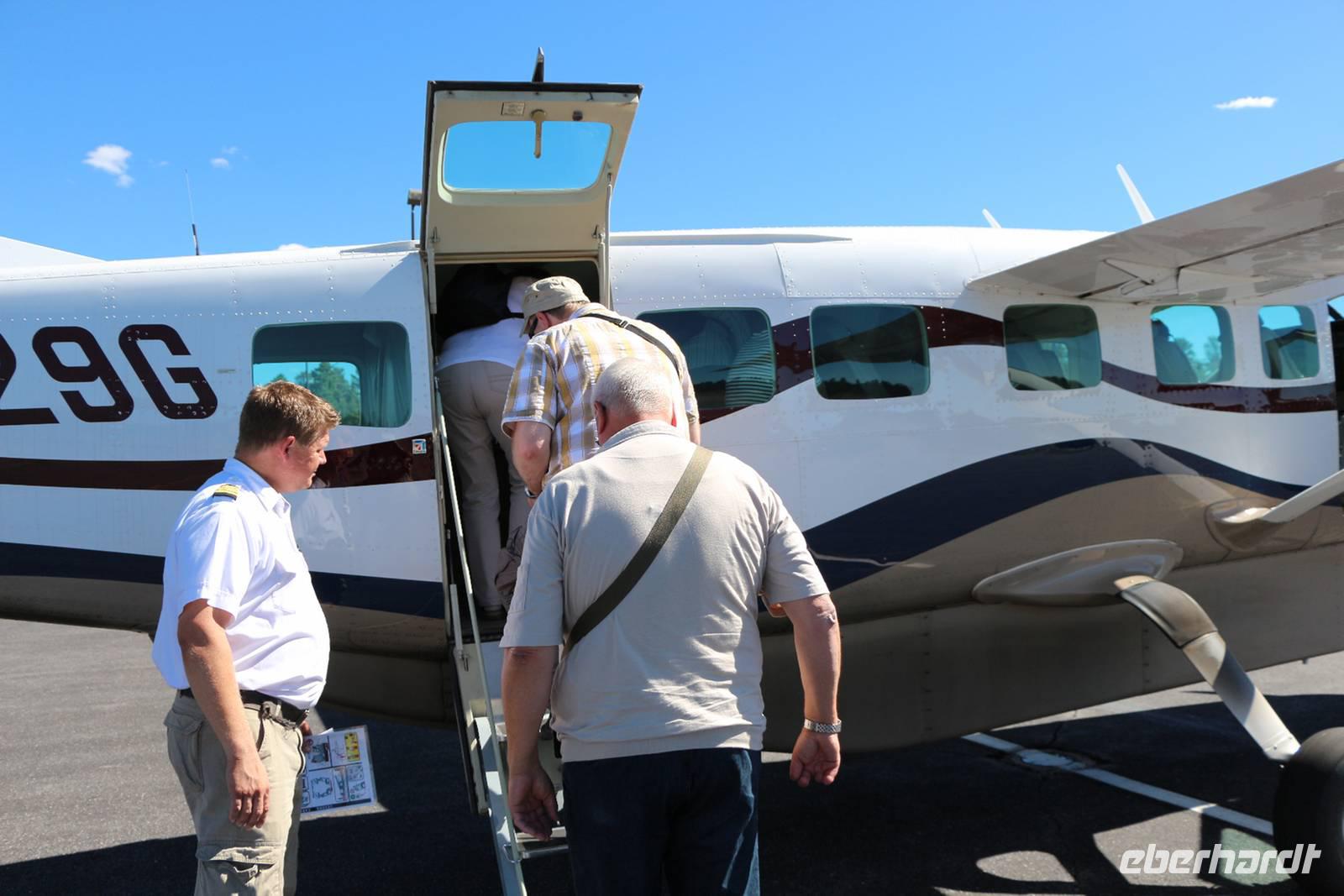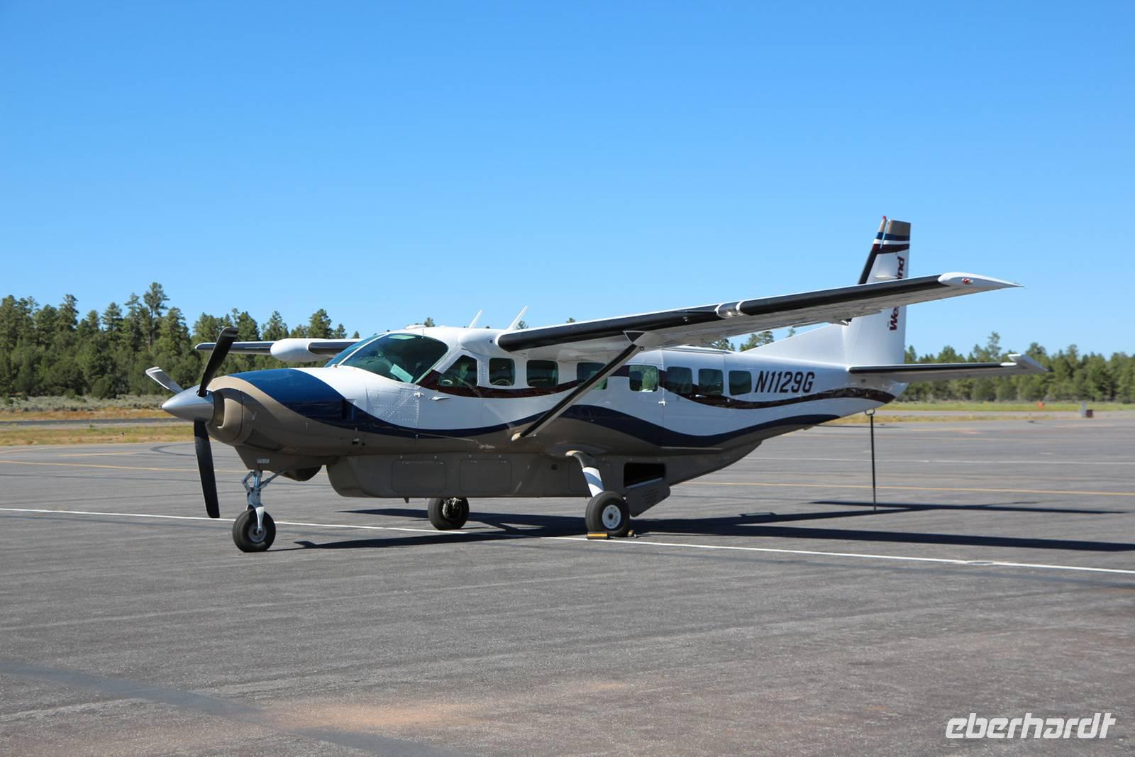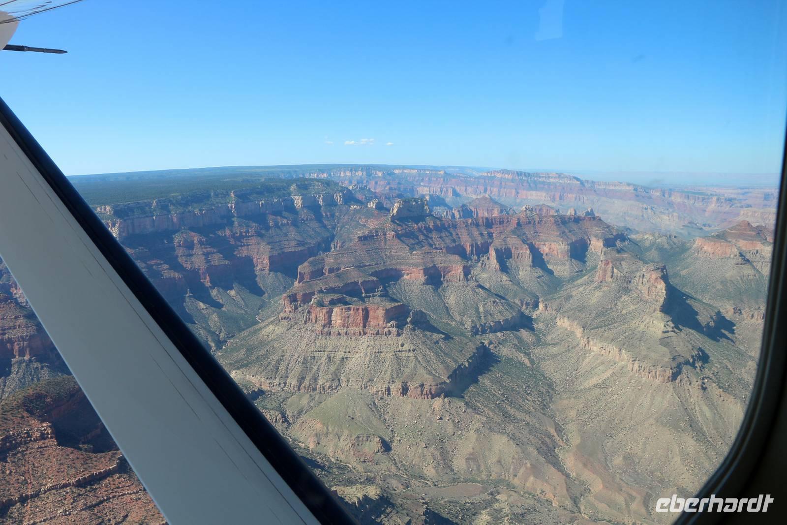 Wir erreichen den Flugplatz, werden in drei Gruppen zu je sieben bis acht Personen eingeteilt und bekommen eine kurze Einweisung zur Sicherheit beim Flug. Mit drei Kleinflugzeugen starten wir praktisch alle gemeinsam zu unserem Grand Canyon Panoramaflug. Über einen Kopfhörer bekommt jeder während des Fluges ein paar Informationen in Deutsch und Musik eingespielt. Jeder hat einen Fensterplatz und kann den Grand Canyon so optimal sehen und fotografieren. Der Flug dauert etwa 45 Minuten und kostet ca. 180 USD pro Person. Um die riesigen Ausmaße des Grand Canyon, die verschiedenen Farben und Gesteinsschichten begreifen zu können, ist der Flug die beste Möglichkeit. Das sollte man sich gönnen, wenn man einmal hier ist!